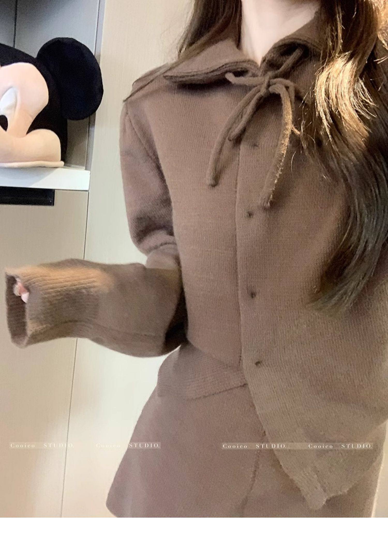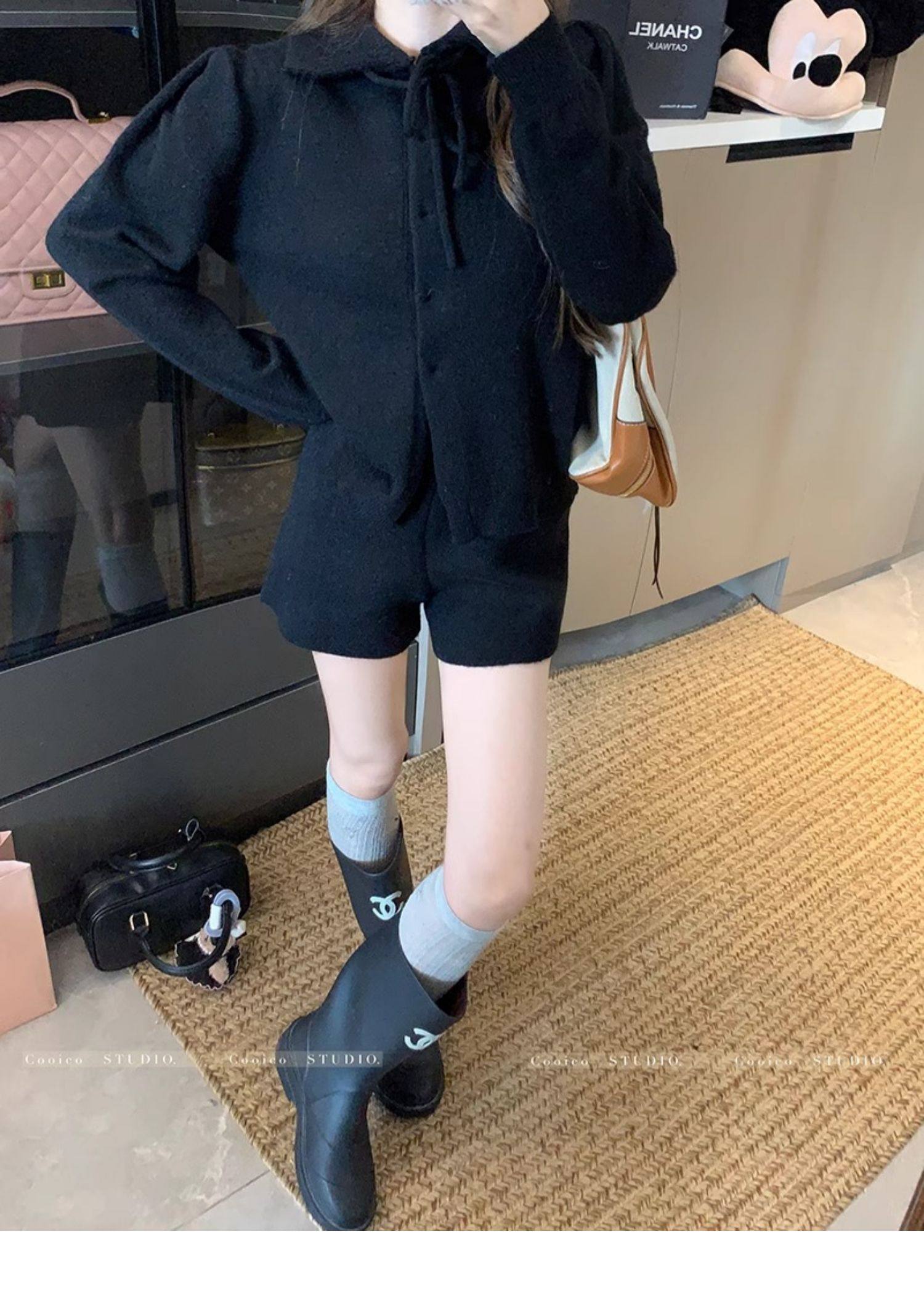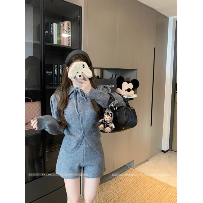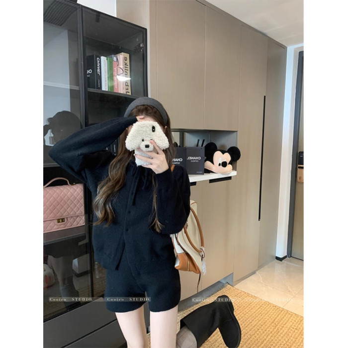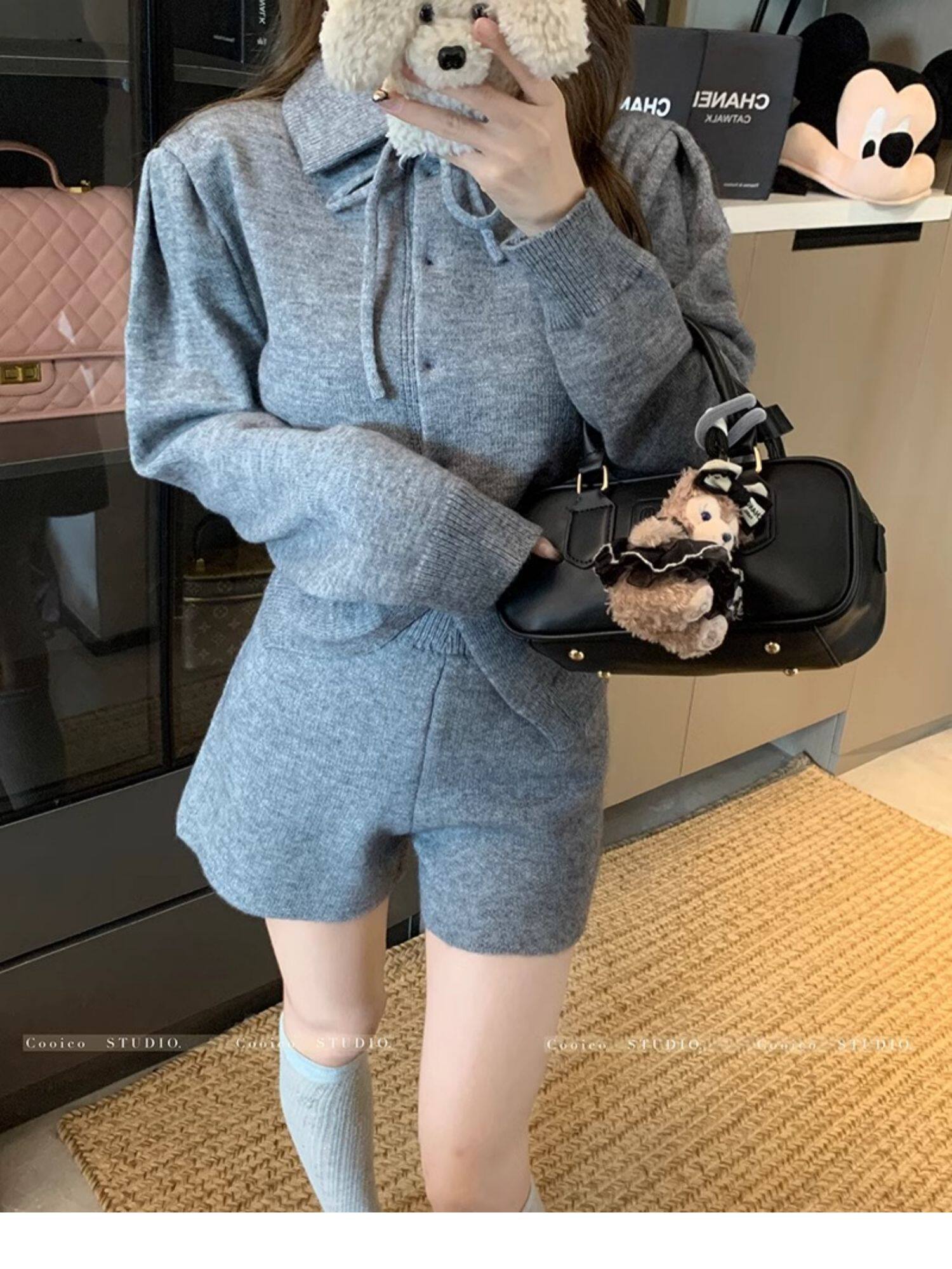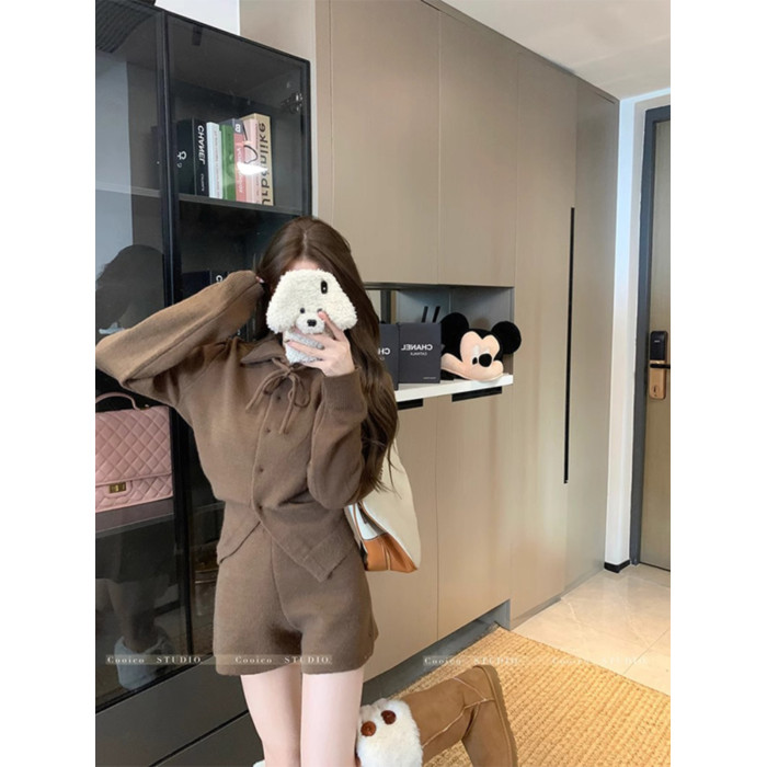 慵懶風polo領寬松系帶毛衣開衫女冬高腰針織打底糯米短褲兩件套裝