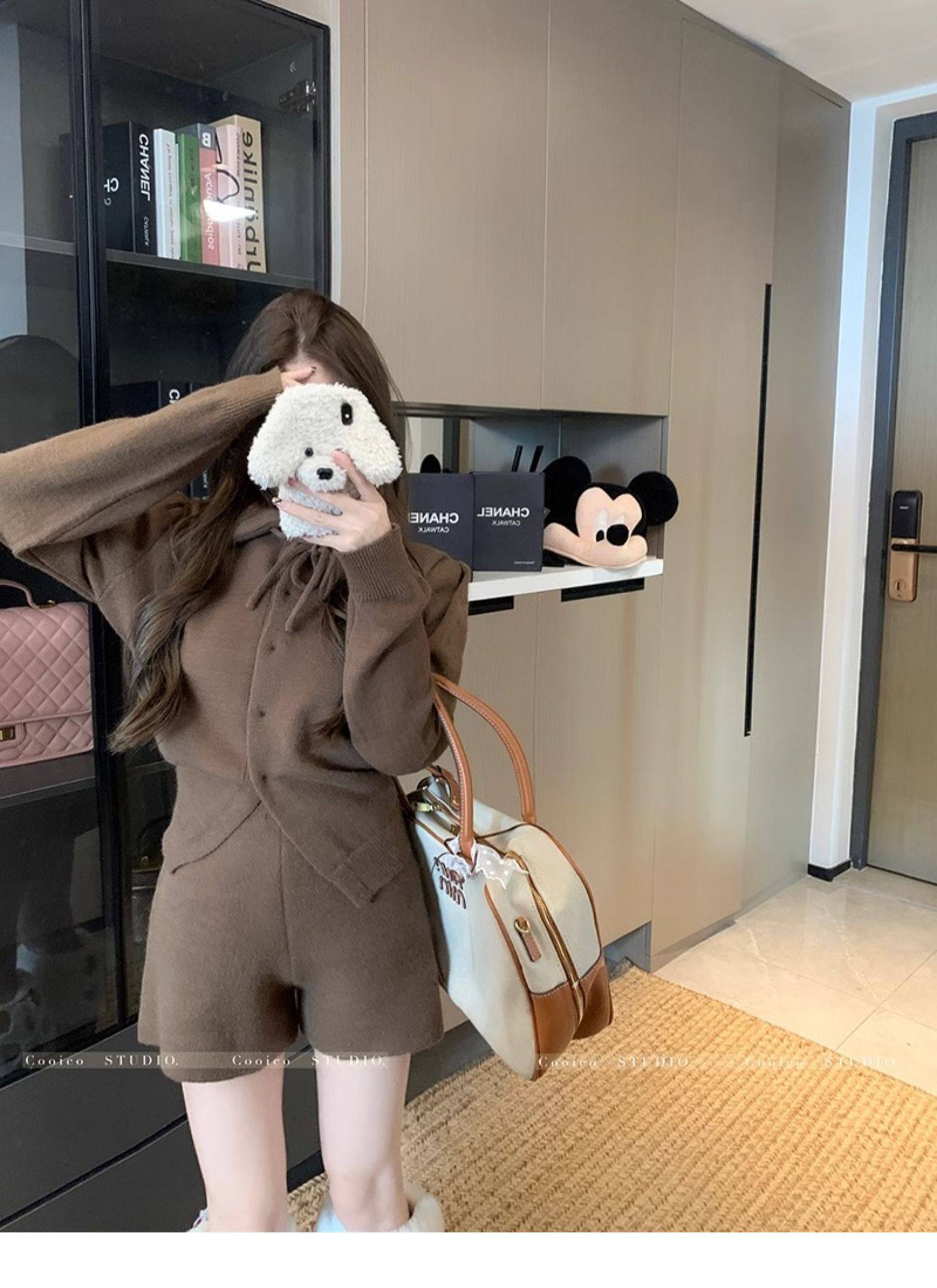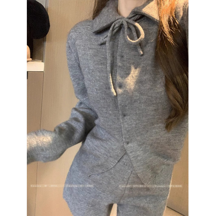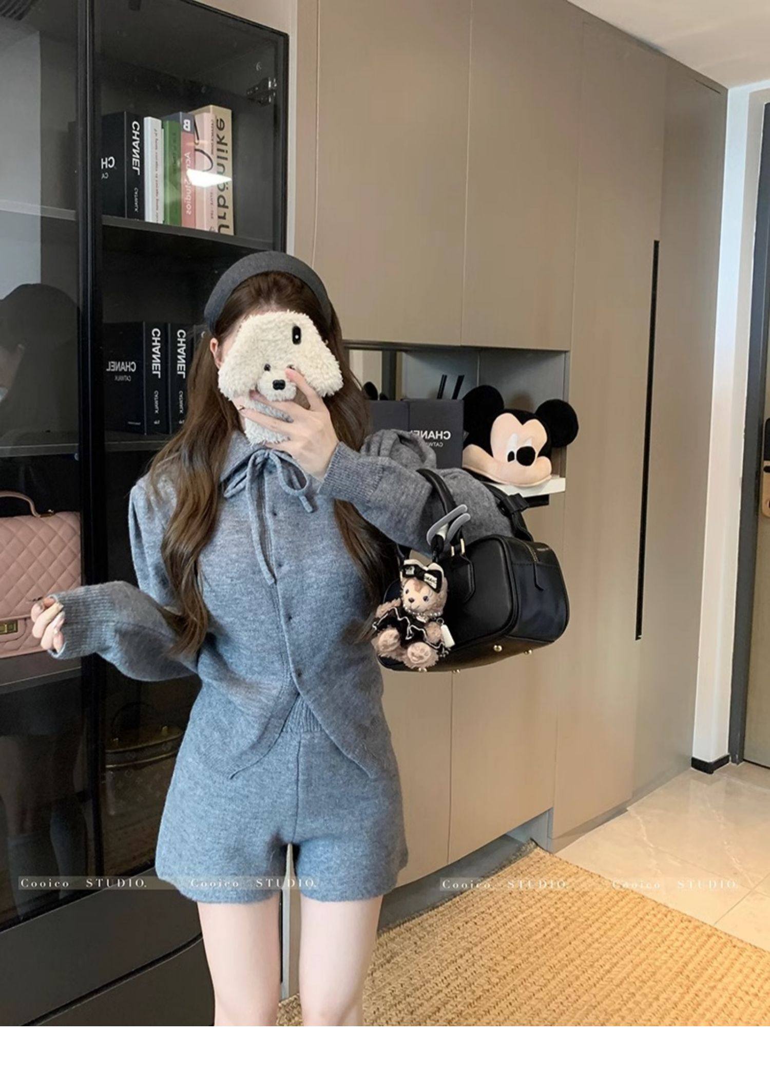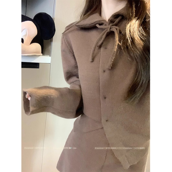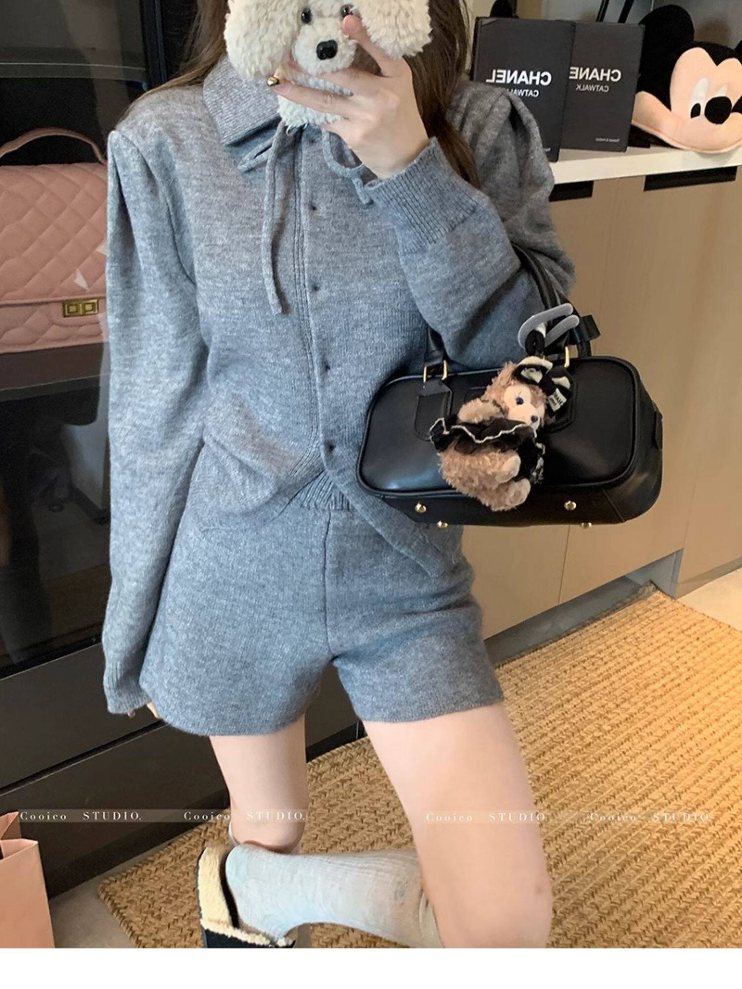 慵懶風polo領寬松系帶毛衣開衫女冬高腰針織打底糯米短褲兩件套裝