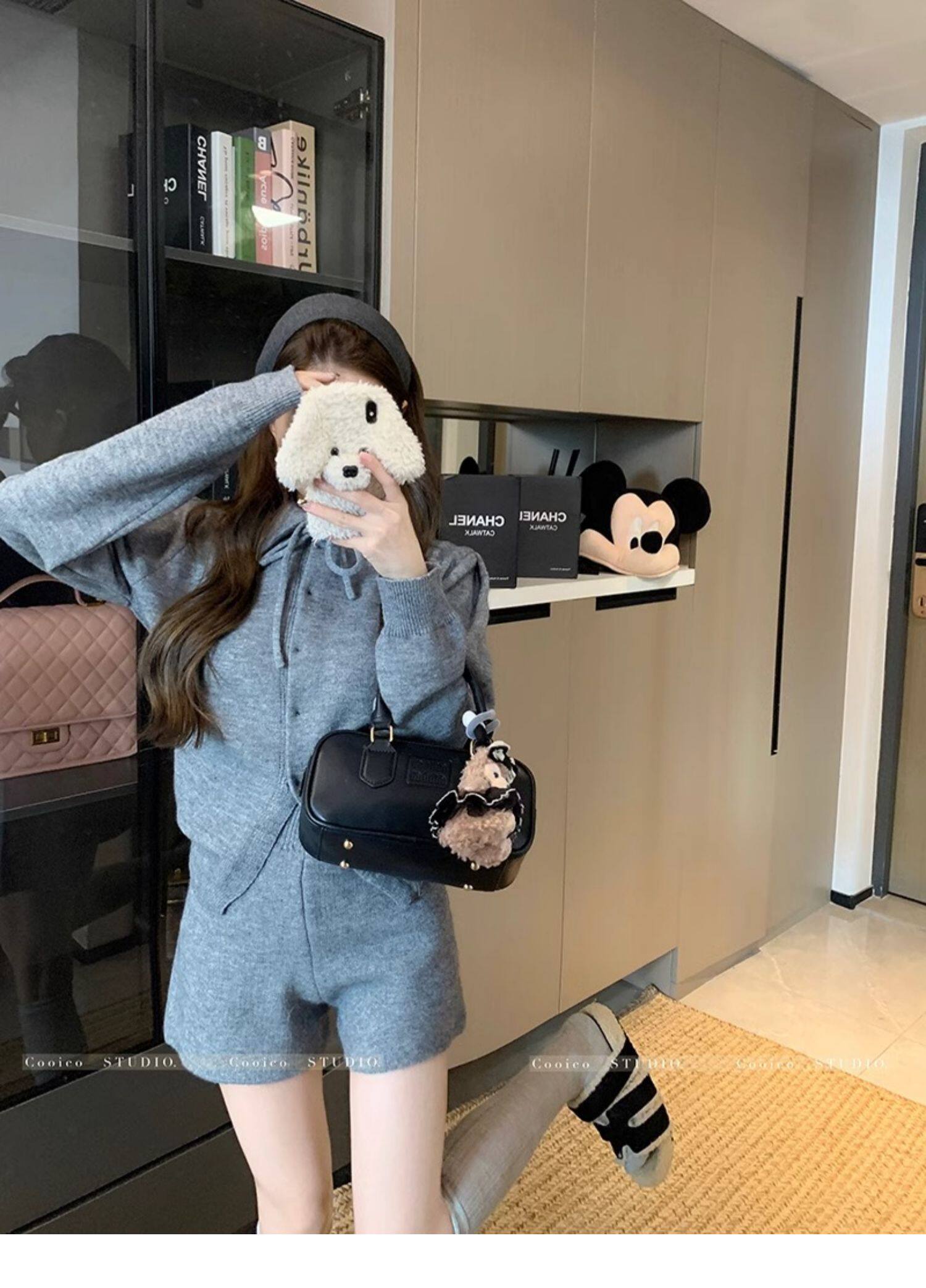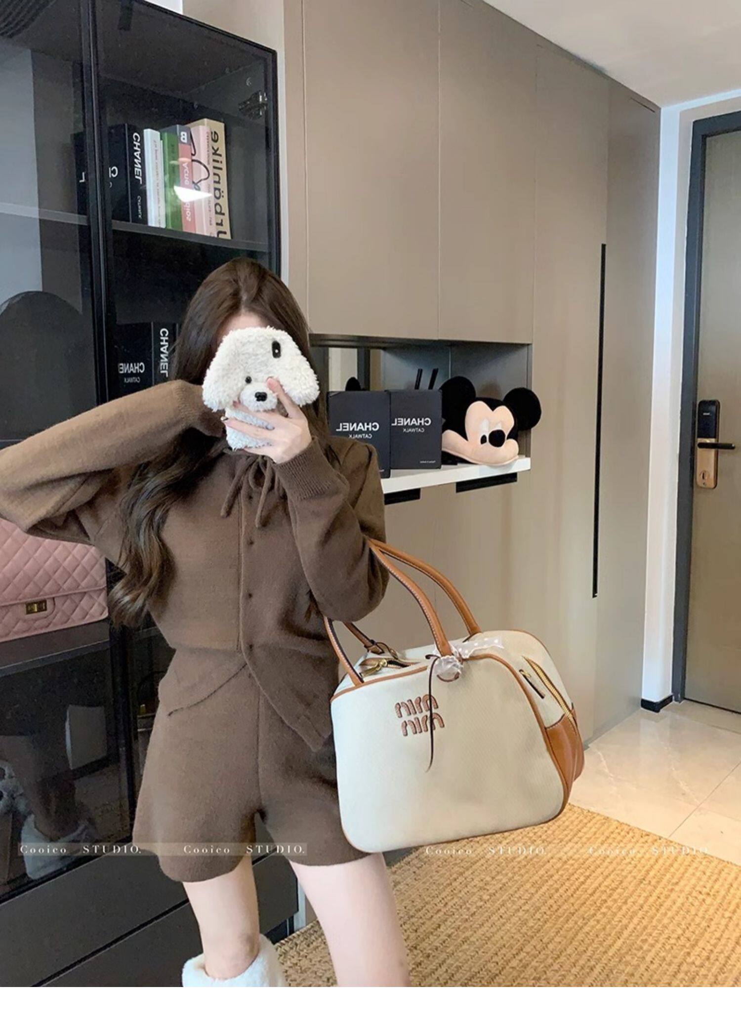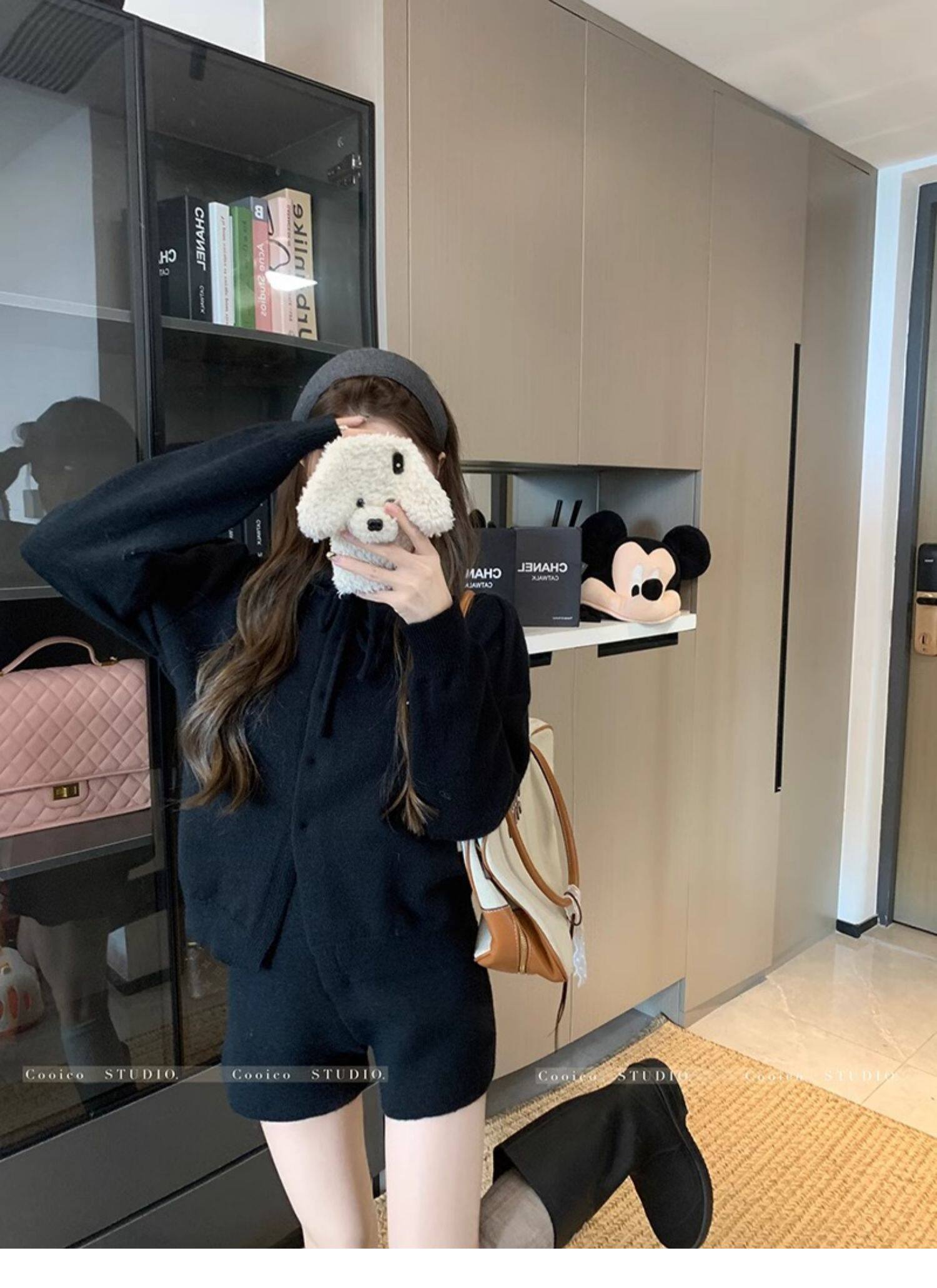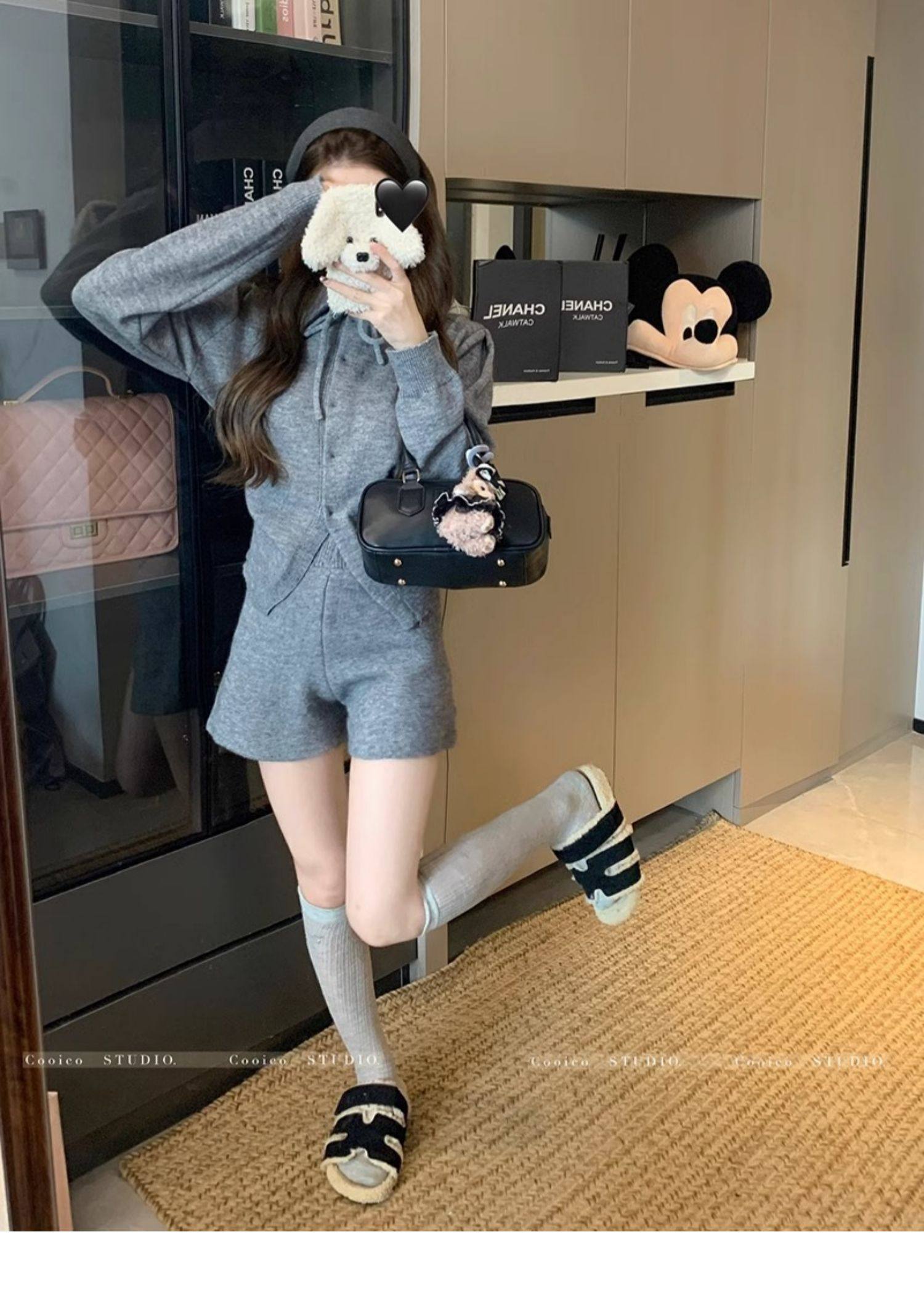 慵懶風polo領寬松系帶毛衣開衫女冬高腰針織打底糯米短褲兩件套裝