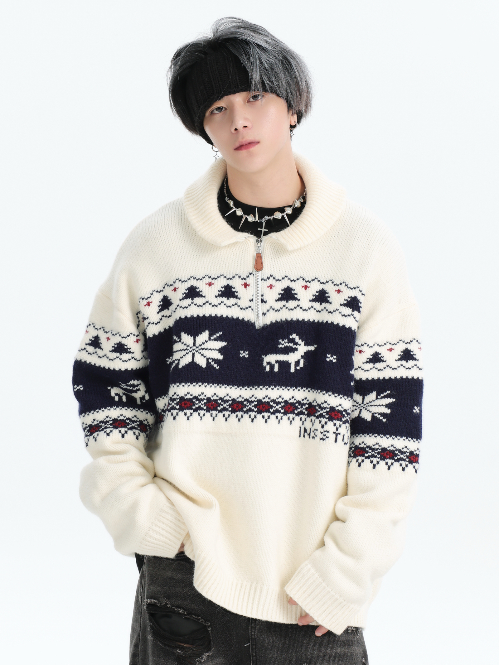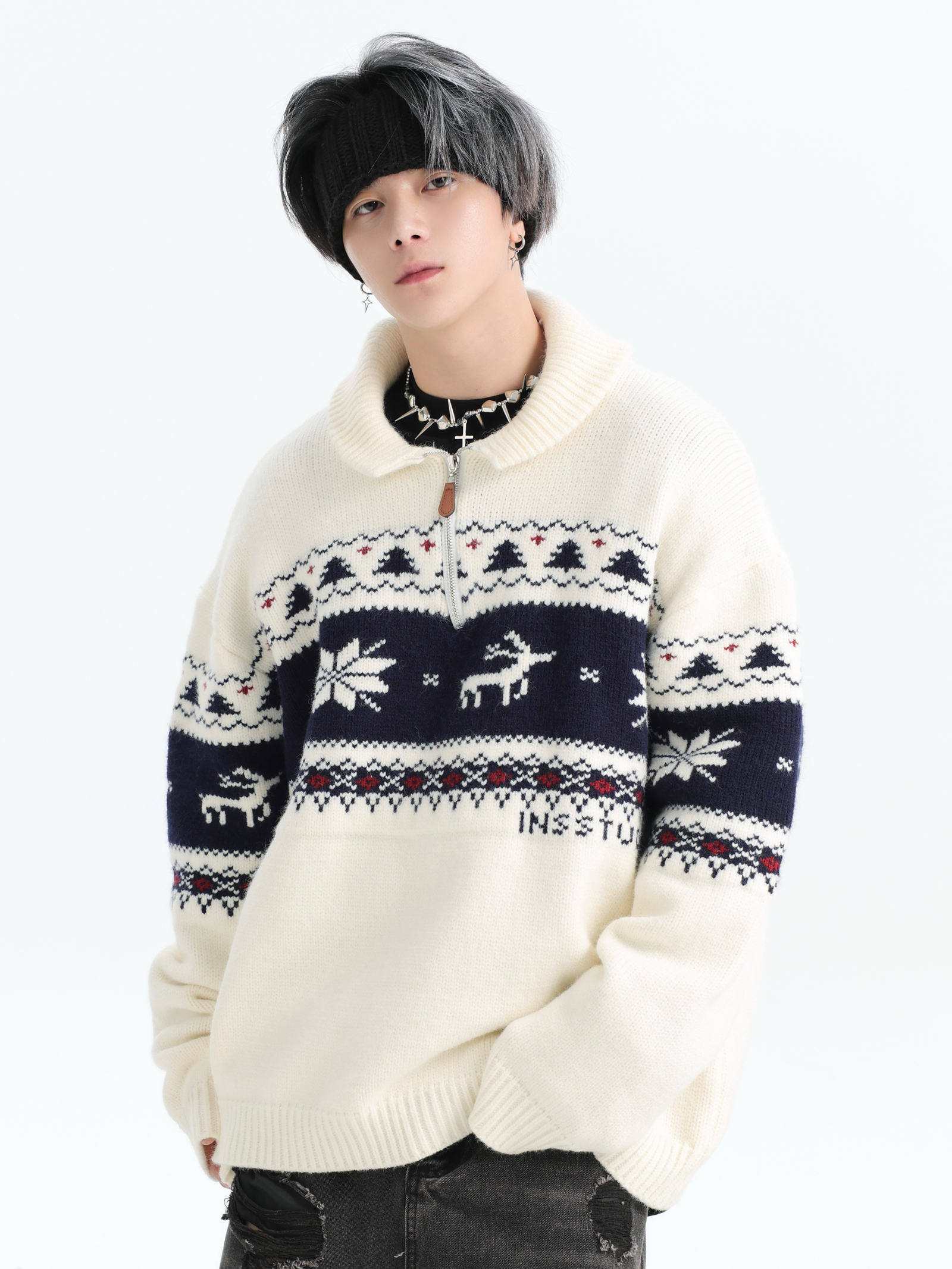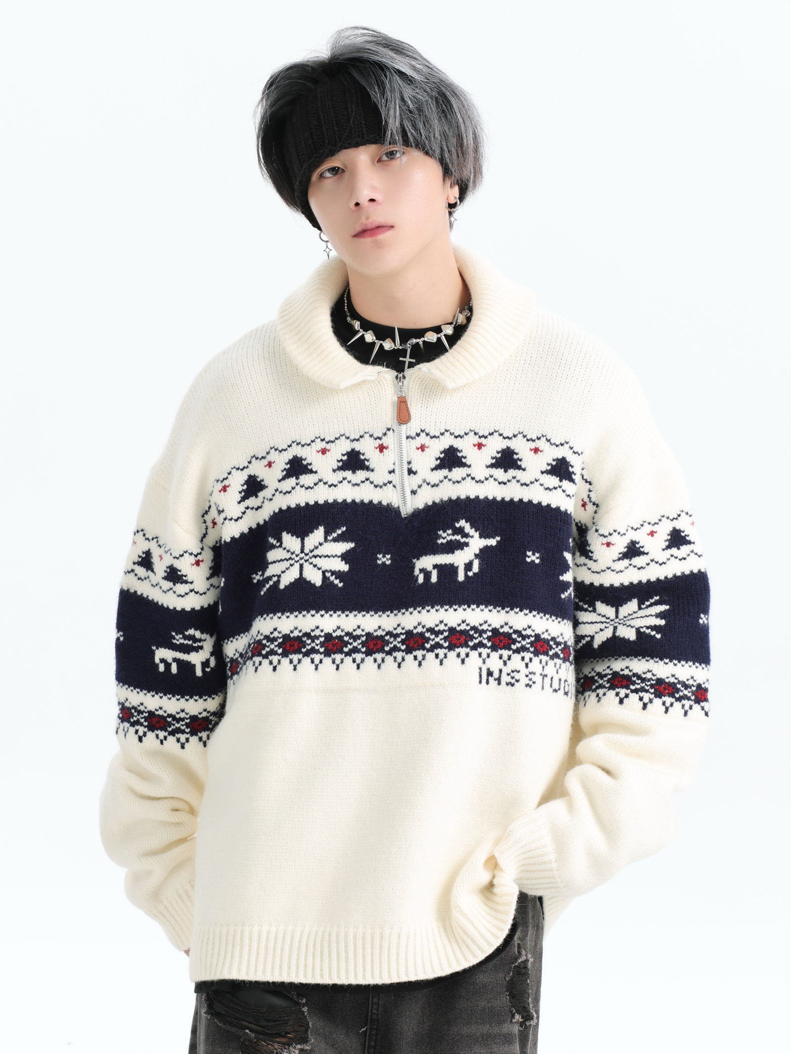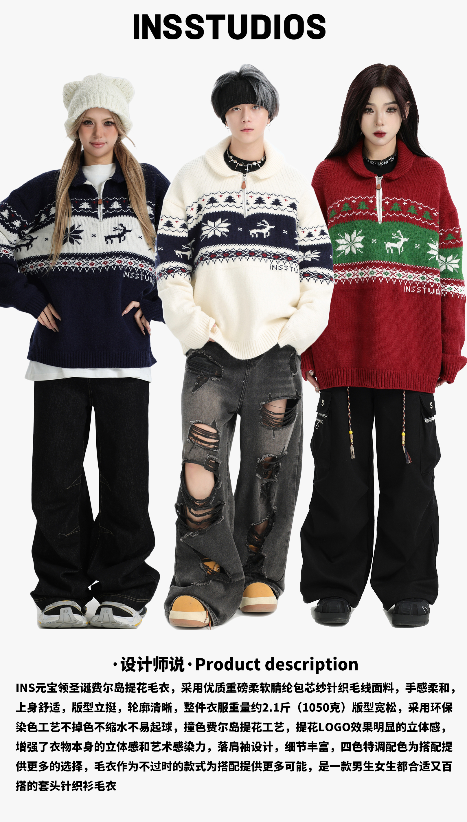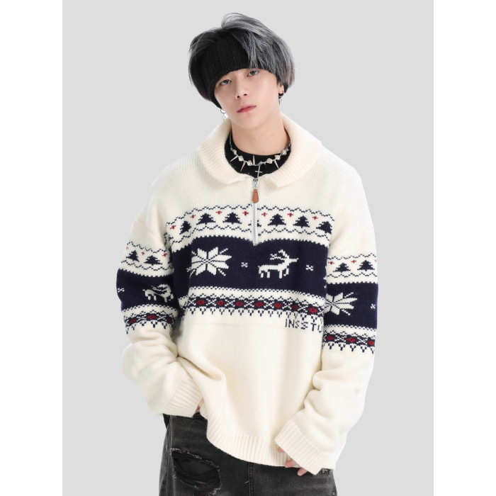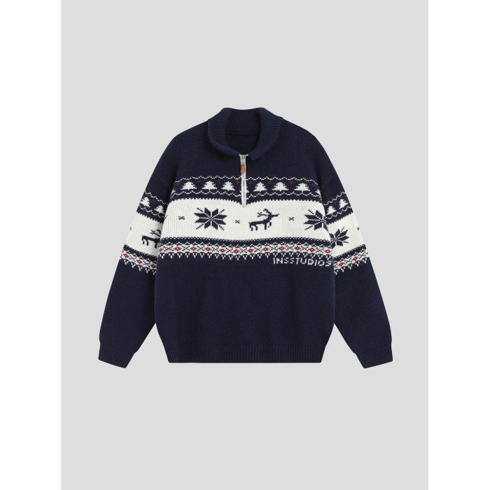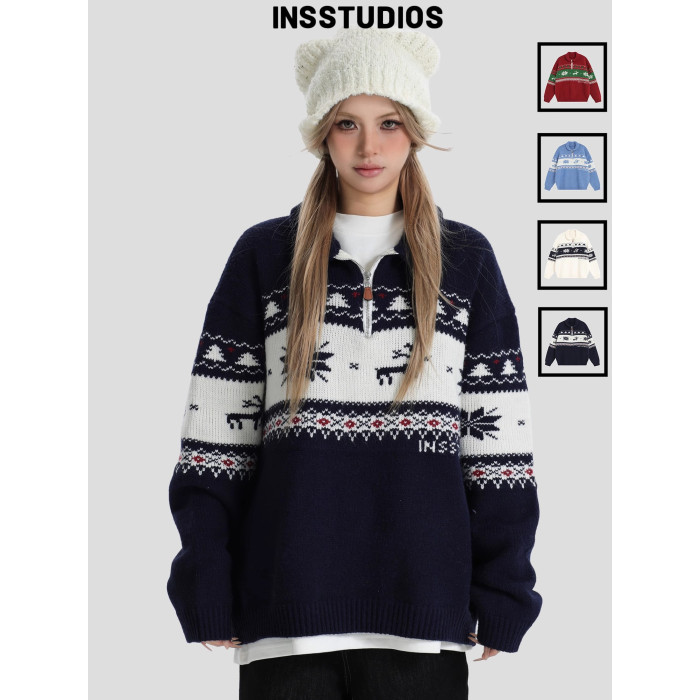 INSstudios 國潮牌情侶美式元寶領聖誕費爾島提花毛衣秋冬針織衫