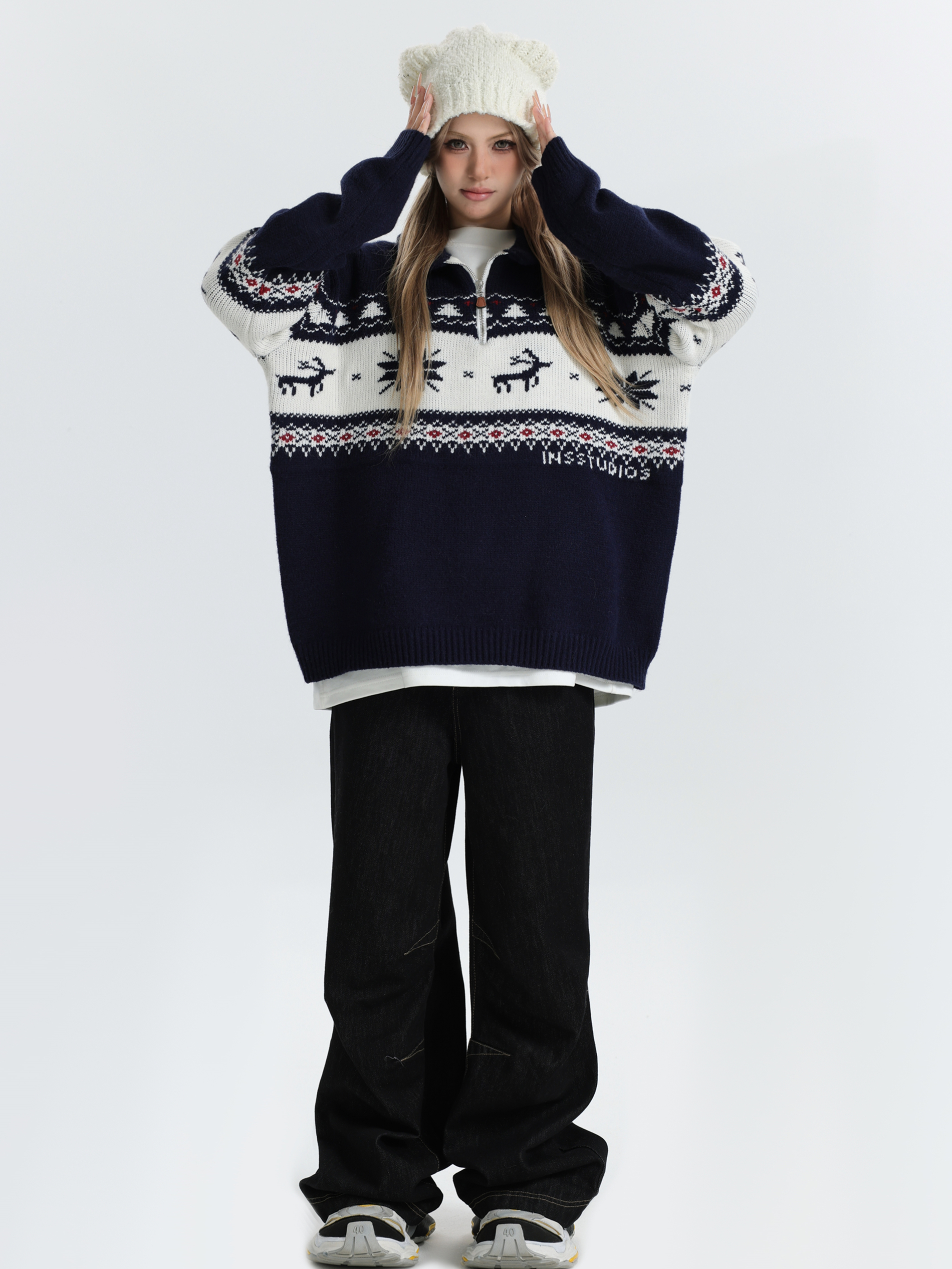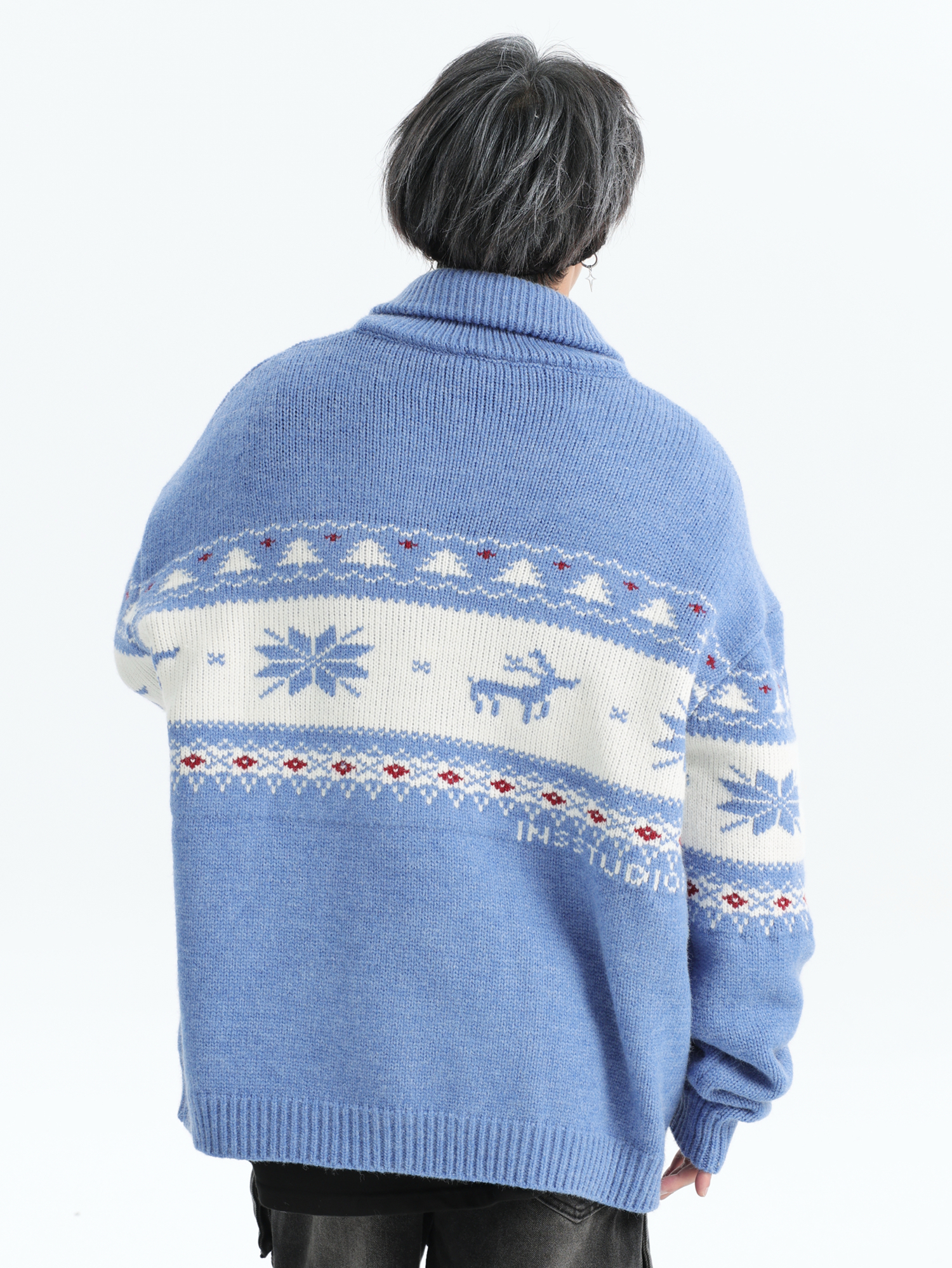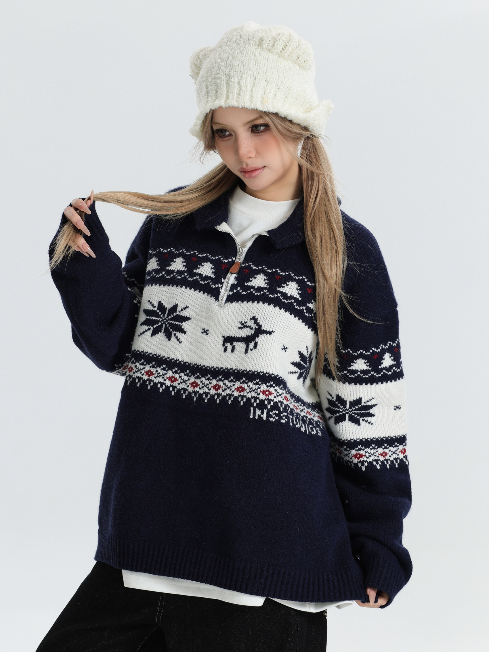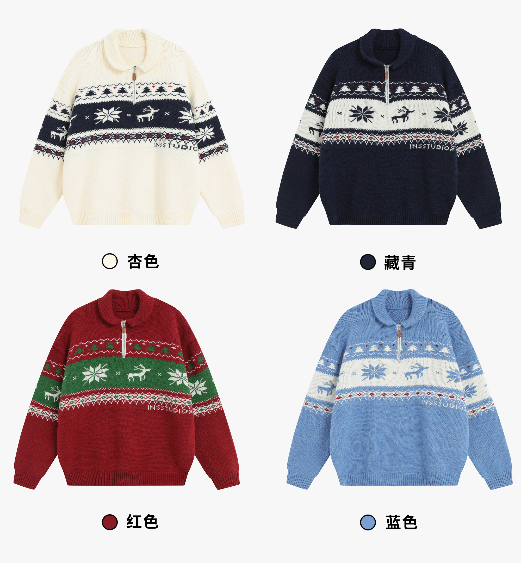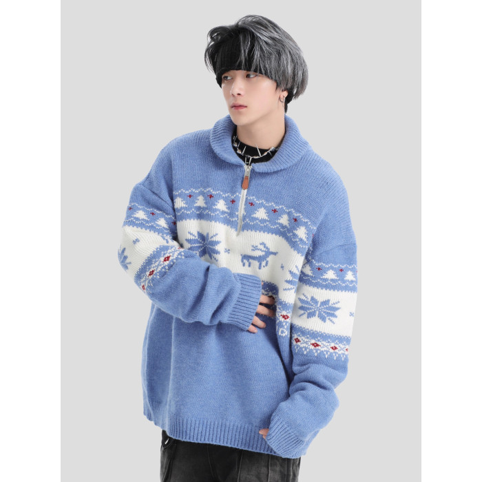 INSstudios 國潮牌情侶美式元寶領聖誕費爾島提花毛衣秋冬針織衫