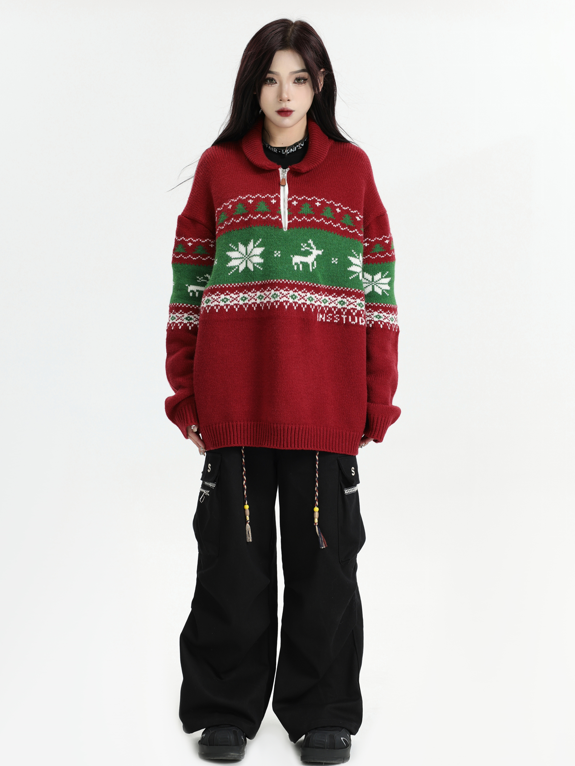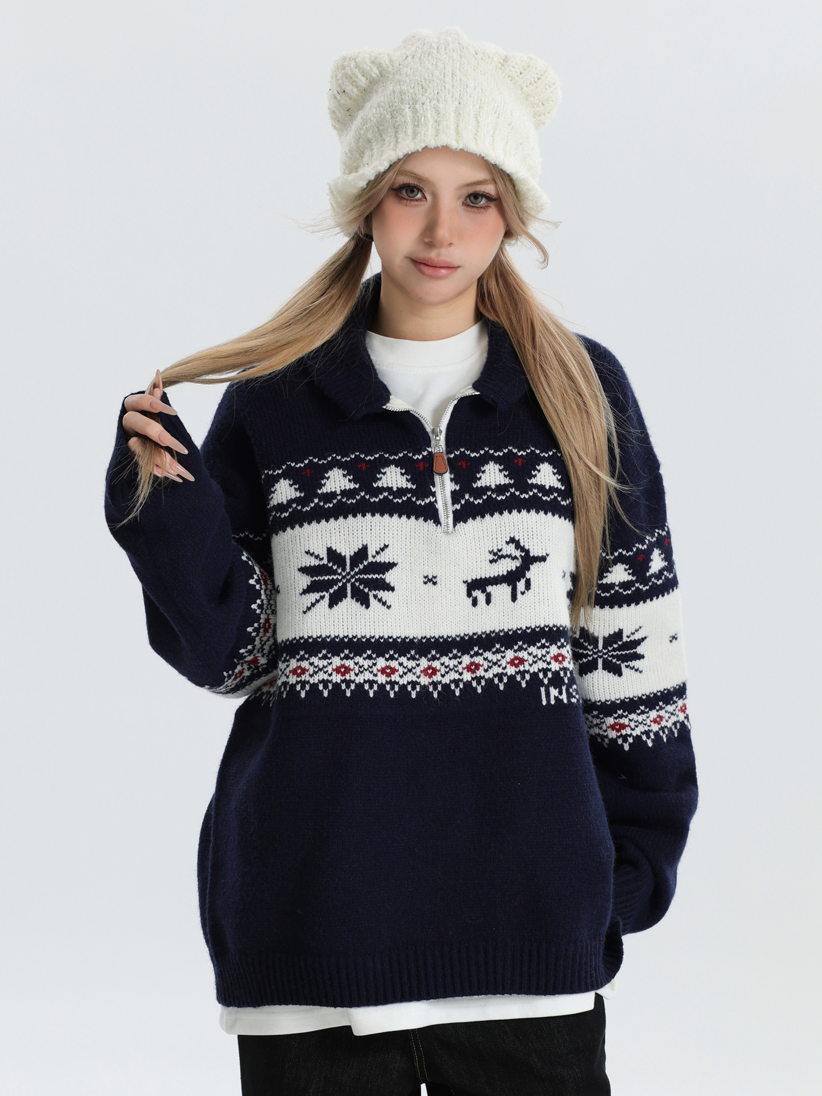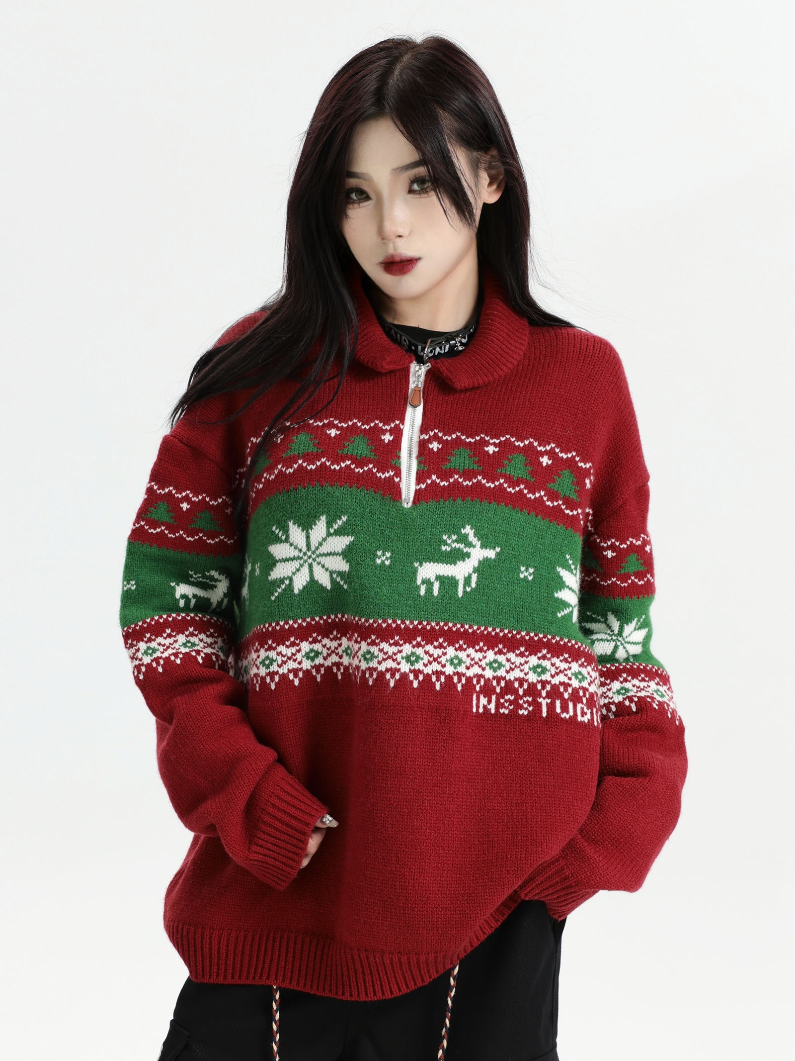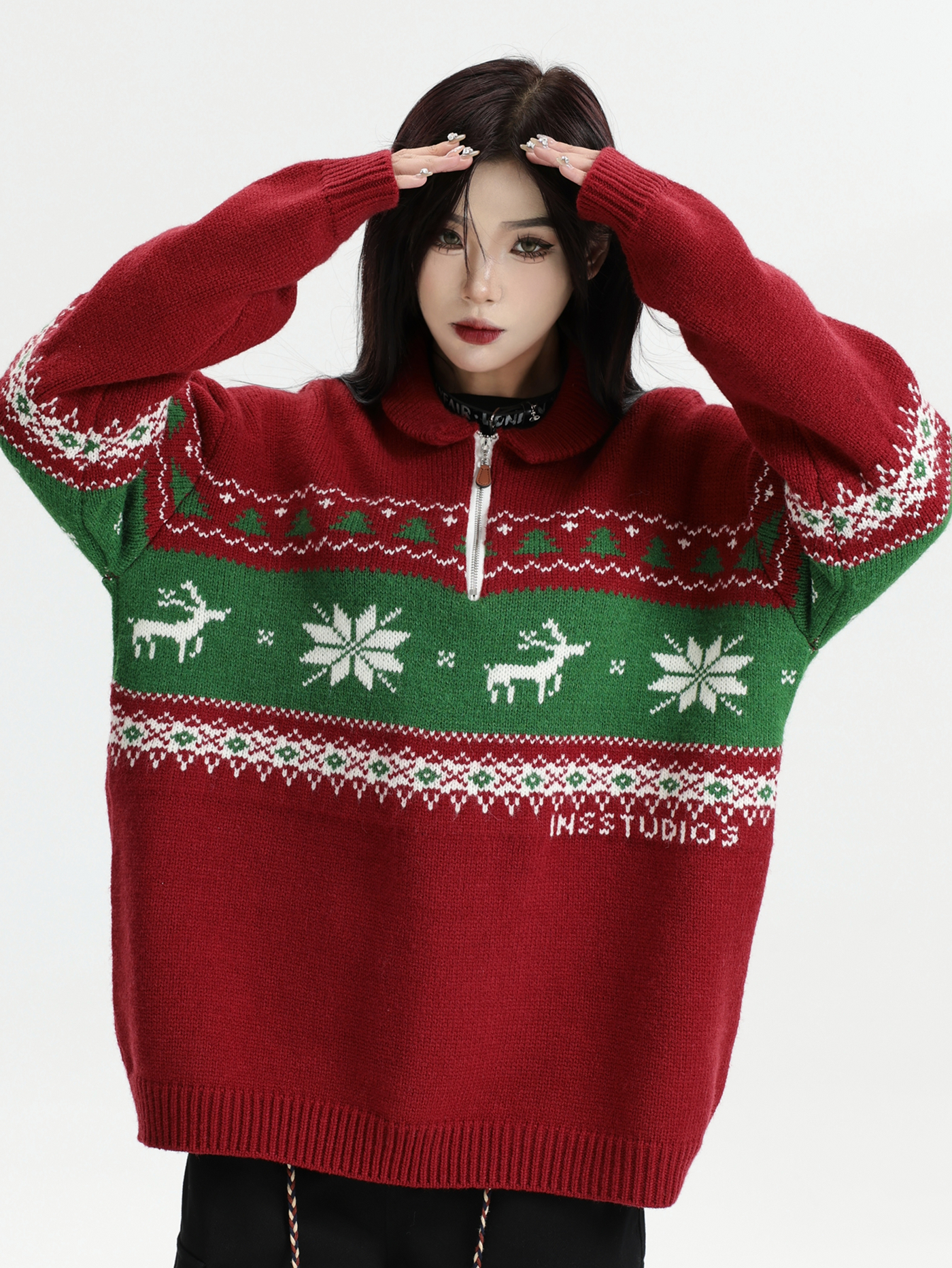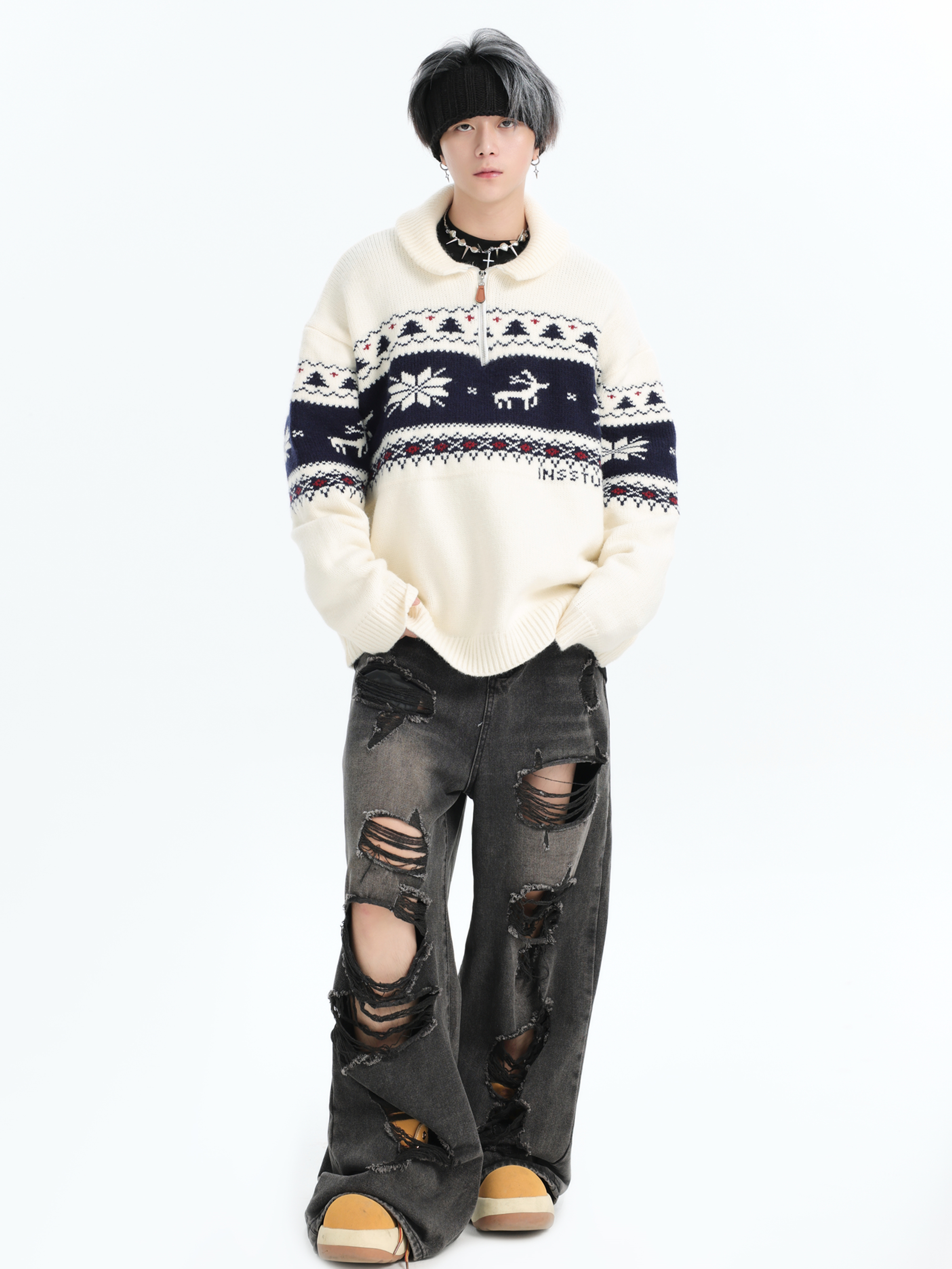INSstudios 國潮牌情侶美式元寶領聖誕費爾島提花毛衣秋冬針織衫