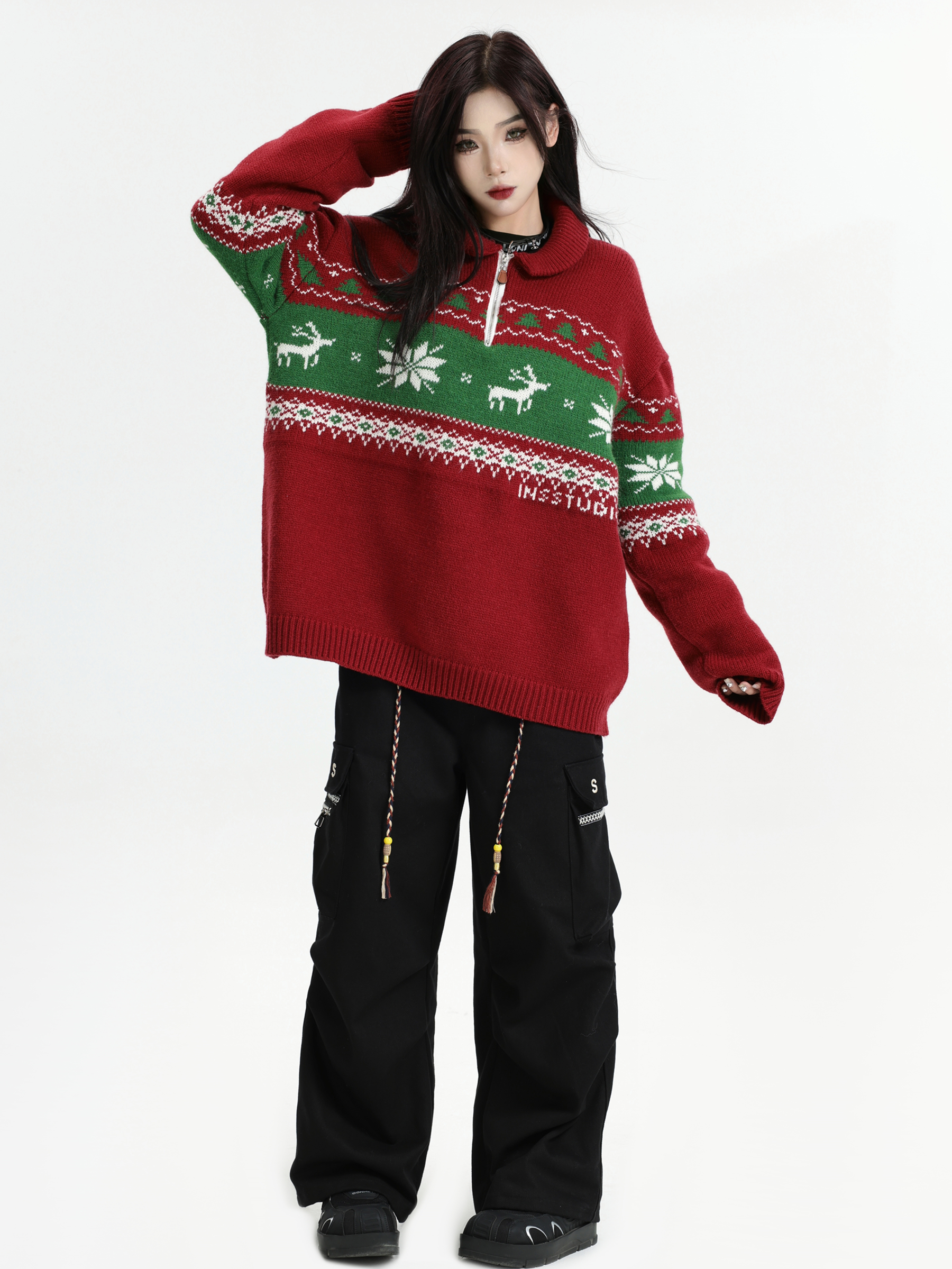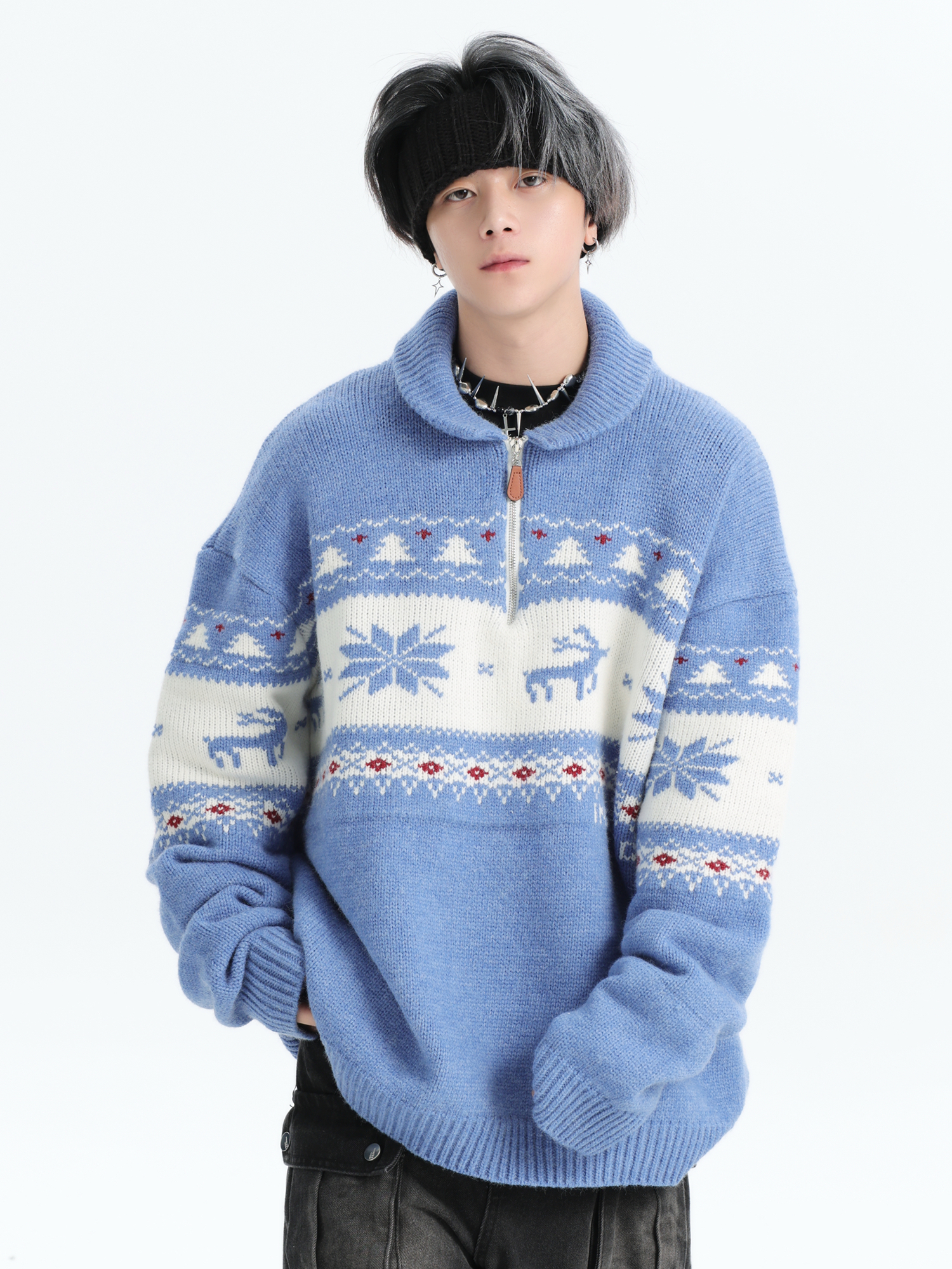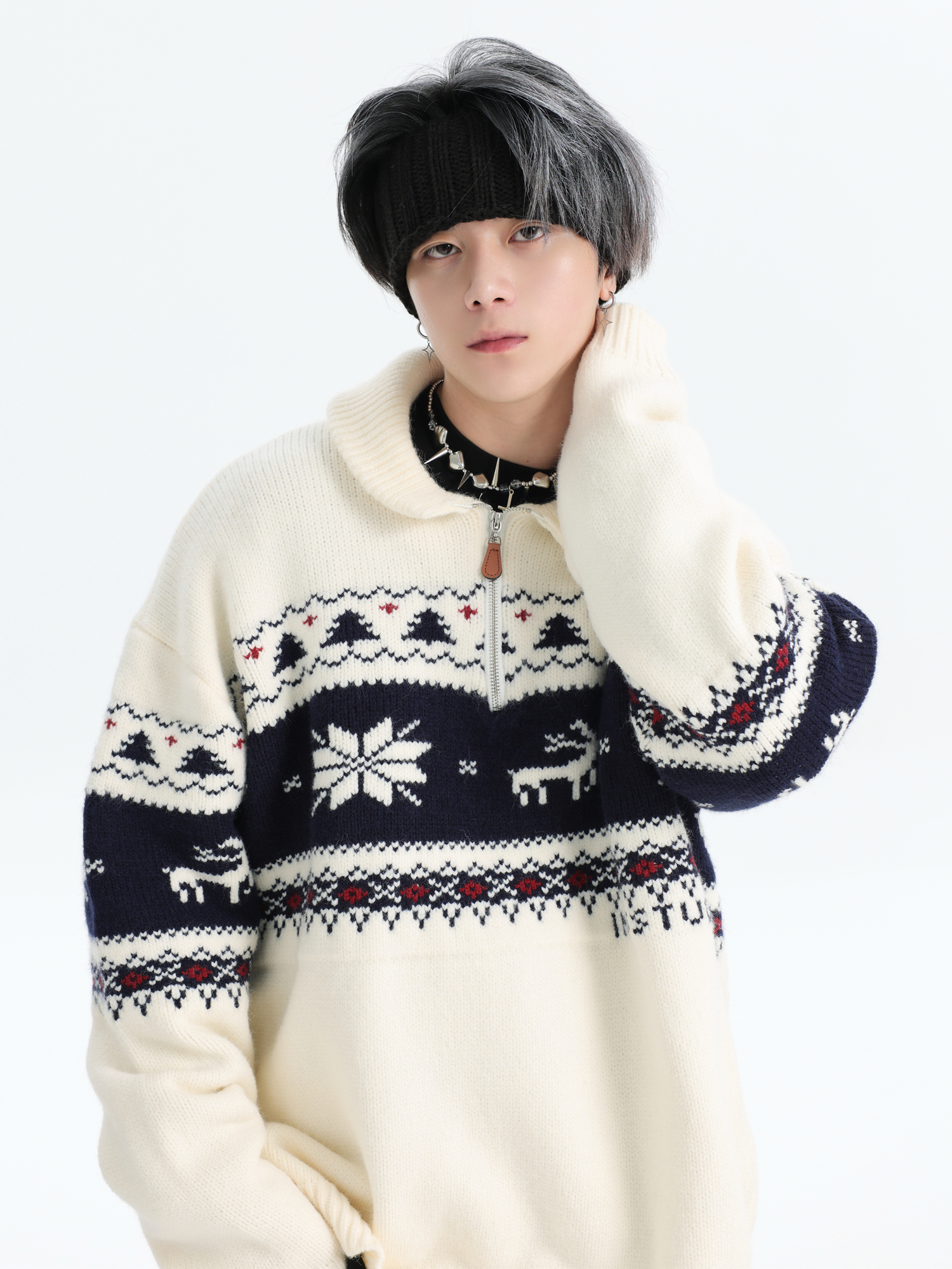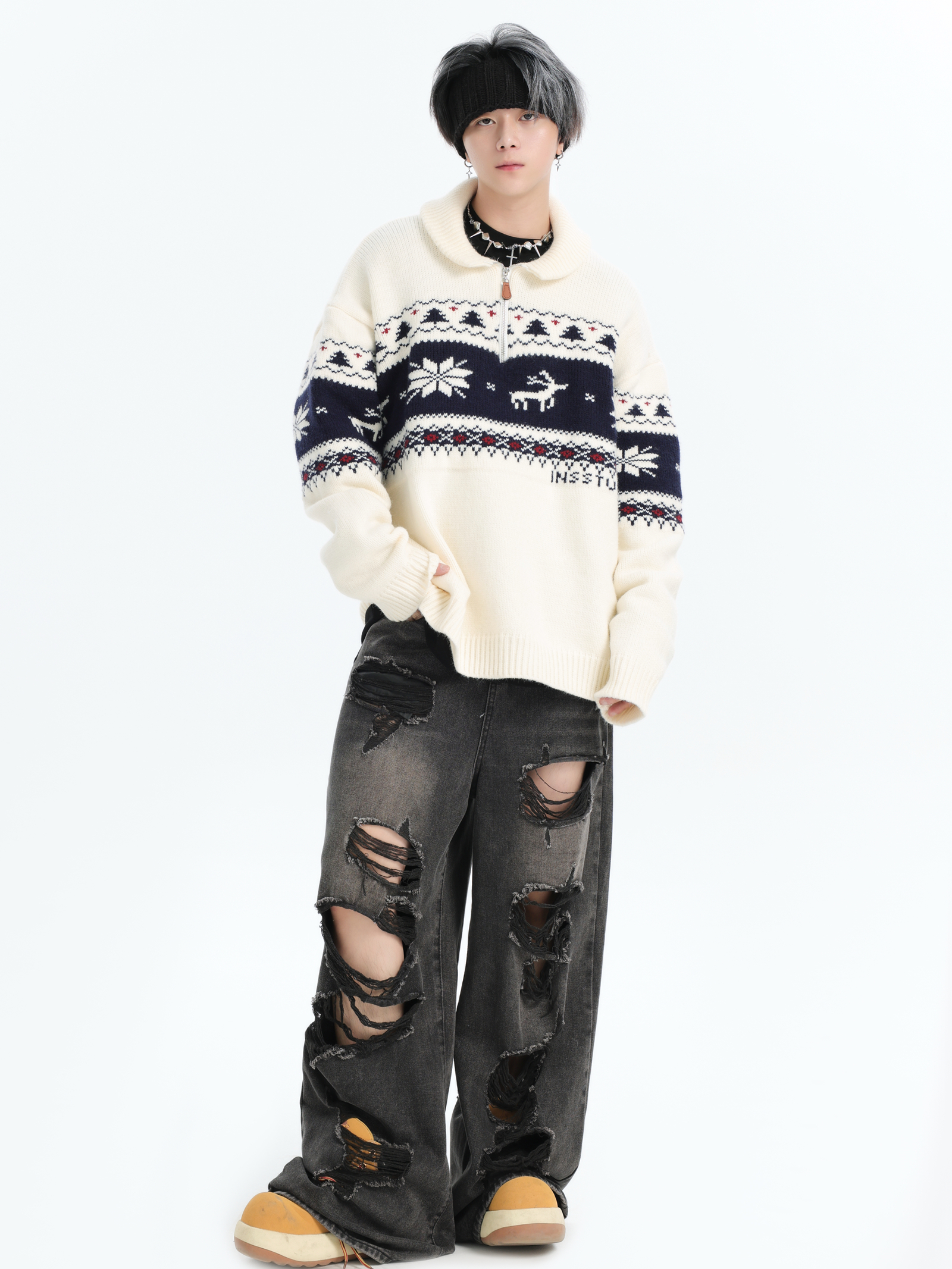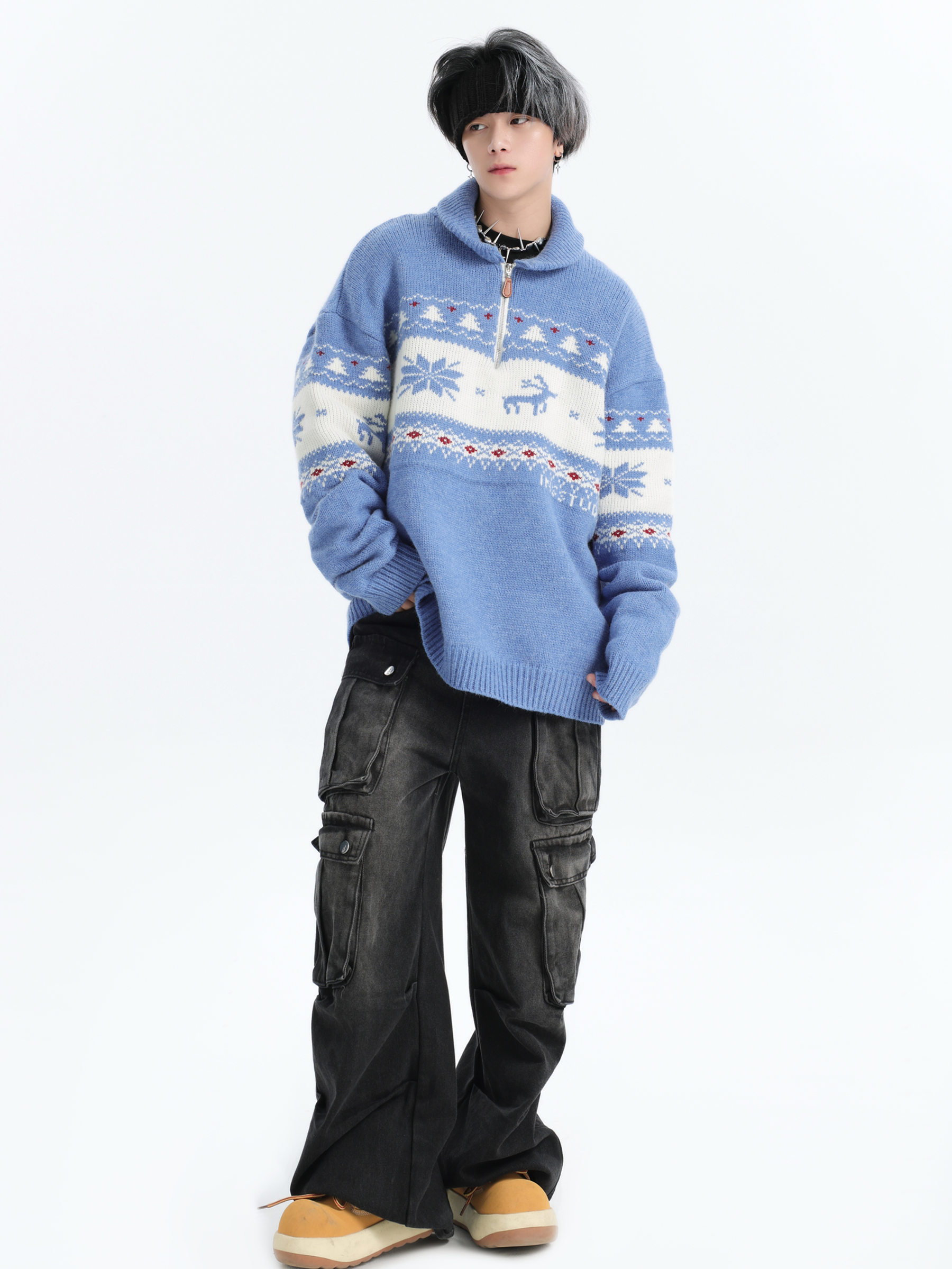 INSstudios 國潮牌情侶美式元寶領聖誕費爾島提花毛衣秋冬針織衫