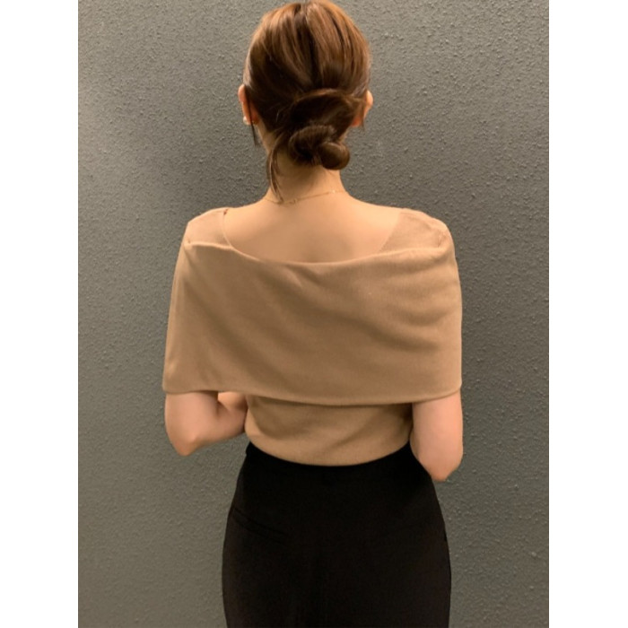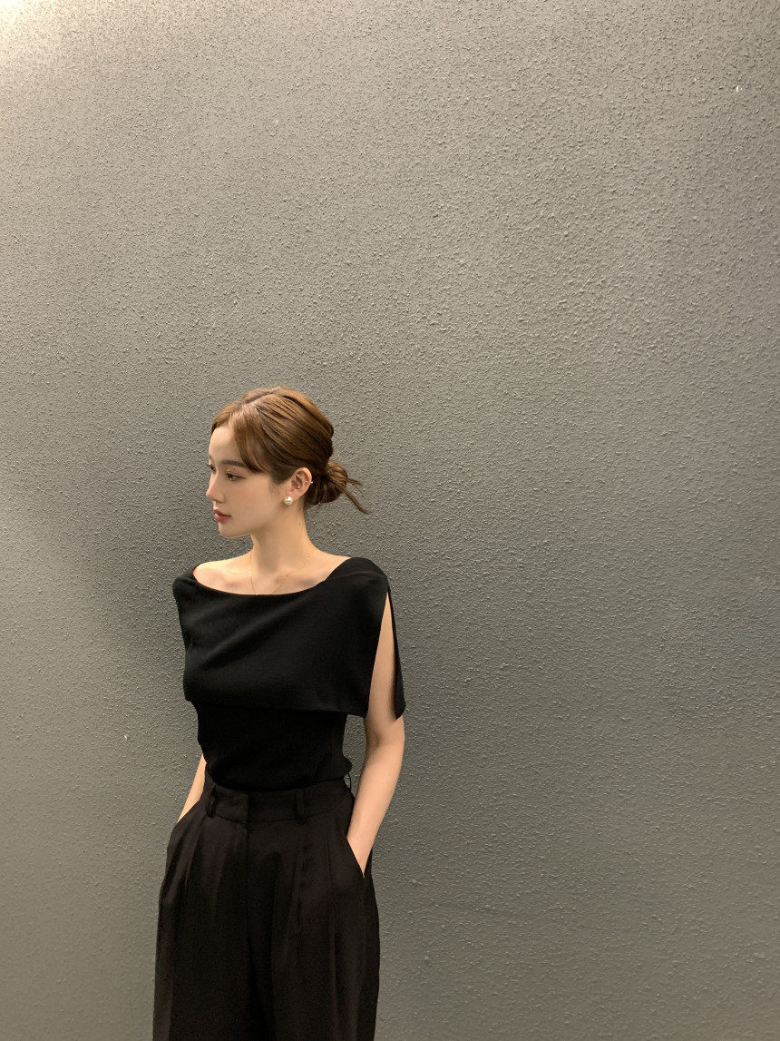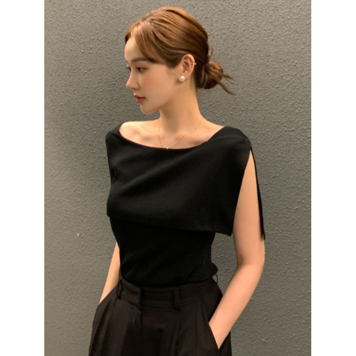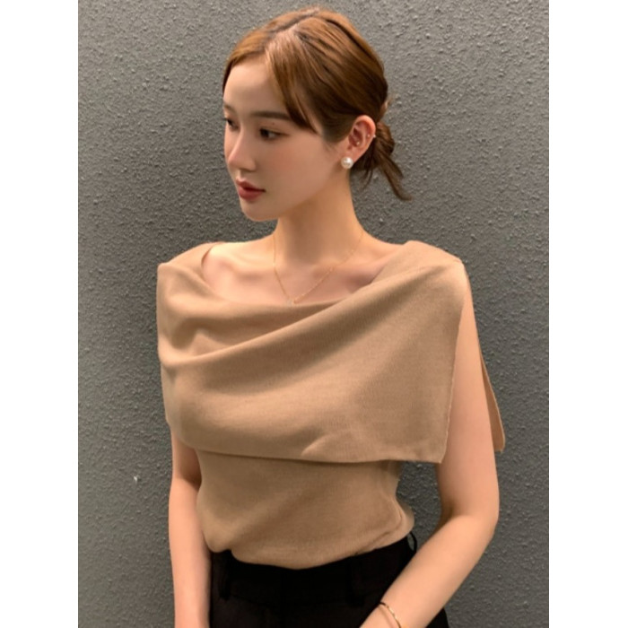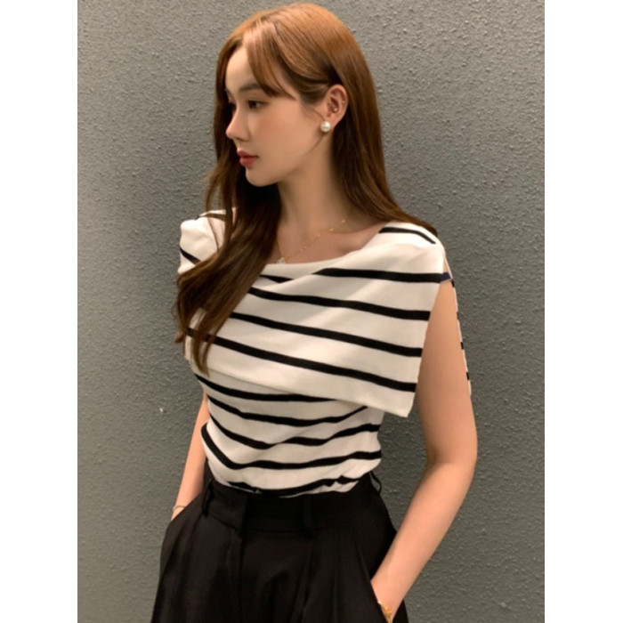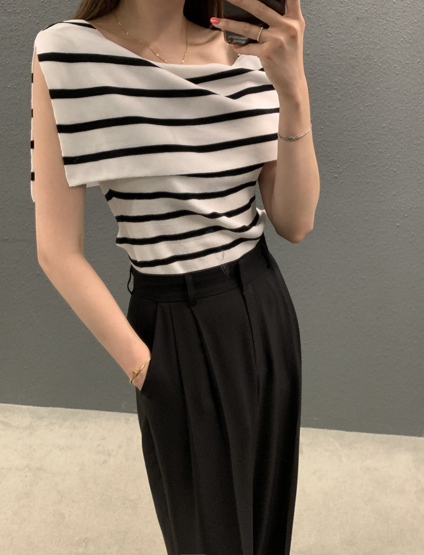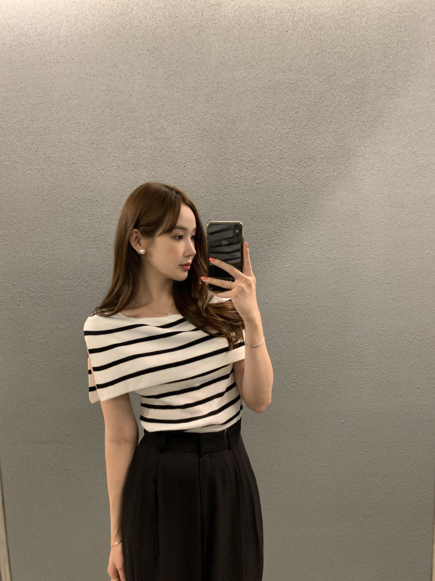 韓國chic小衆氣質大翻領側開叉設計修身顯瘦條紋撞色針織衫上衣女