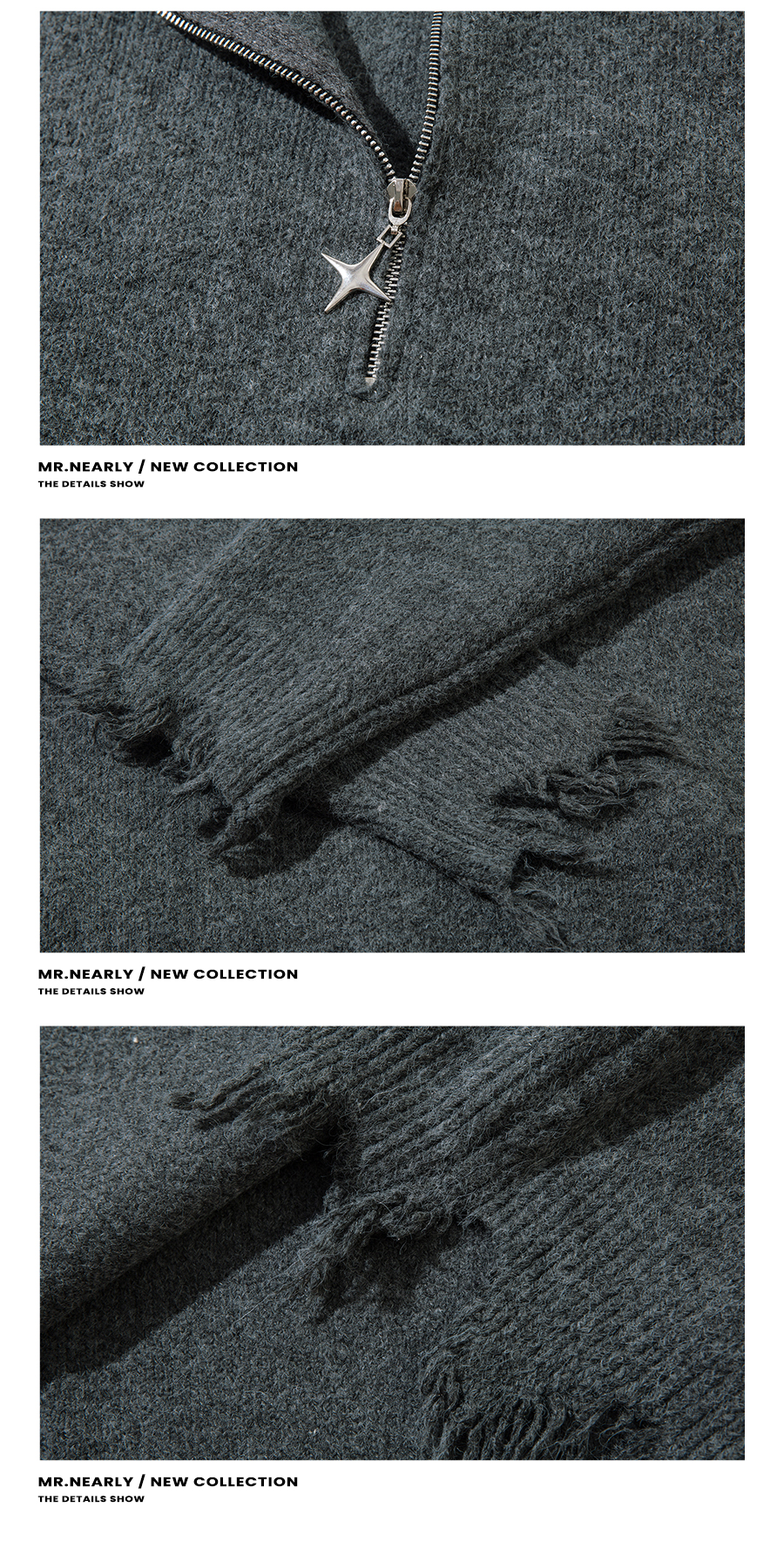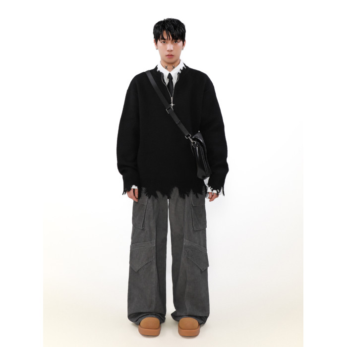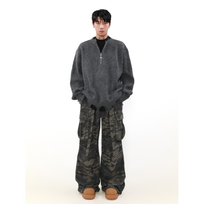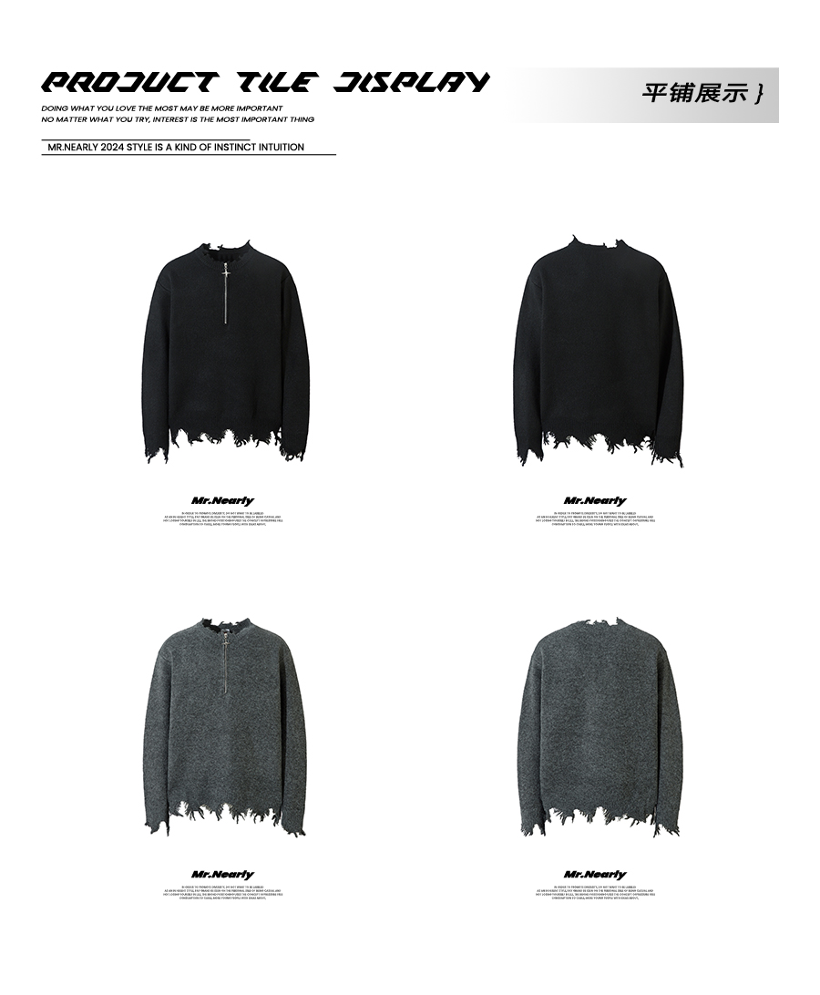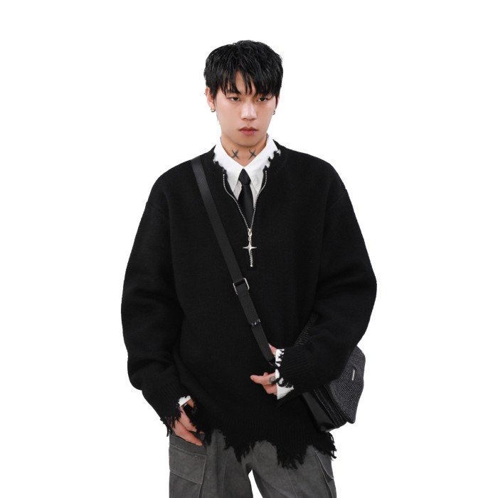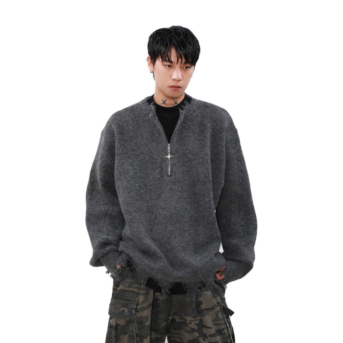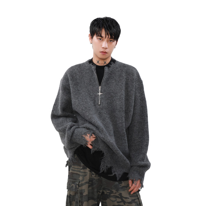 MRNEARLY美式半拉鍊破壞毛衣男秋冬款寬松慵懶風設計感小衆針織衫