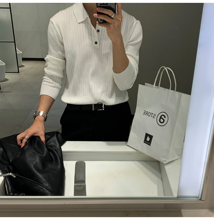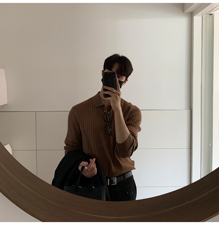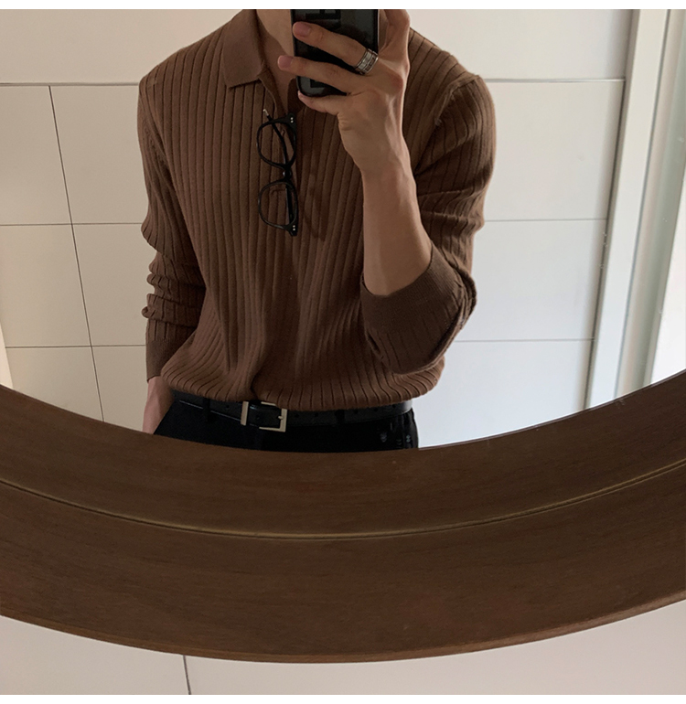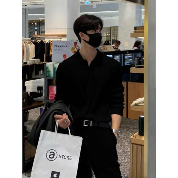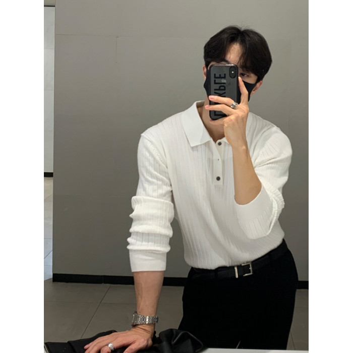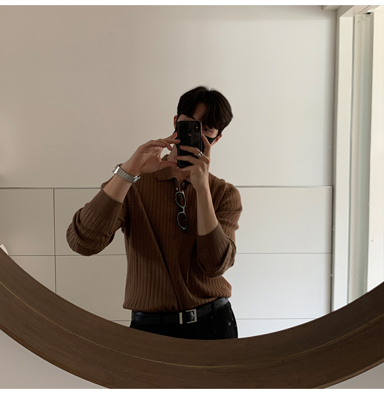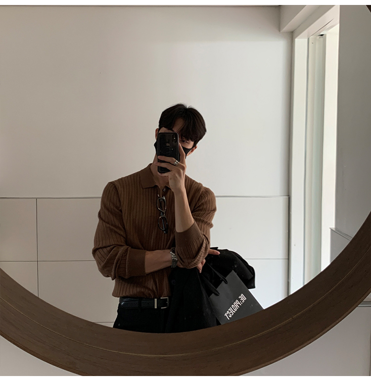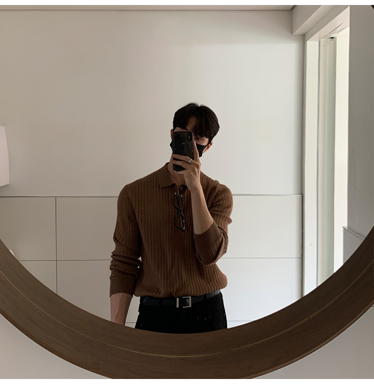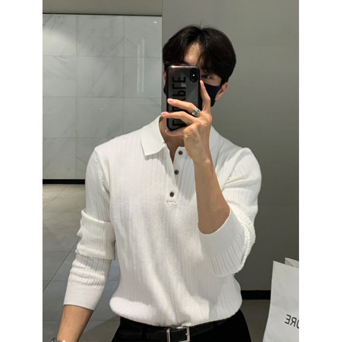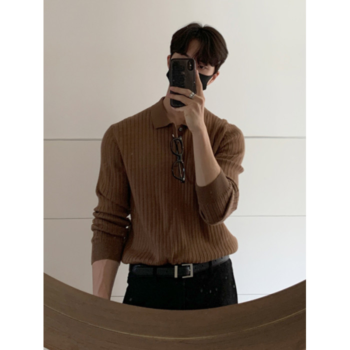 韓國秋冬高級感男士毛衣韓版寬松休閒純色翻領套頭長袖針織polo衫