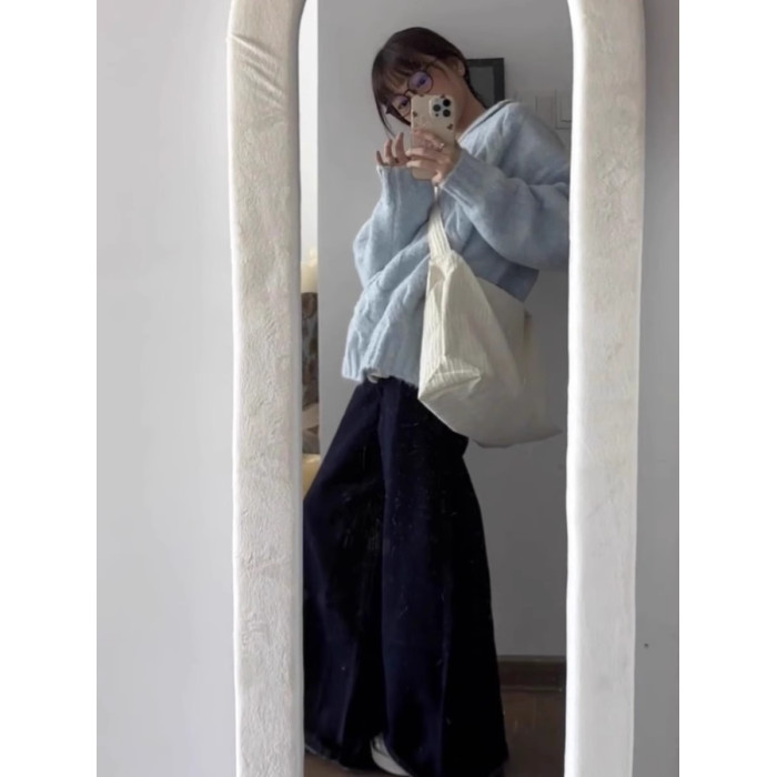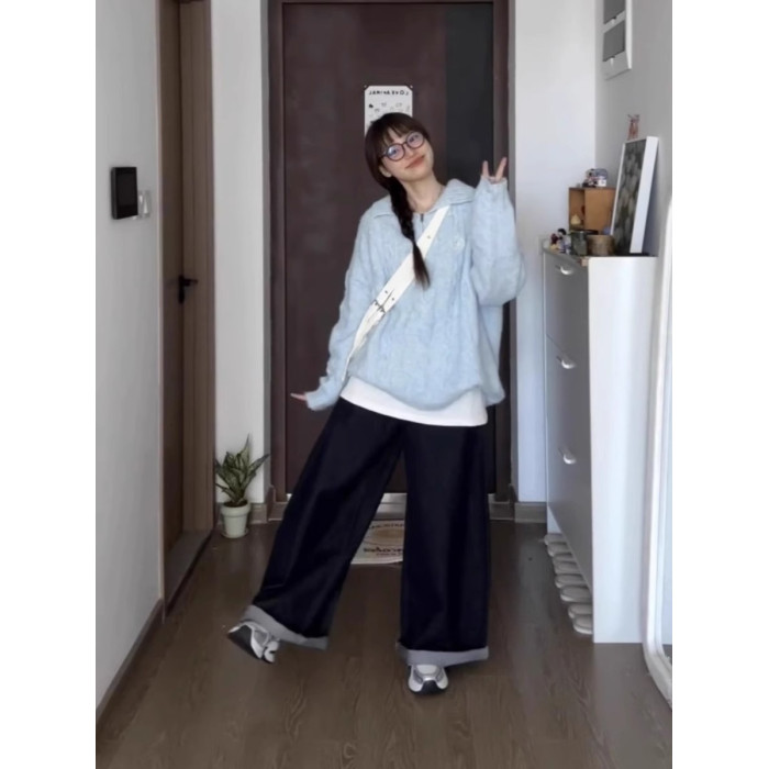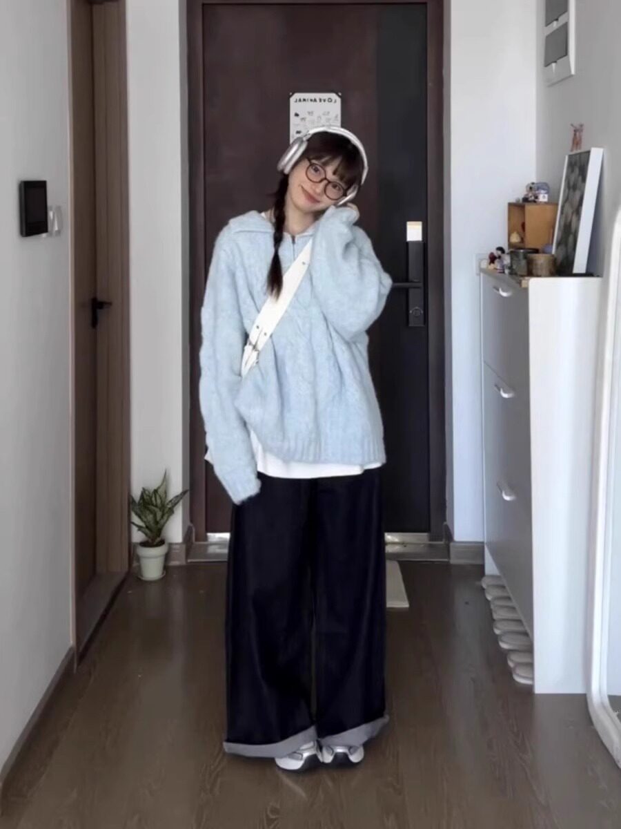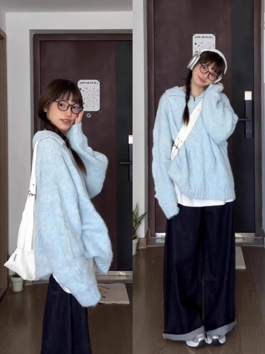 韓系baby藍色套頭長袖毛衣女秋冬軟糯慵懶風小衆寬松顯瘦針織上衣