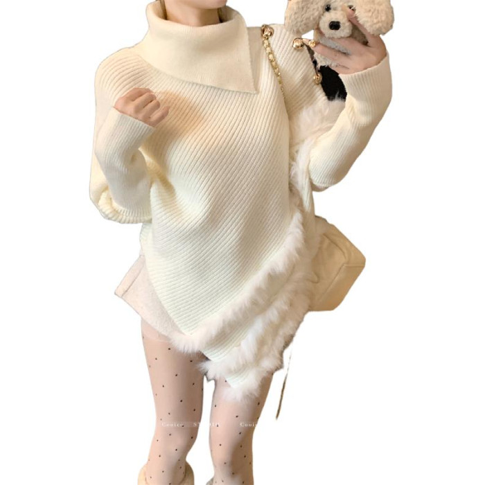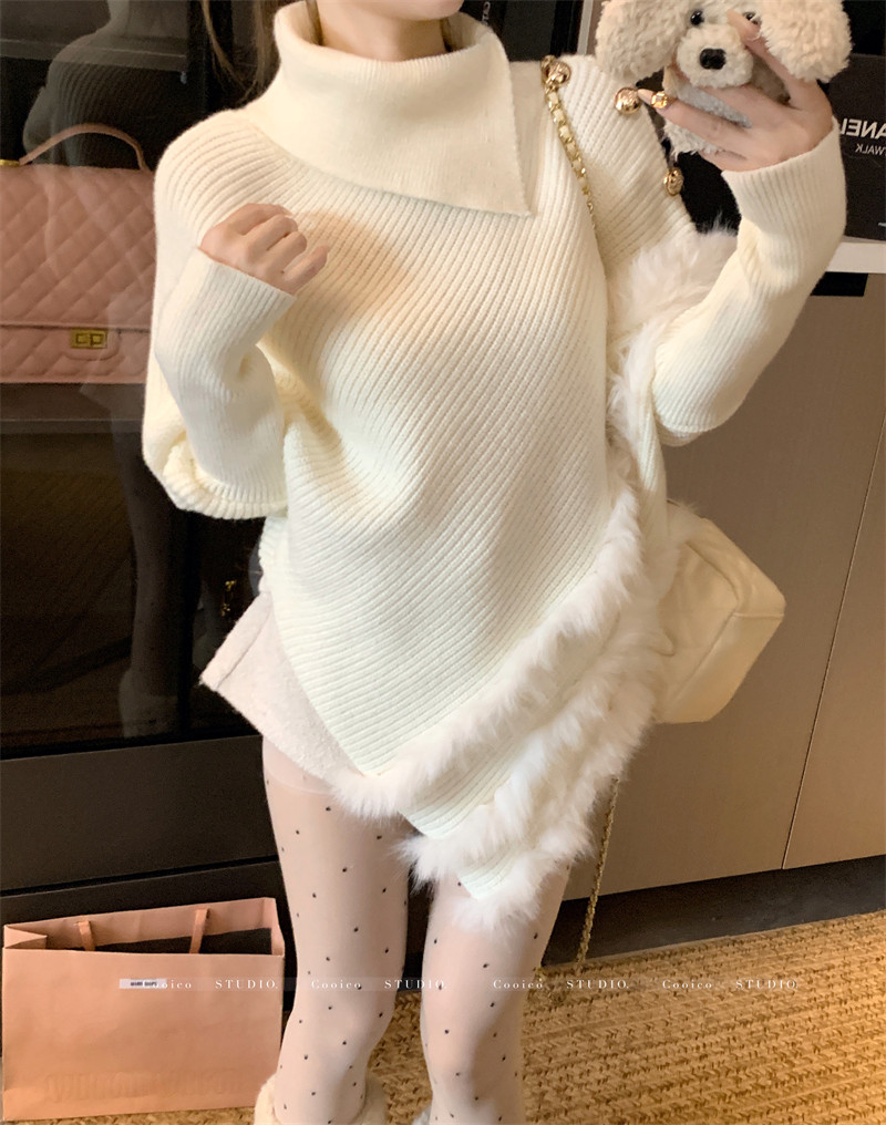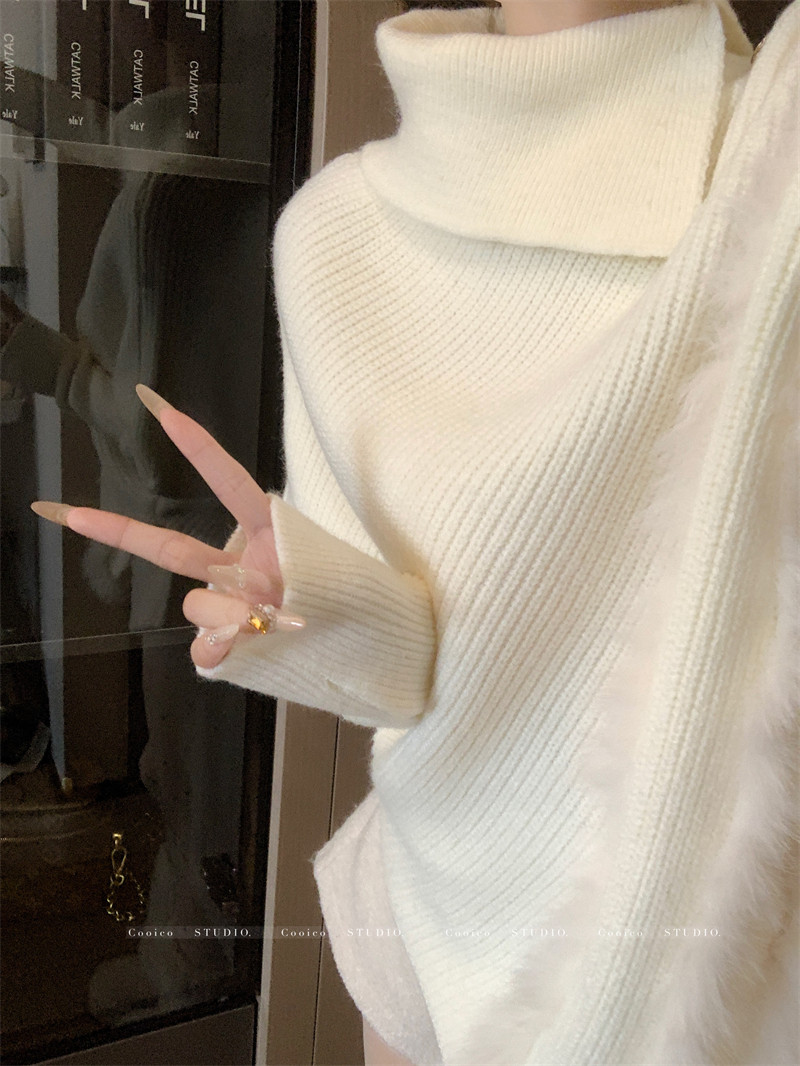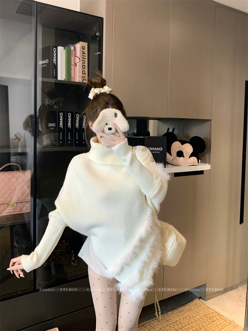 大碼女裝高領不規則慵懶秋冬款氛圍感蝙蝠袖軟糯毛毛拼接毛衣上衣