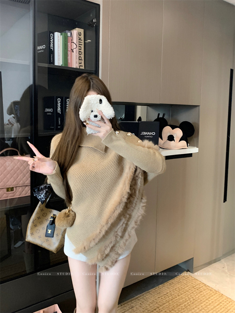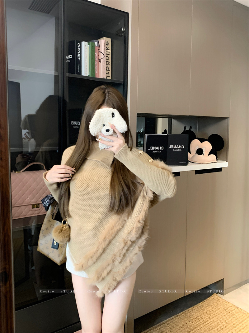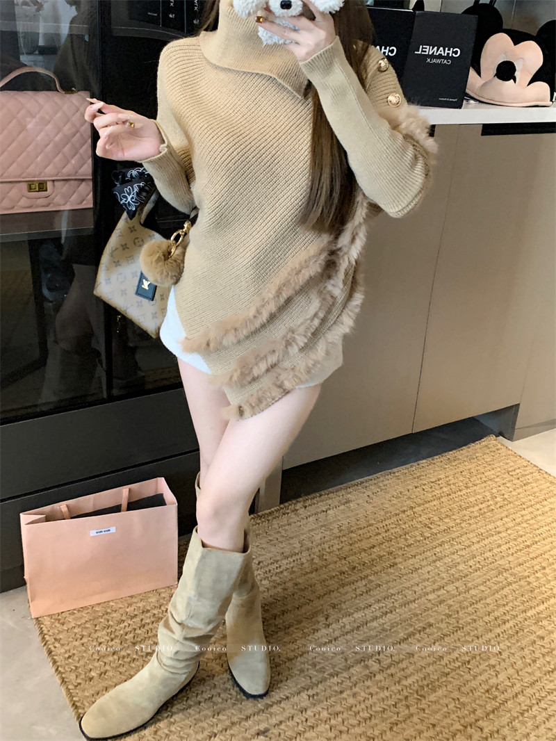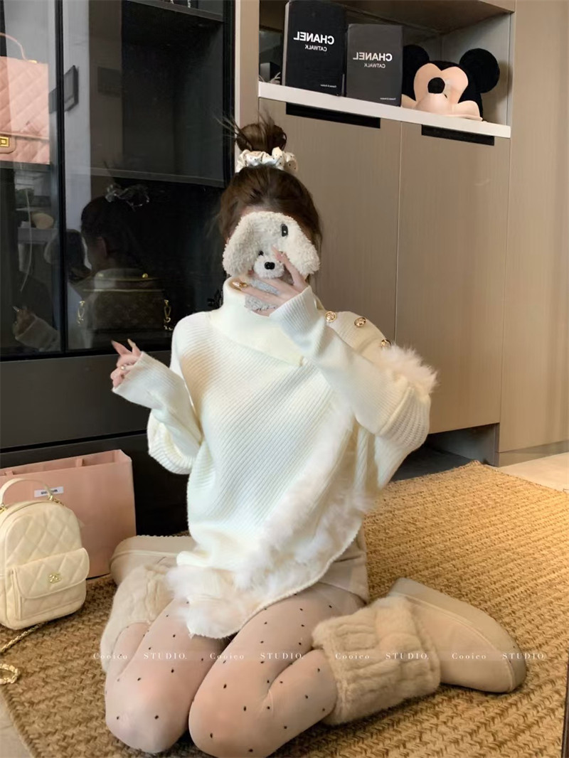 大碼女裝高領不規則慵懶秋冬款氛圍感蝙蝠袖軟糯毛毛拼接毛衣上衣