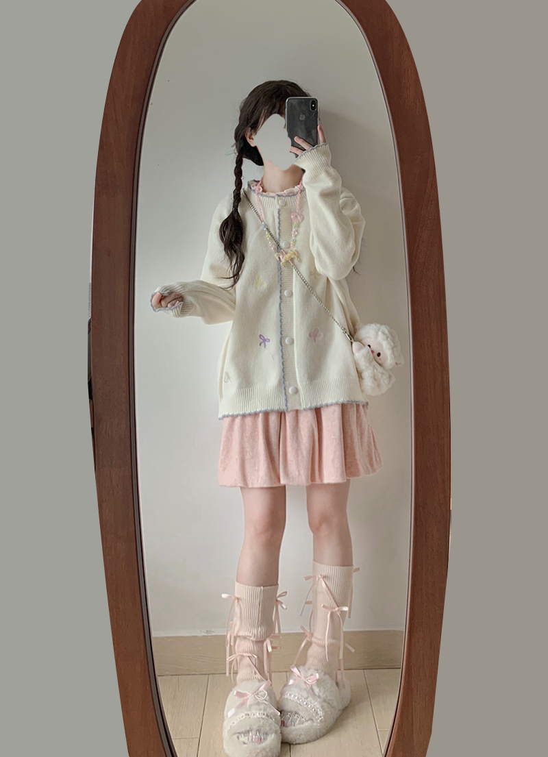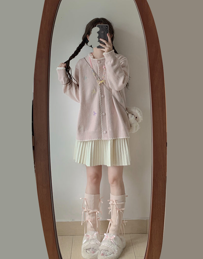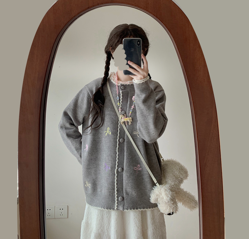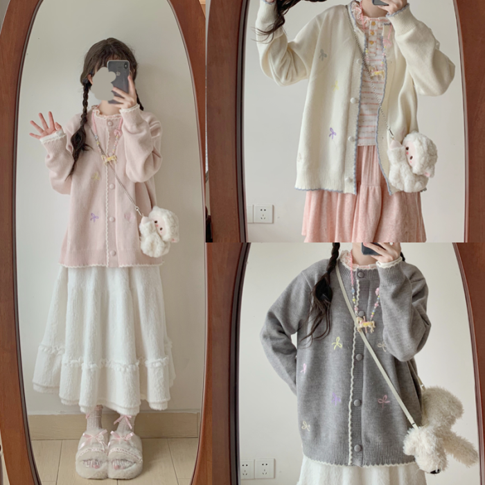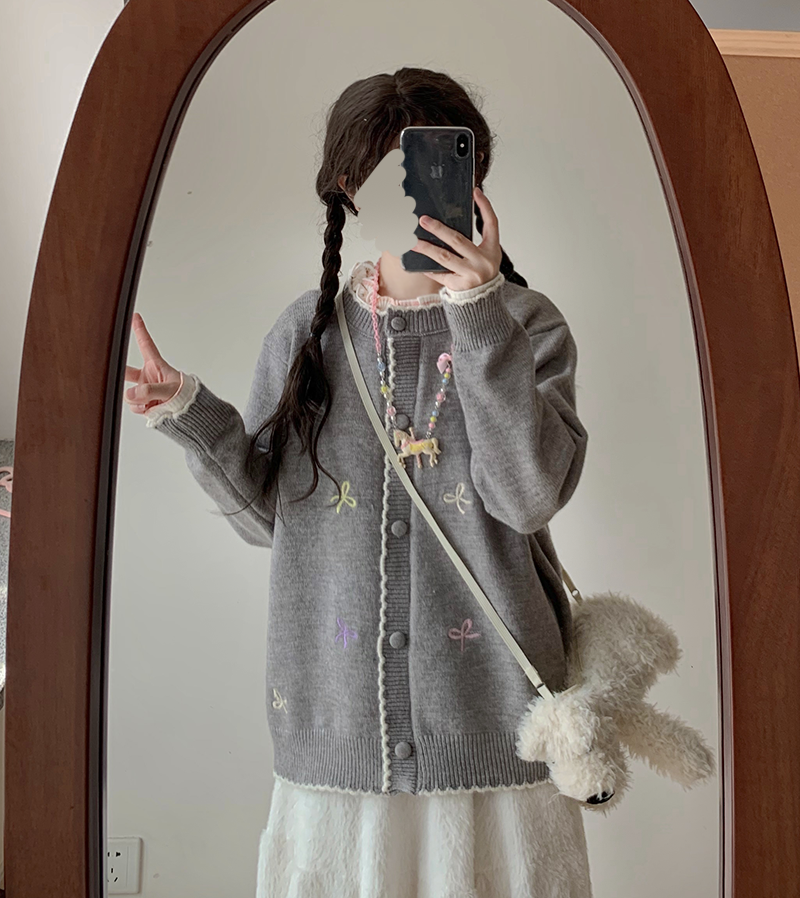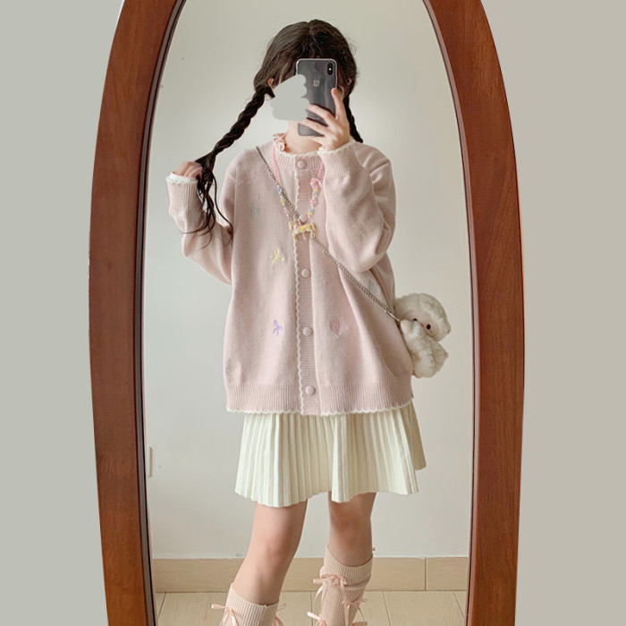 自製少女軟妹可愛蝴蝶結刺綉毛衣開衫圓領寬松針織外套學生百搭