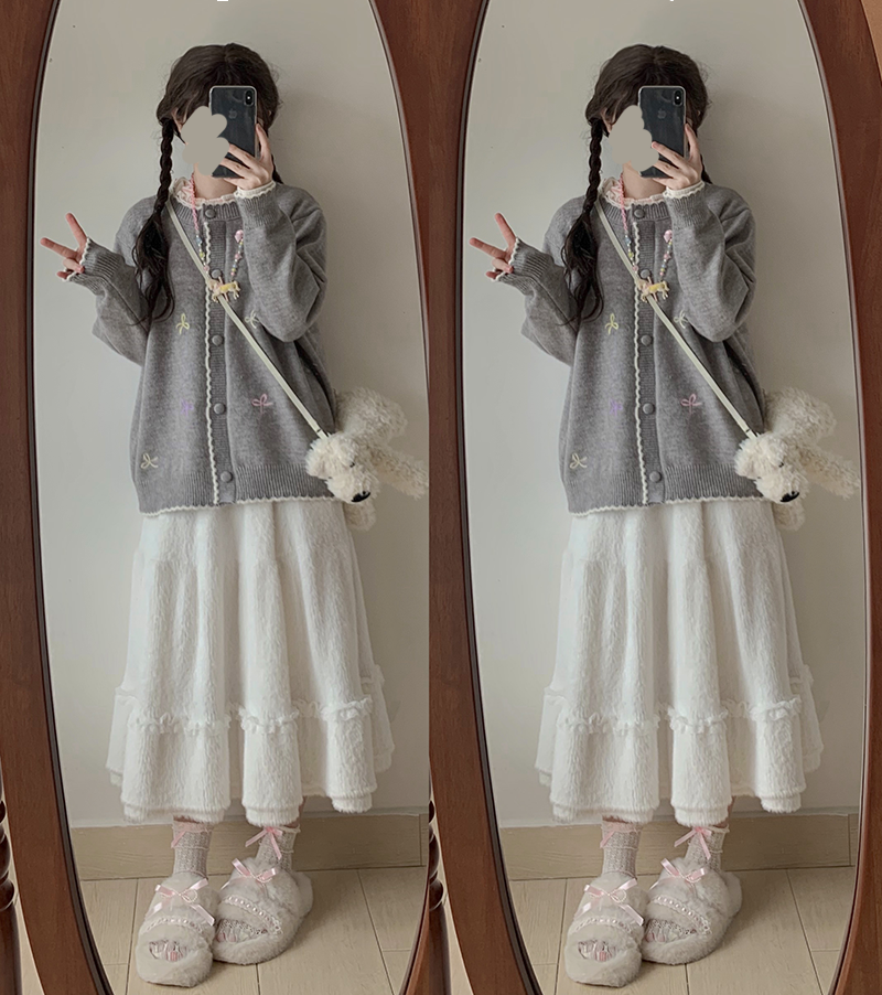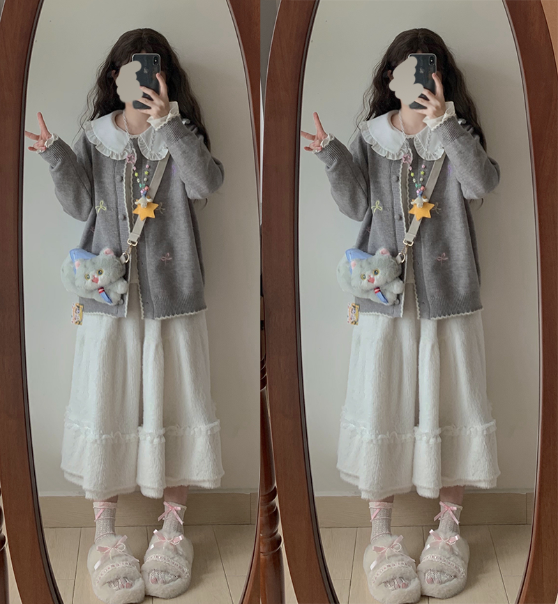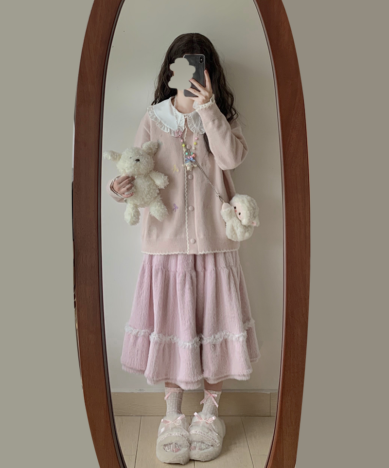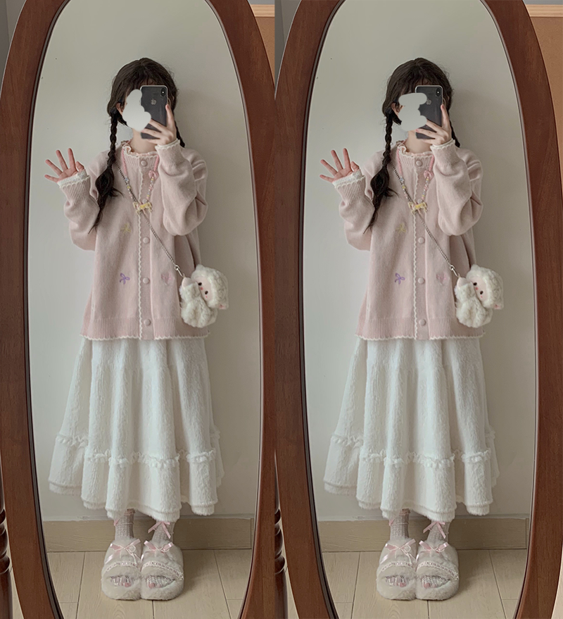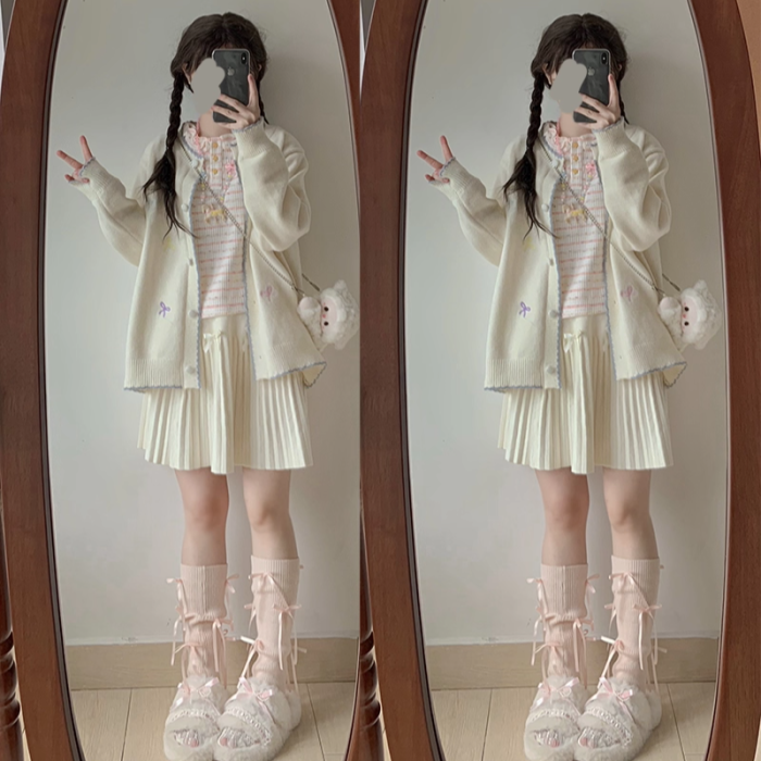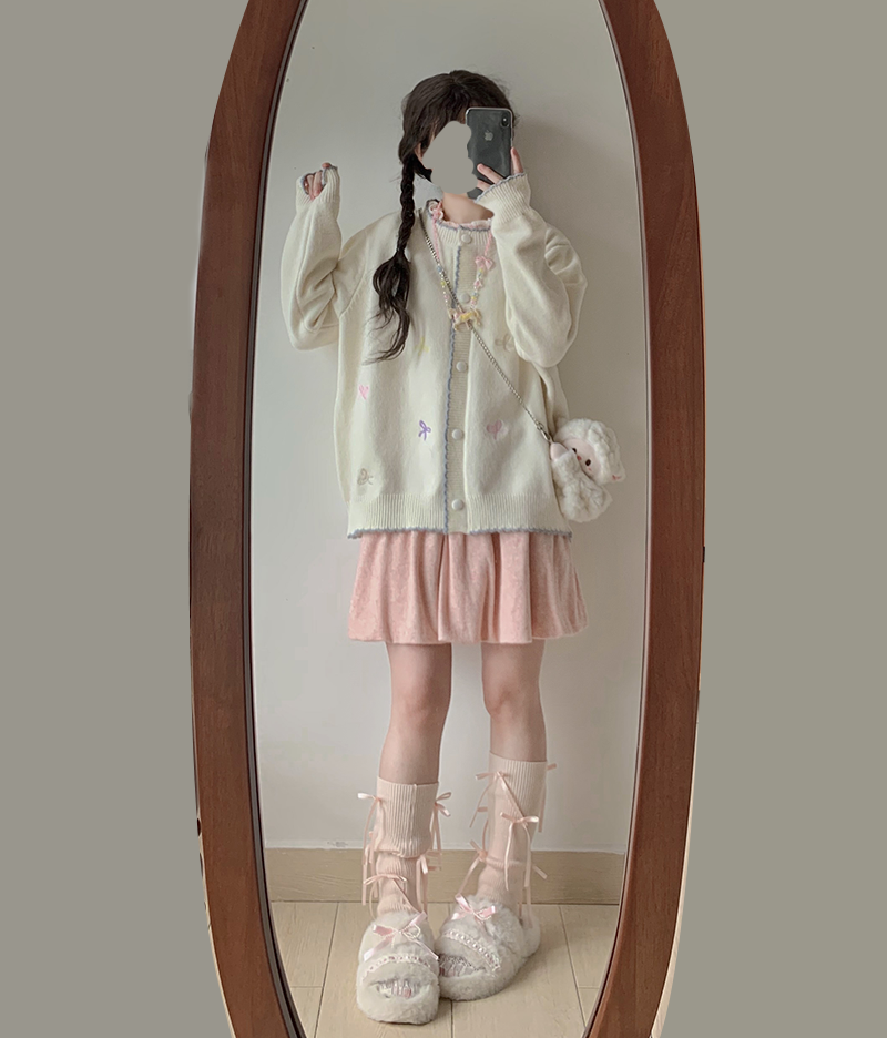 自製少女軟妹可愛蝴蝶結刺綉毛衣開衫圓領寬松針織外套學生百搭