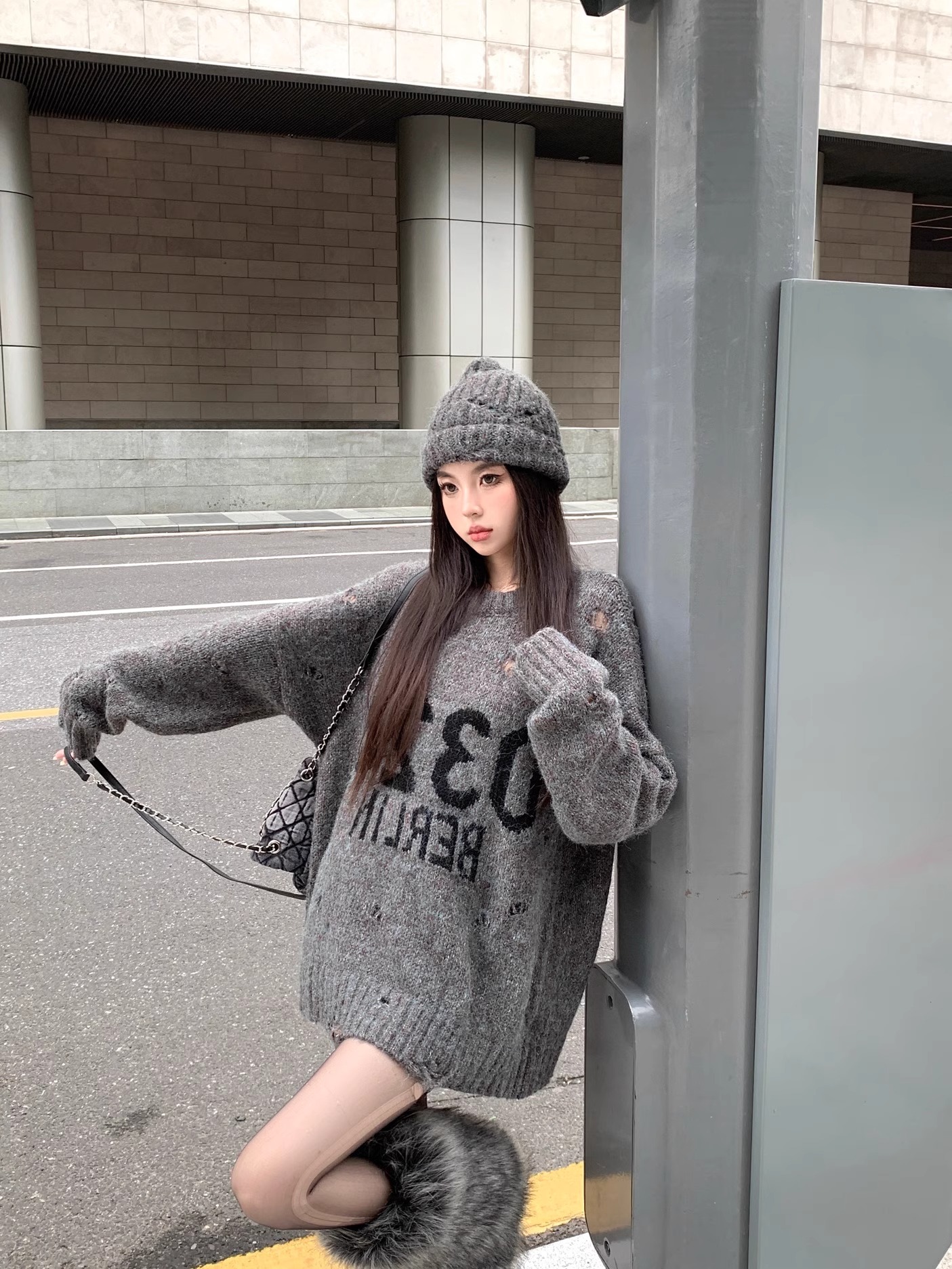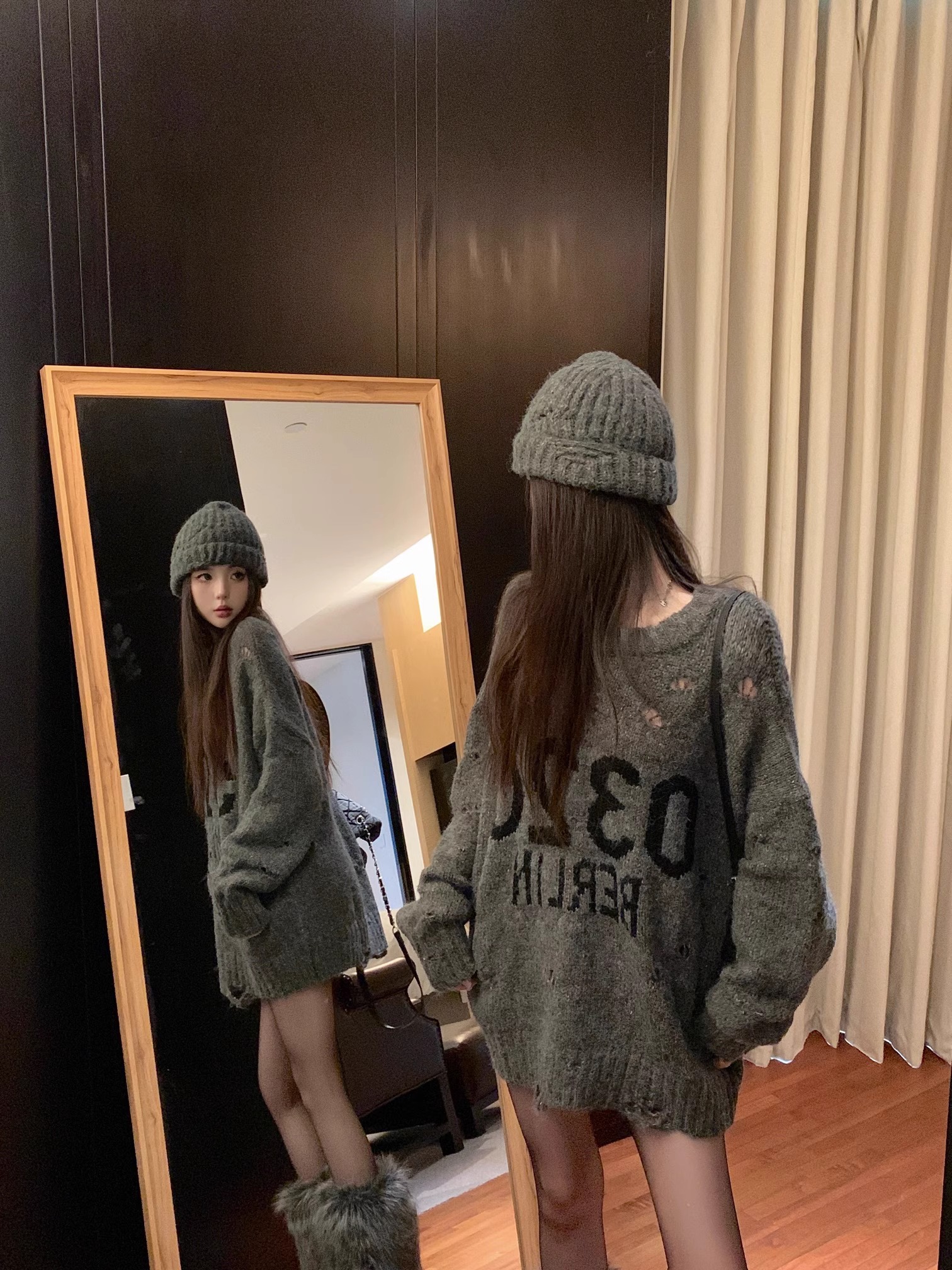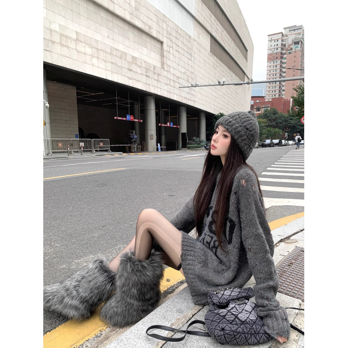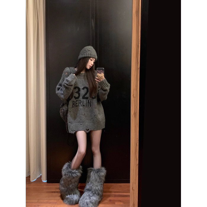 韓系寬松復古破洞灰色毛衣女秋冬設計感圓領字母針織衫中長款上衣