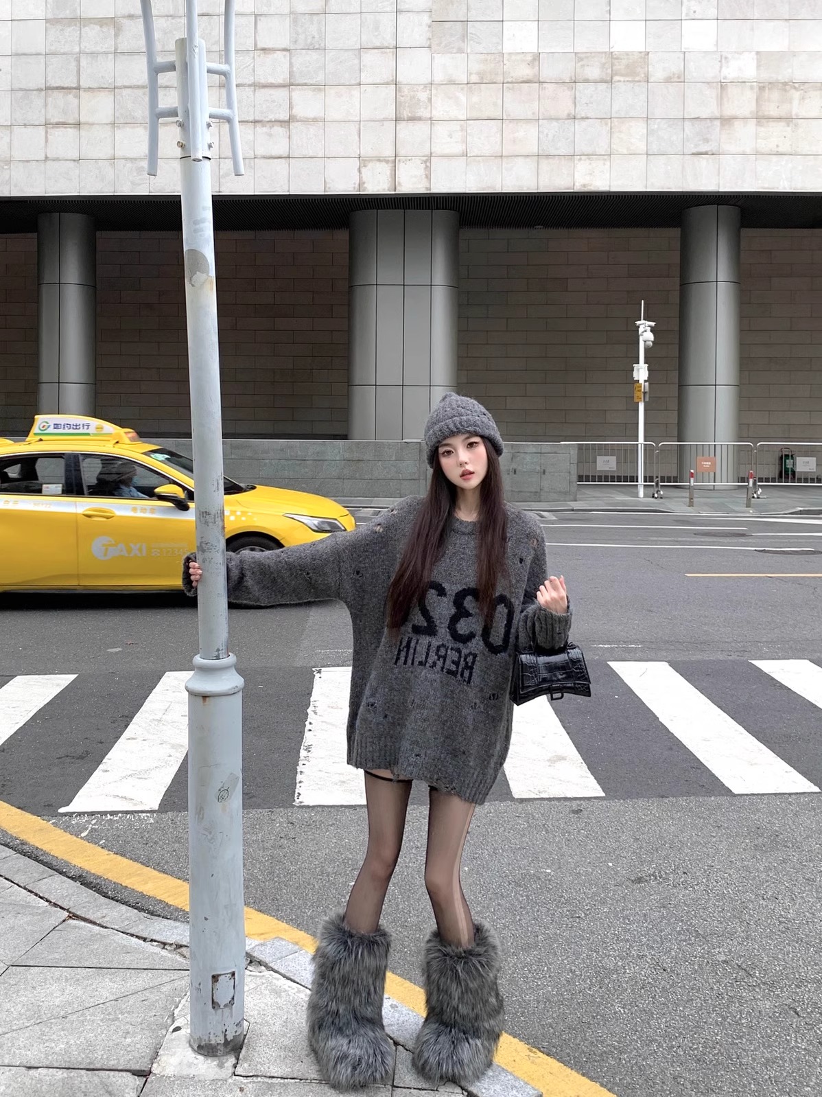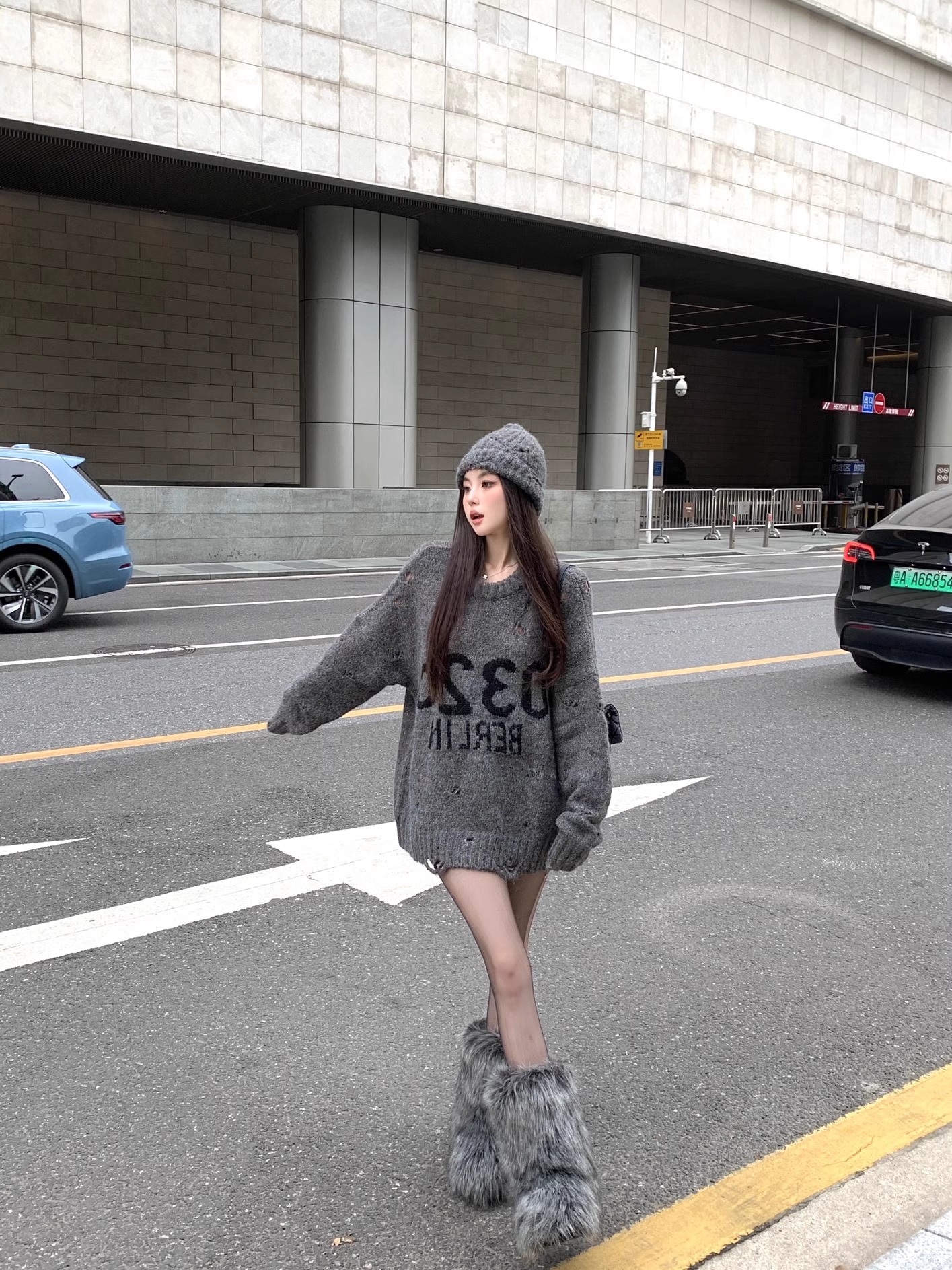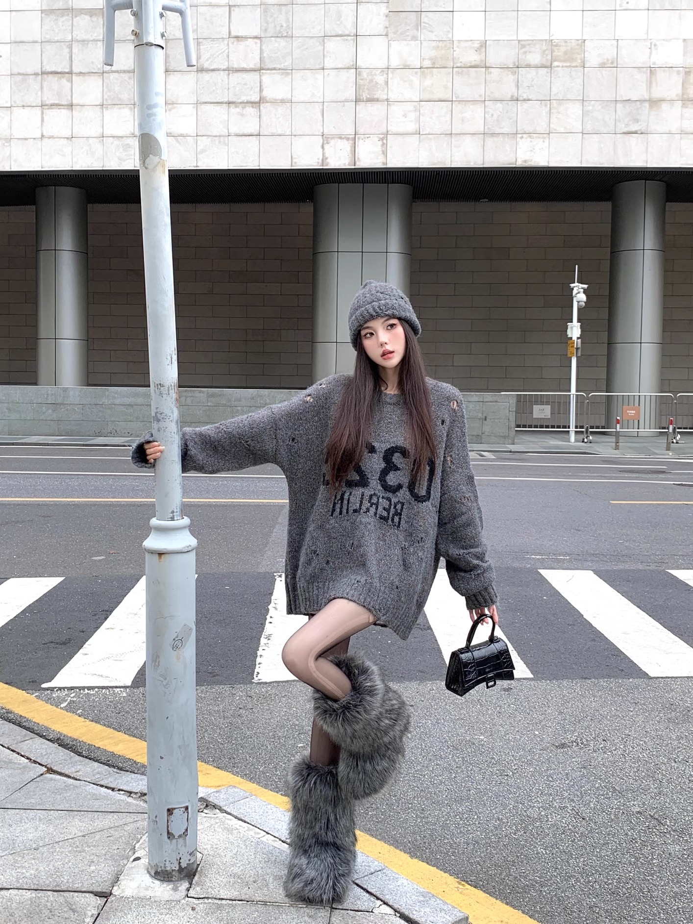韓系寬松復古破洞灰色毛衣女秋冬設計感圓領字母針織衫中長款上衣