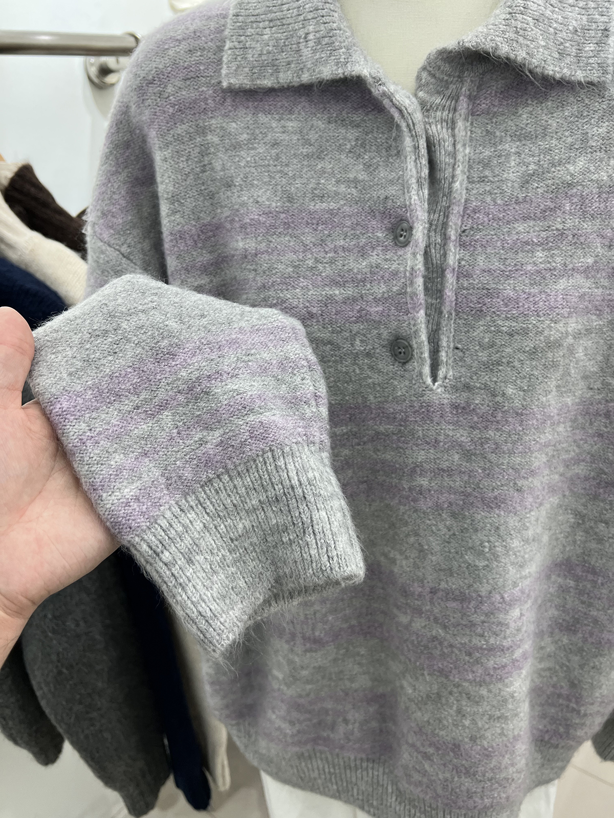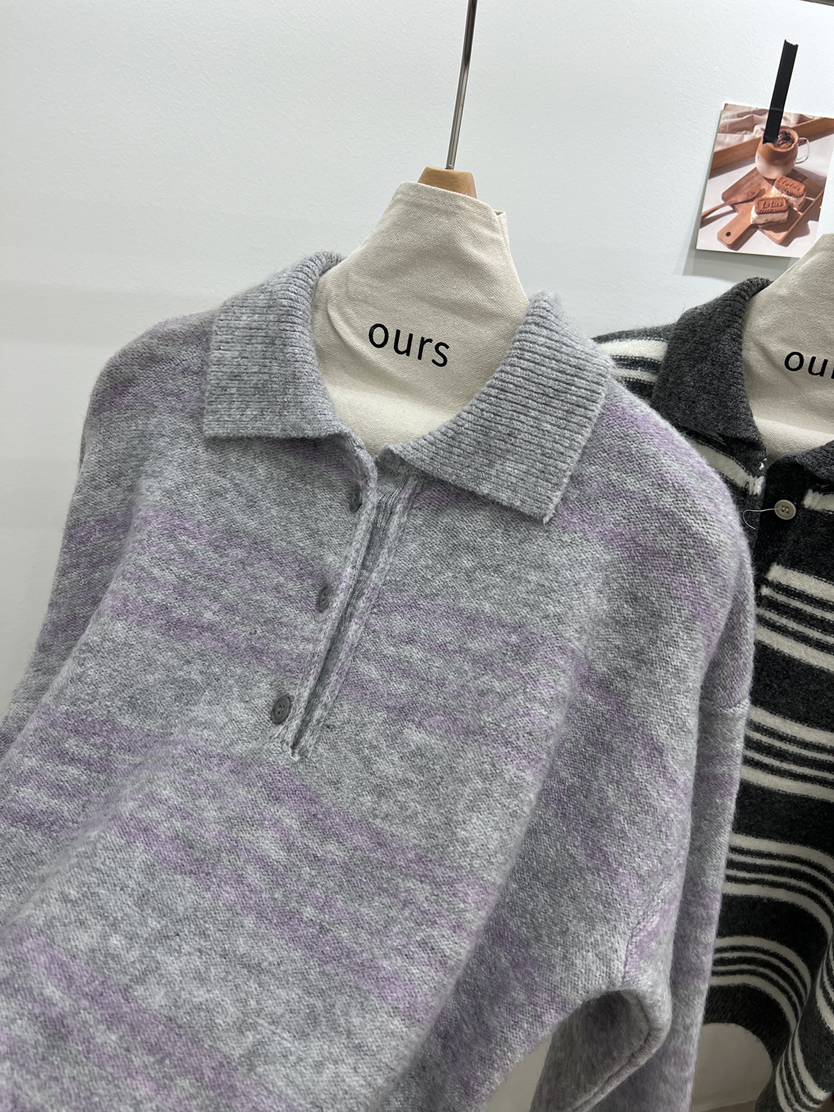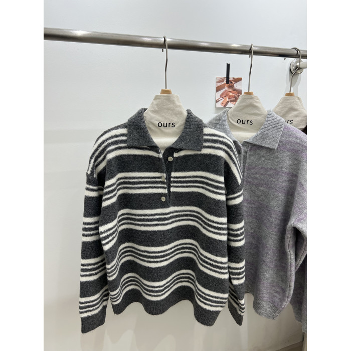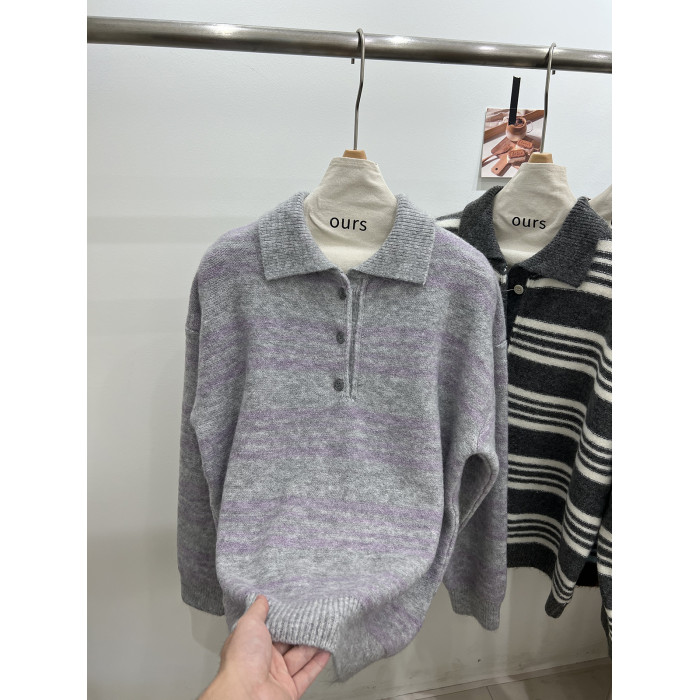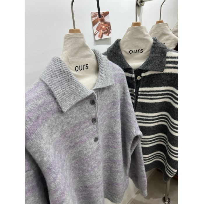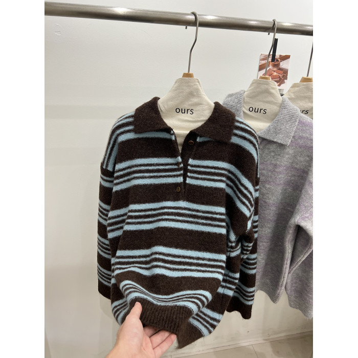 韓系復古撞色Polo領條紋套頭毛衣女秋冬新款軟糯慵懶針織衫上衣潮
