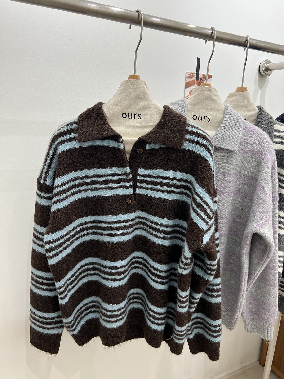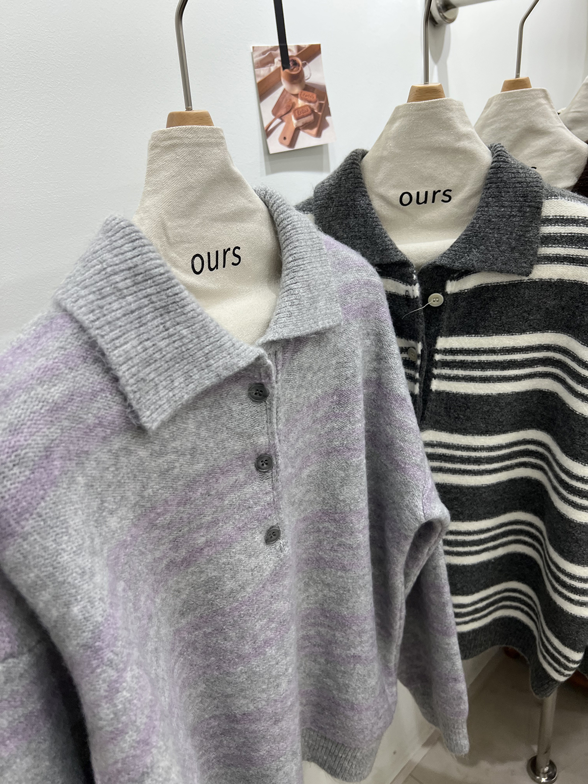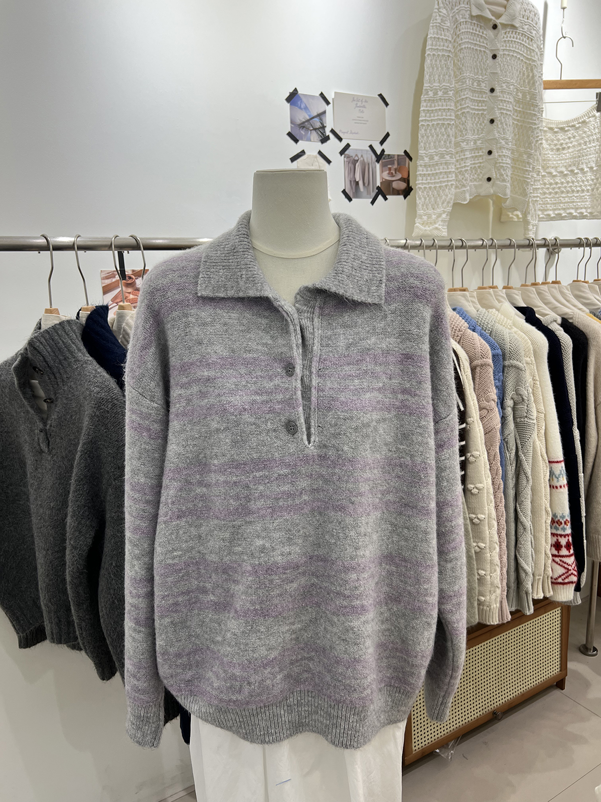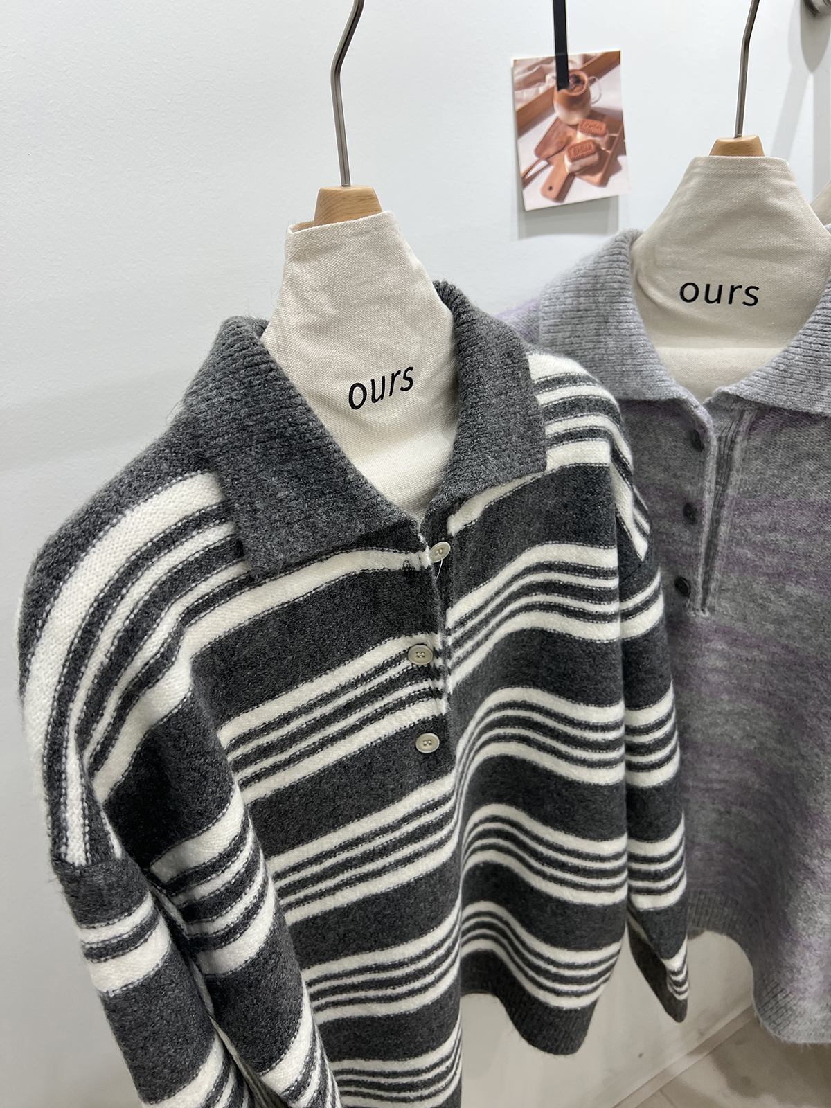 韓系復古撞色Polo領條紋套頭毛衣女秋冬新款軟糯慵懶針織衫上衣潮