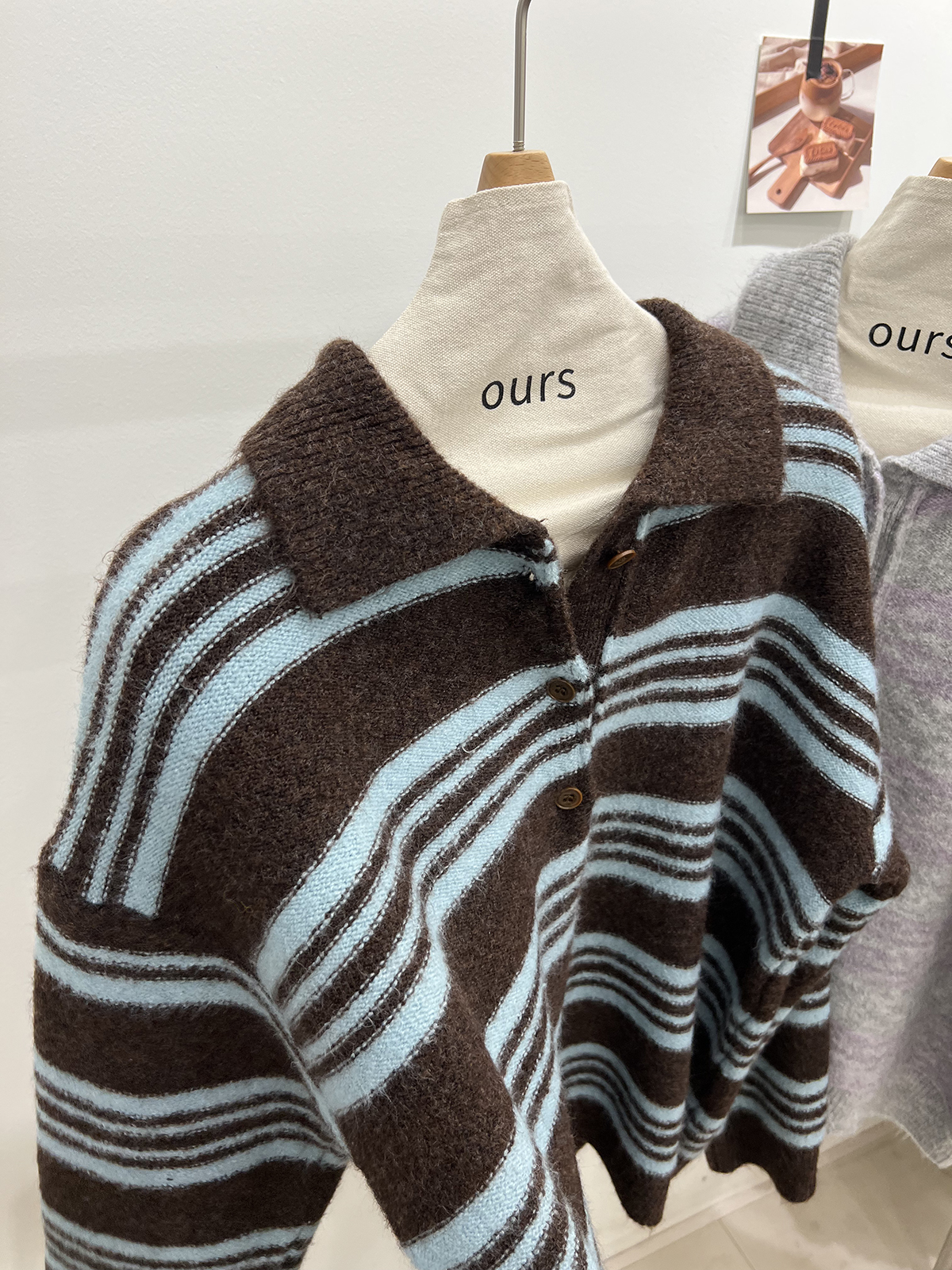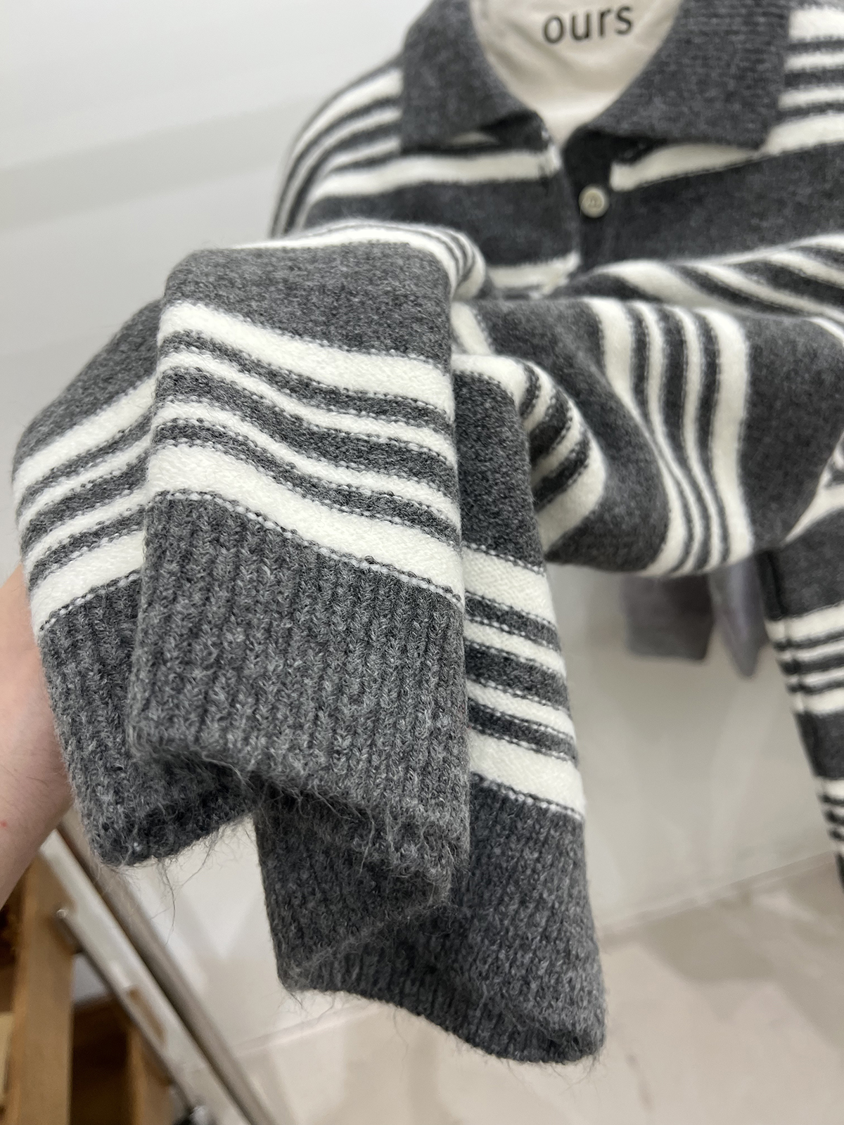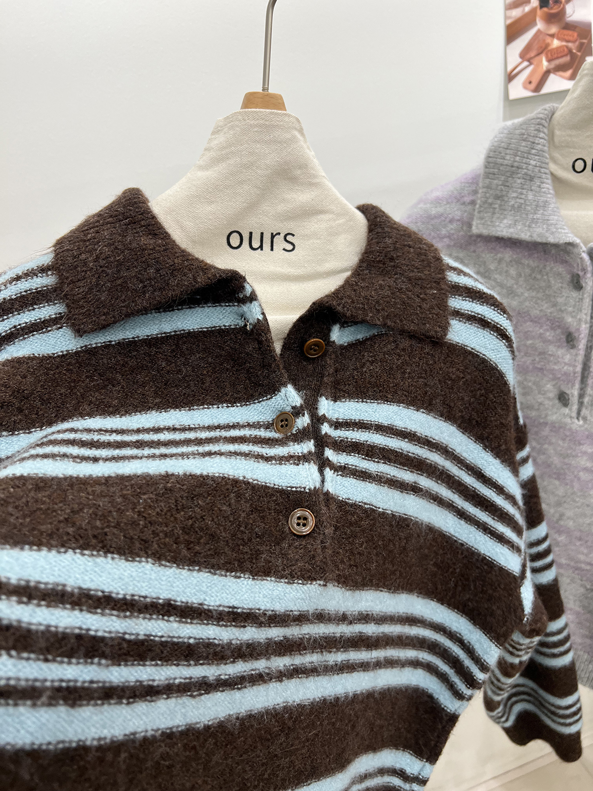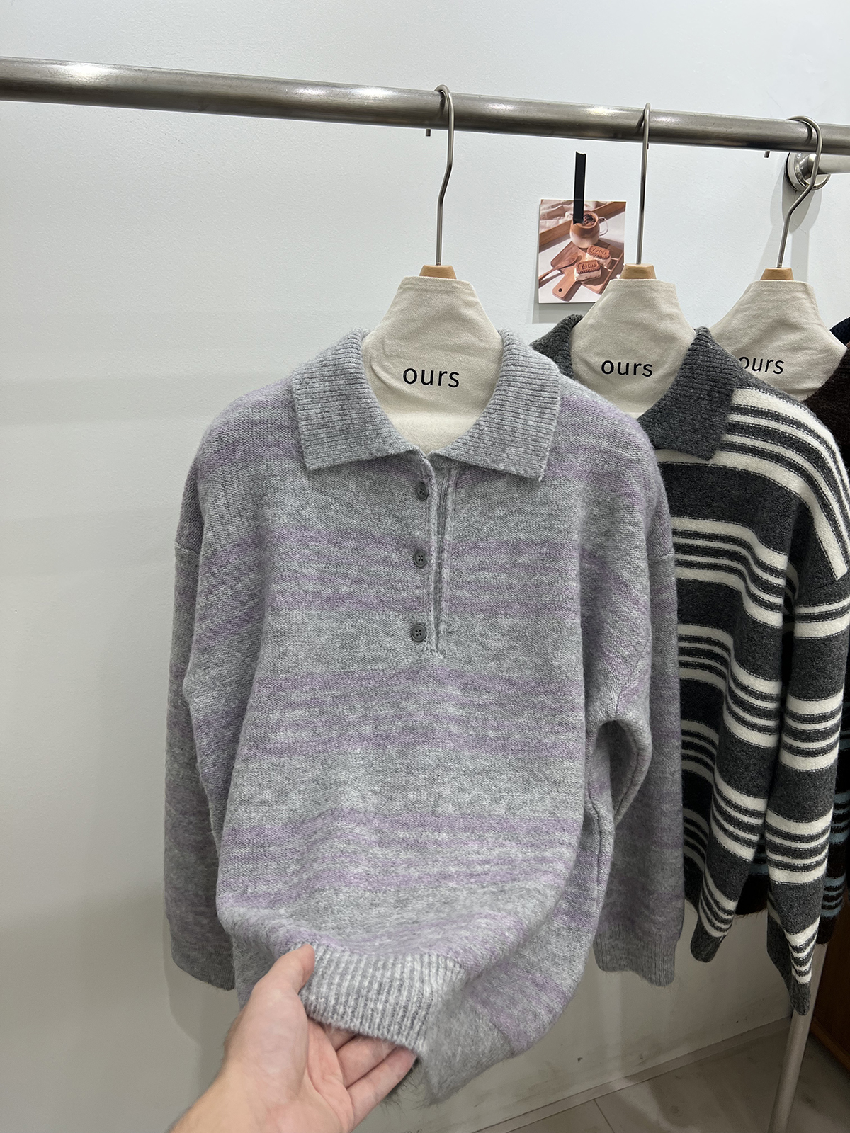 韓系復古撞色Polo領條紋套頭毛衣女秋冬新款軟糯慵懶針織衫上衣潮