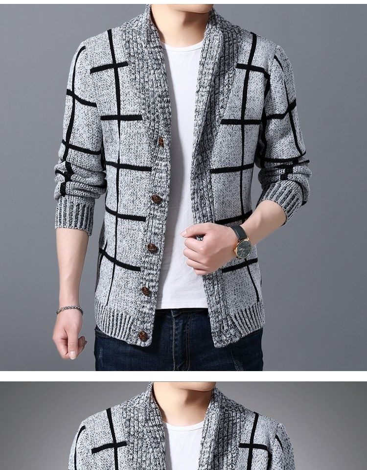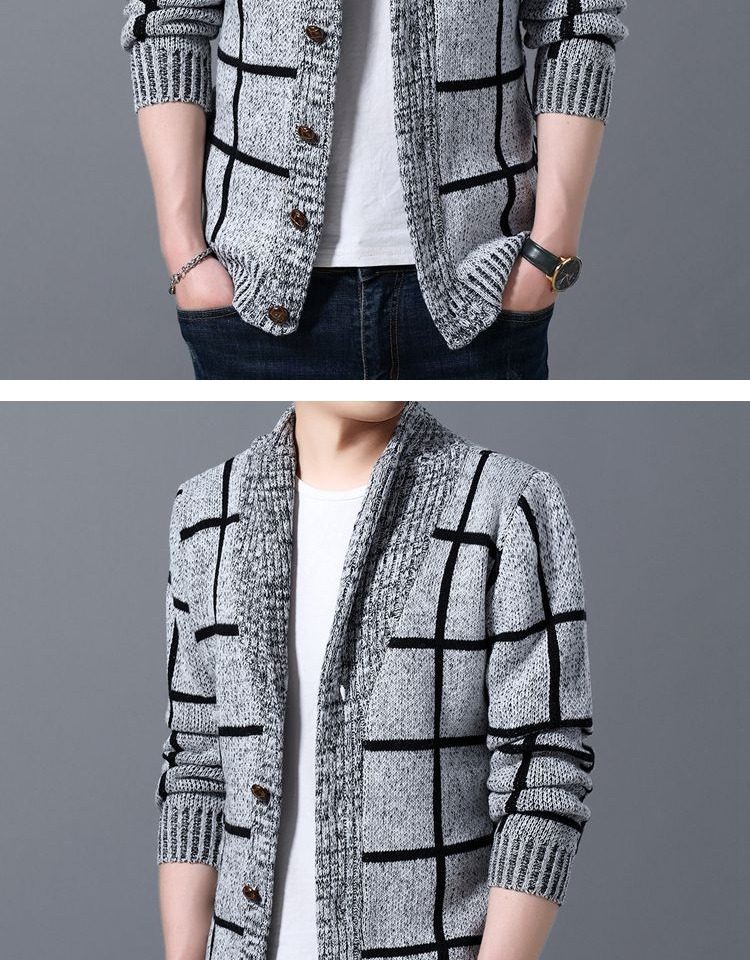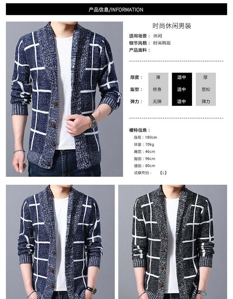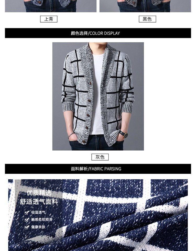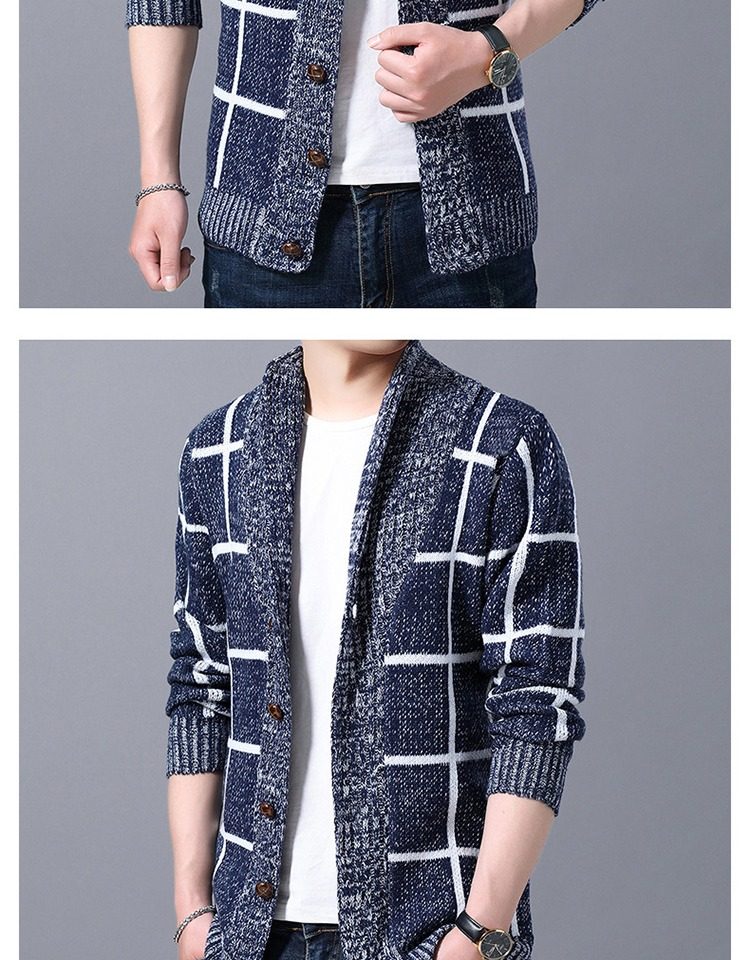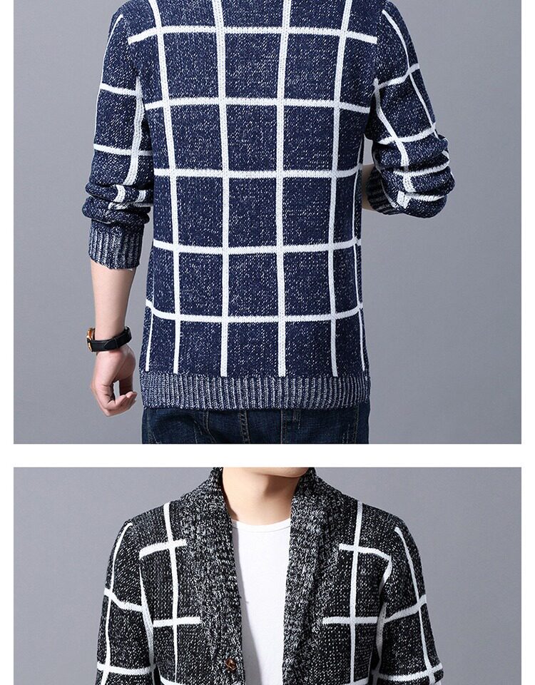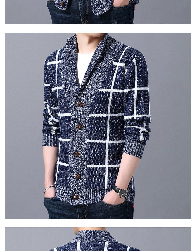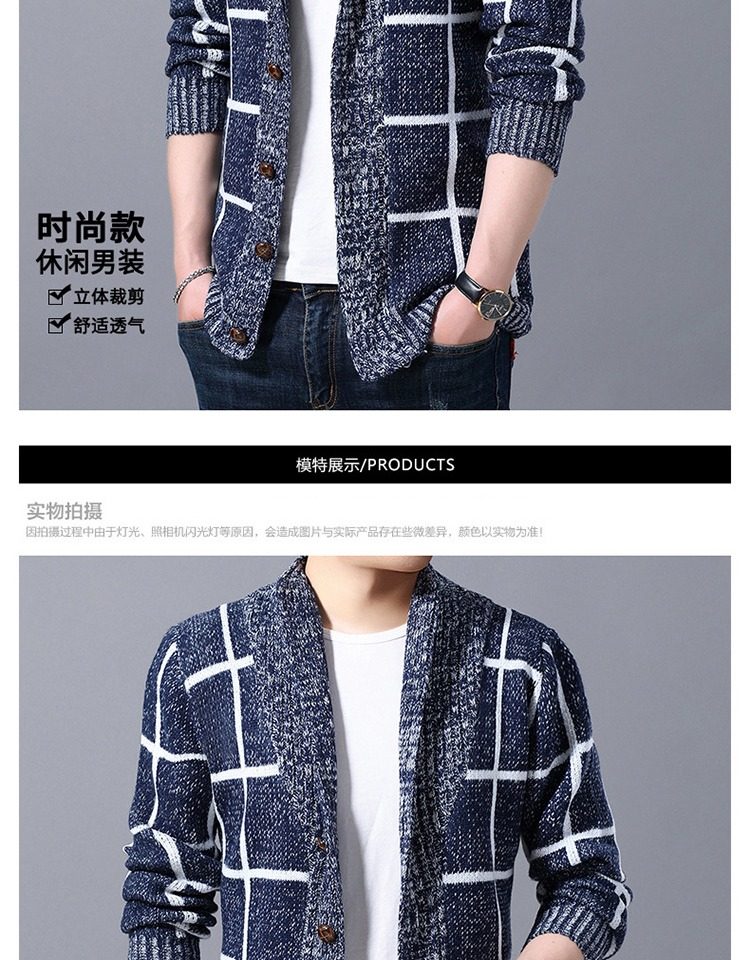 男士休閒開衫毛衣外套加厚方格子藍灰色針織衫印花長袖秋冬上衣服