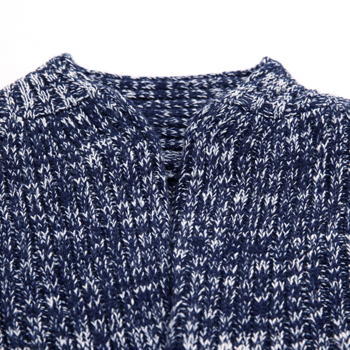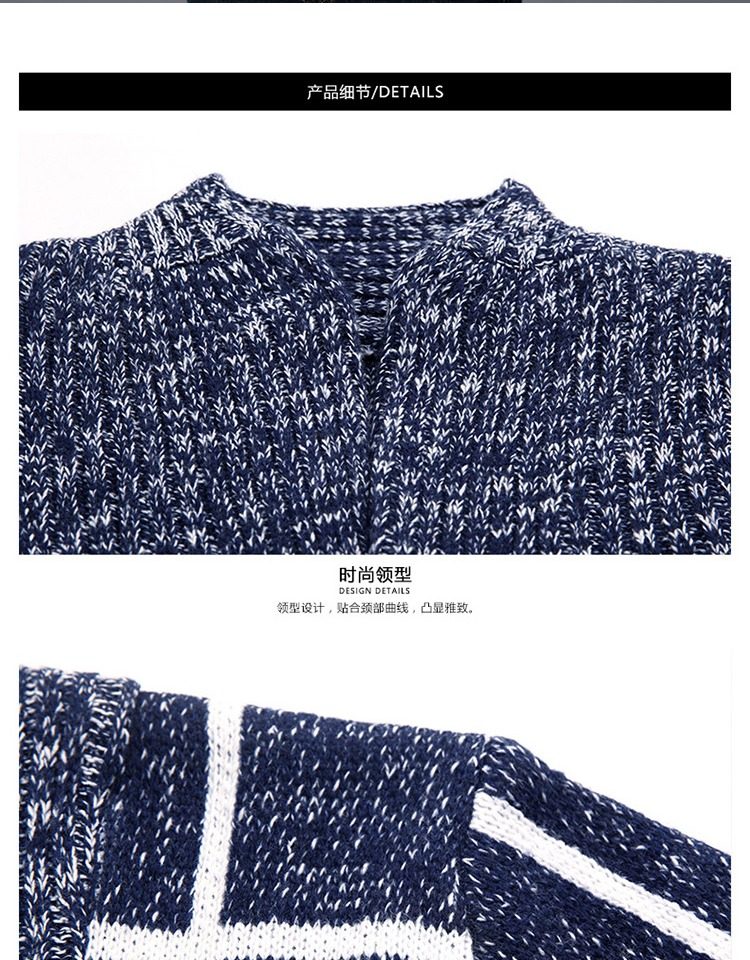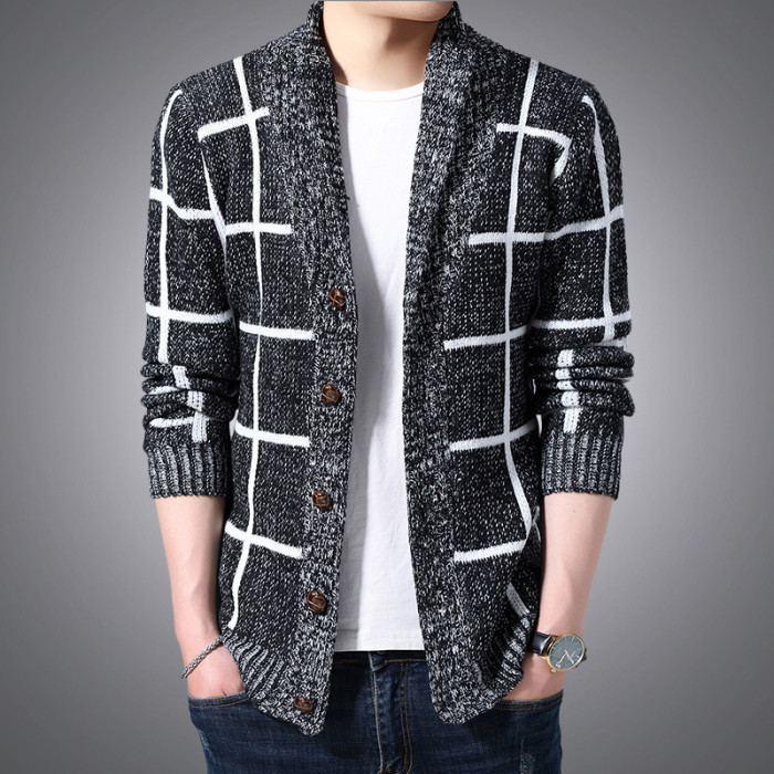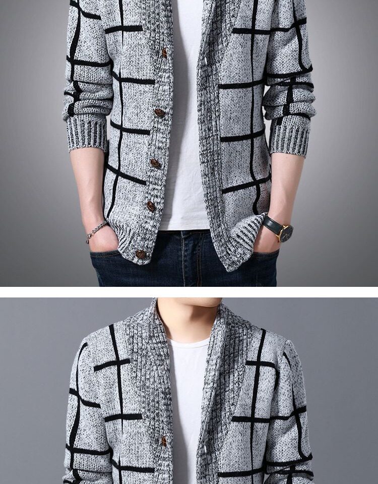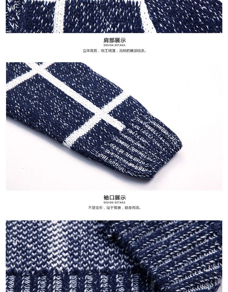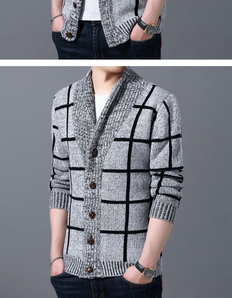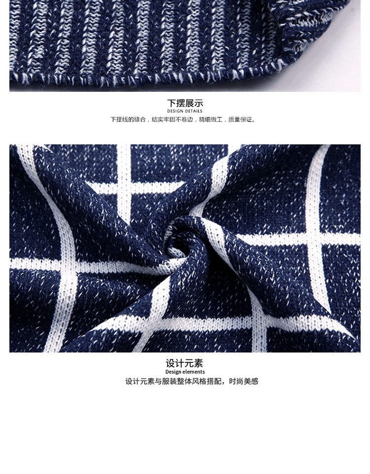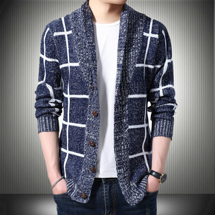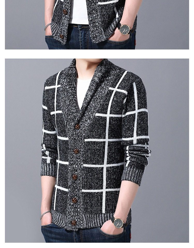 男士休閒開衫毛衣外套加厚方格子藍灰色針織衫印花長袖秋冬上衣服