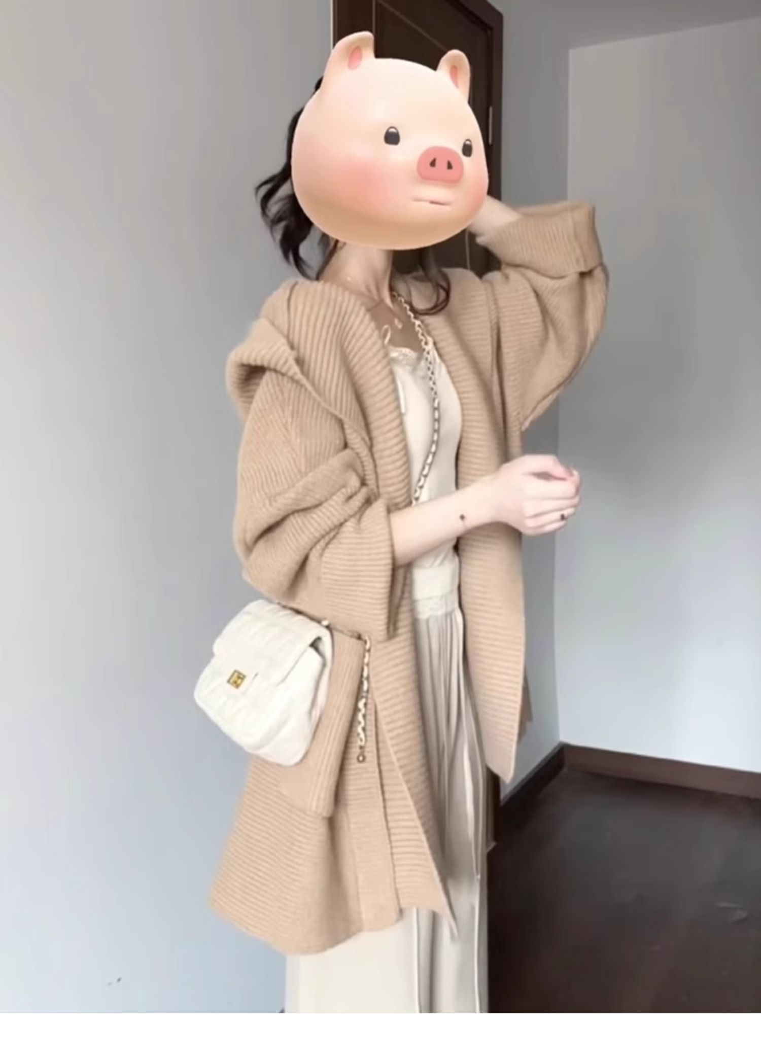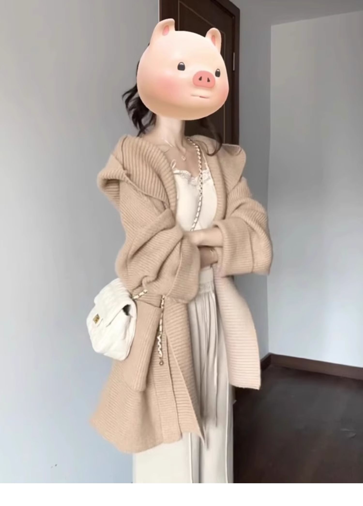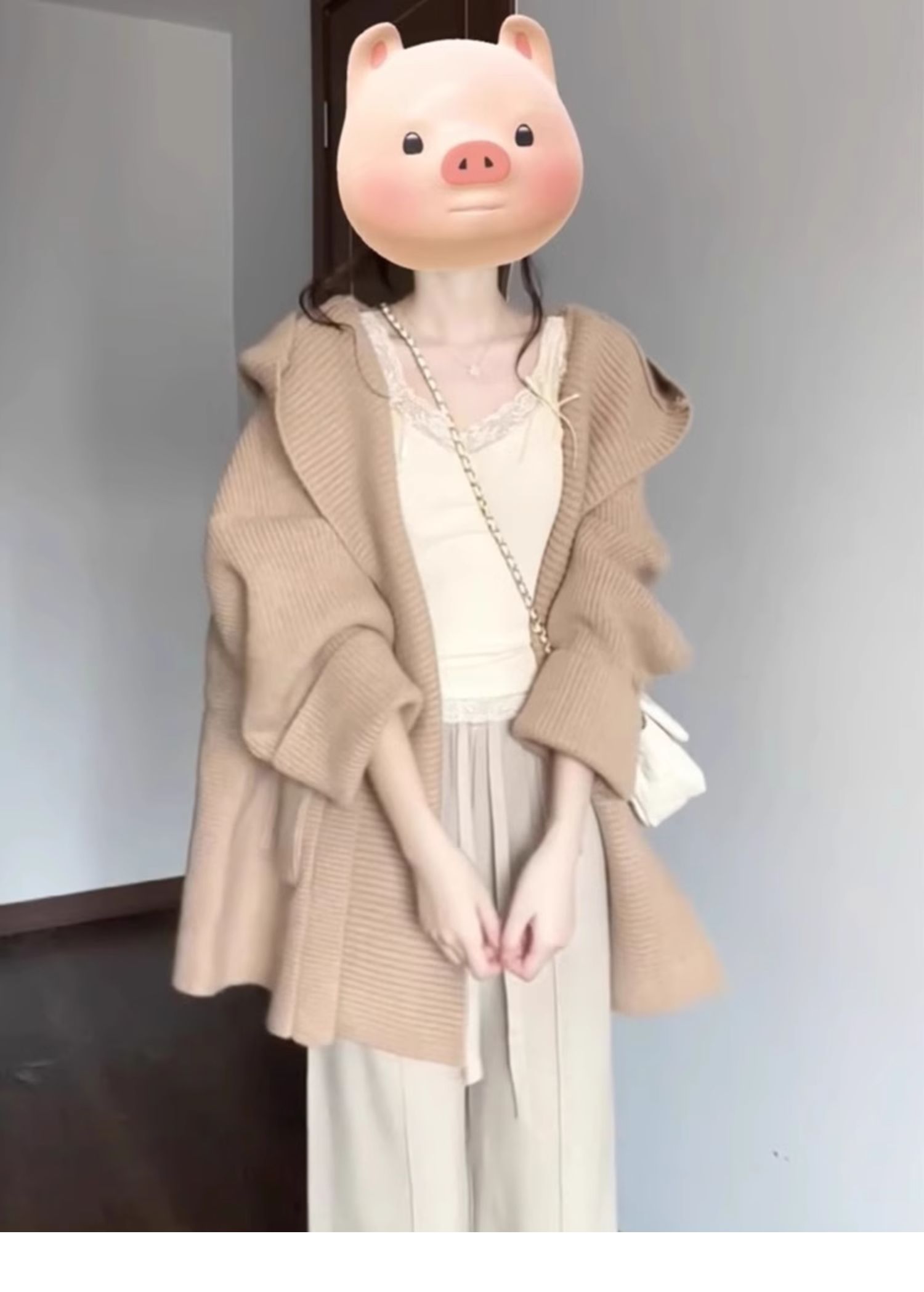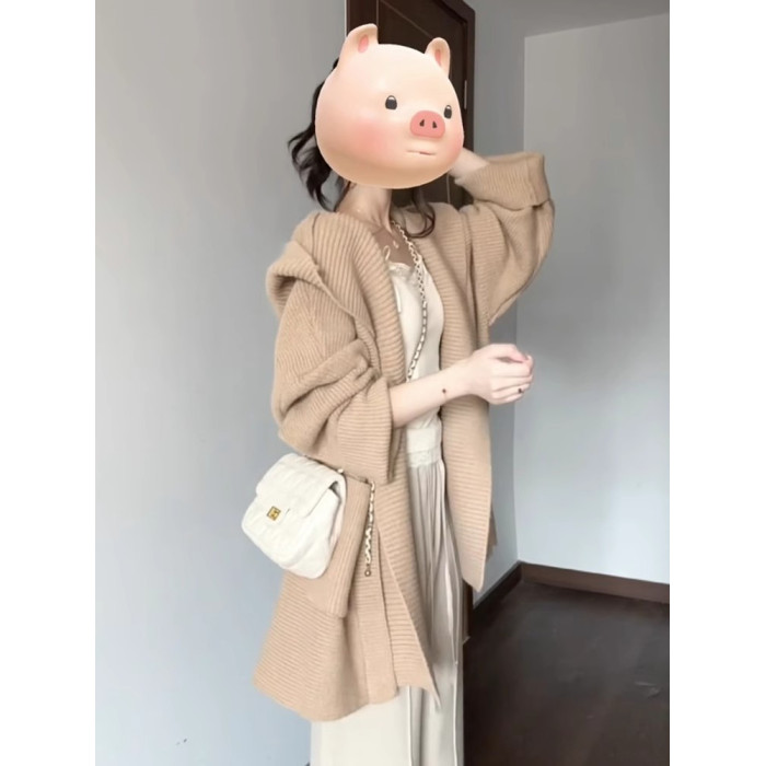 法式氣質卡其色連帽針織開衫女秋冬季寬松顯瘦毛衣外套中長款上衣
