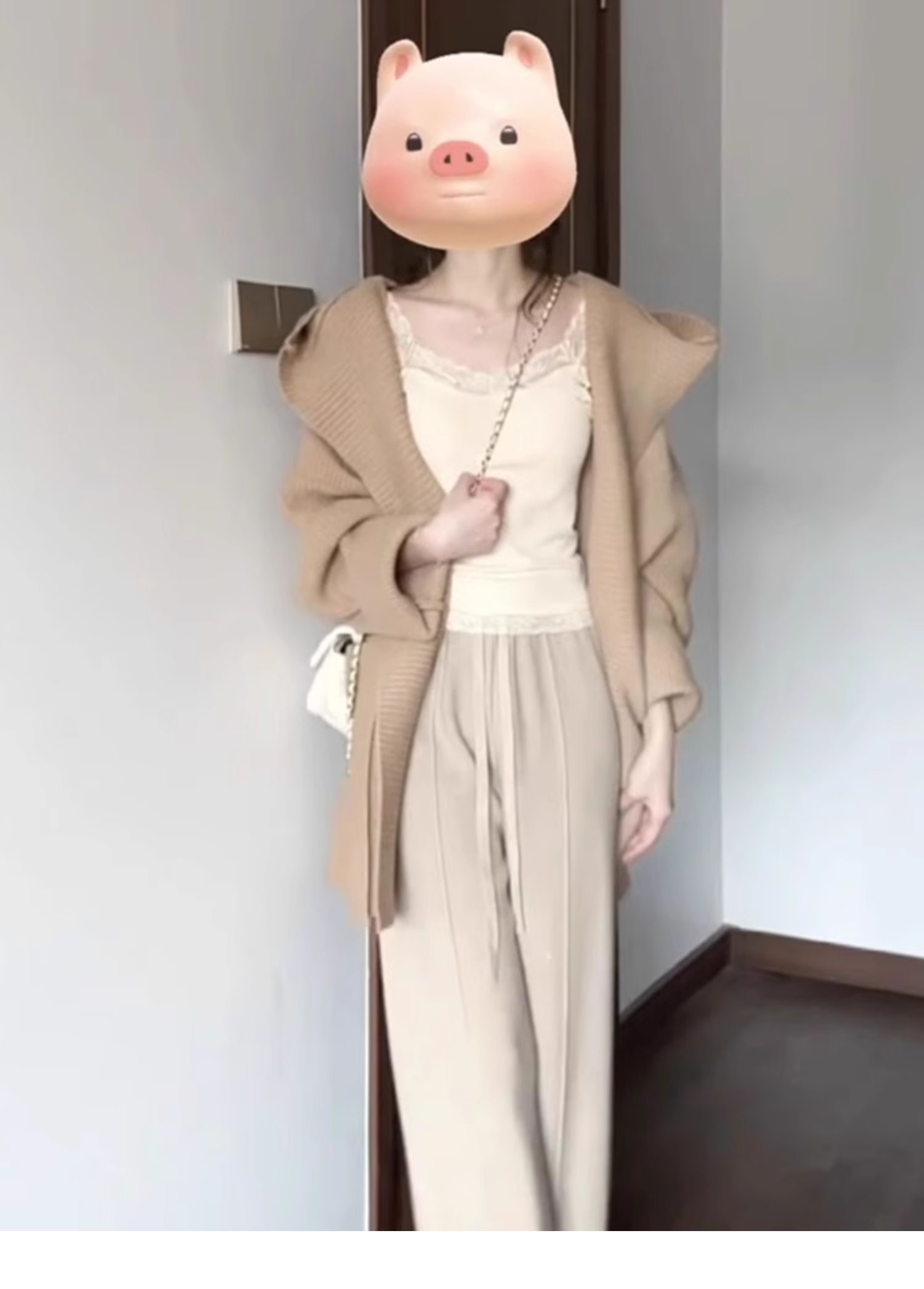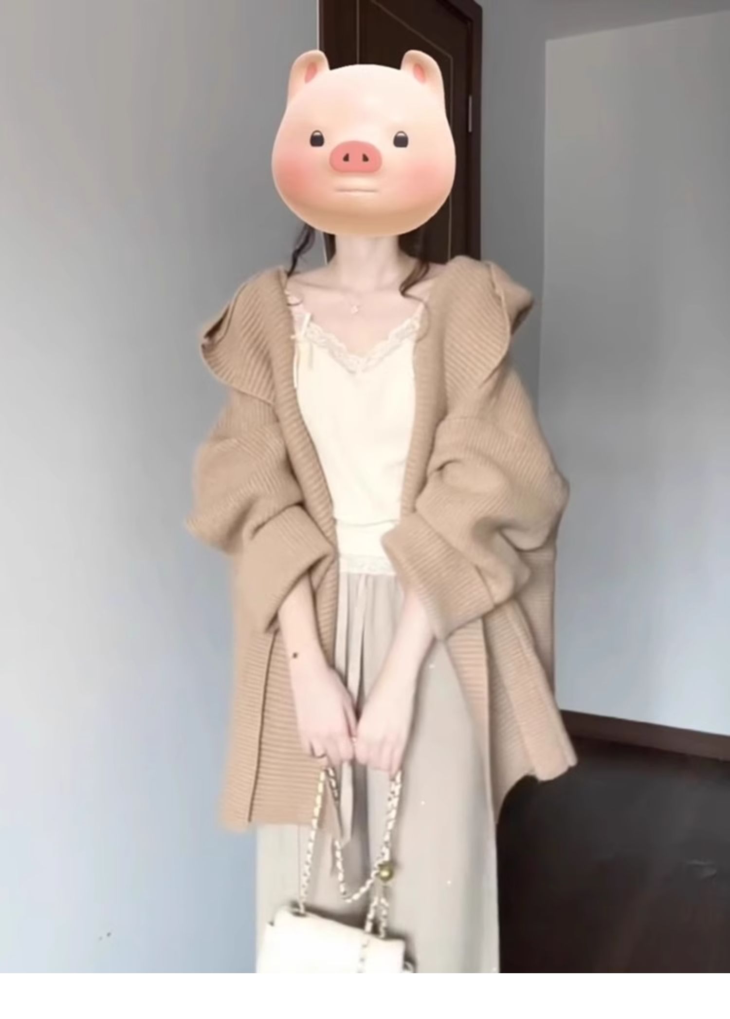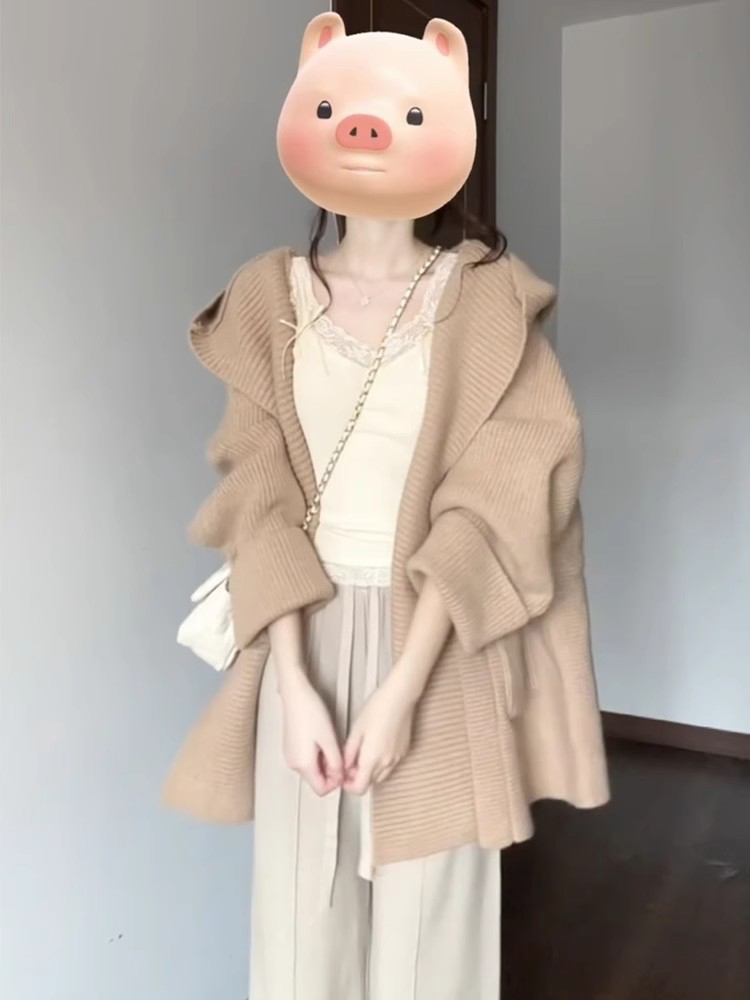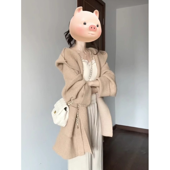 法式氣質卡其色連帽針織開衫女秋冬季寬松顯瘦毛衣外套中長款上衣