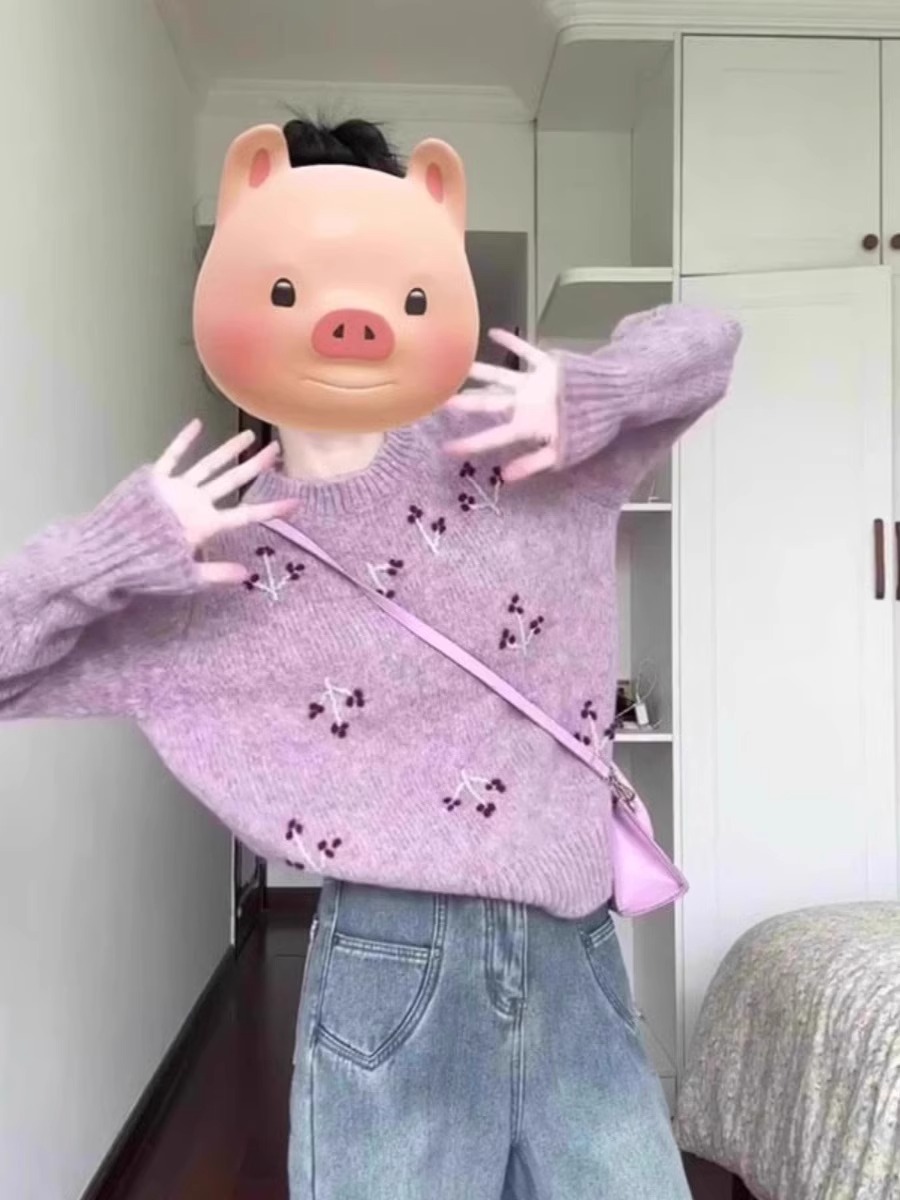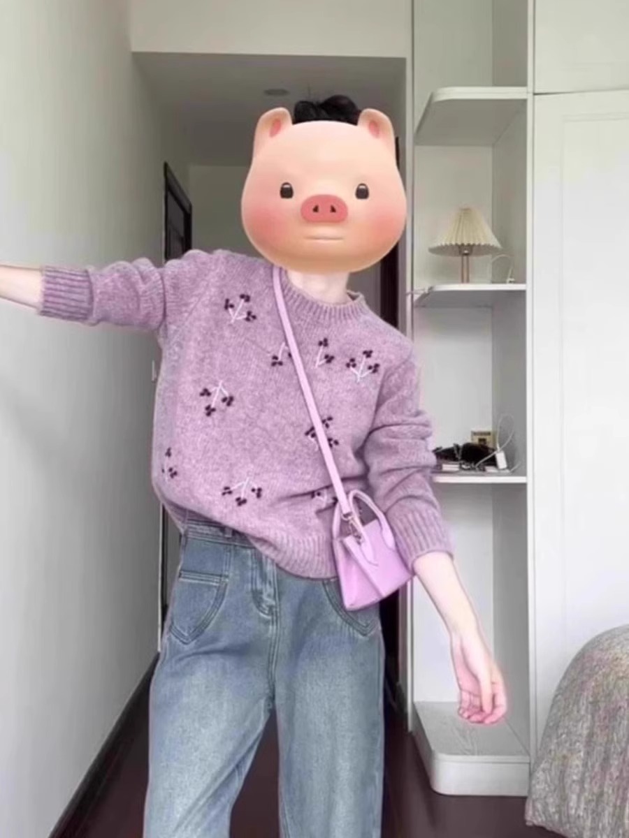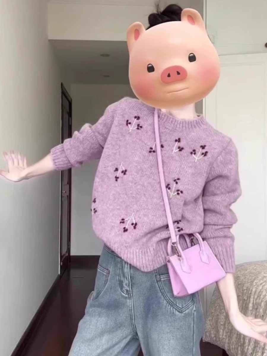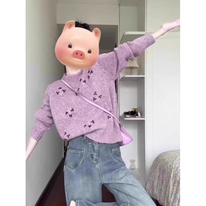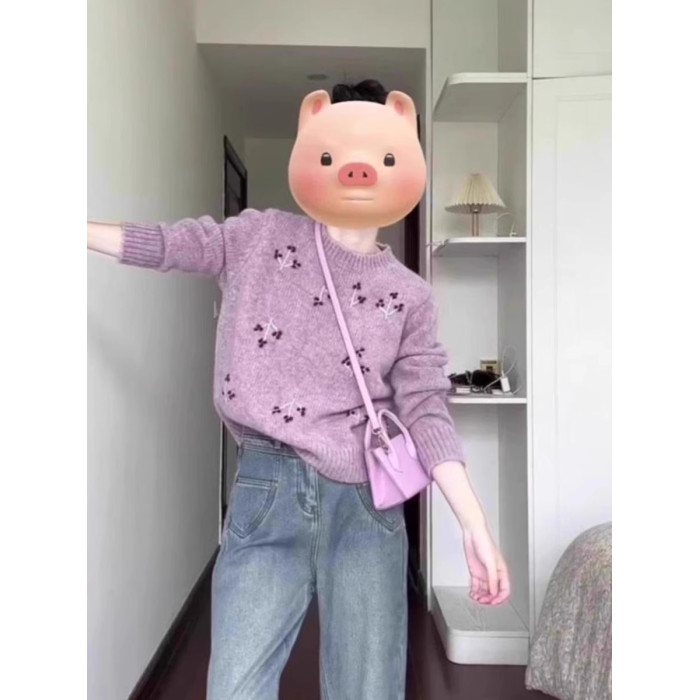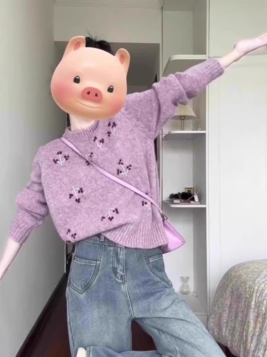 韓系慵懶風復古圓領長袖毛衣女秋冬新款設計感刺綉小個子針織上衣