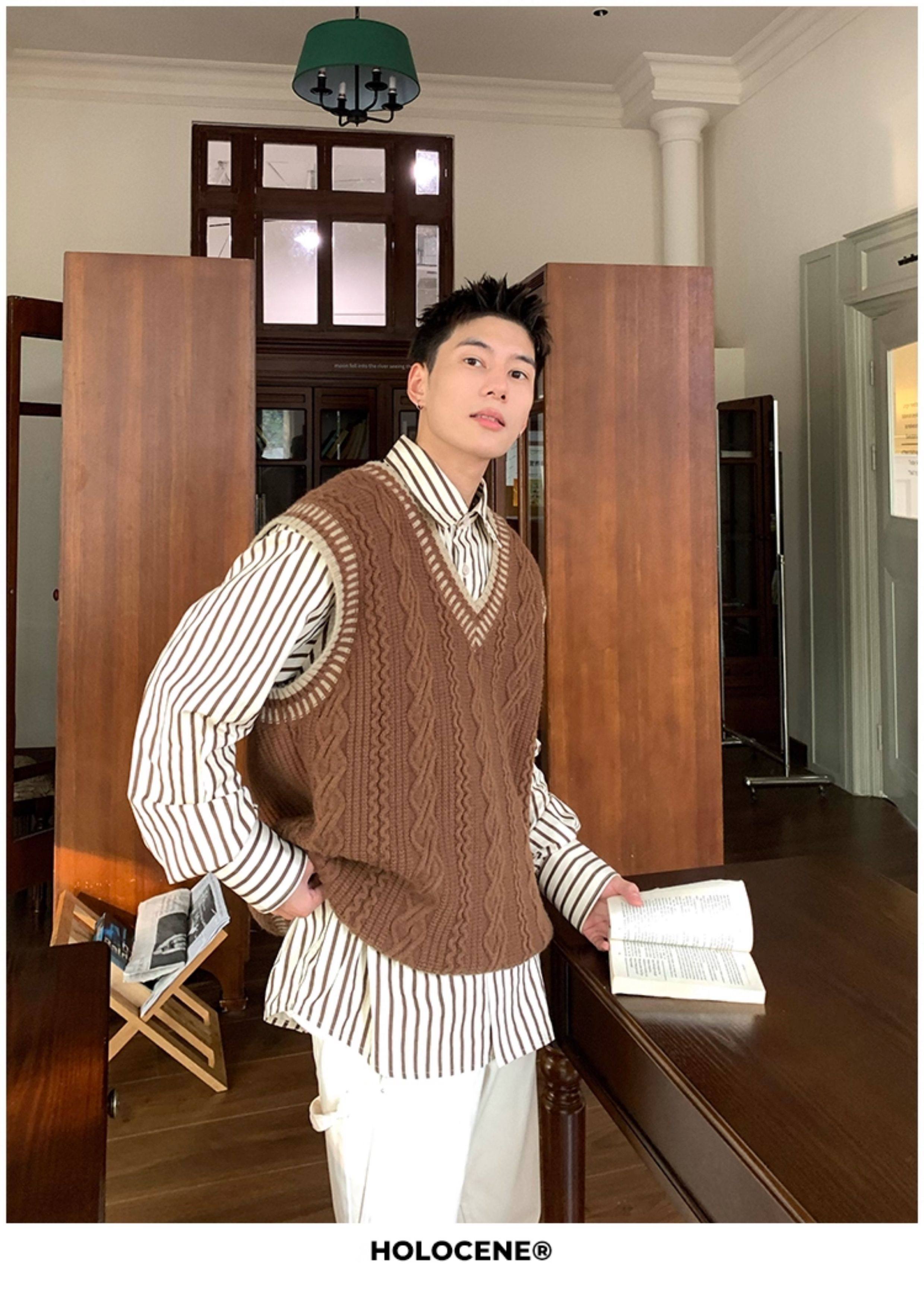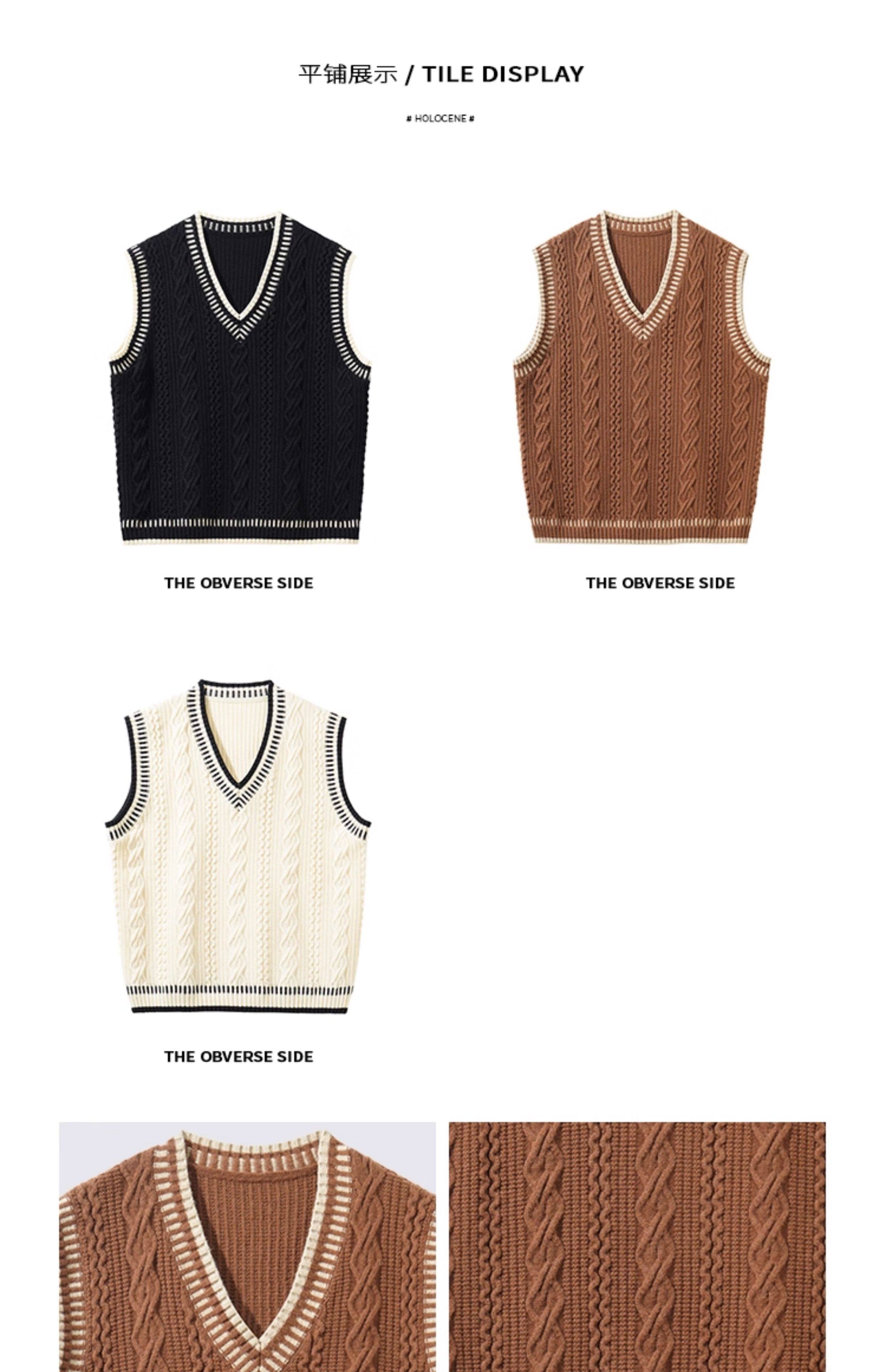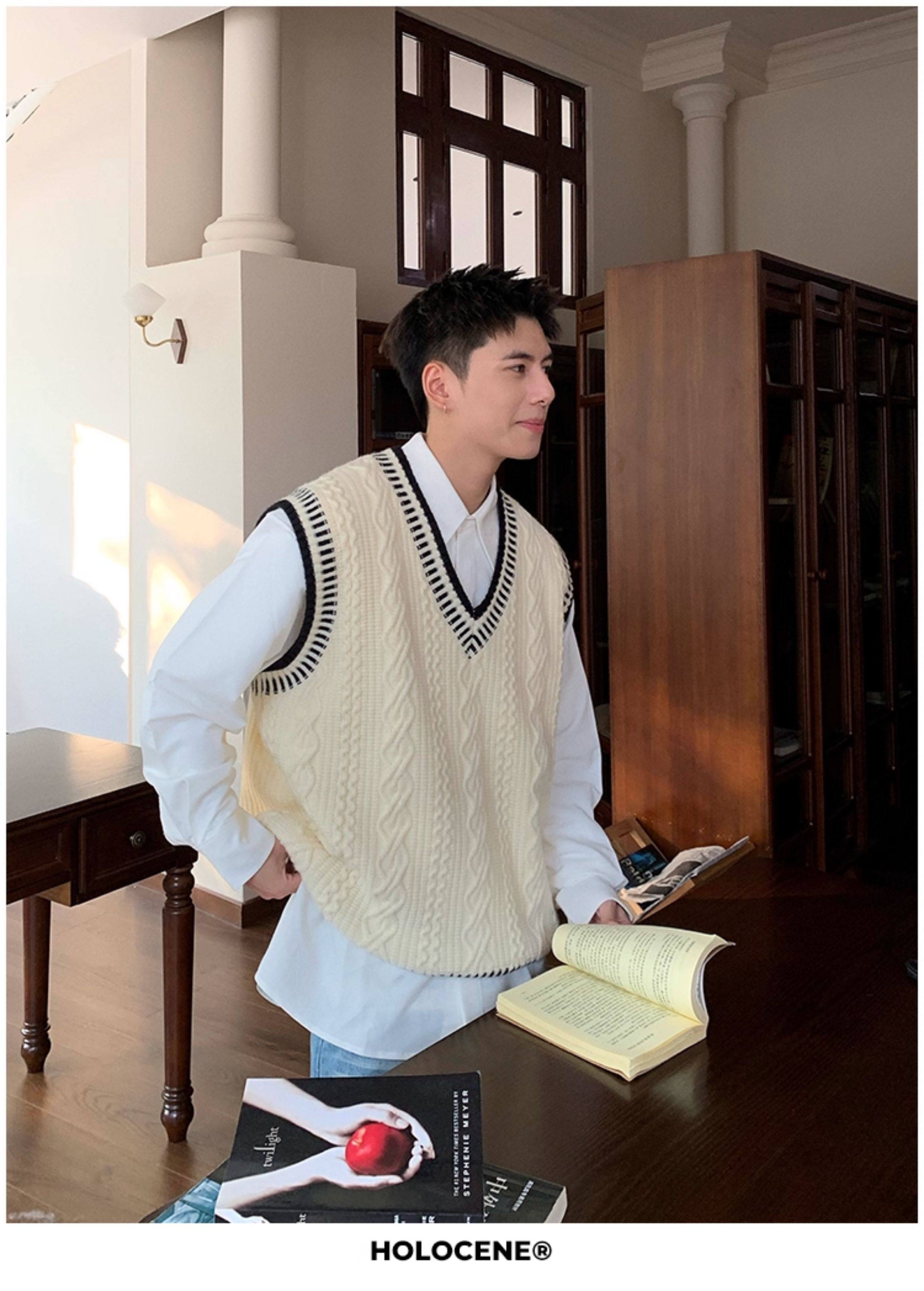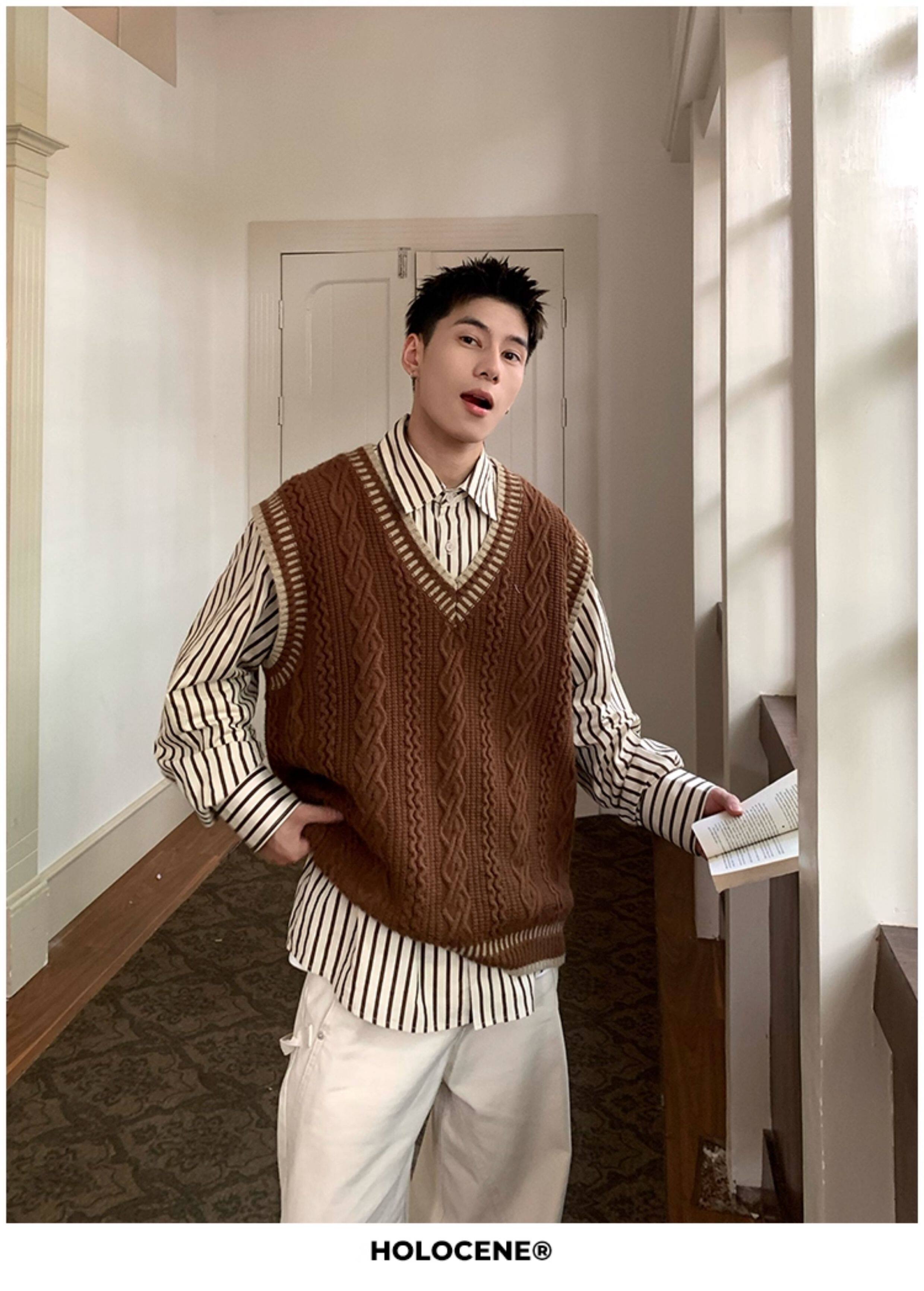 Holocene美式潮牌秋冬學院風麻花毛衣男休閒V領背心針織衫寬鬆衫