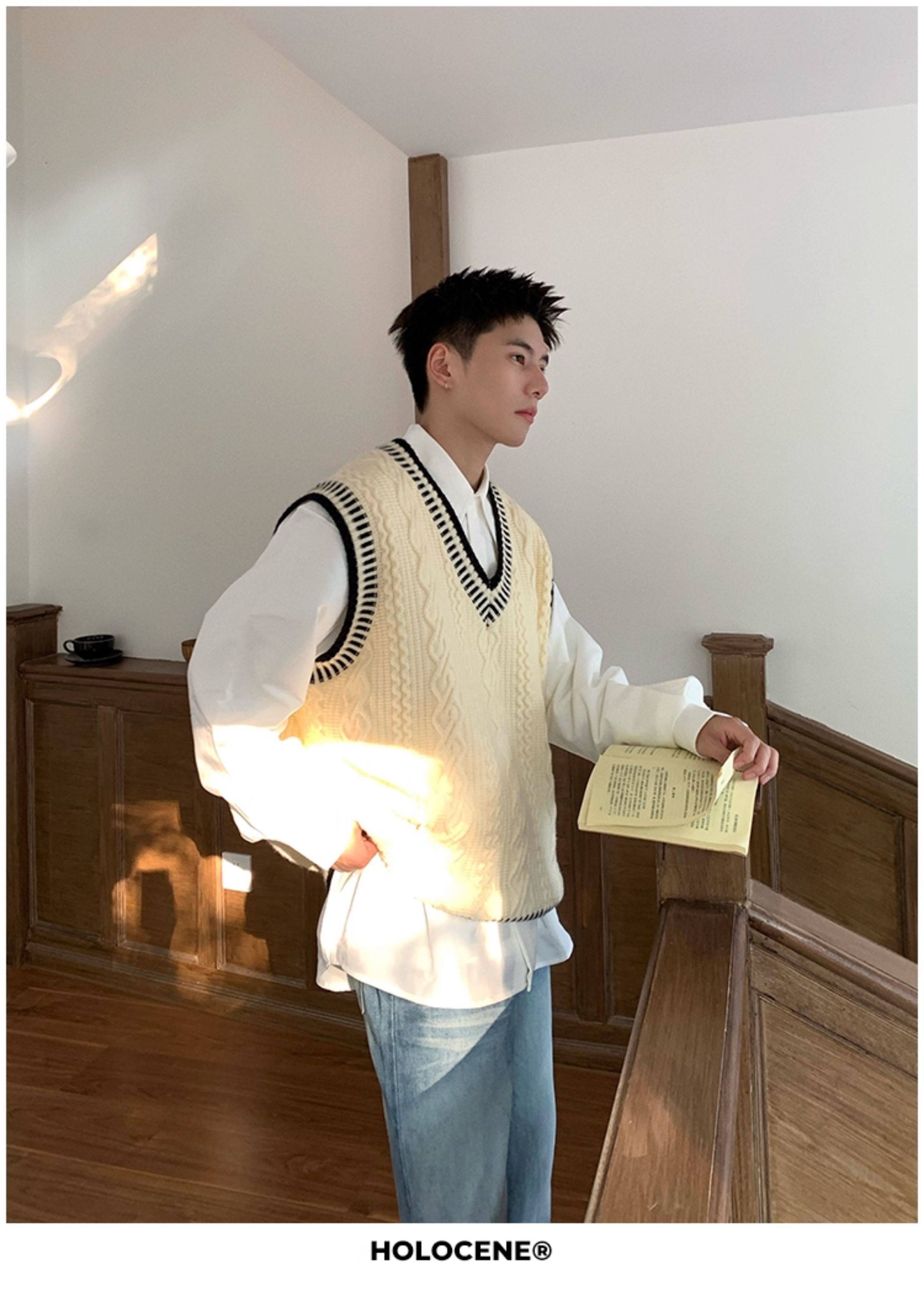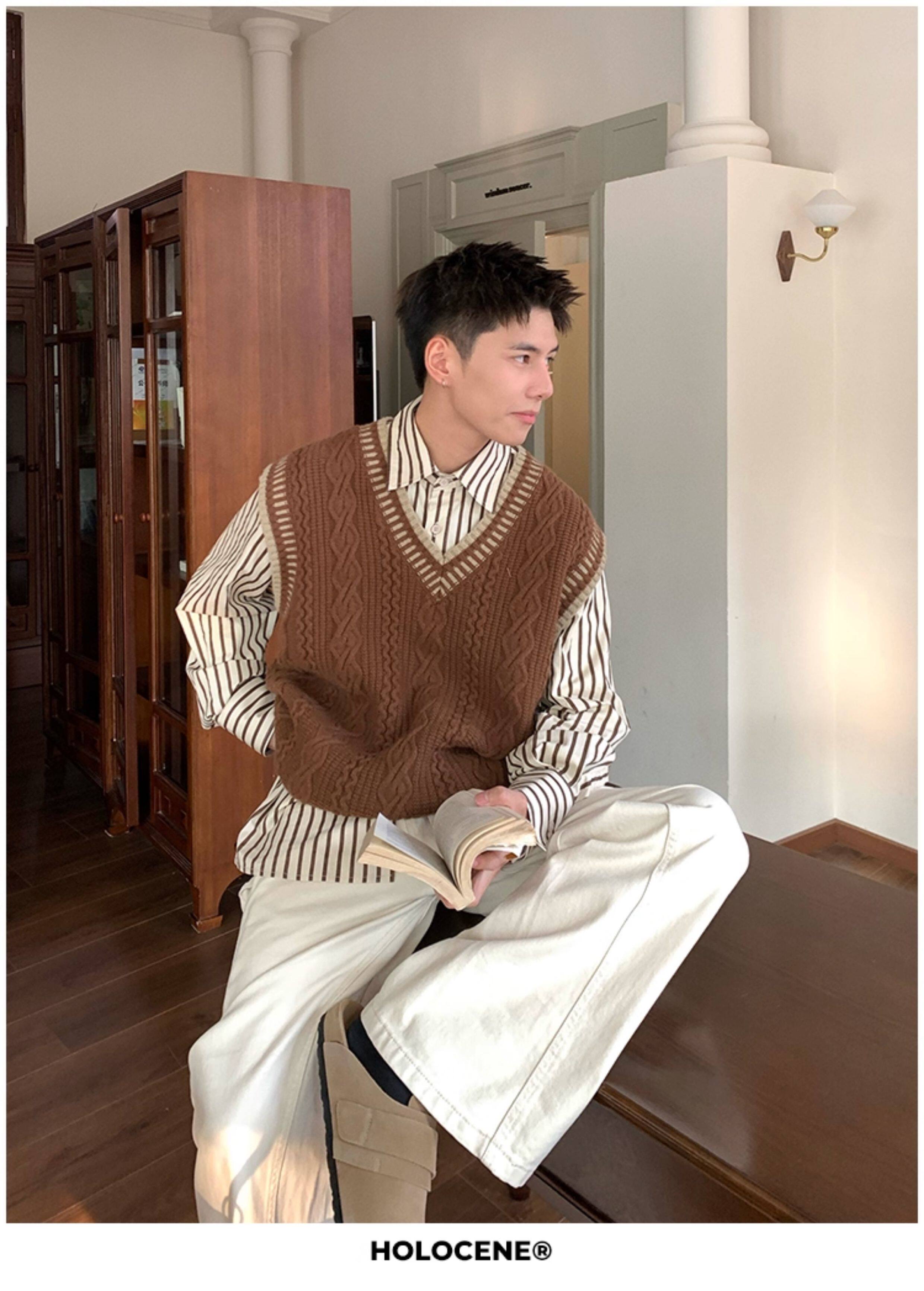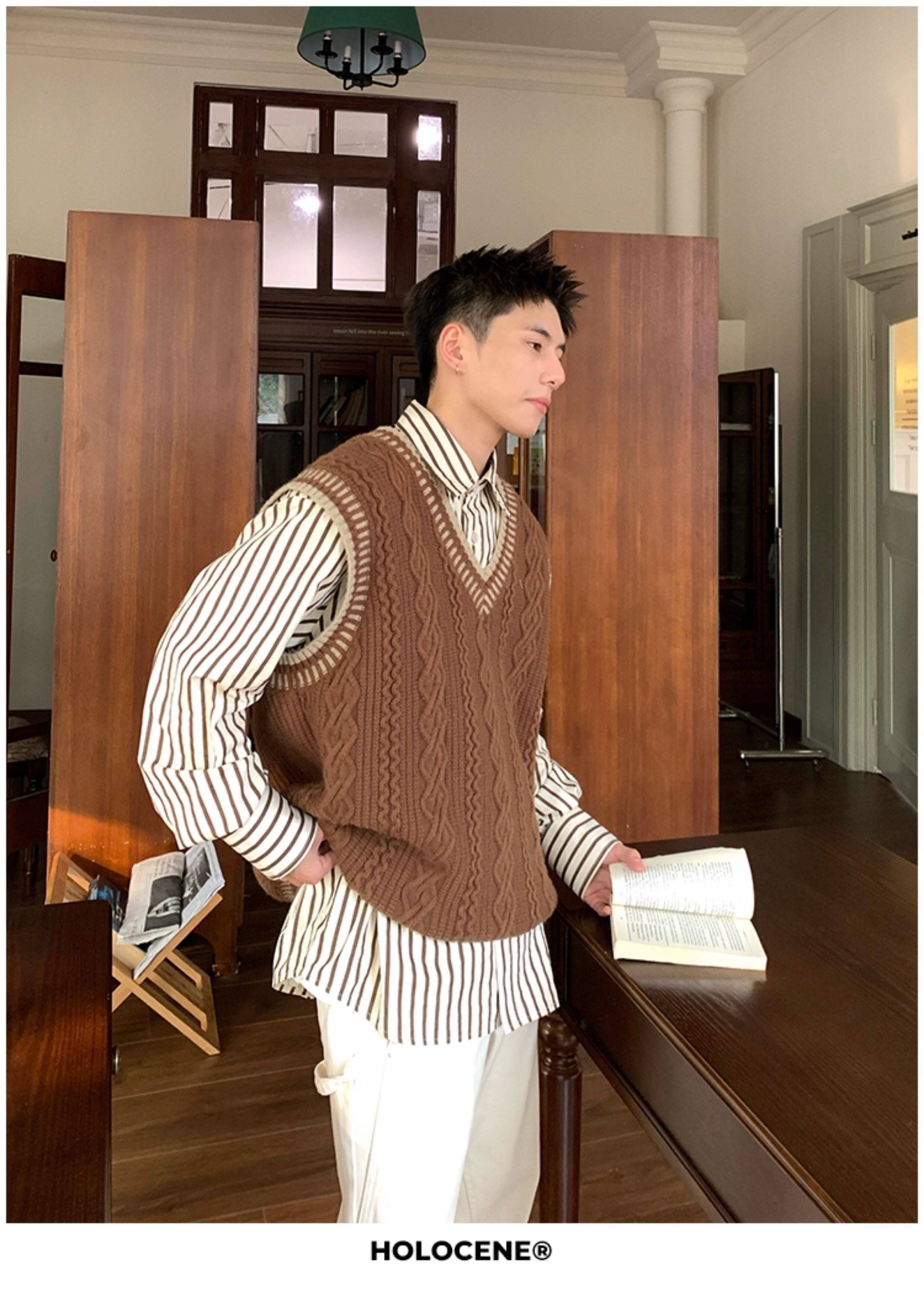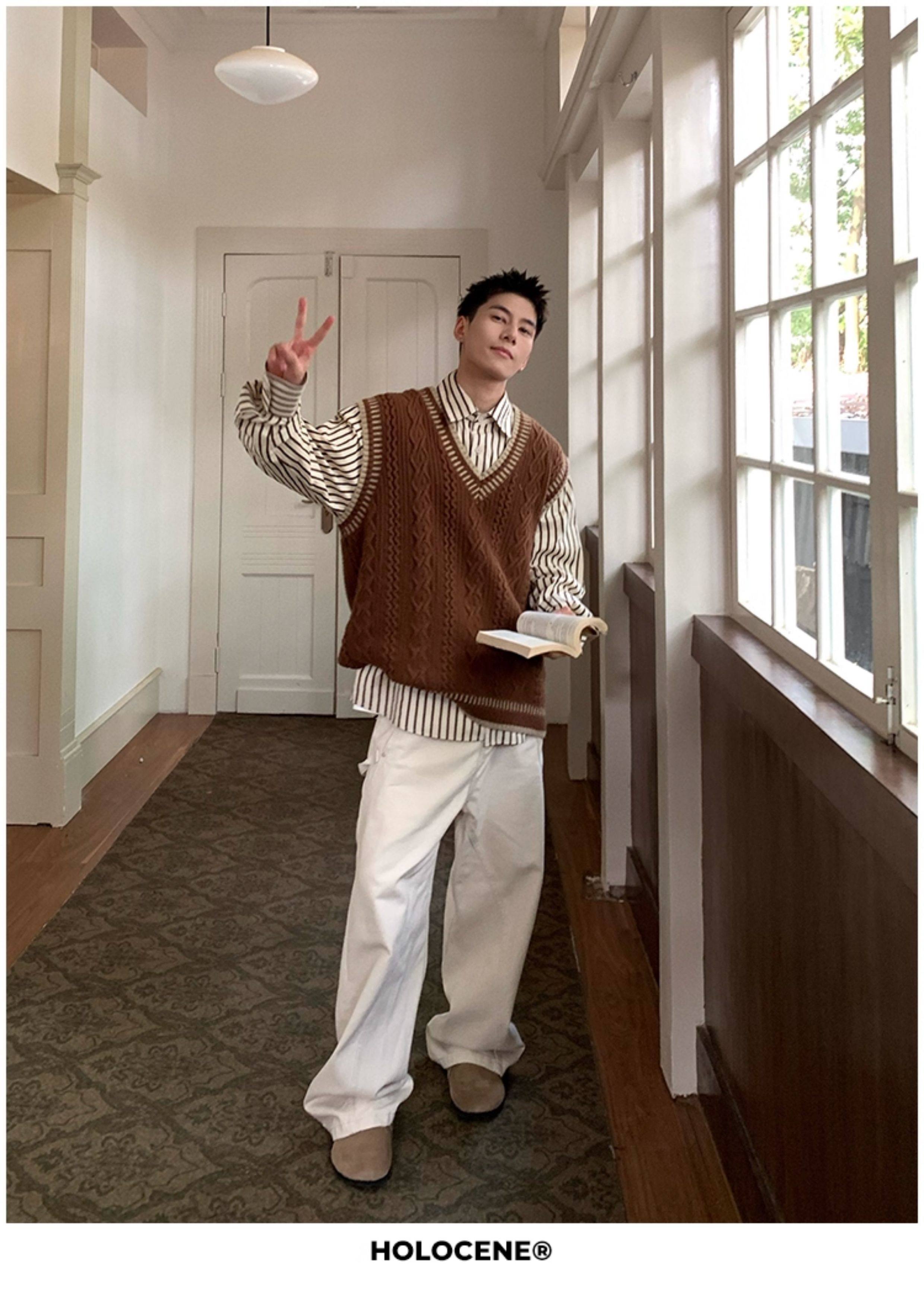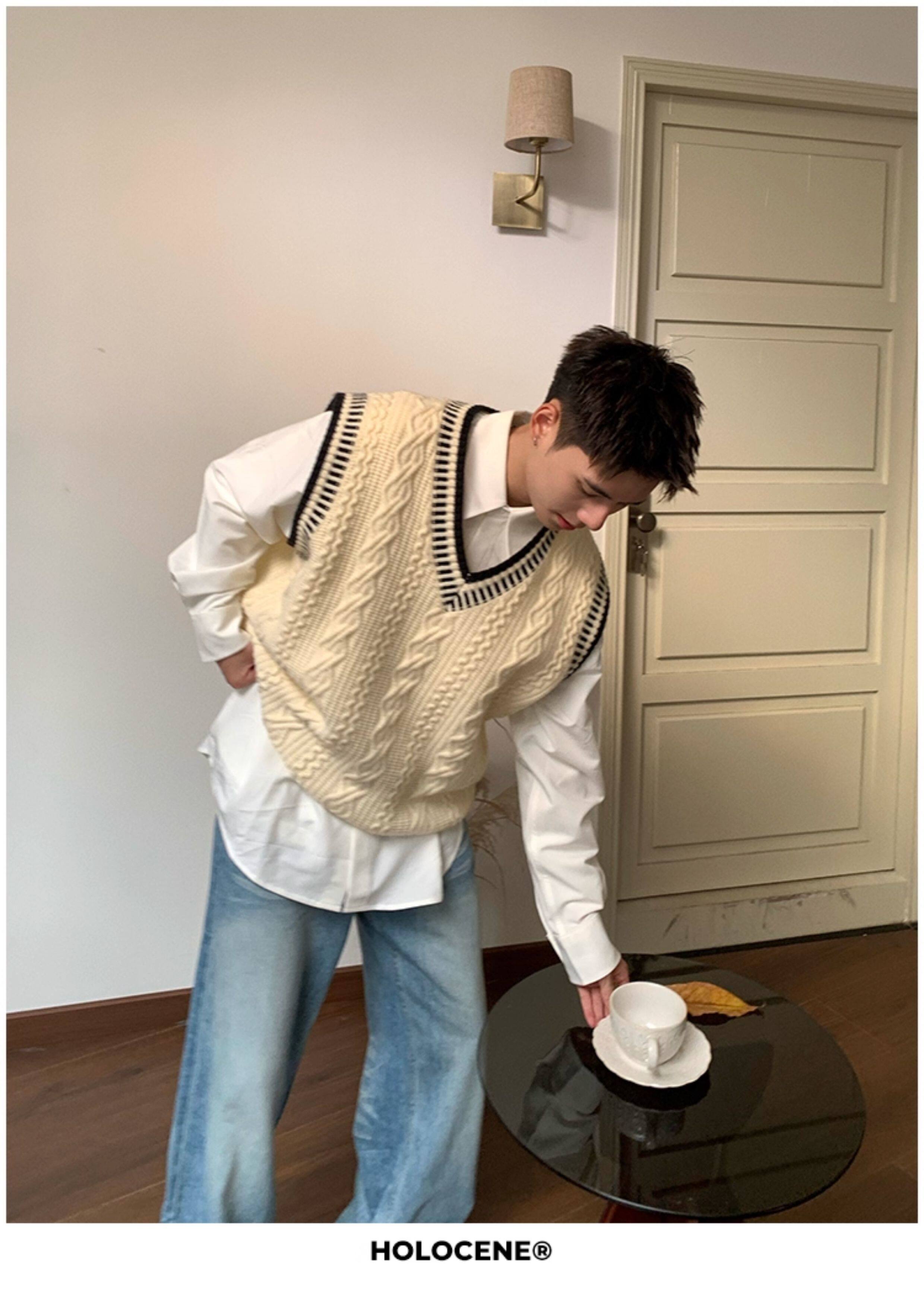 Holocene美式潮牌秋冬學院風麻花毛衣男休閒V領背心針織衫寬鬆衫