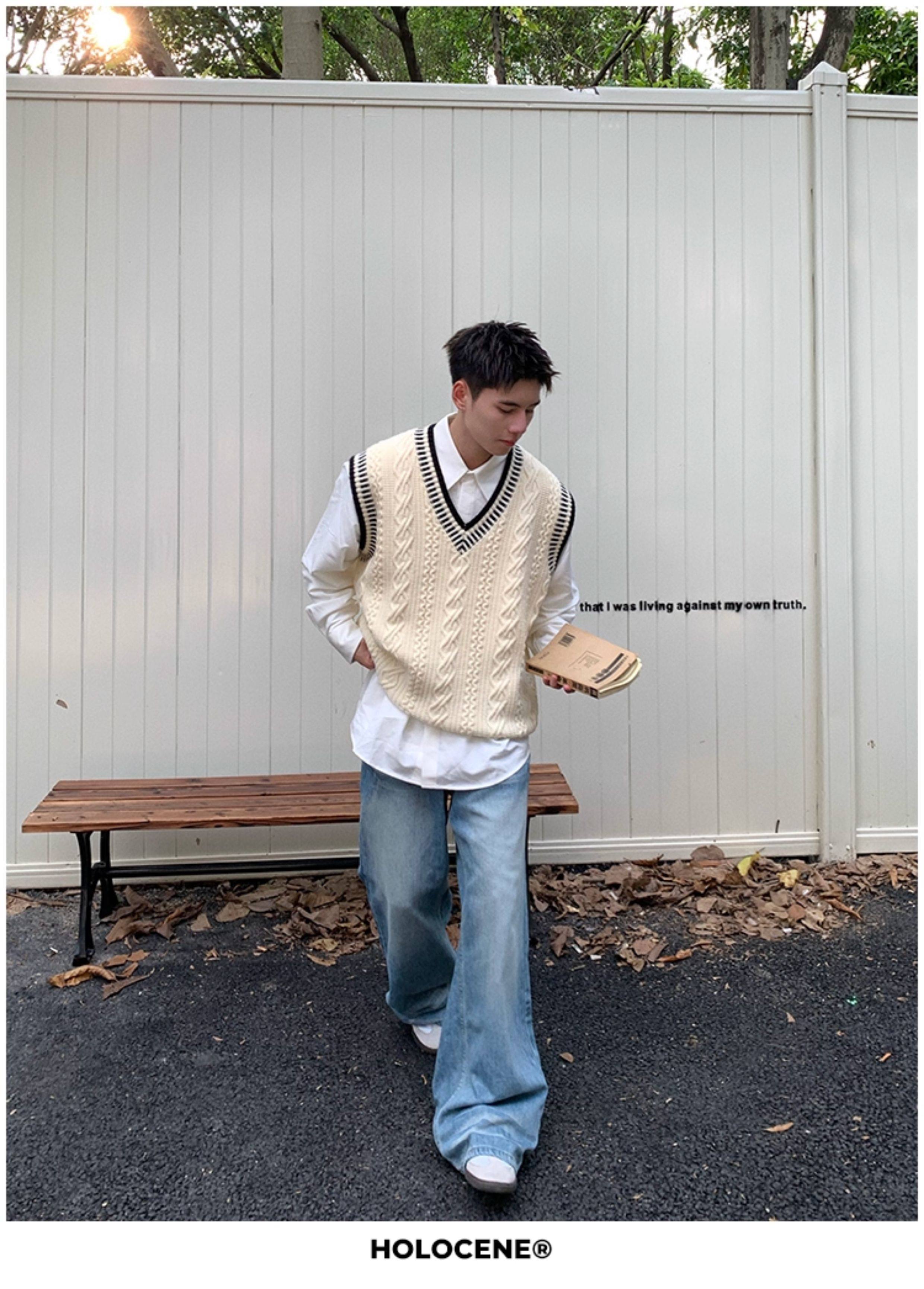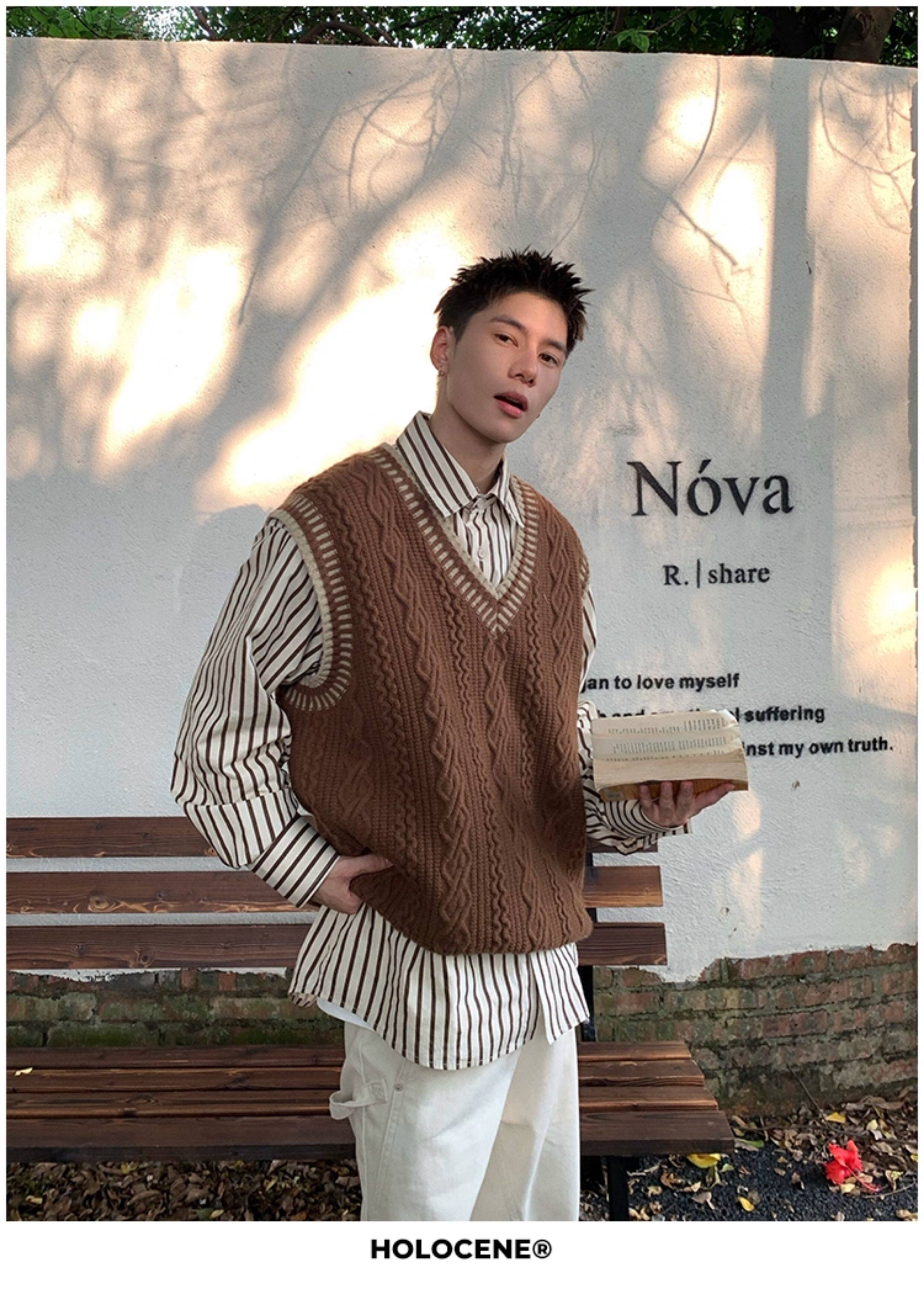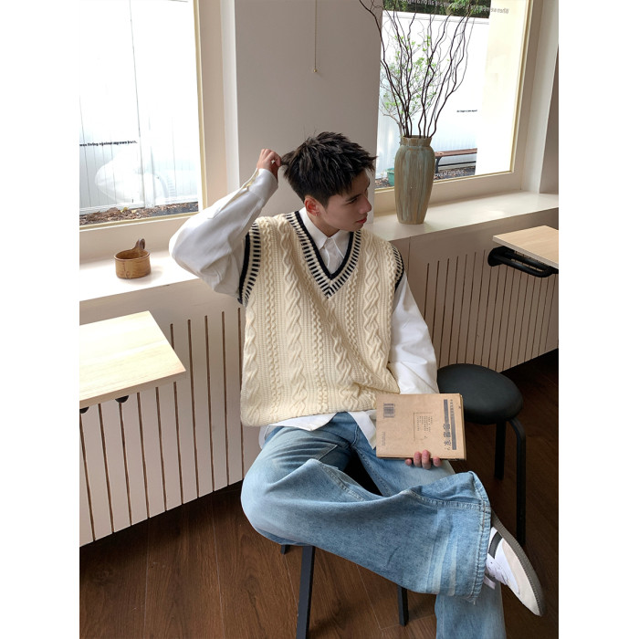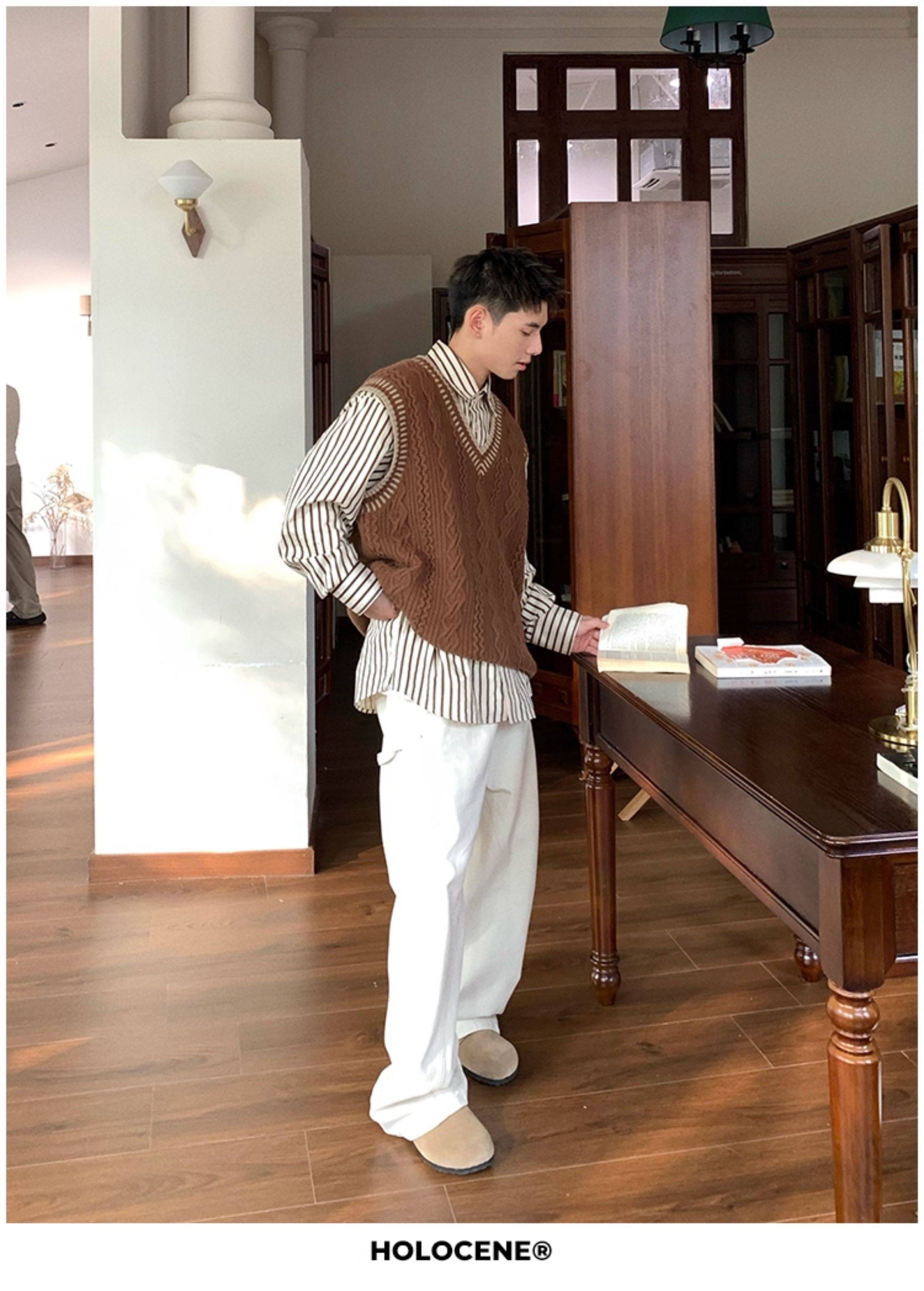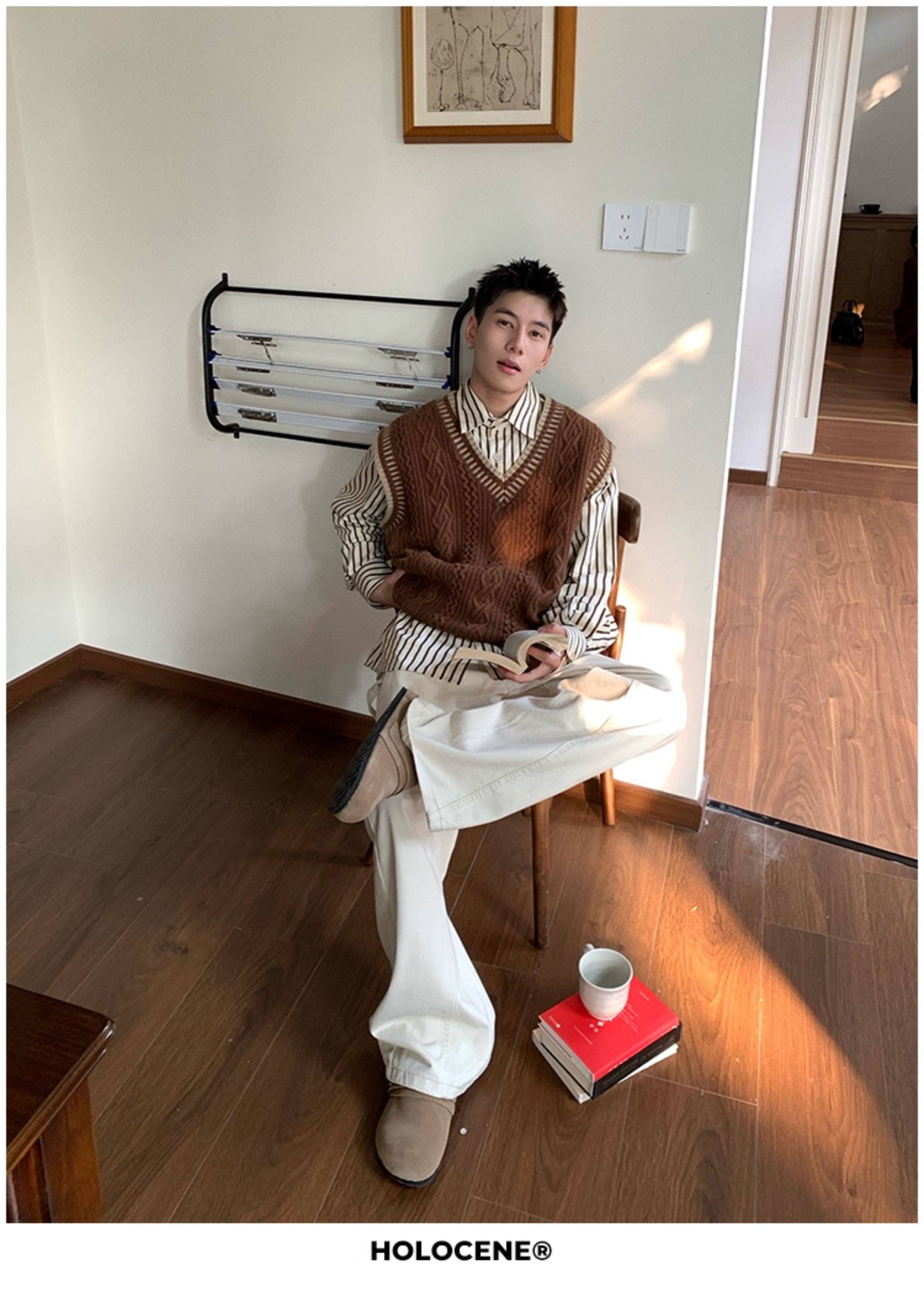 Holocene美式潮牌秋冬學院風麻花毛衣男休閒V領背心針織衫寬鬆衫