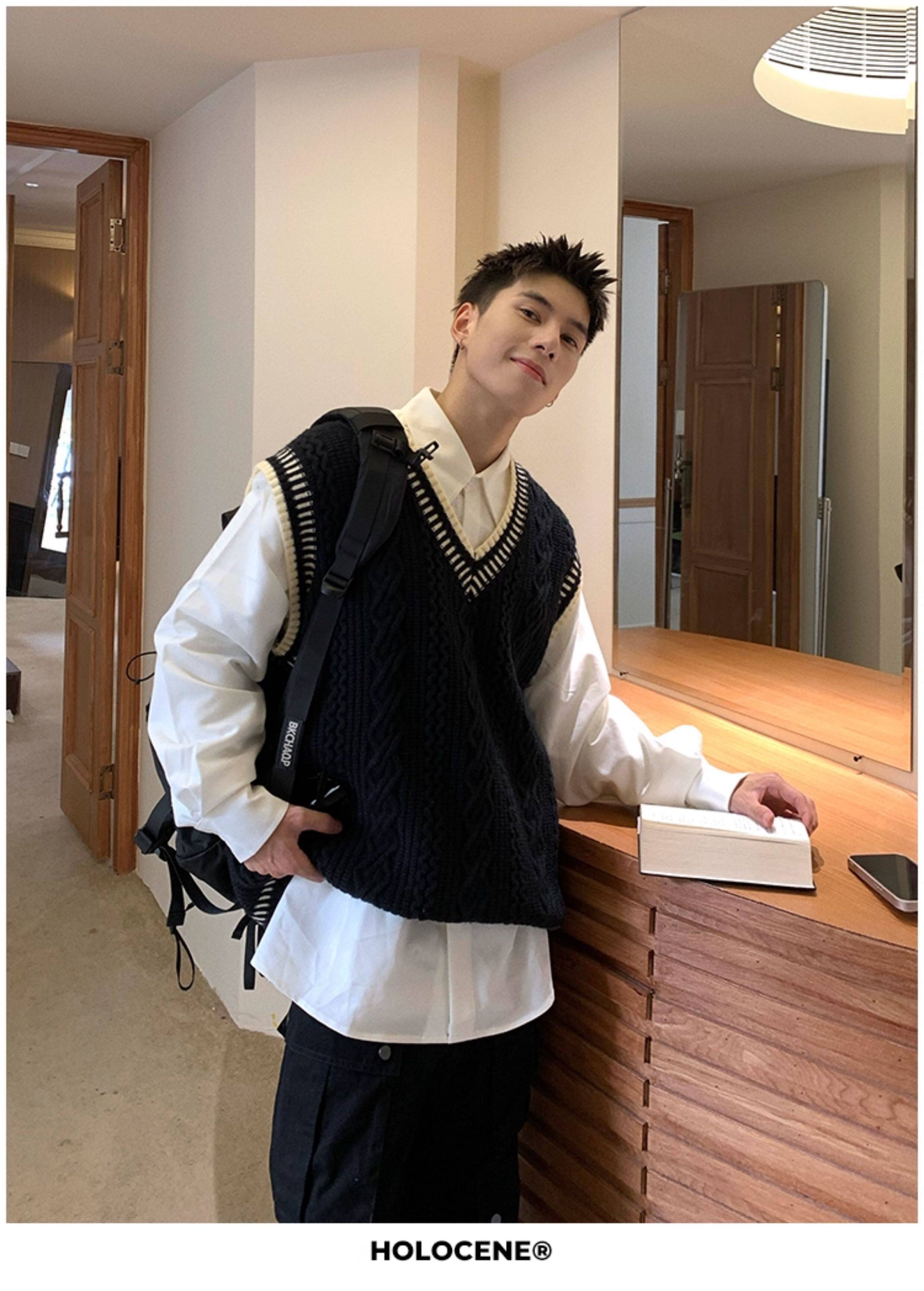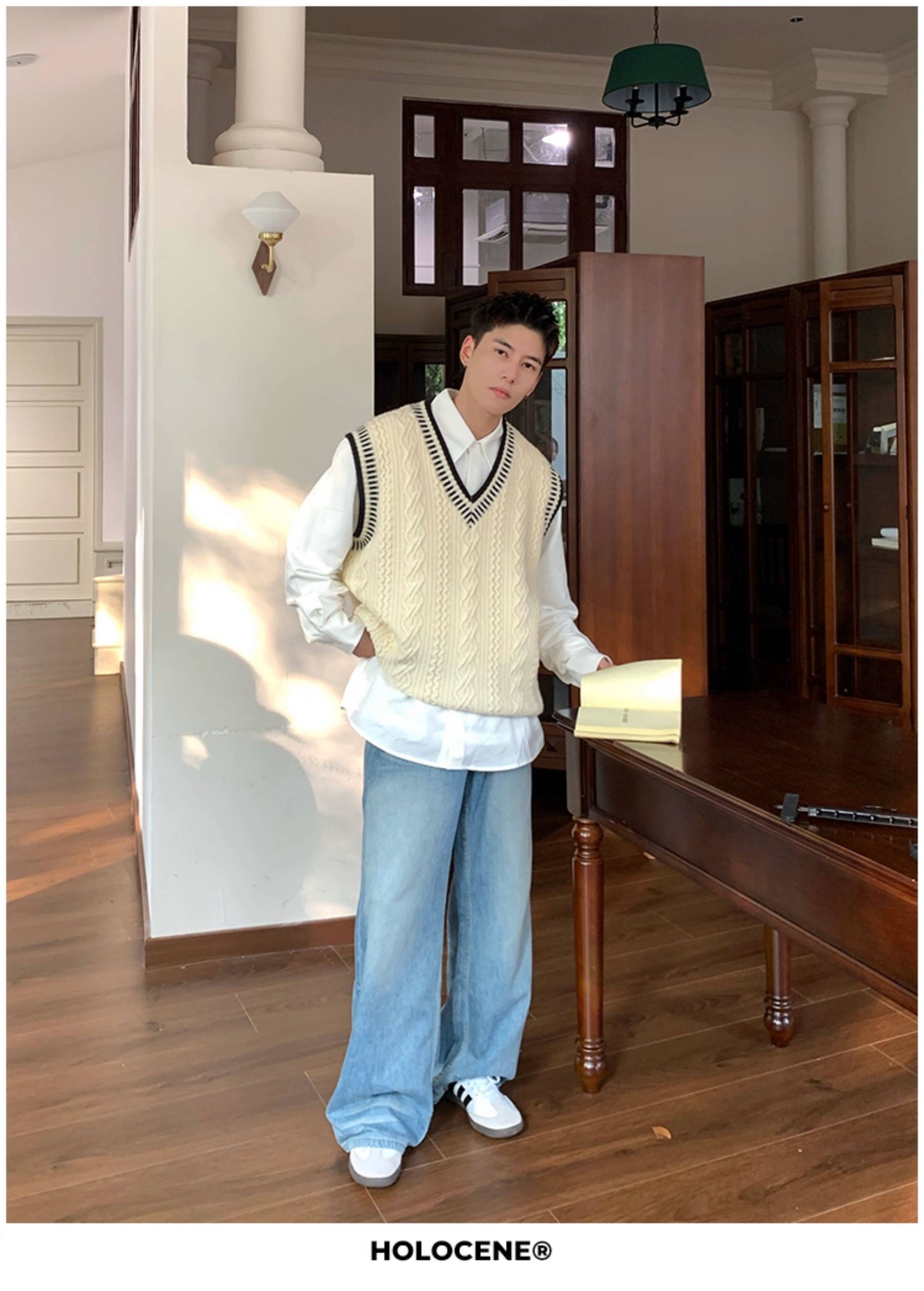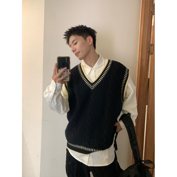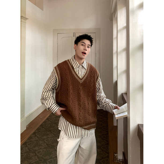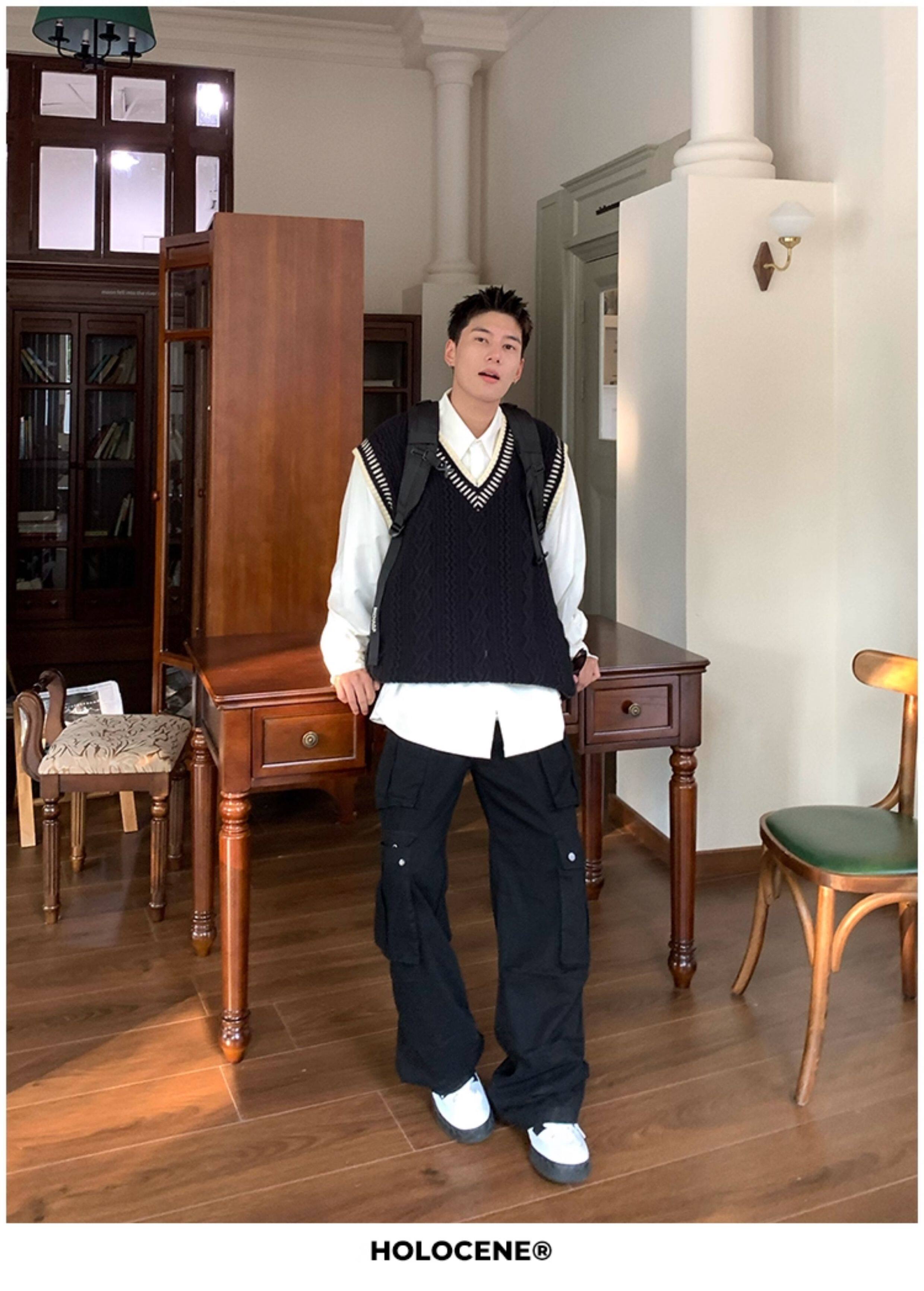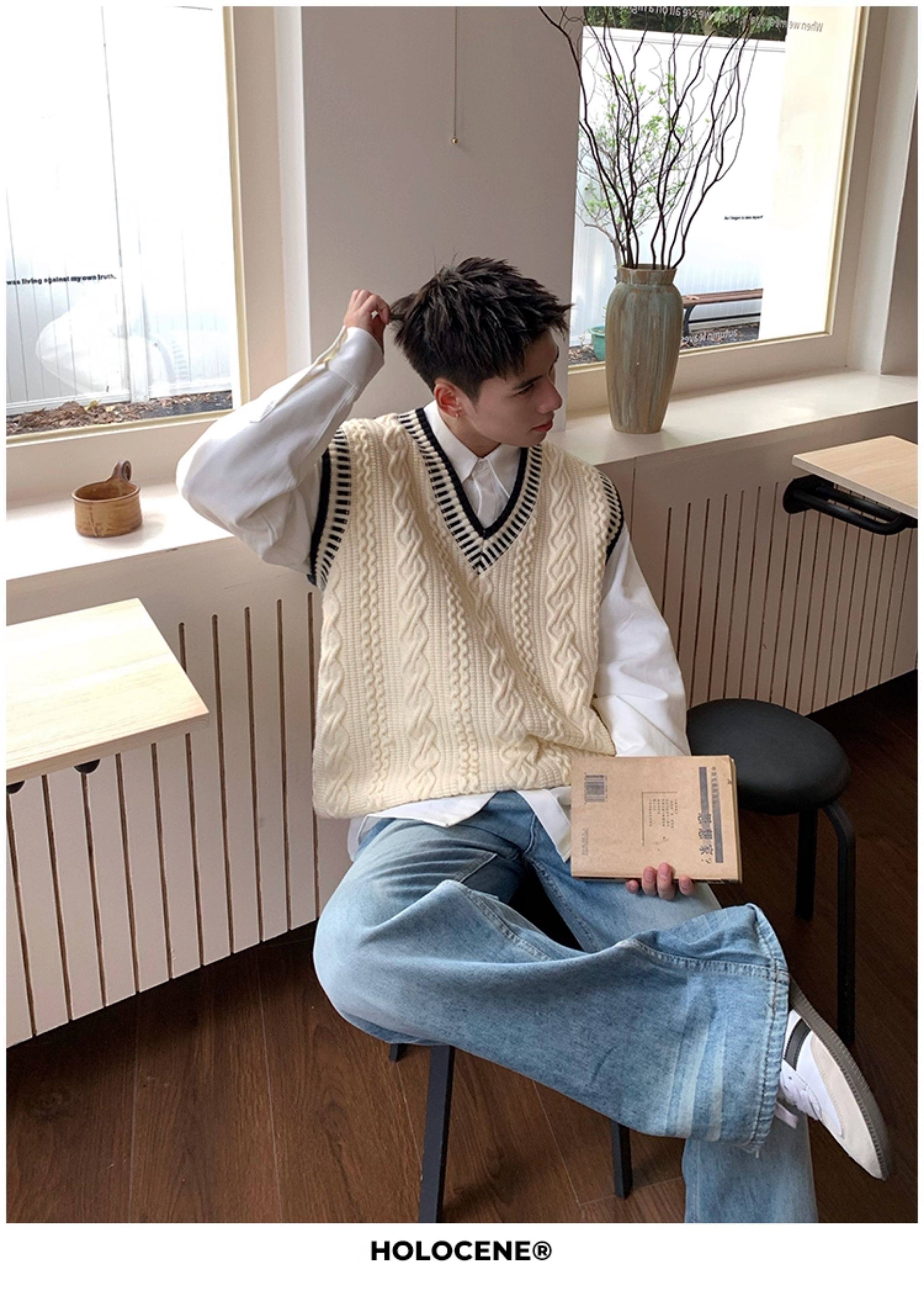 Holocene美式潮牌秋冬學院風麻花毛衣男休閒V領背心針織衫寬鬆衫
