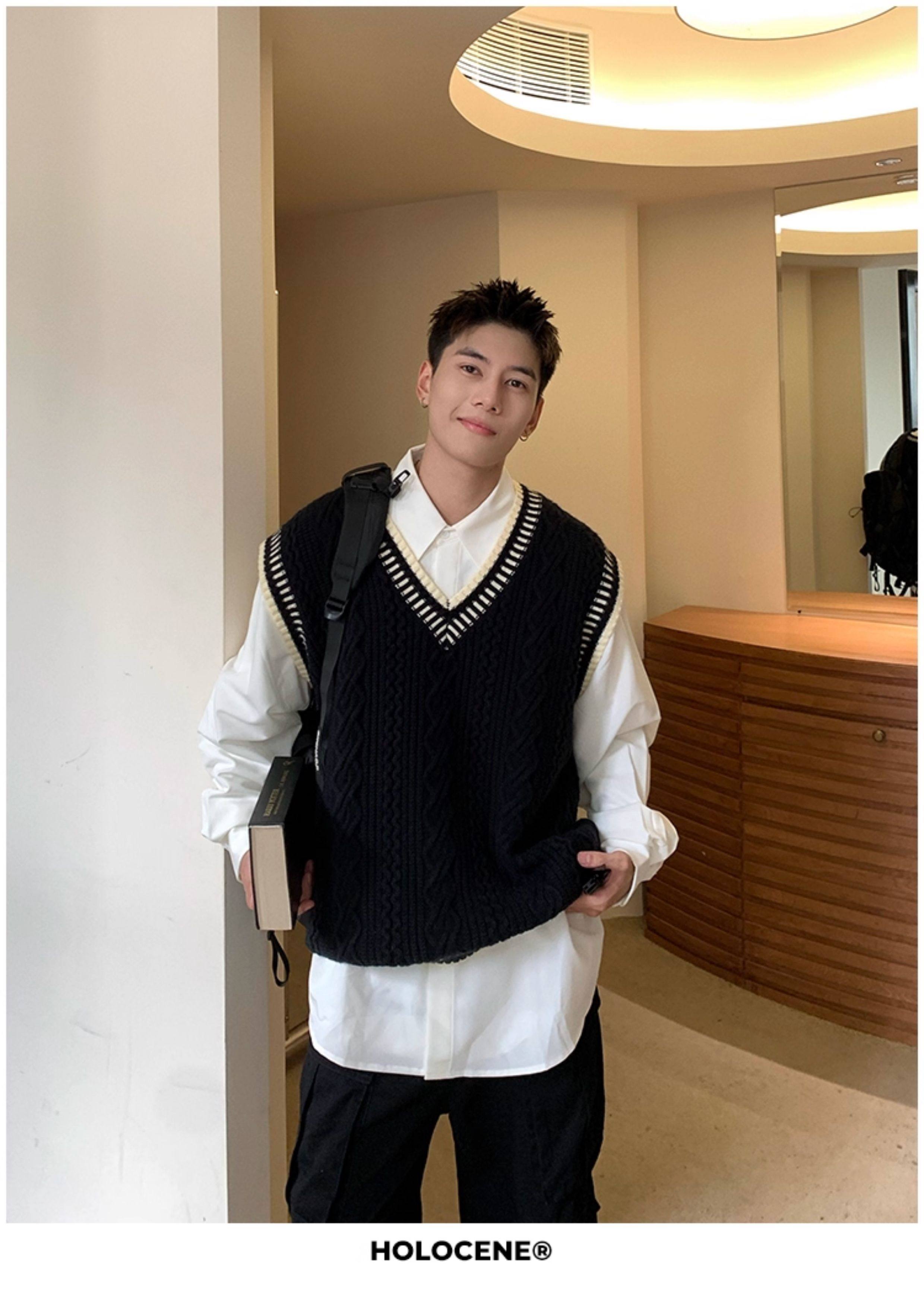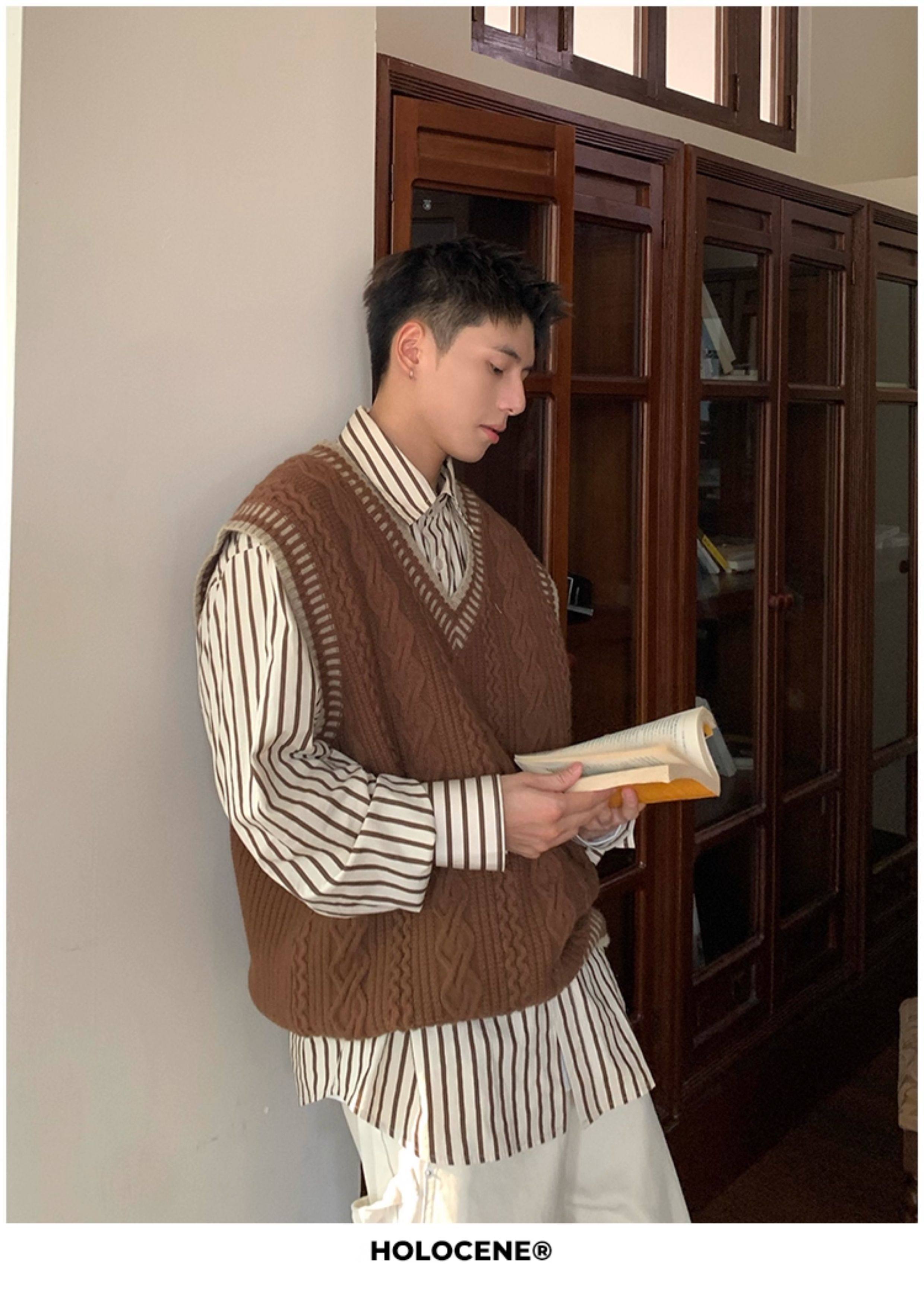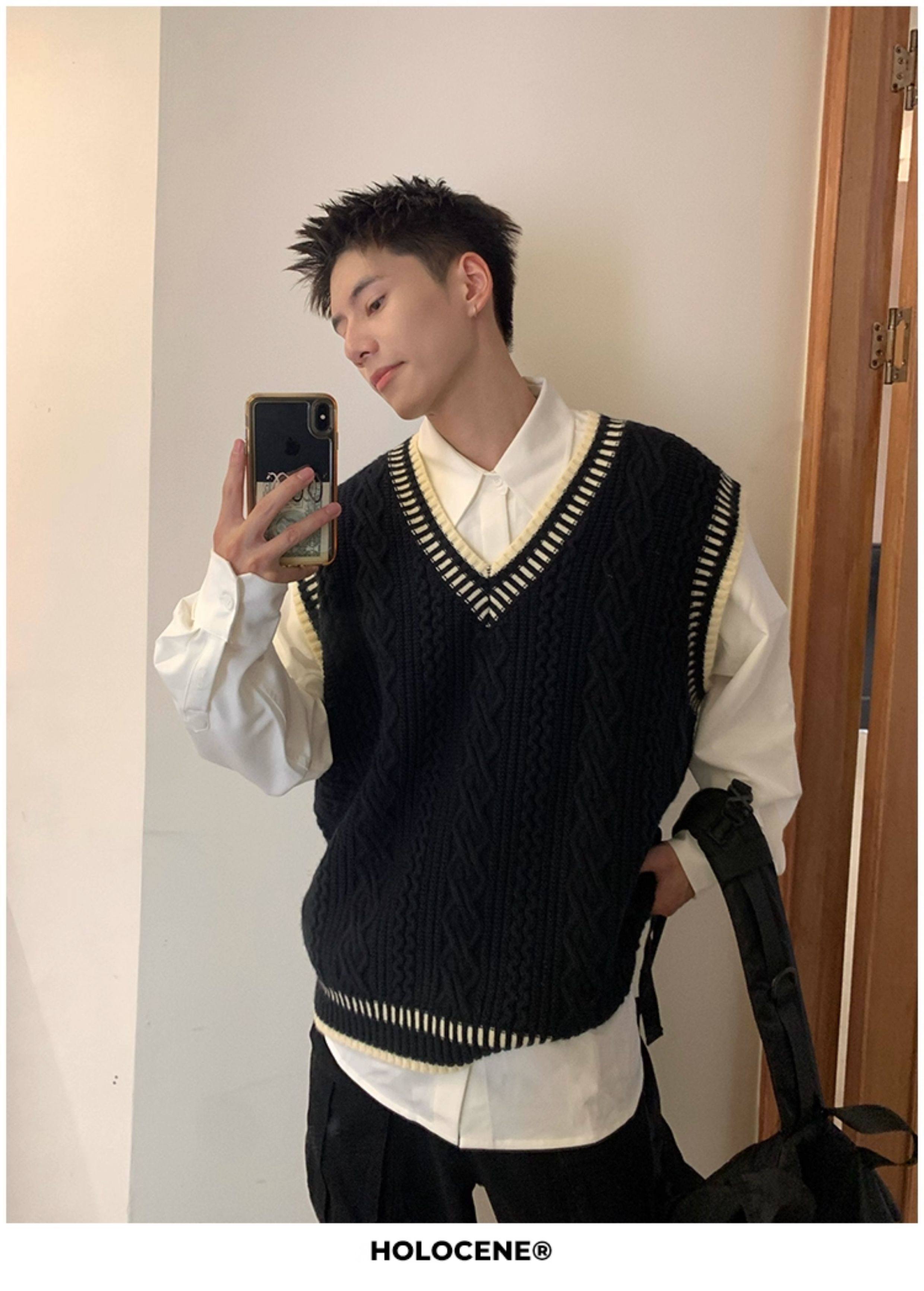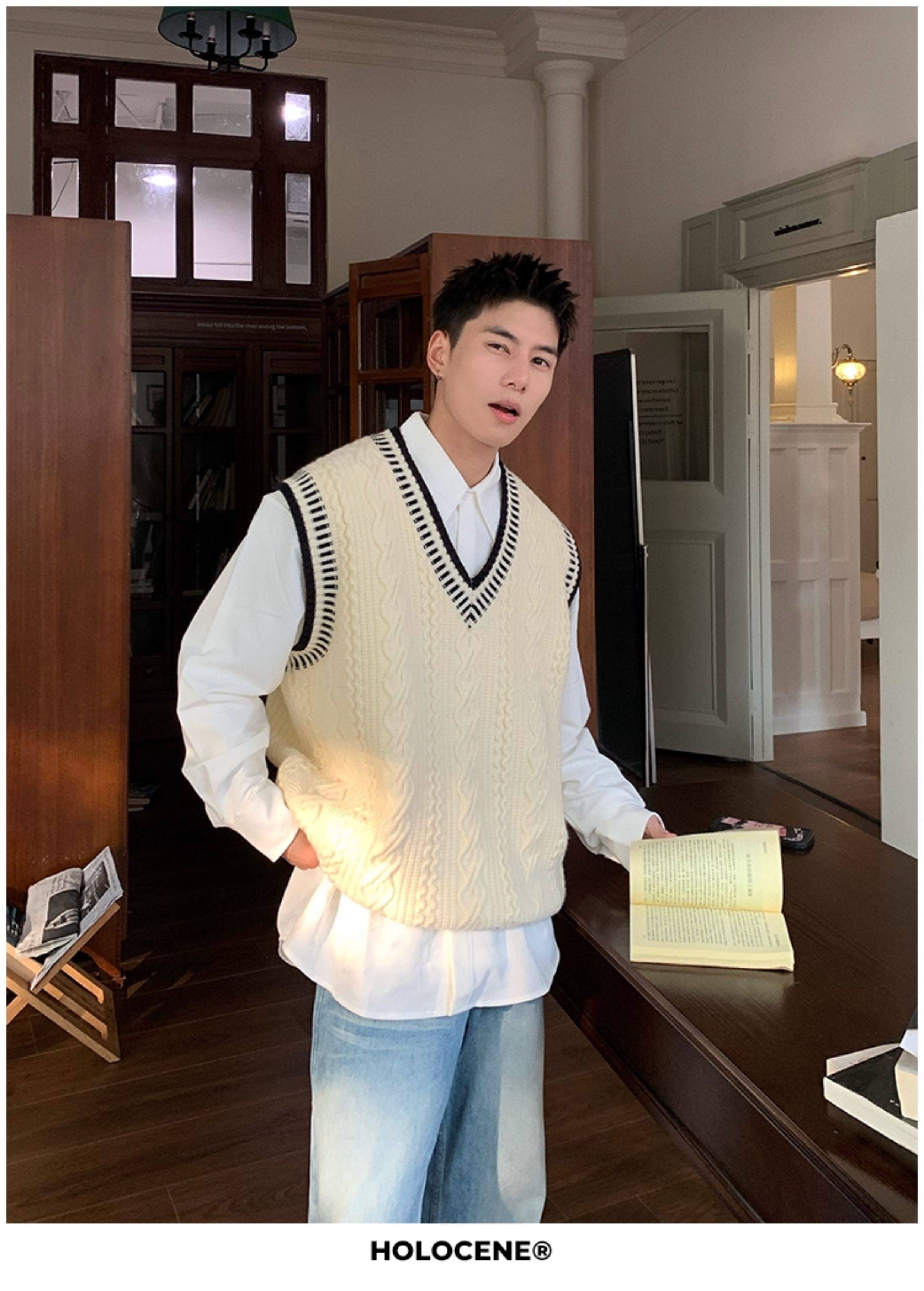 Holocene美式潮牌秋冬學院風麻花毛衣男休閒V領背心針織衫寬鬆衫