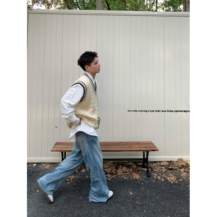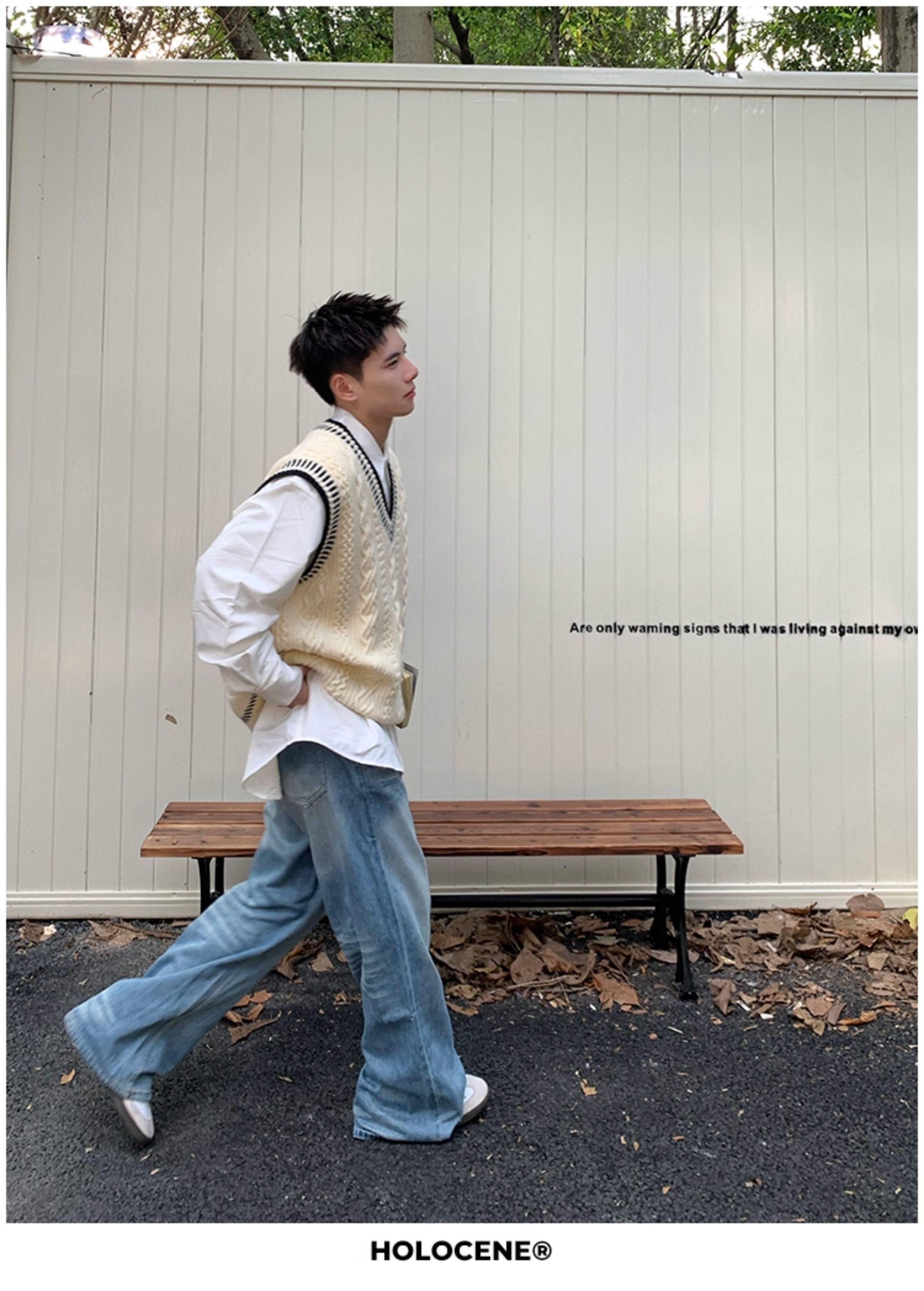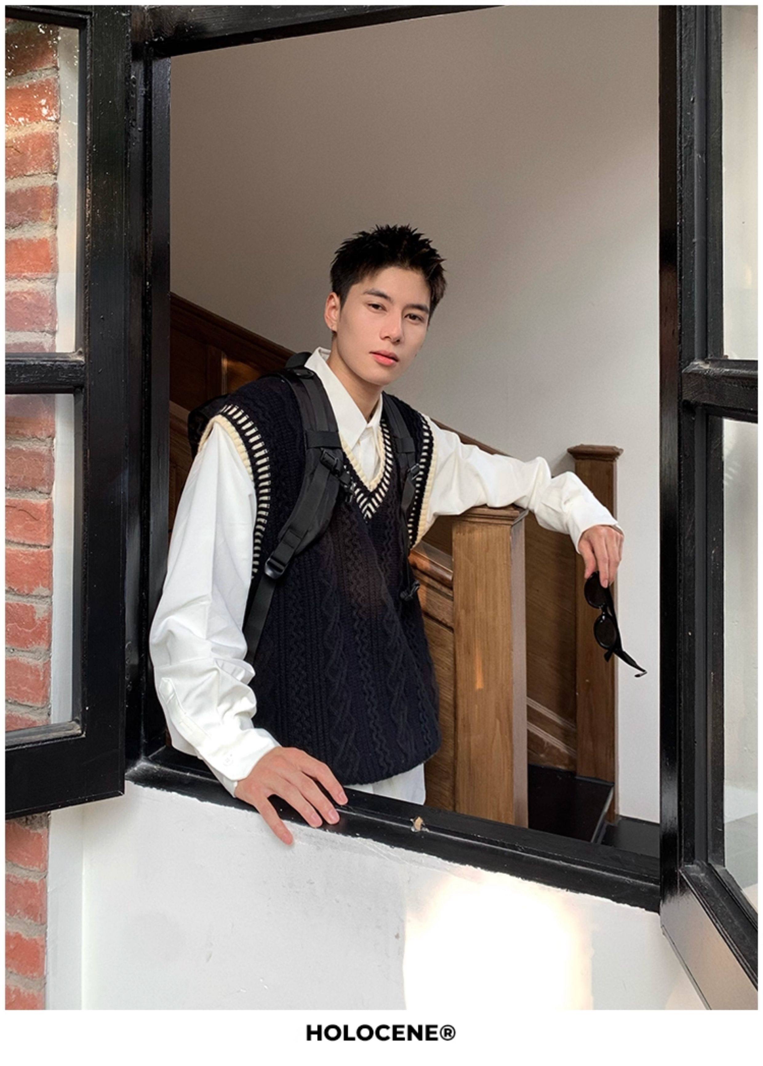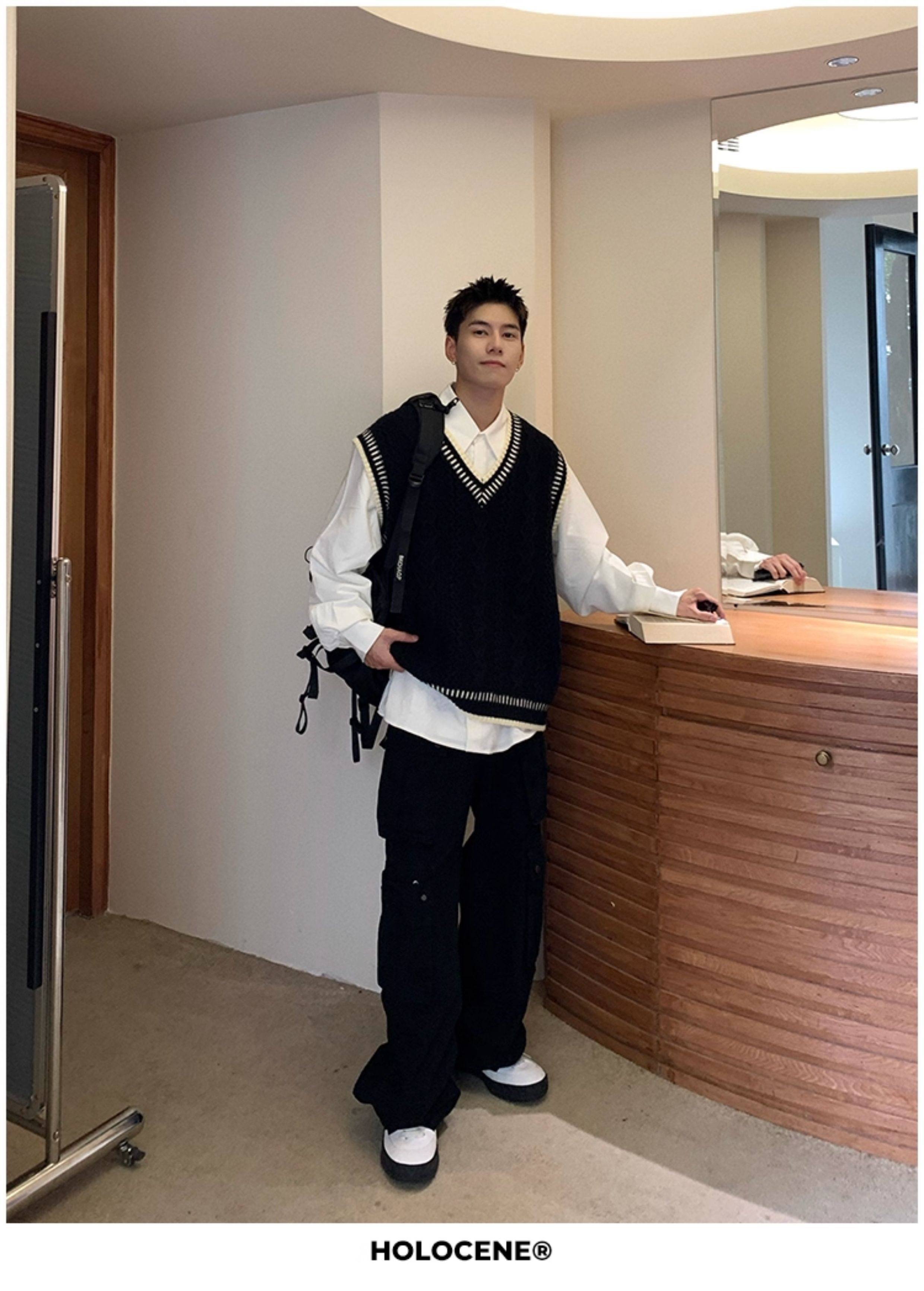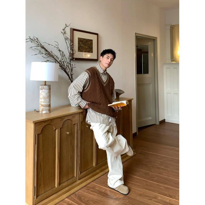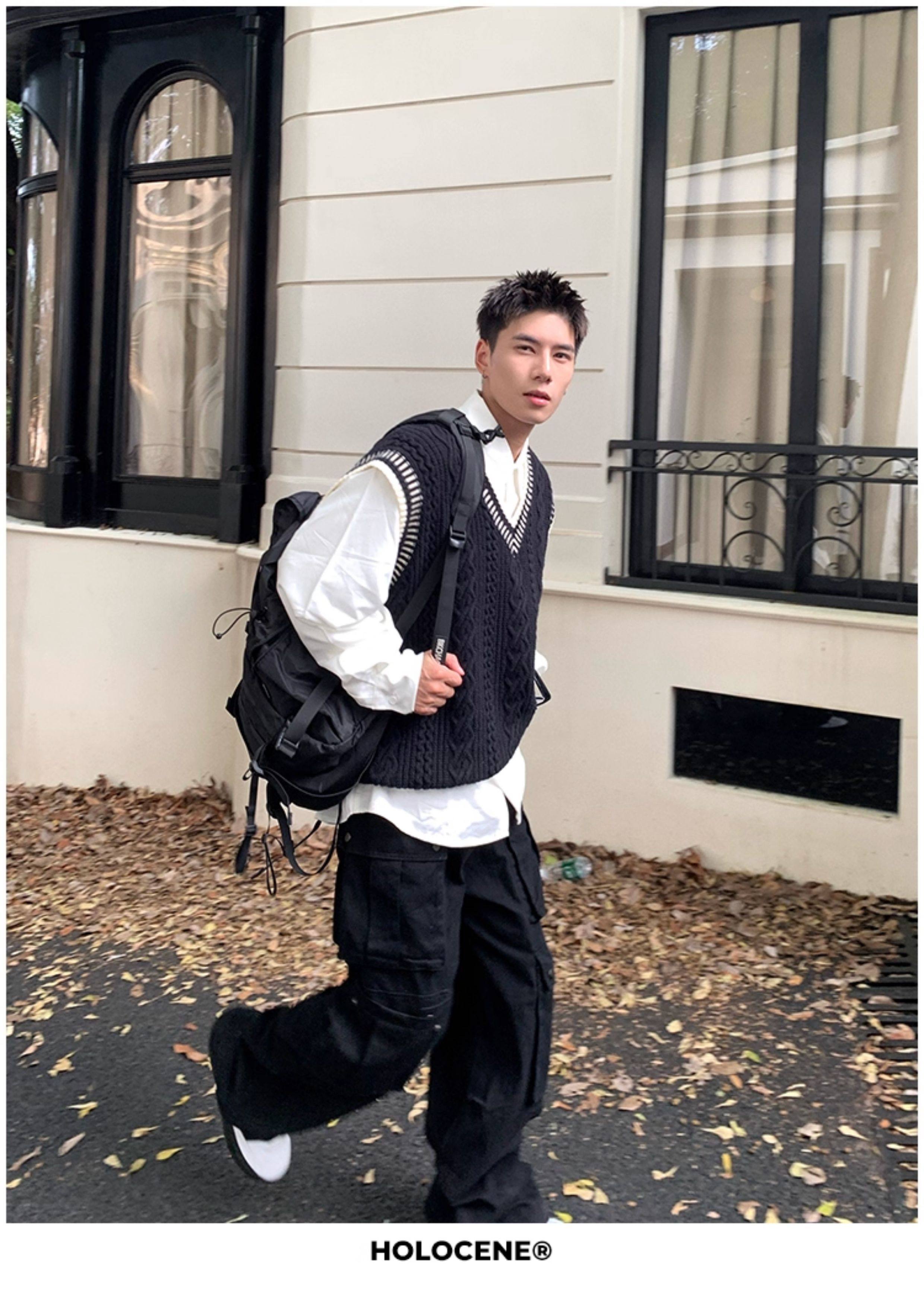 Holocene美式潮牌秋冬學院風麻花毛衣男休閒V領背心針織衫寬鬆衫
