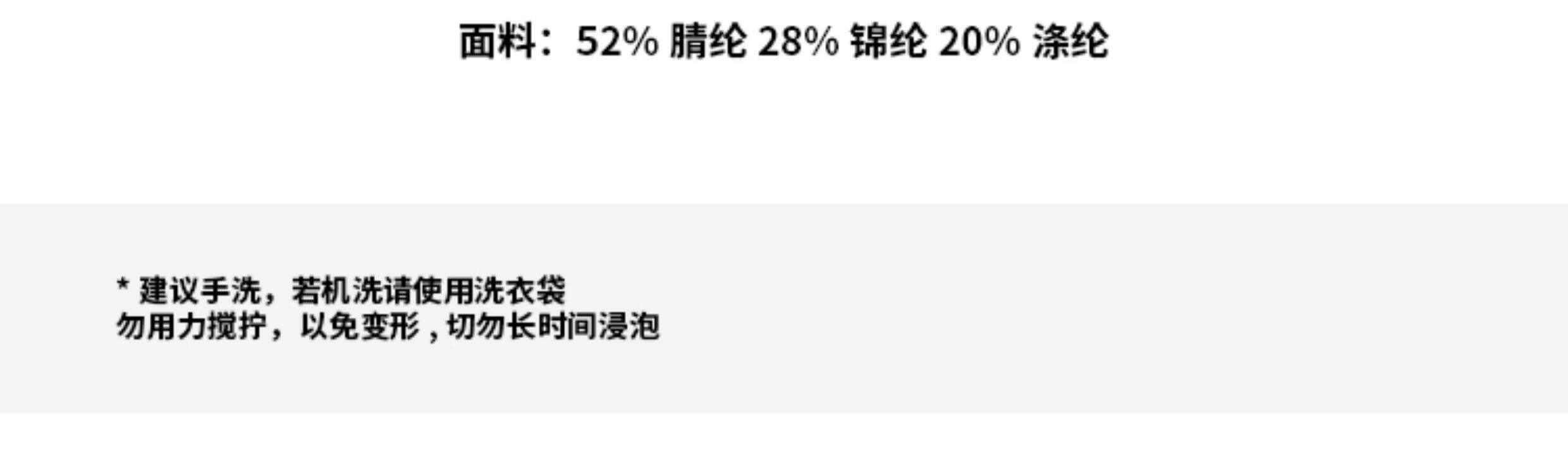| 材質成分 | 聚丙烯腈纖維(腈綸)52% 聚醯胺纖維(錦綸)28% 聚對苯二甲酸乙二酯(滌綸)20% |