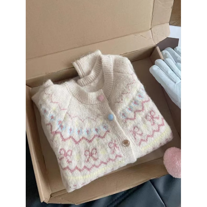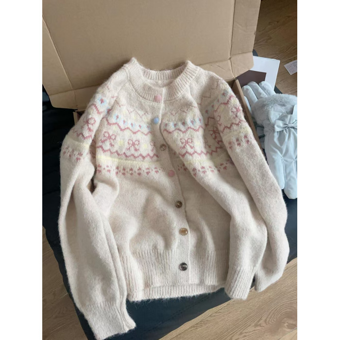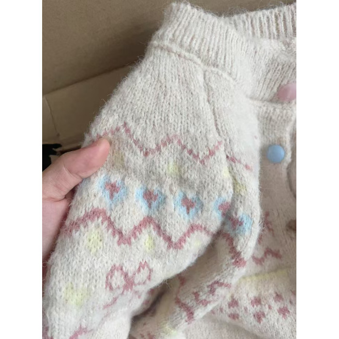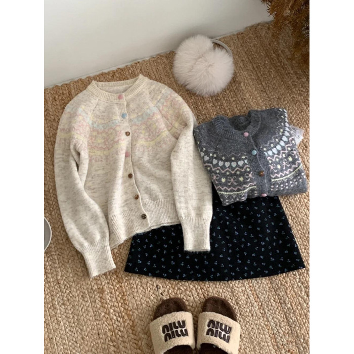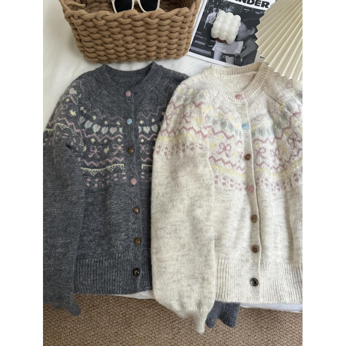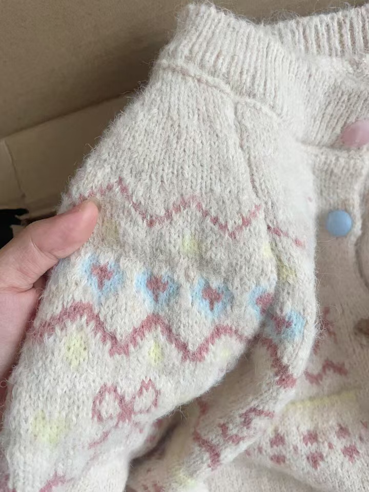 韓版撞色提花針織開衫女寬松短款慵懶風外搭上衣秋冬新款毛衣外套