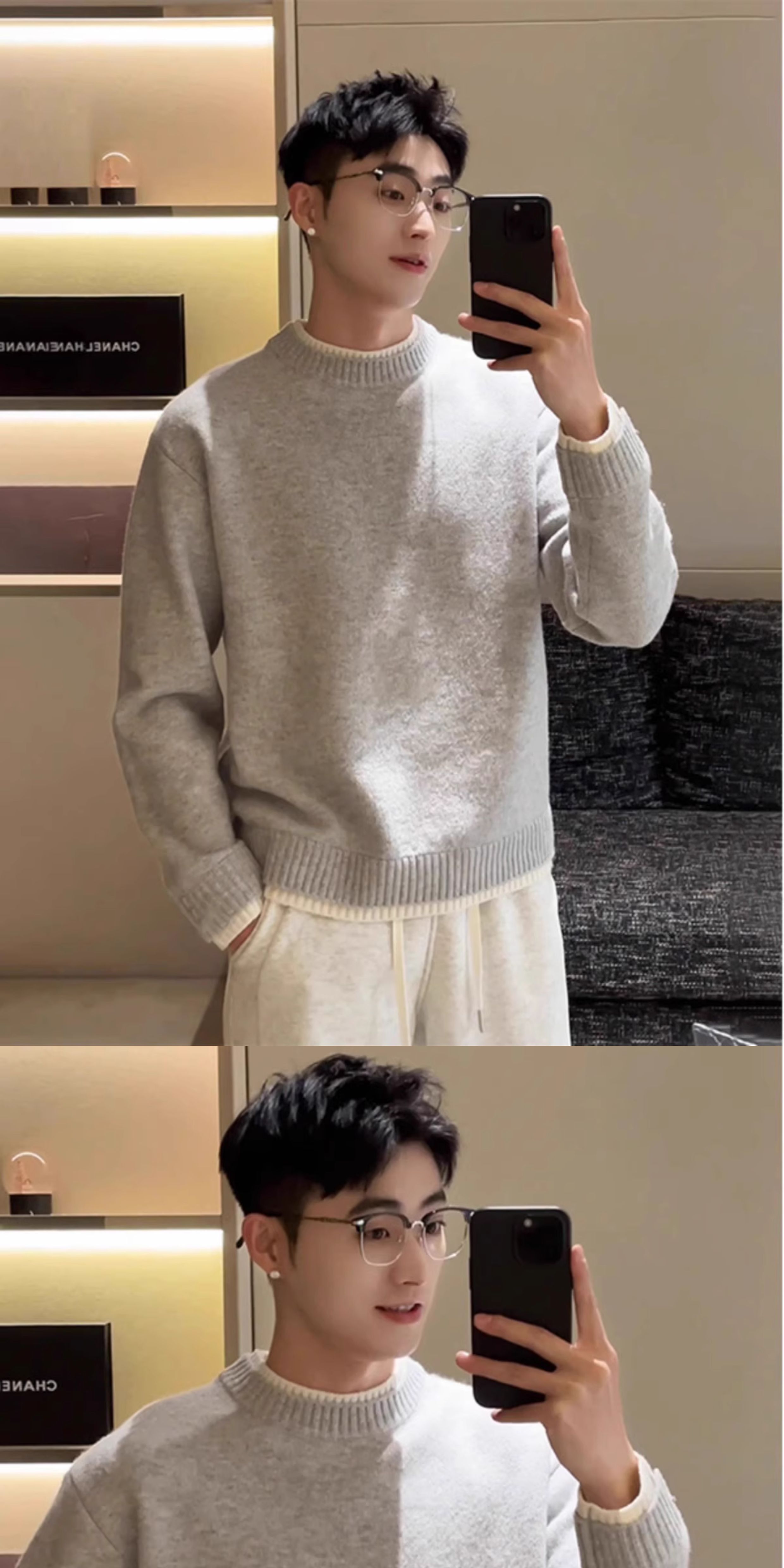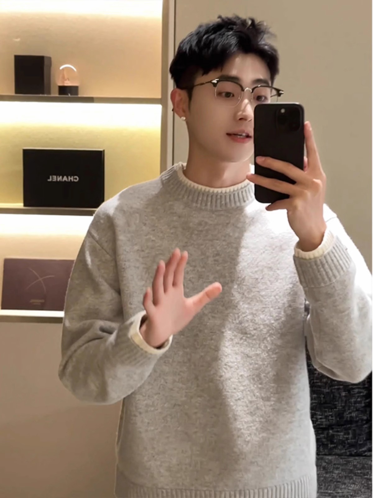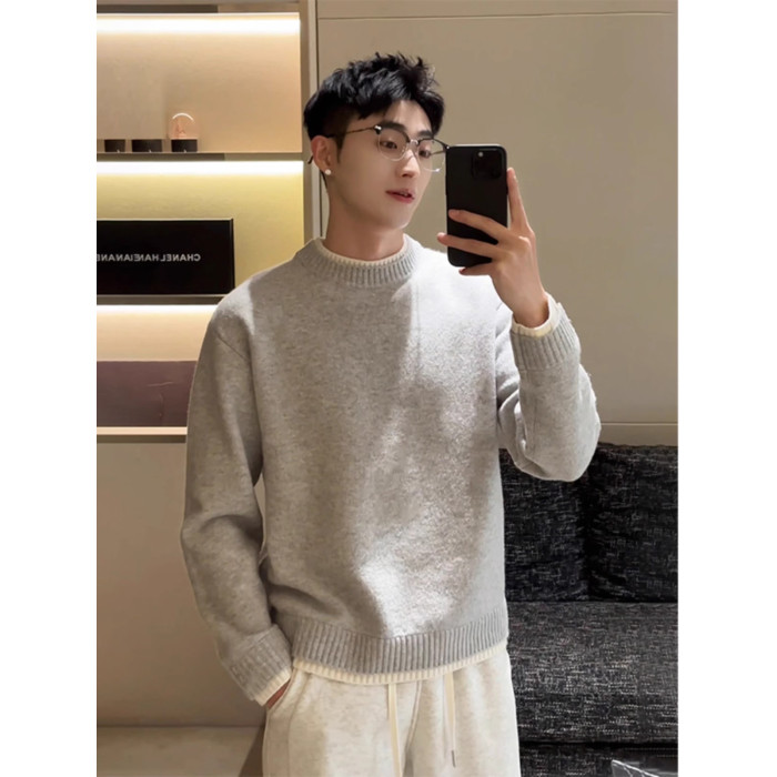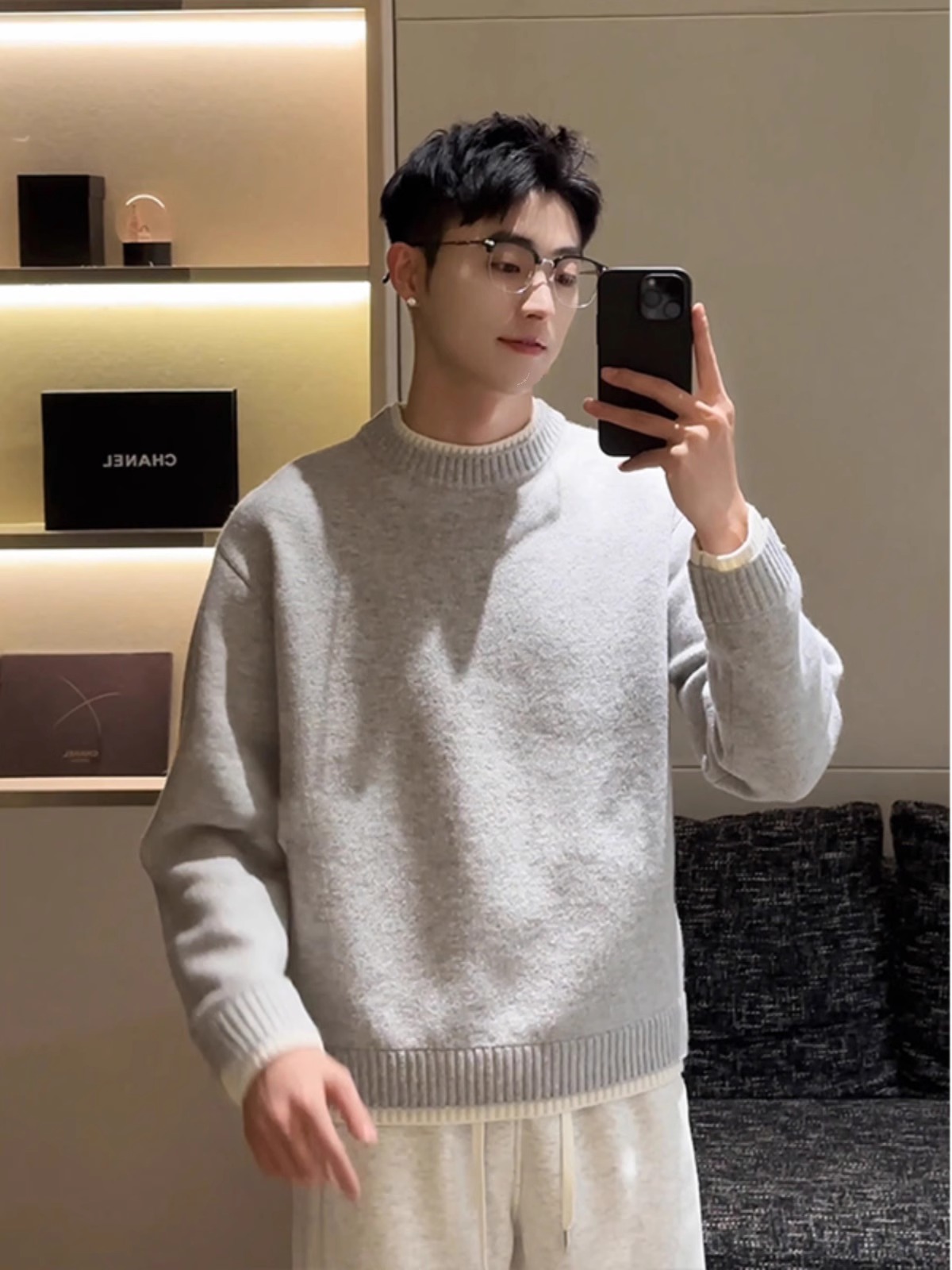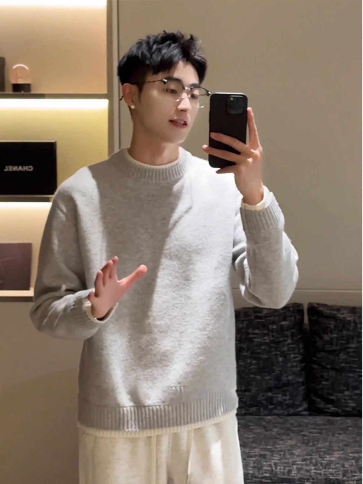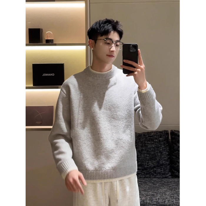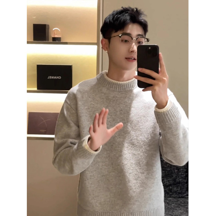 灰色圓領正肩毛衣男款秋冬季韓系慵懶風高級感內搭打底針織衫外套