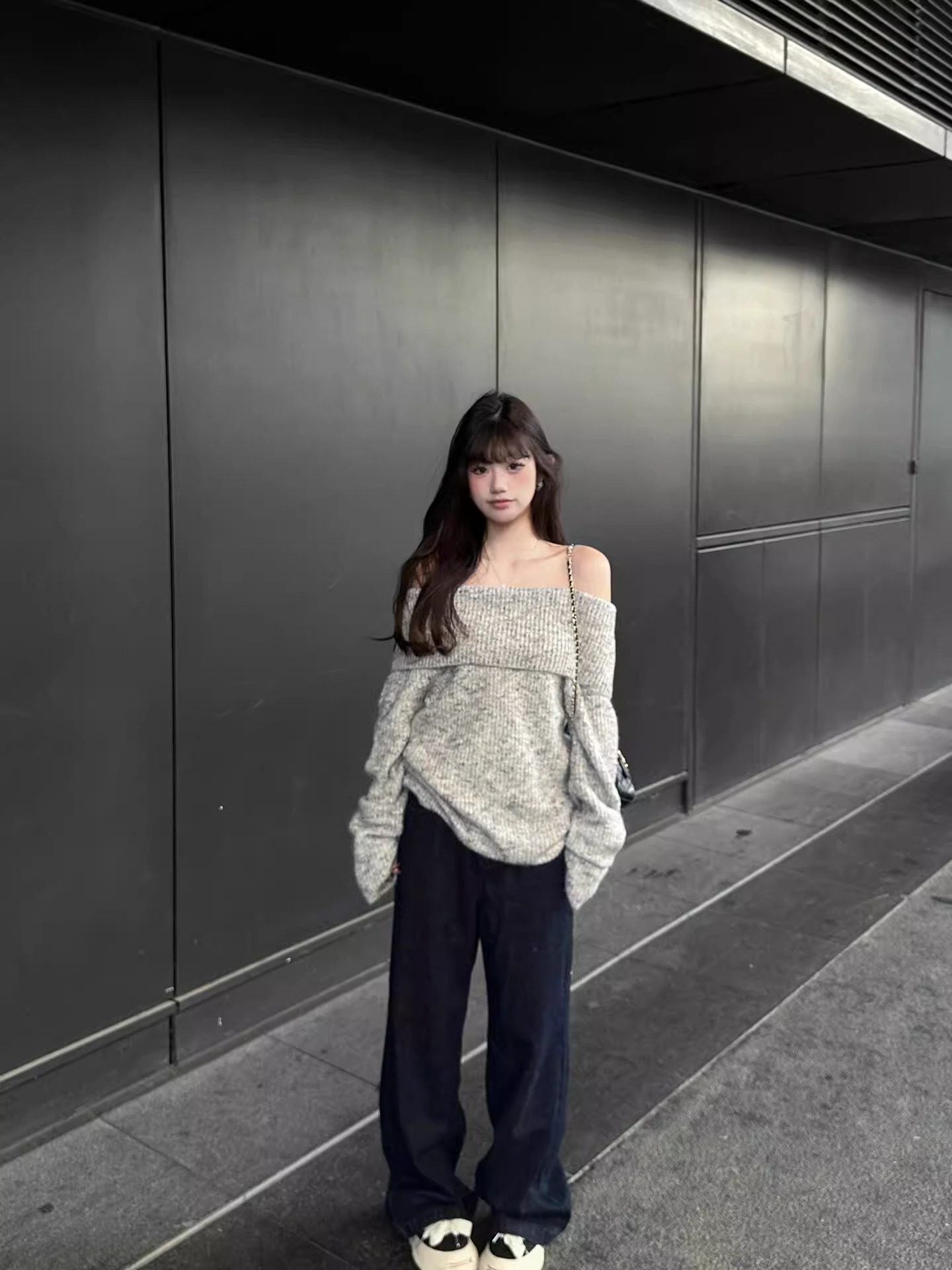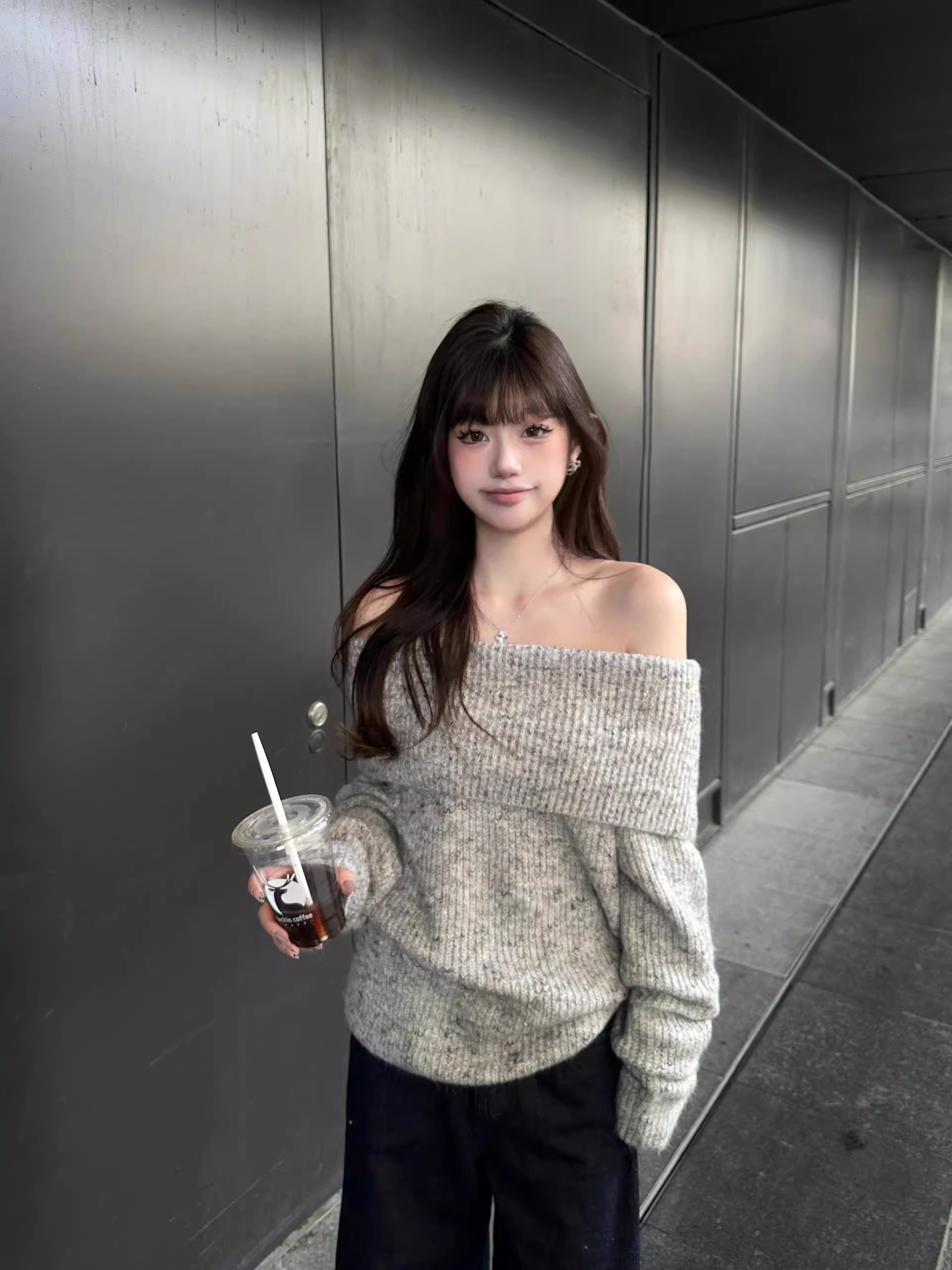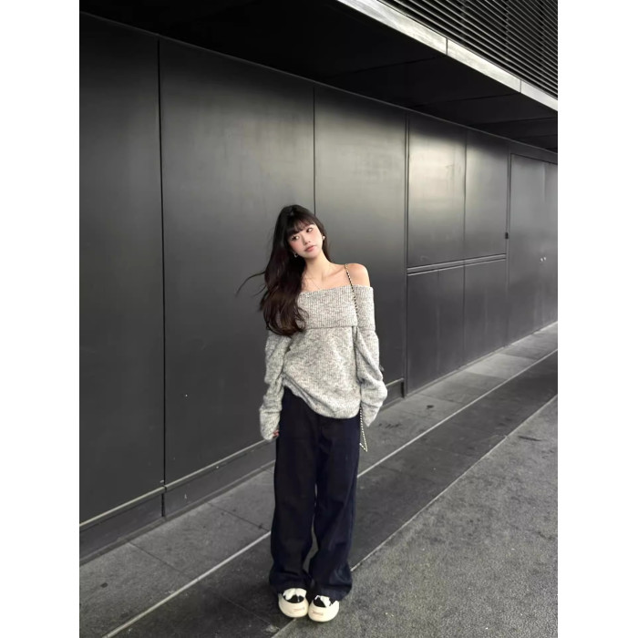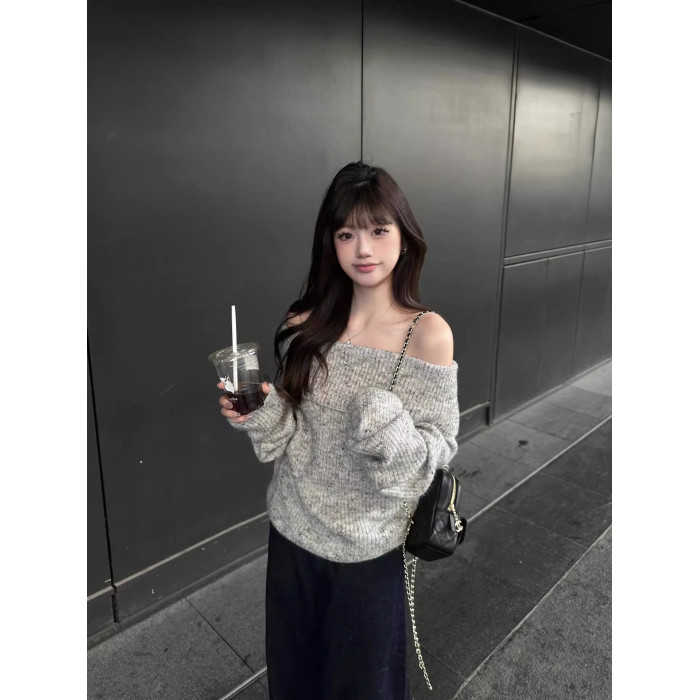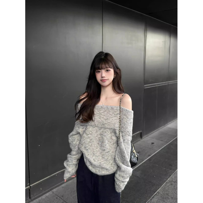 灰色露肩韓系套頭毛衣女秋慵懶風寬松休閒顯瘦氣質小個子長袖上衣