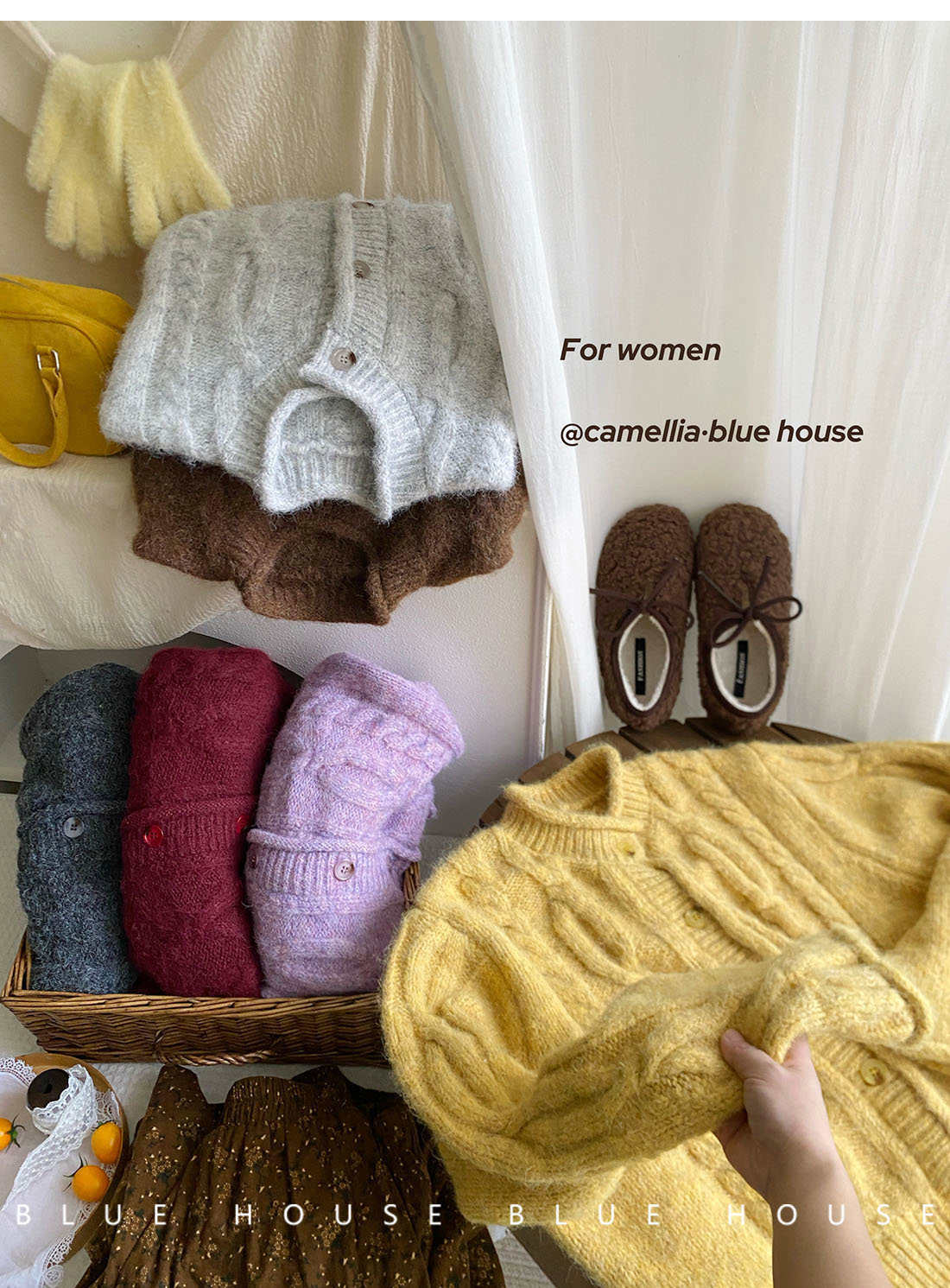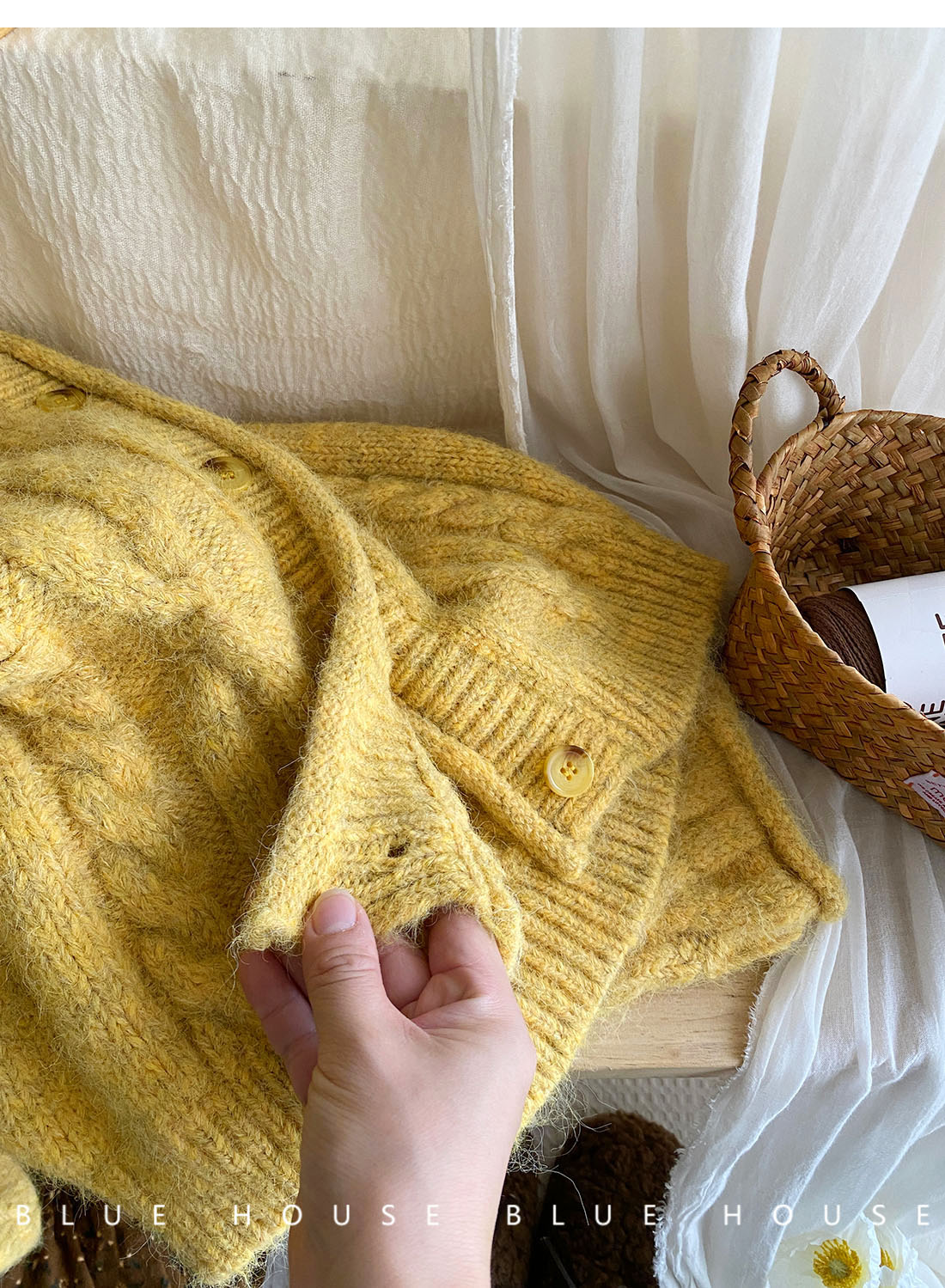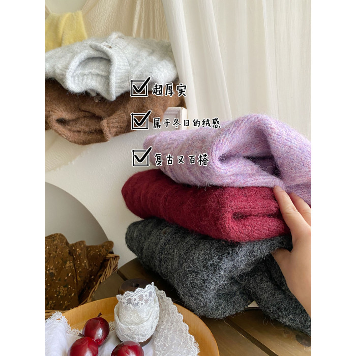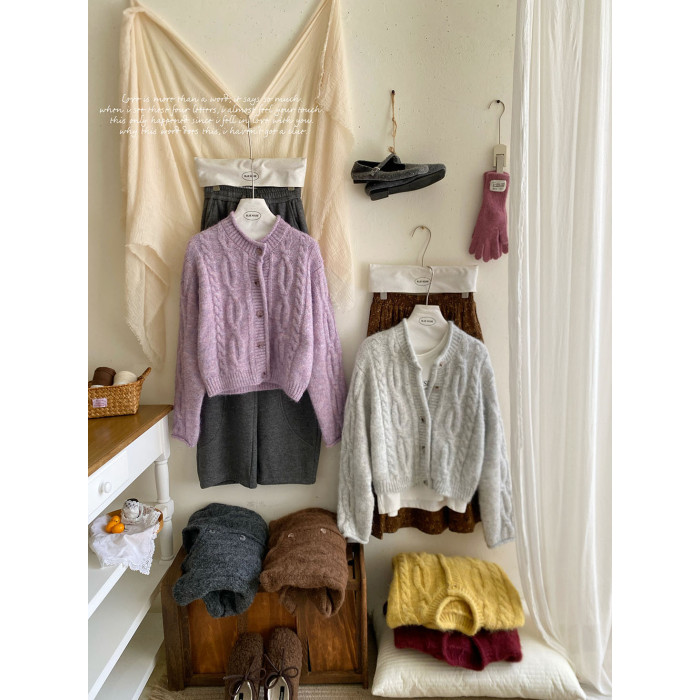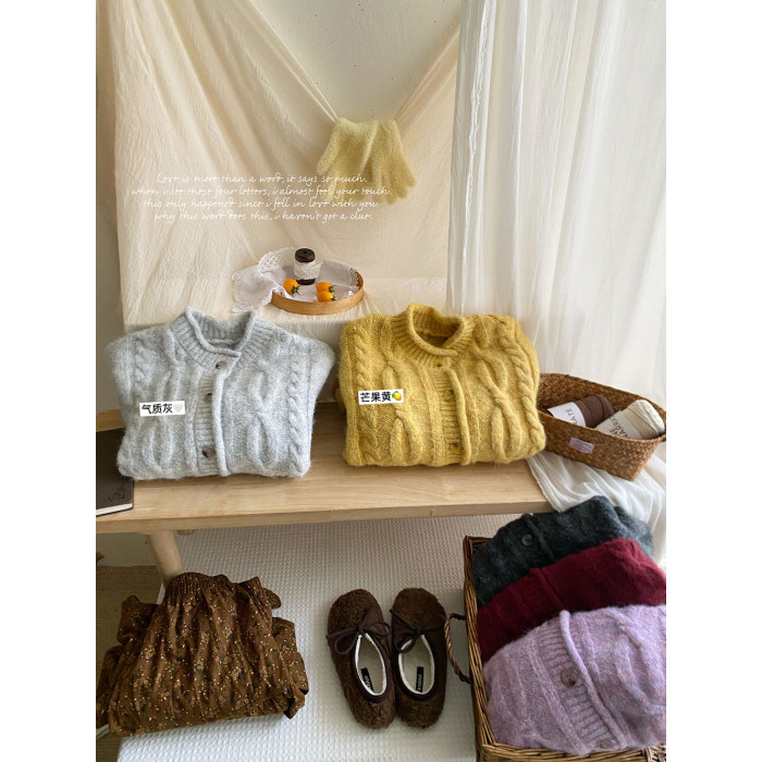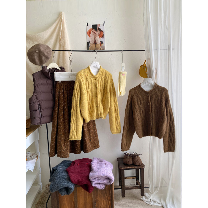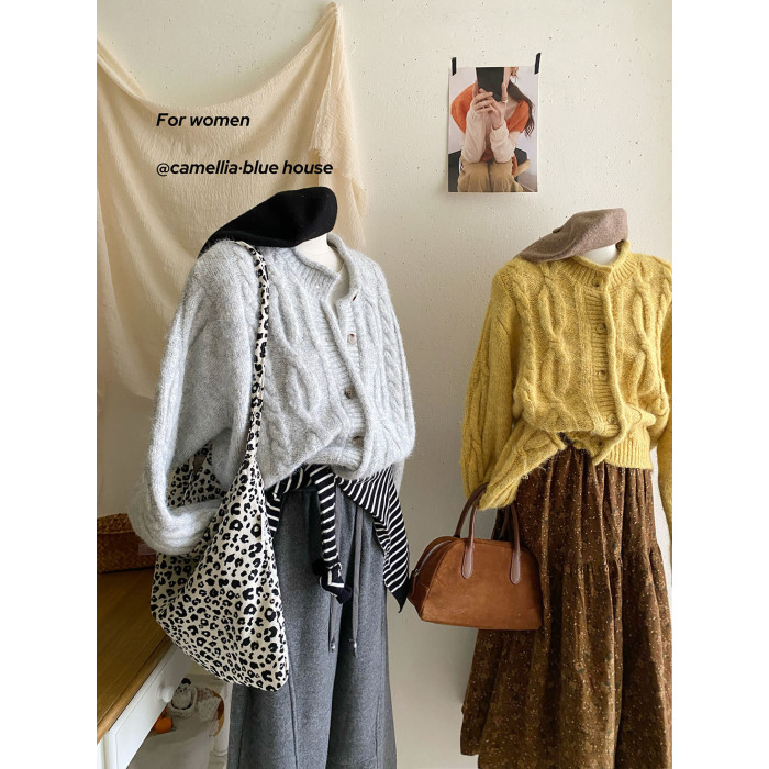 韓國復古黃色咖色羊絨麻花毛衣外套女冬溫柔圓領顯瘦百搭針織開衫