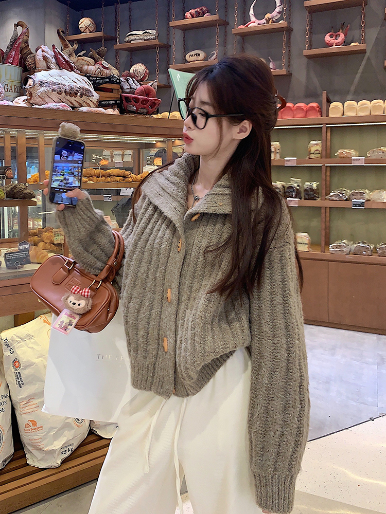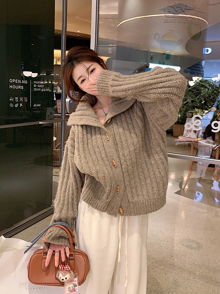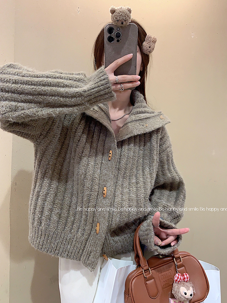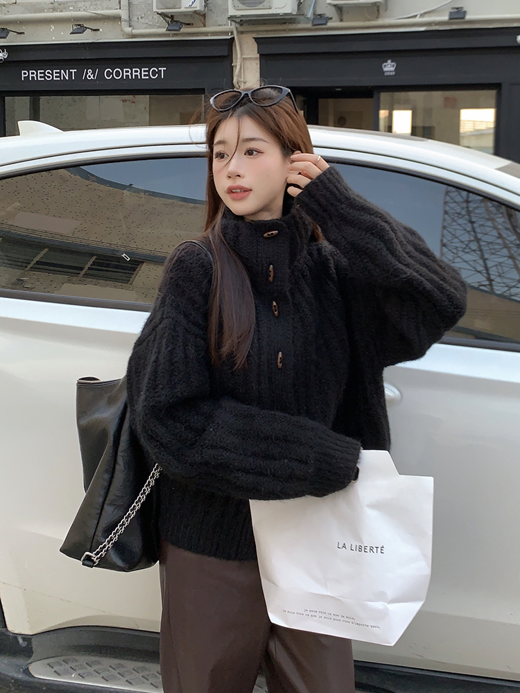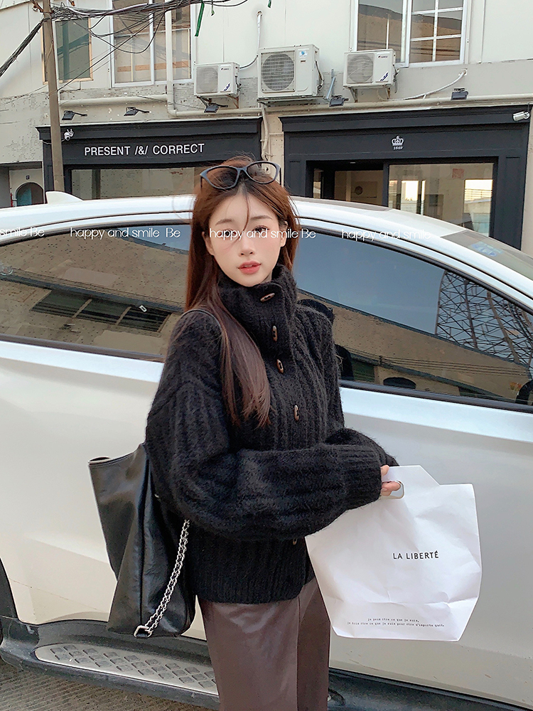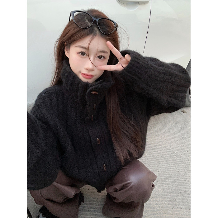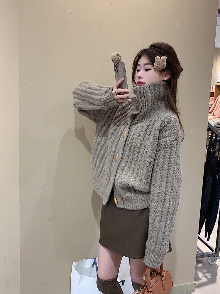 復古牛角釦軟糯坑條高領毛衣外套女秋冬冬加厚寬松慵懶風針織開衫