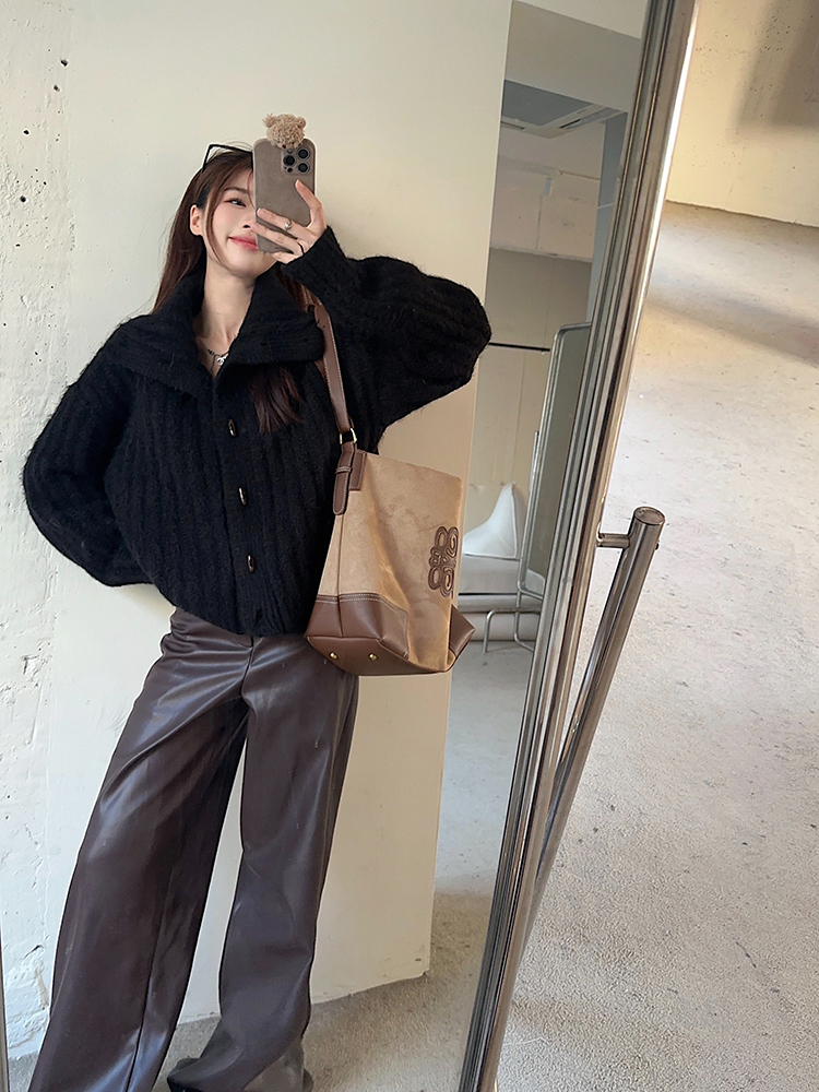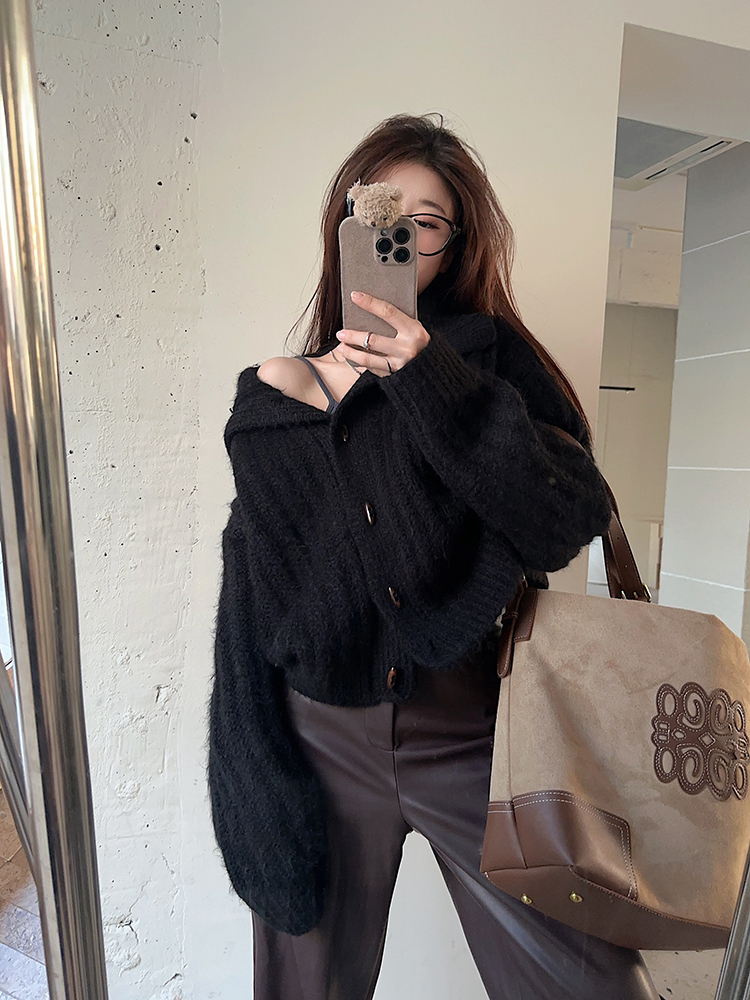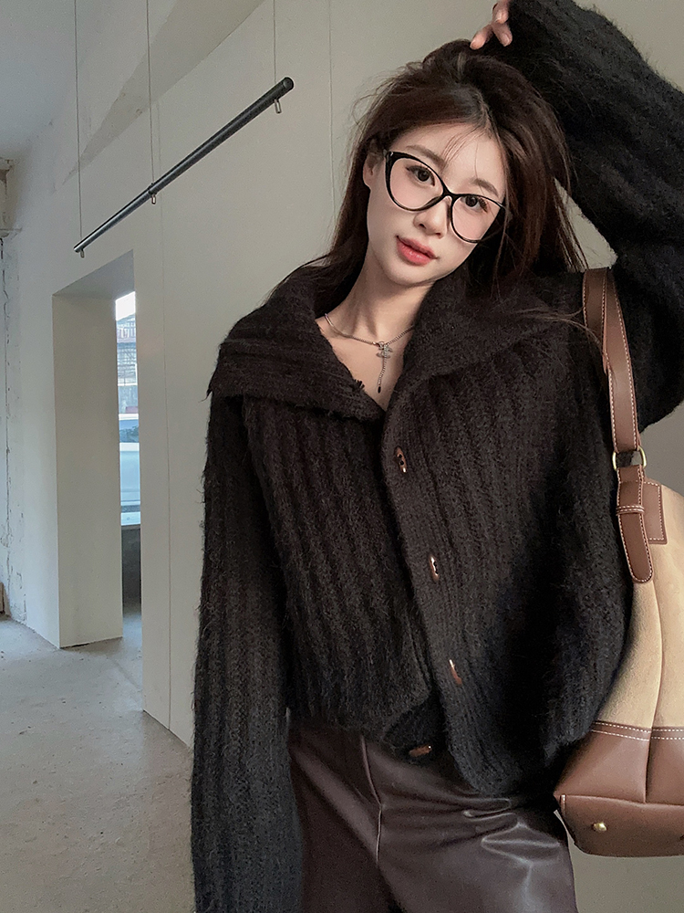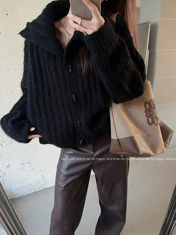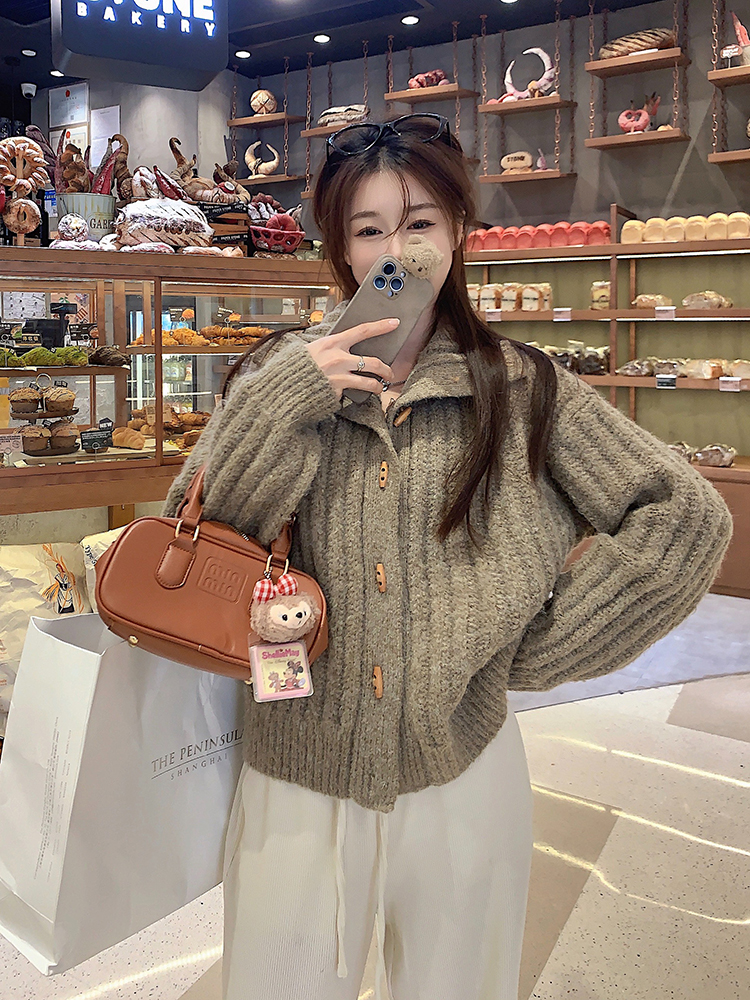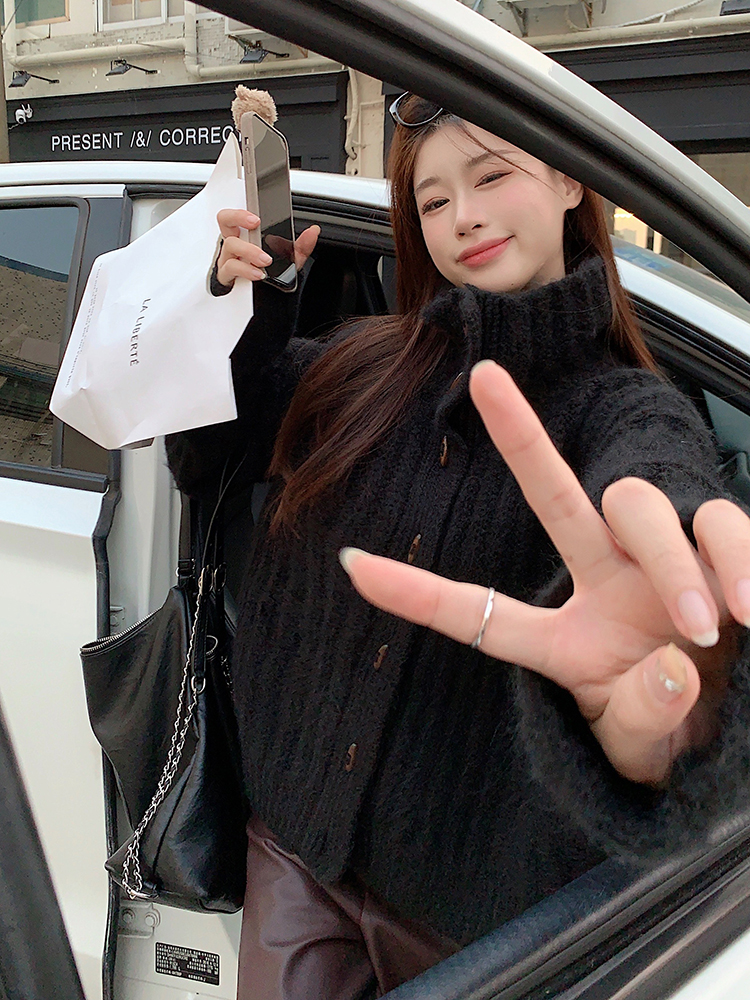 復古牛角釦軟糯坑條高領毛衣外套女秋冬冬加厚寬松慵懶風針織開衫