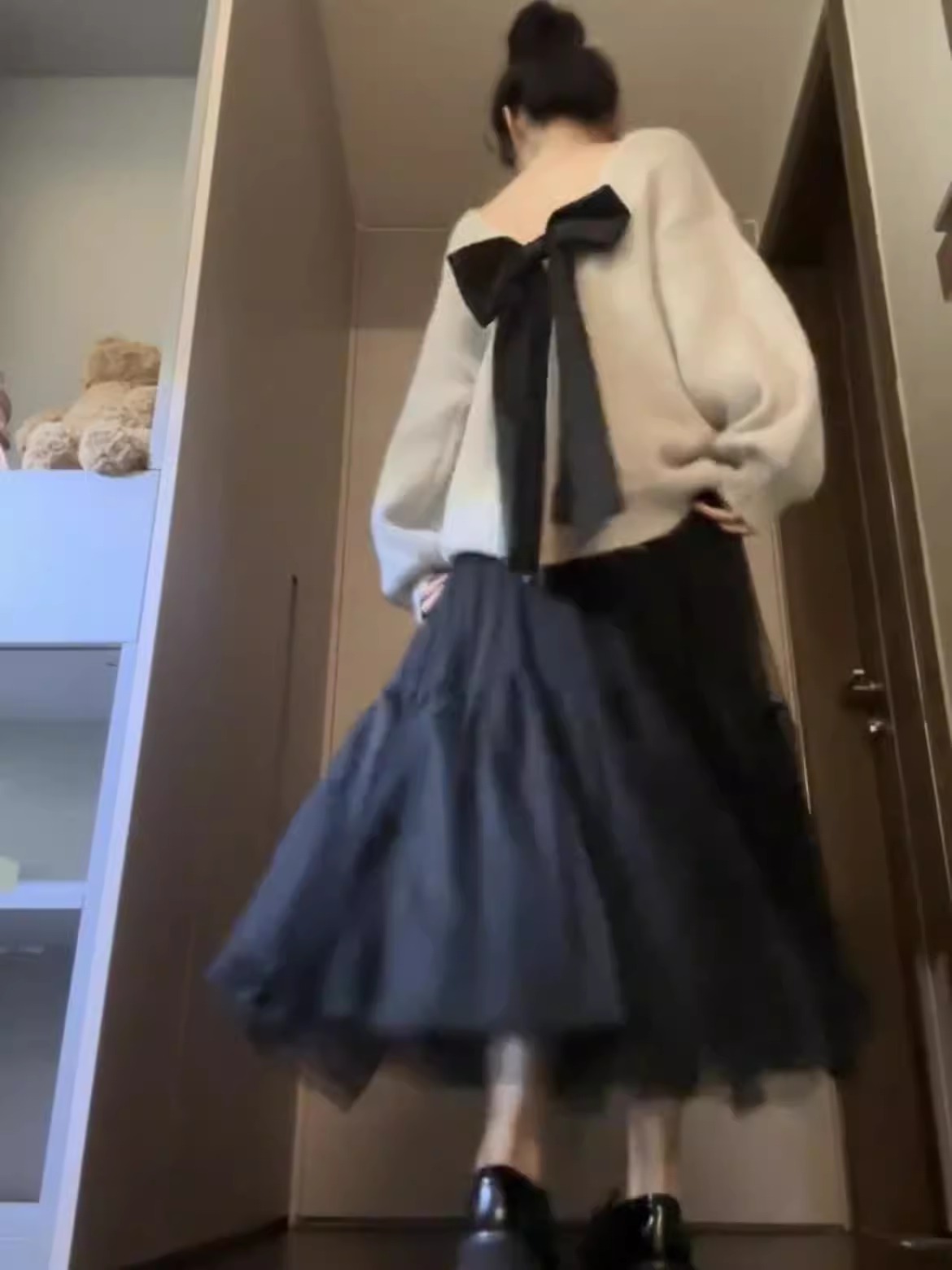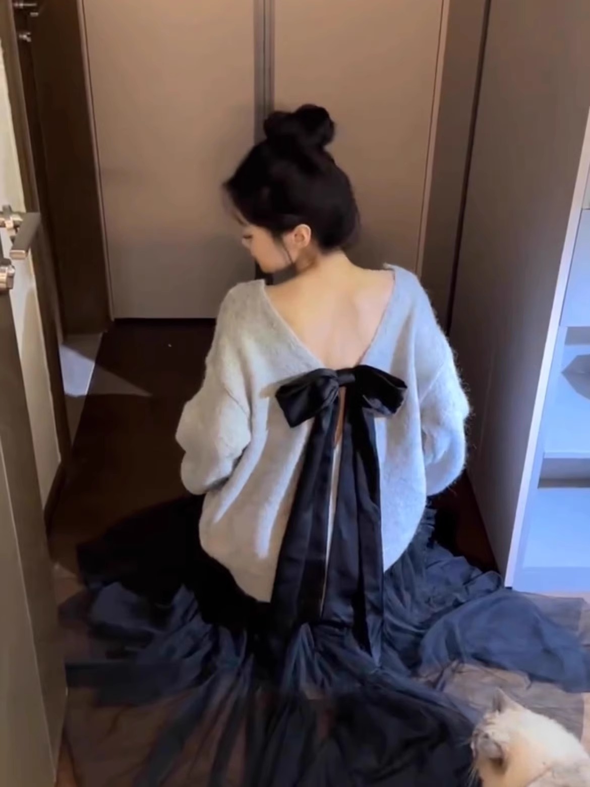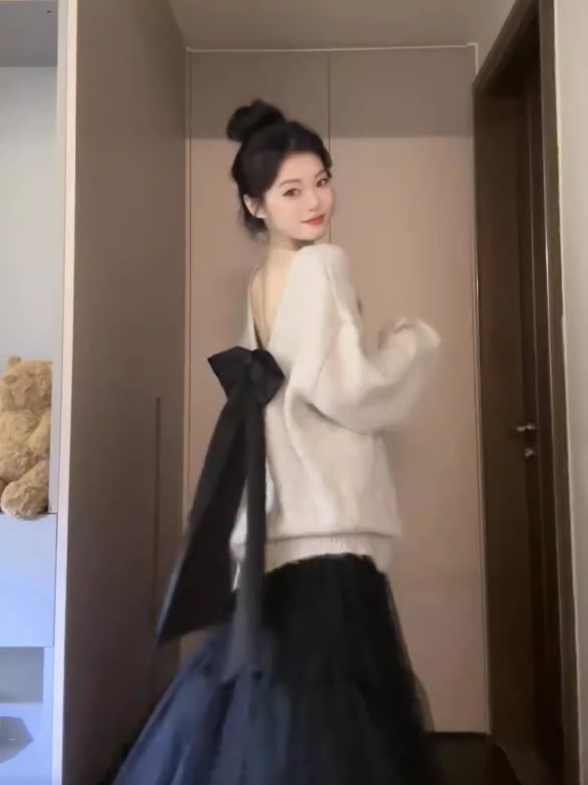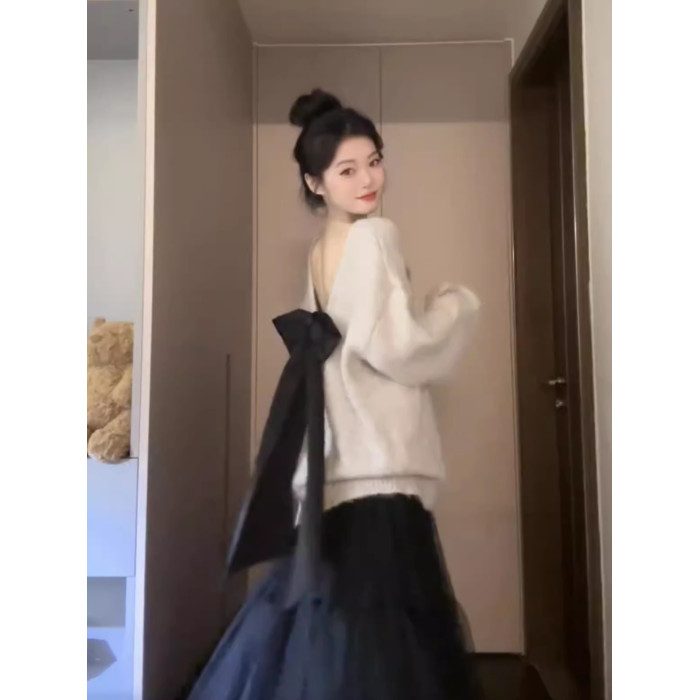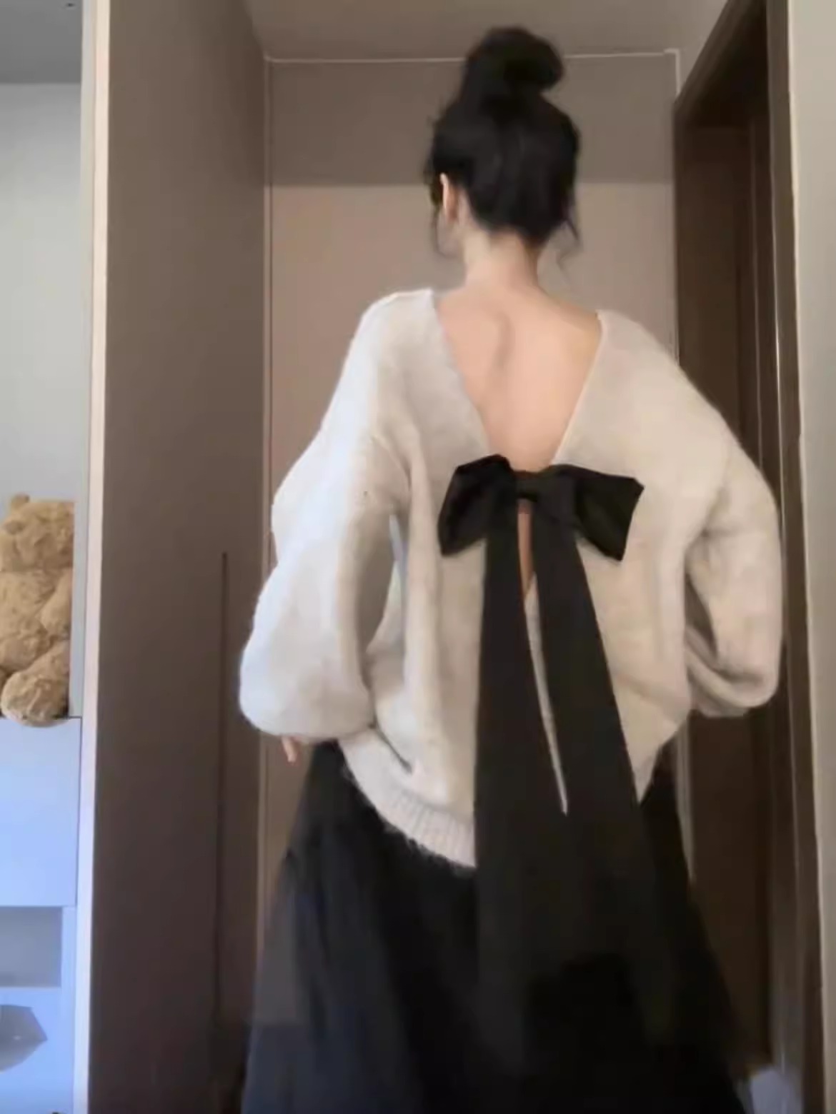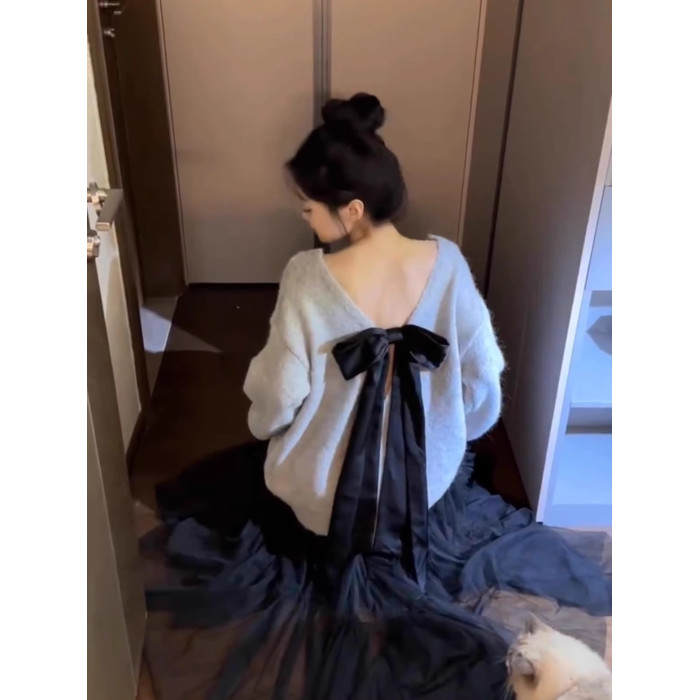 慵懶風露背蝴蝶結圓領毛衣女秋季復古長袖針織衫寬松顯瘦灰色上衣
