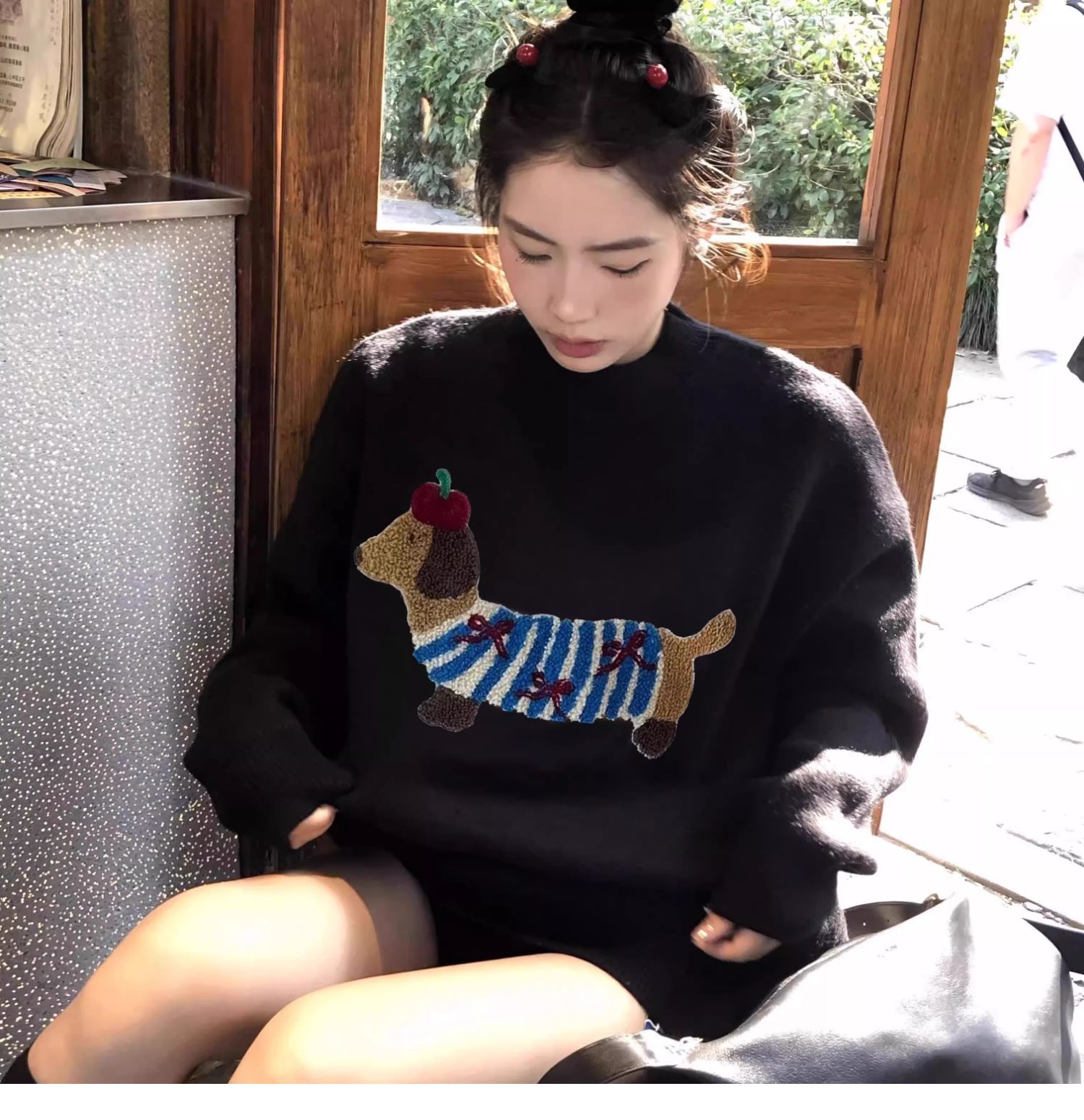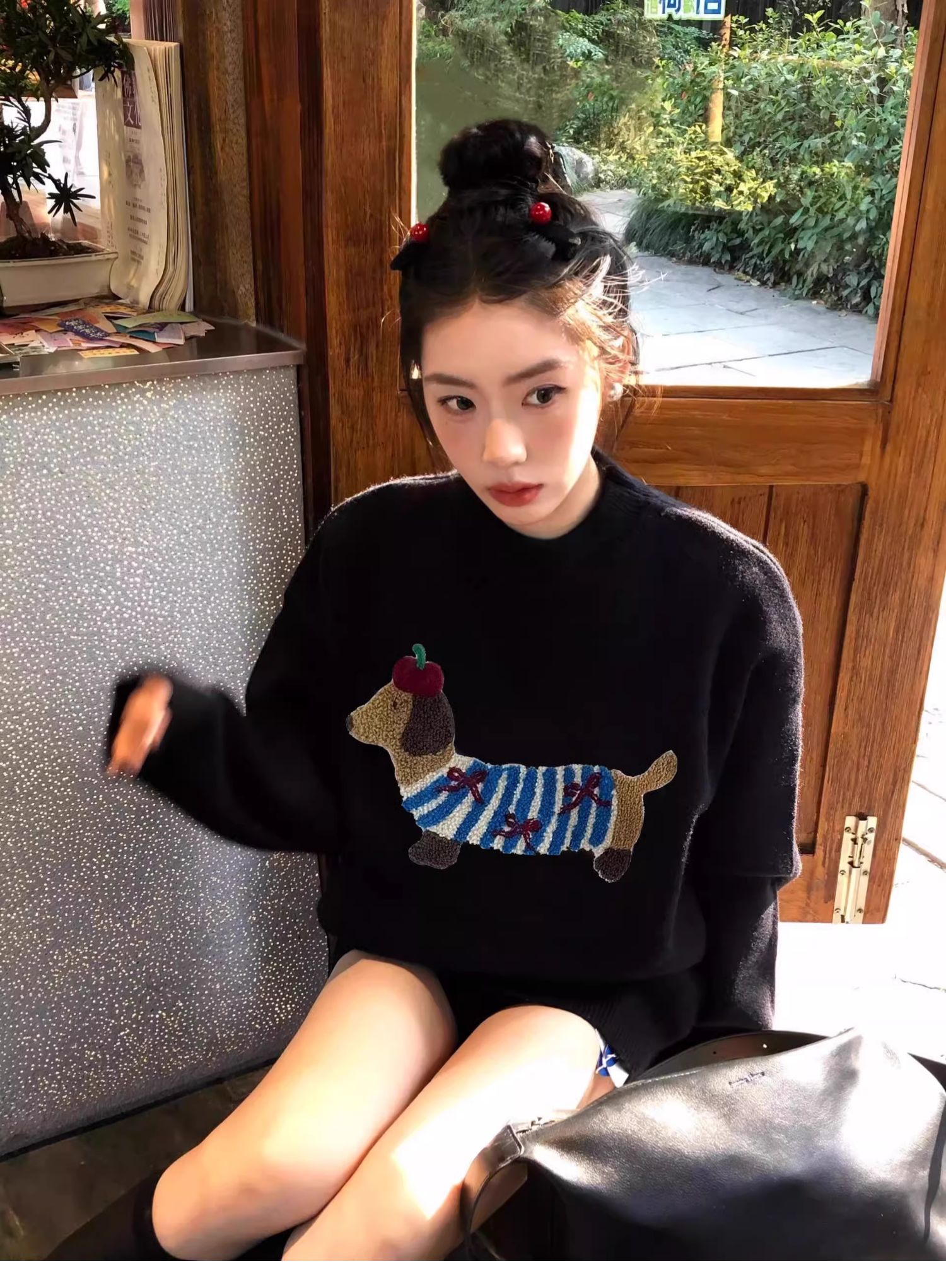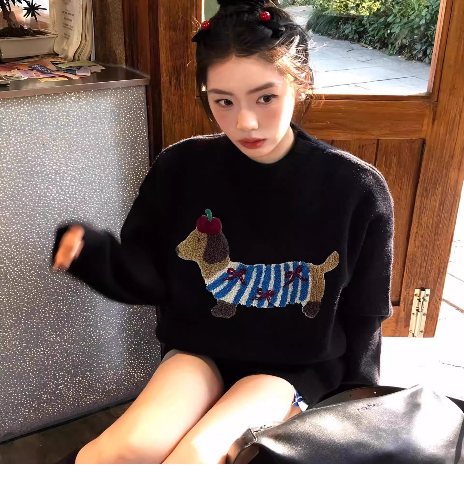 潮牌臘腸狗刺綉黑色毛衣女軟糯慵懶高級感秋冬圓領套頭針織衫上衣