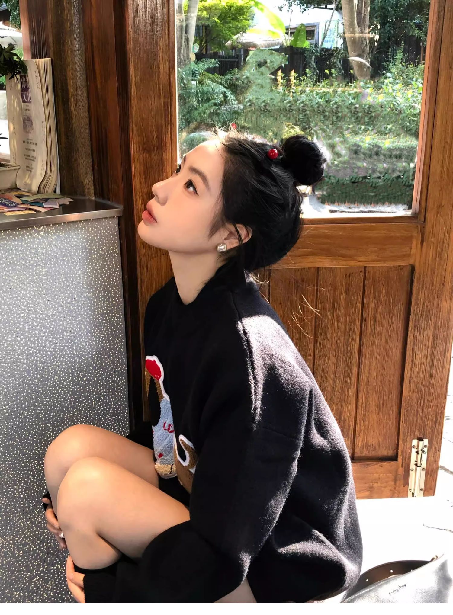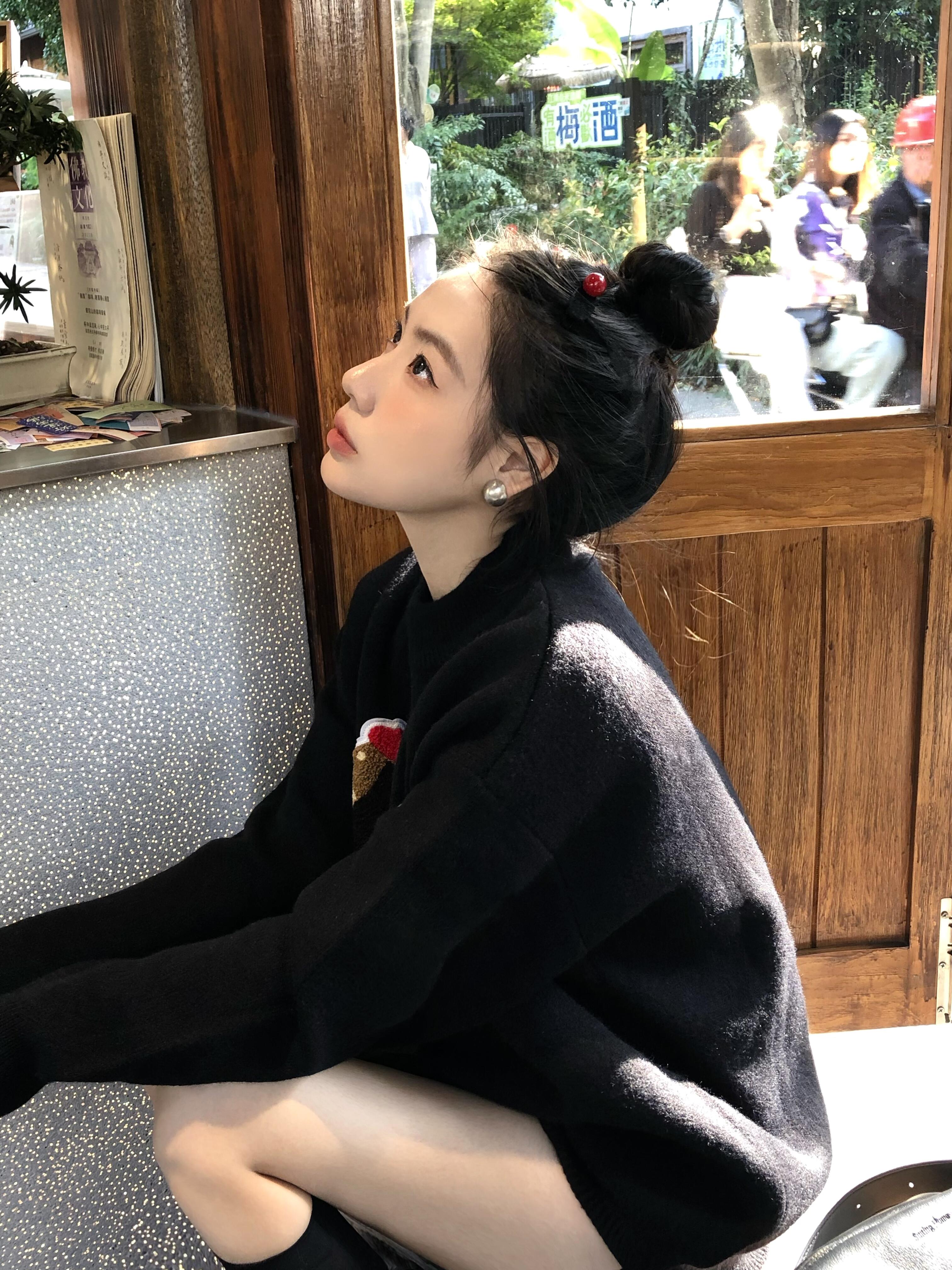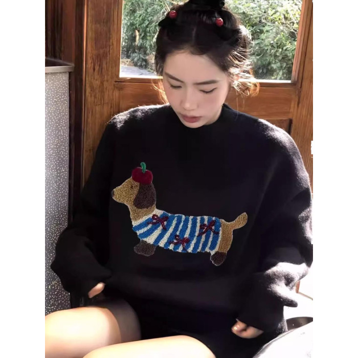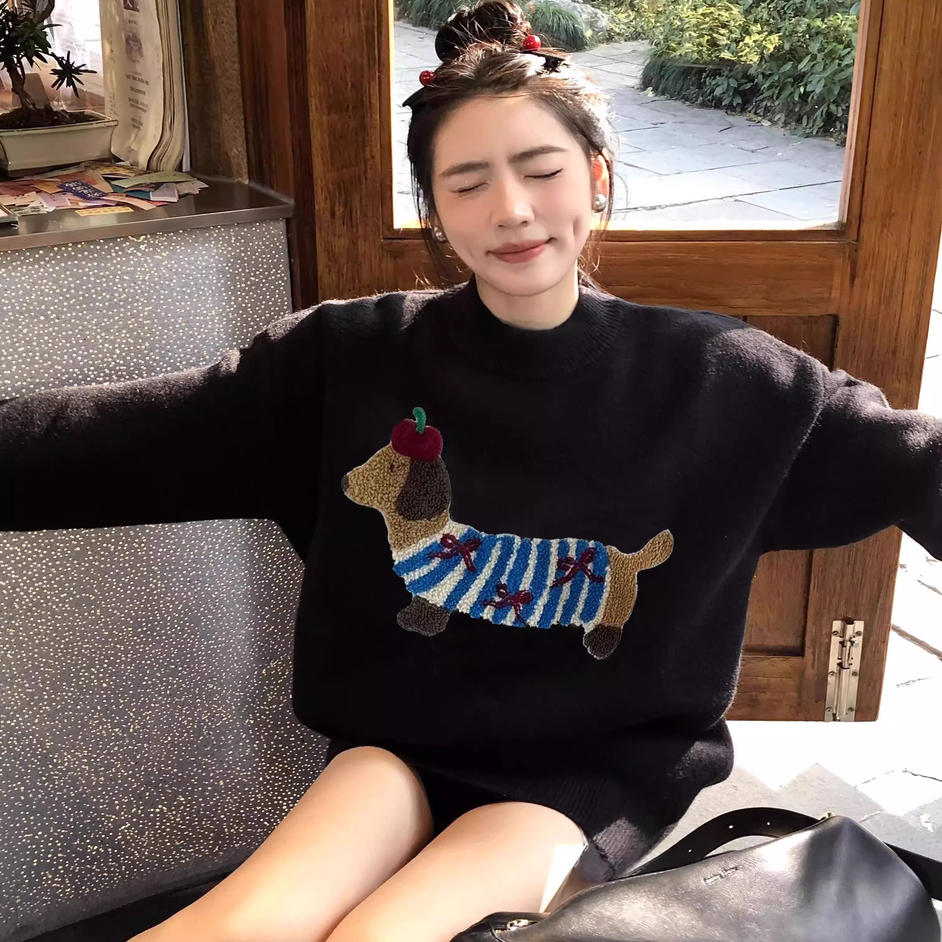 潮牌臘腸狗刺綉黑色毛衣女軟糯慵懶高級感秋冬圓領套頭針織衫上衣