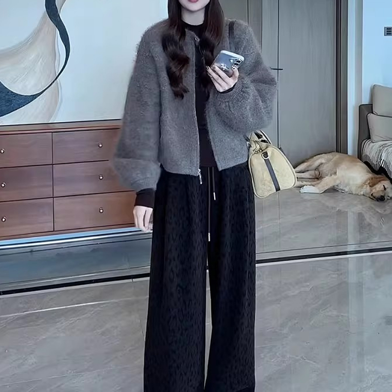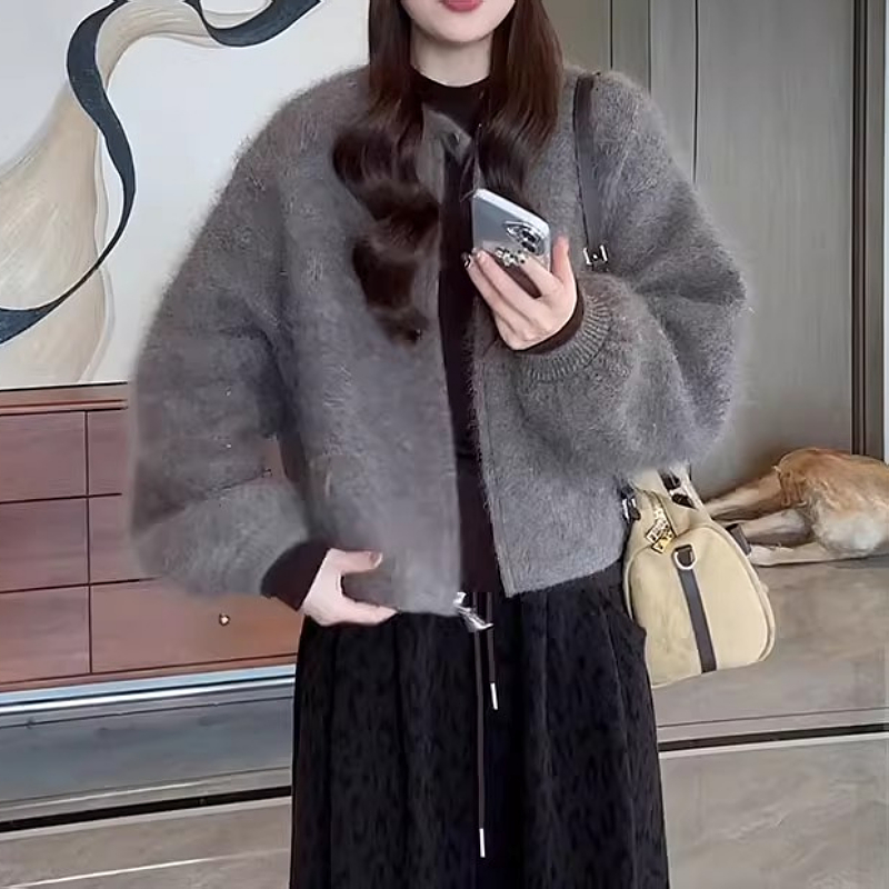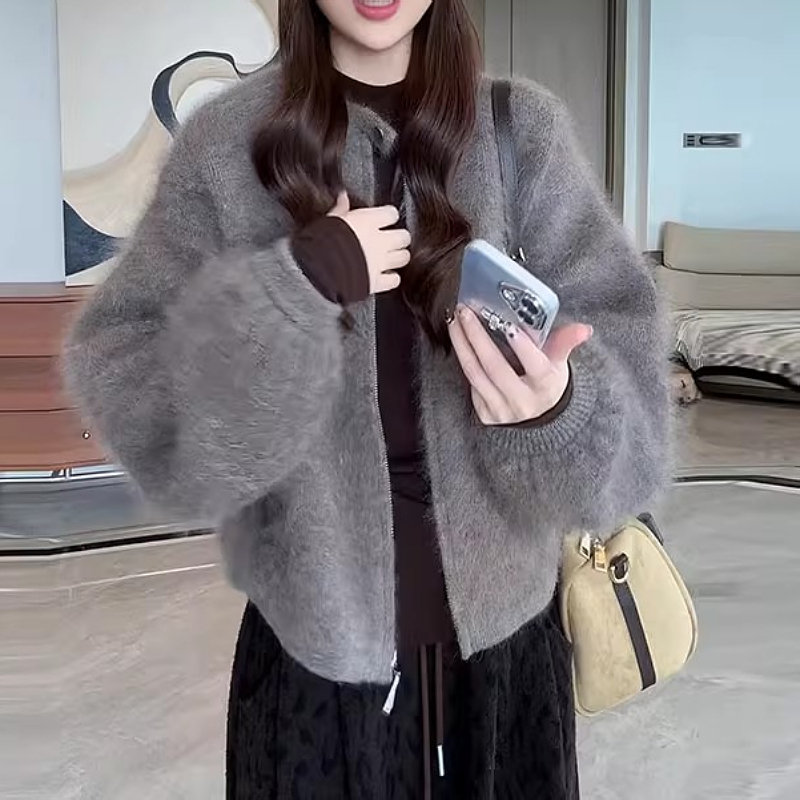 大碼女裝毛絨感一粒釦拉鍊毛衣外套秋季新款胖mm寬松顯瘦針織上衣