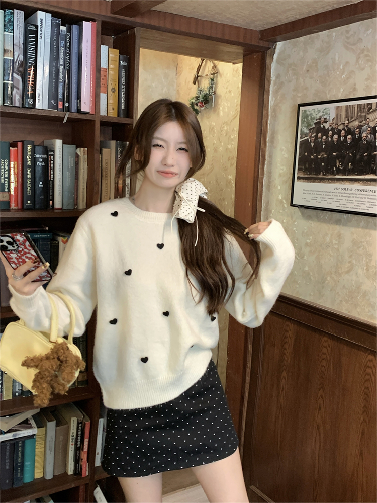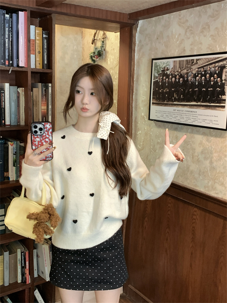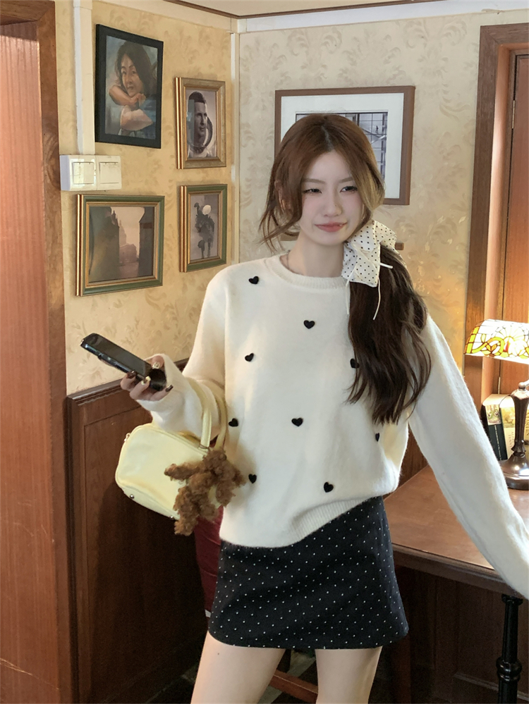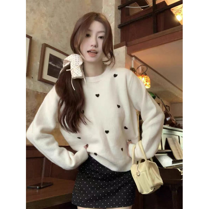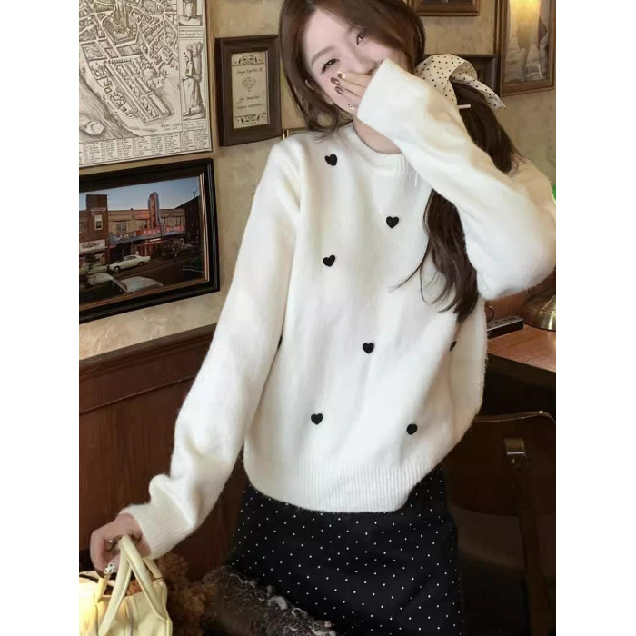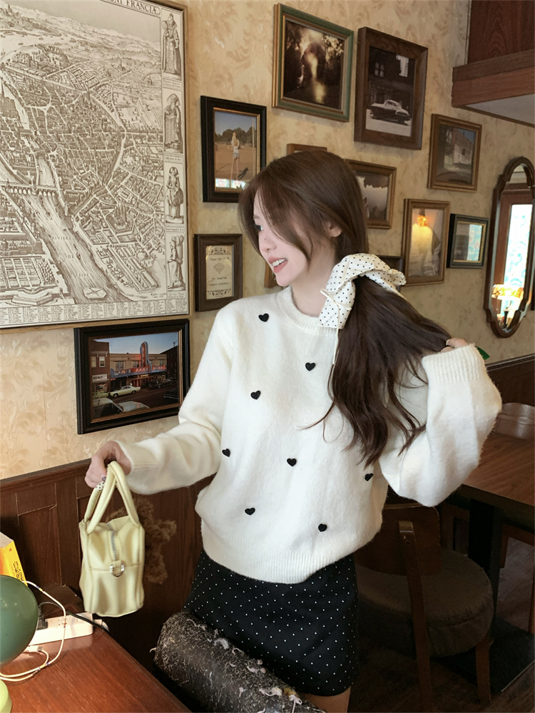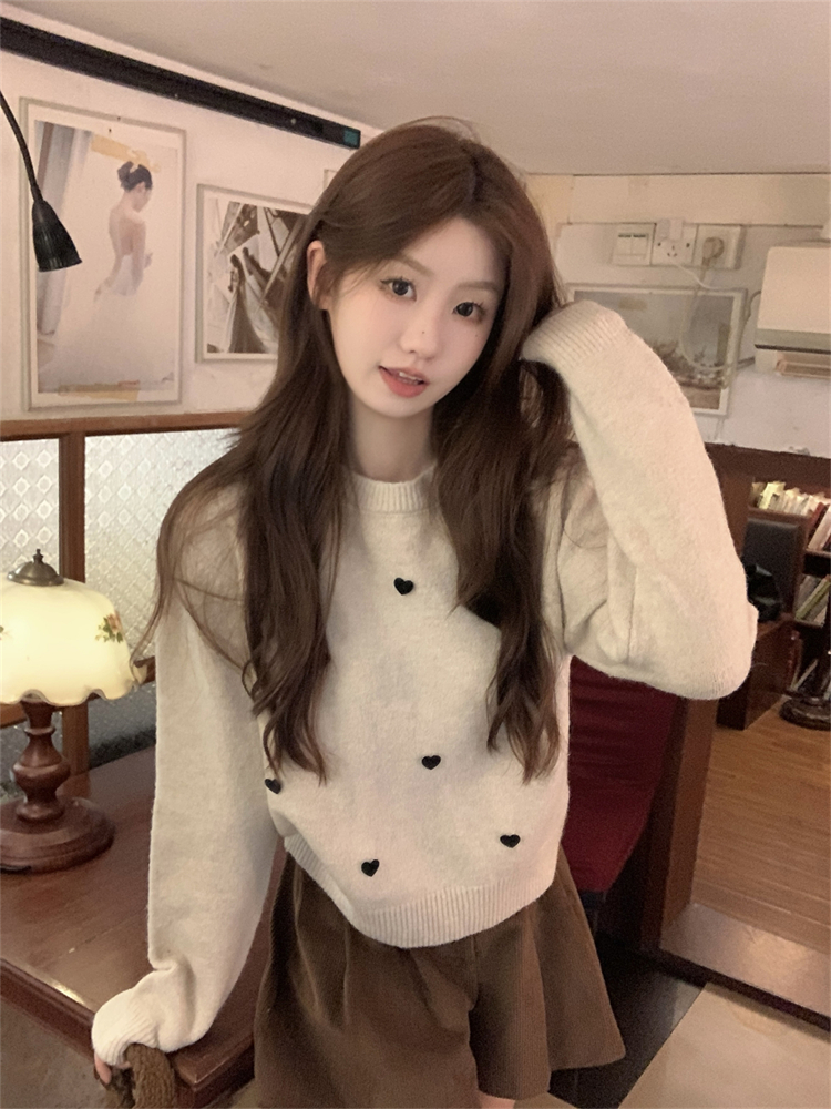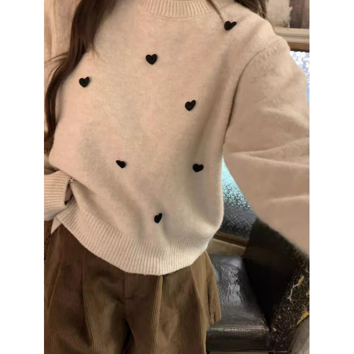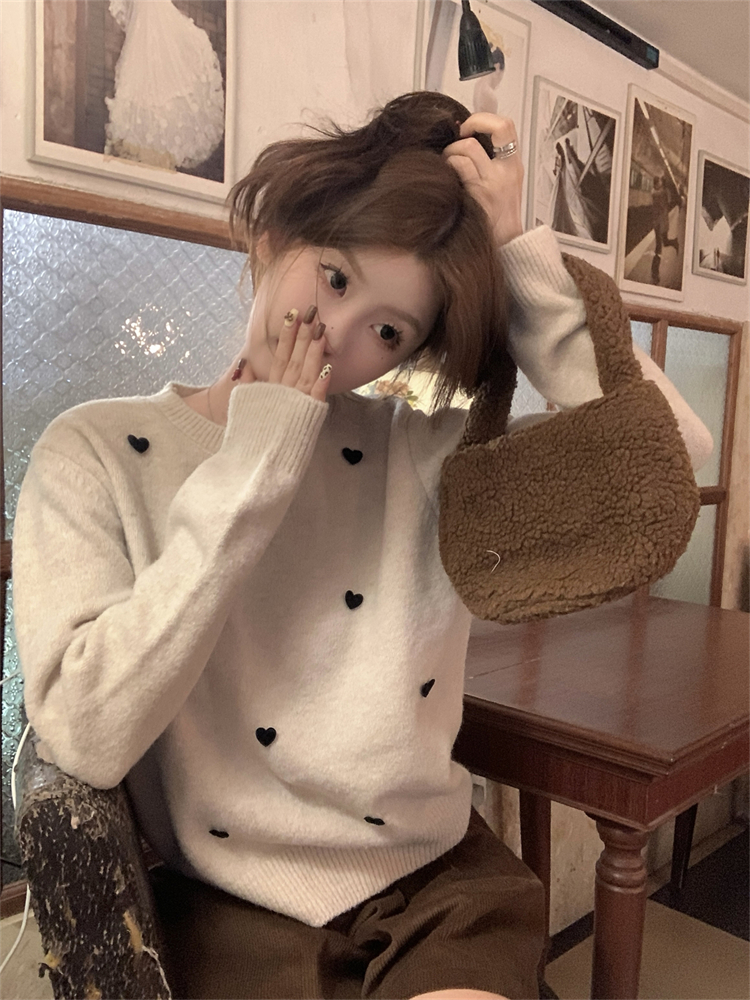 慵懶風甜美愛心圓領套頭毛衣女秋冬季新款針織打底衫寬松百搭上衣