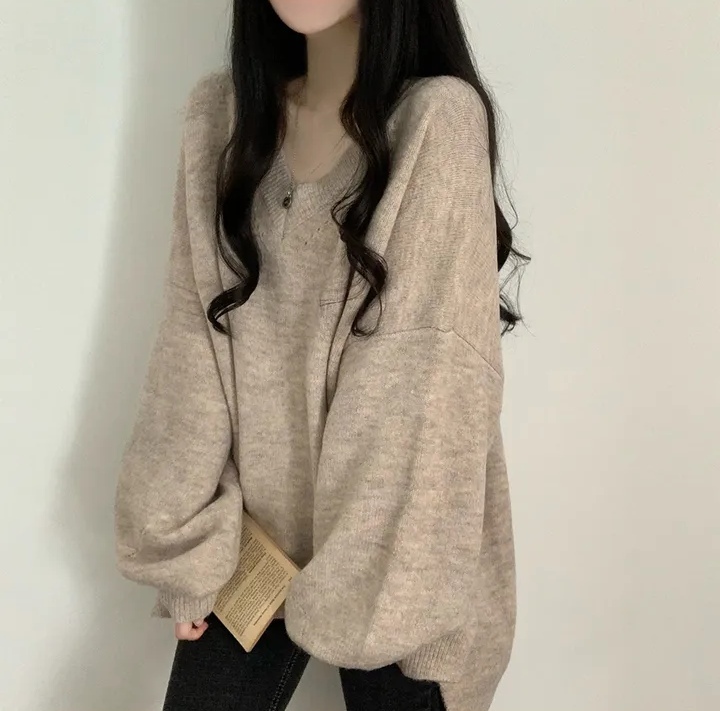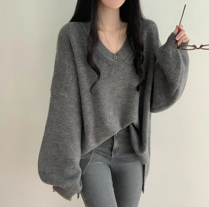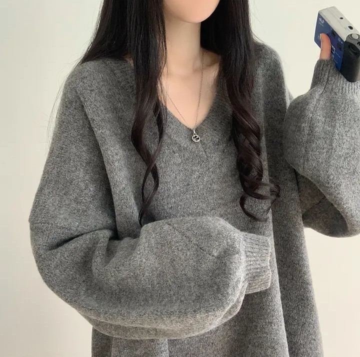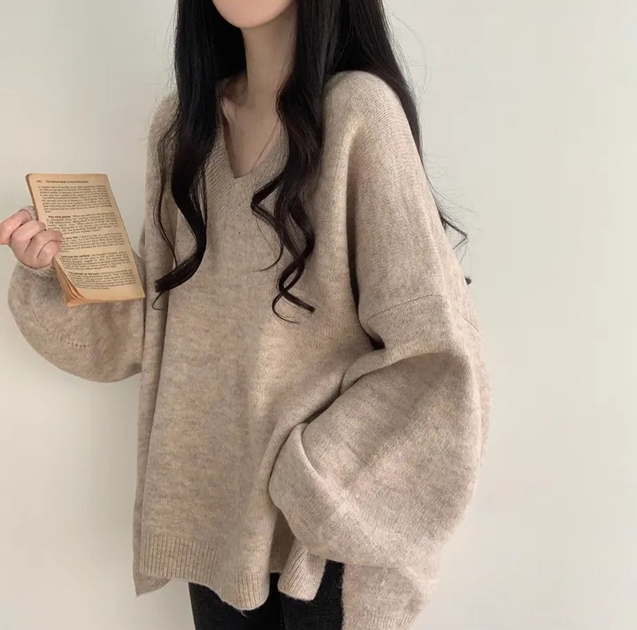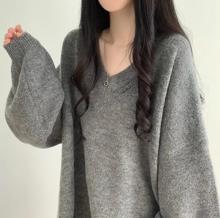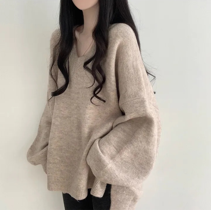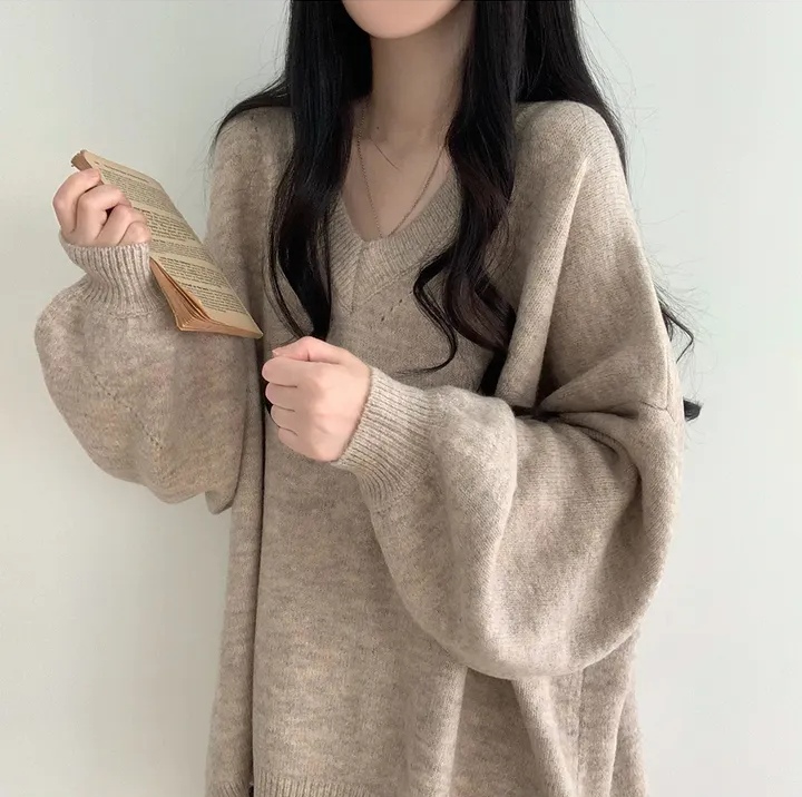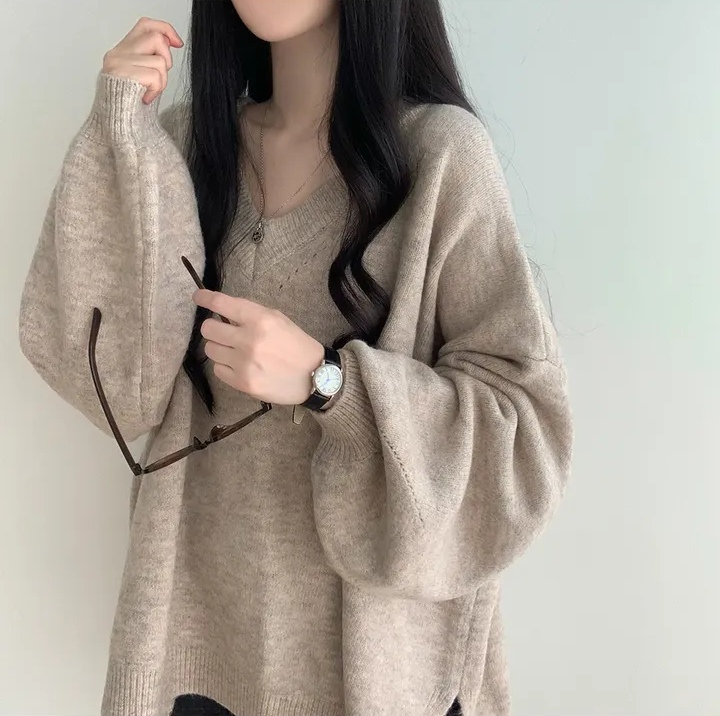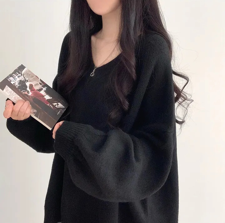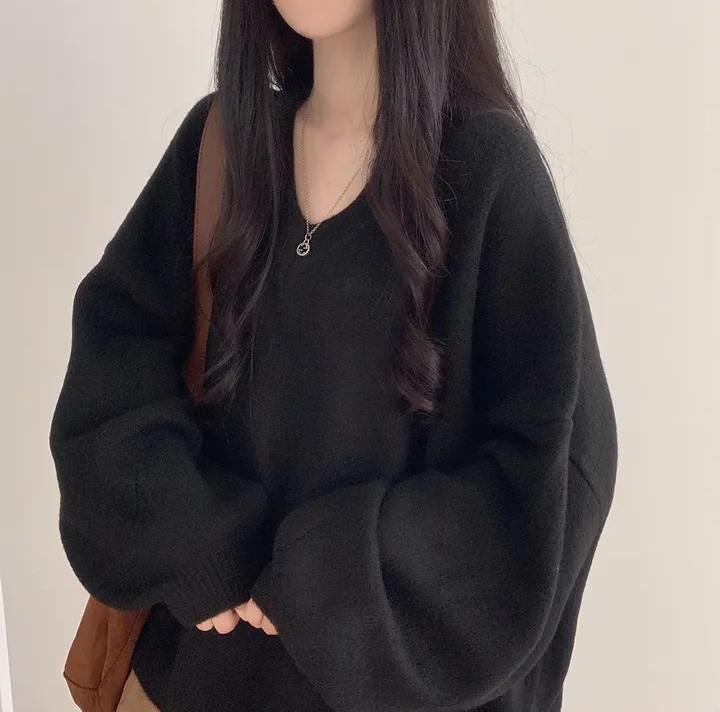 氣質獨特V領正肩針織毛衣女冬季大碼胖mm慵懶風中長款打底衫上衣