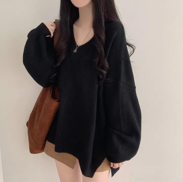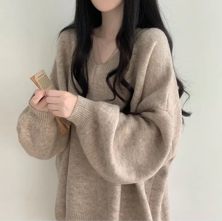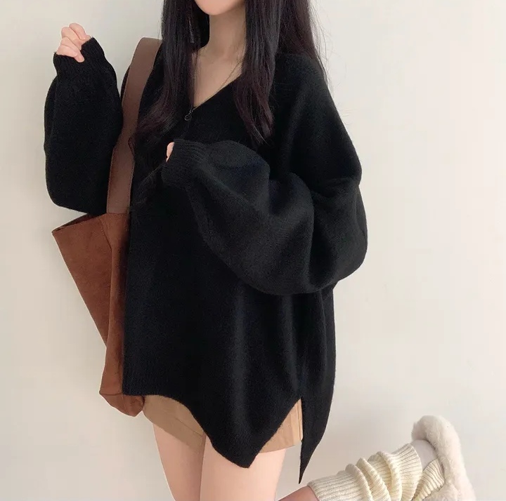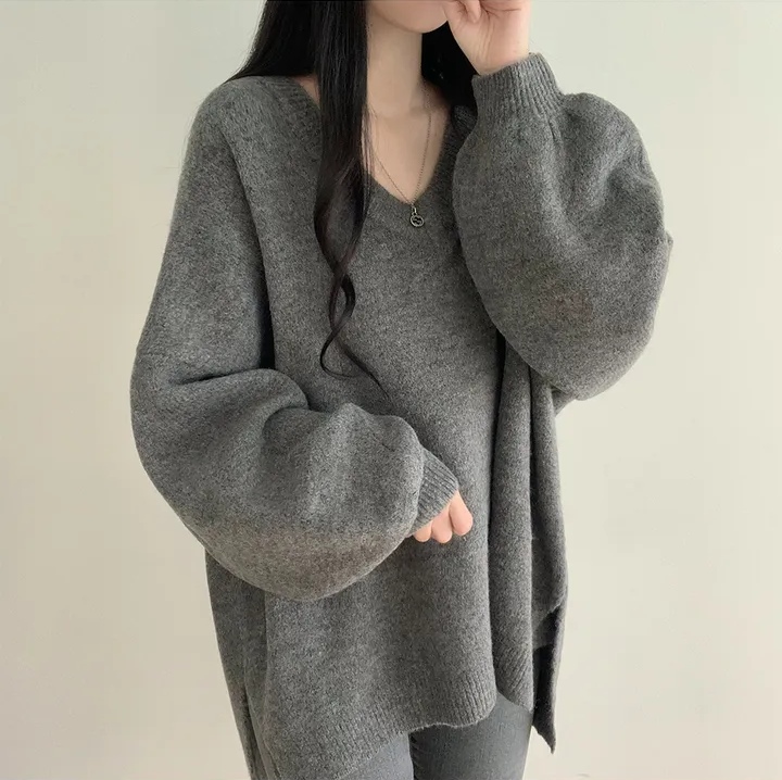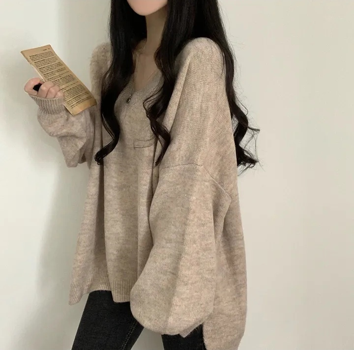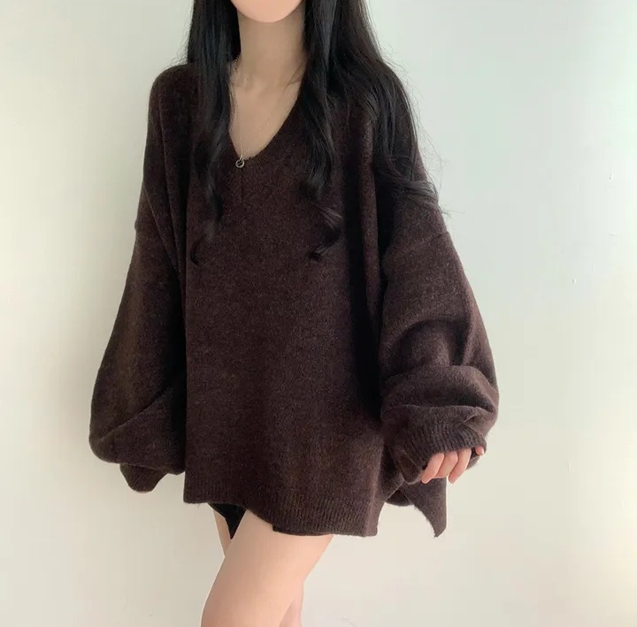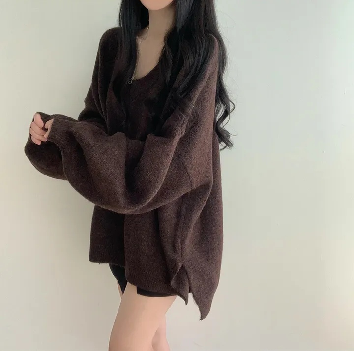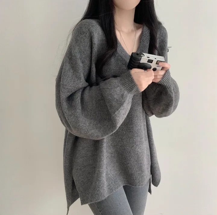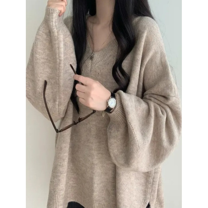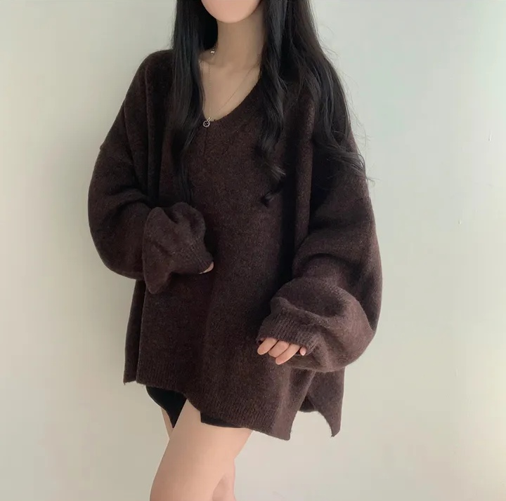 氣質獨特V領正肩針織毛衣女冬季大碼胖mm慵懶風中長款打底衫上衣