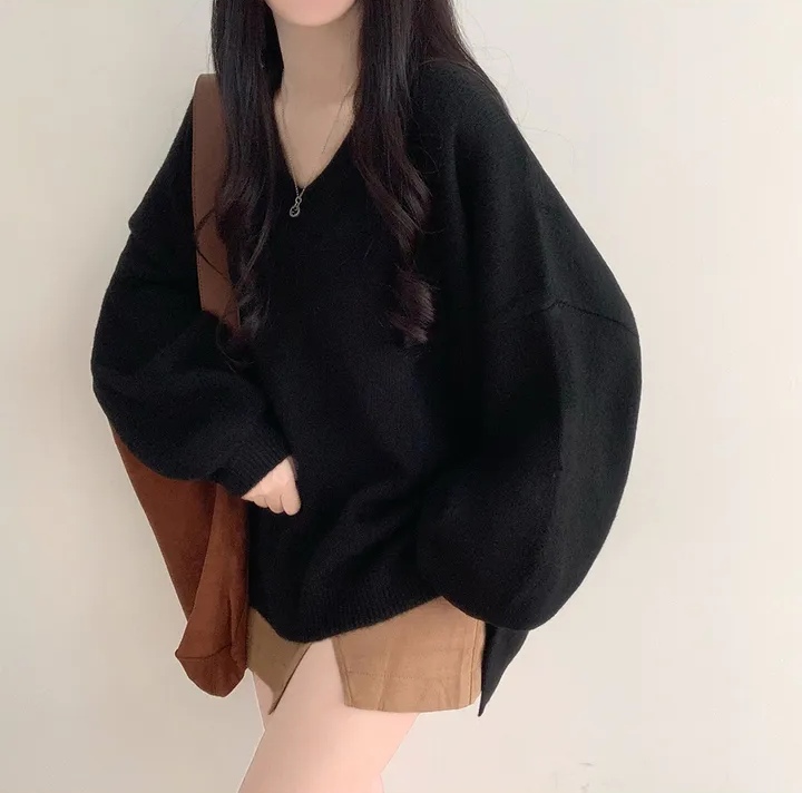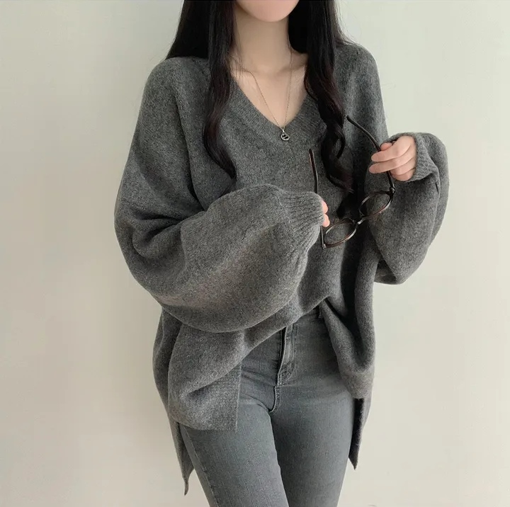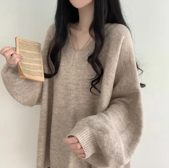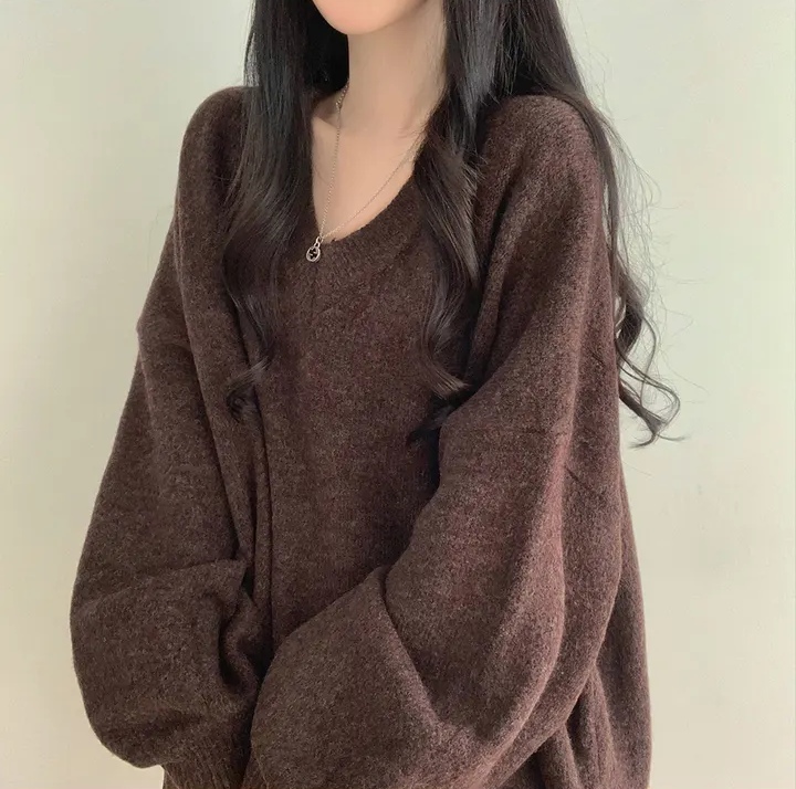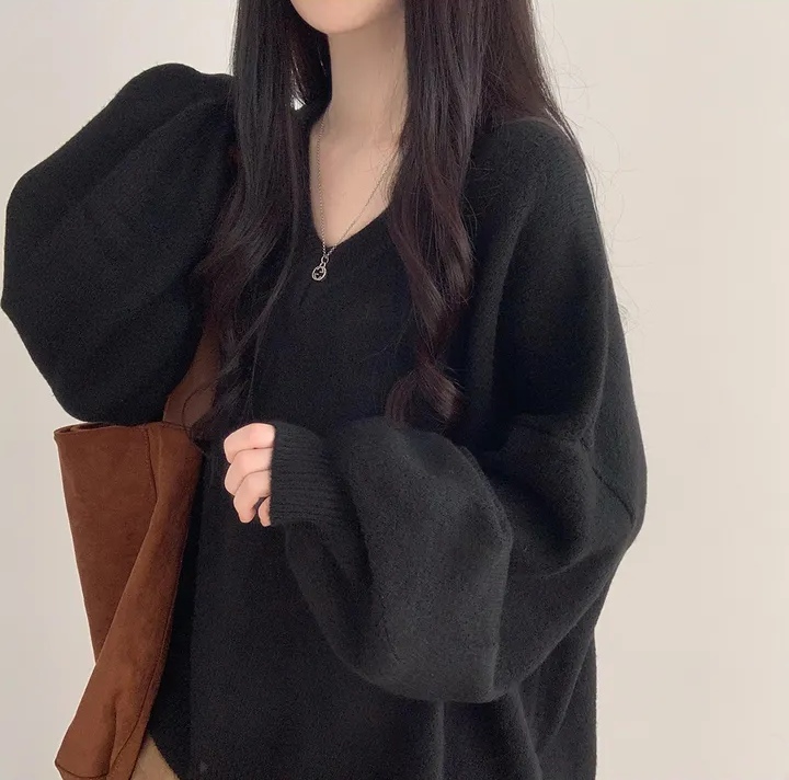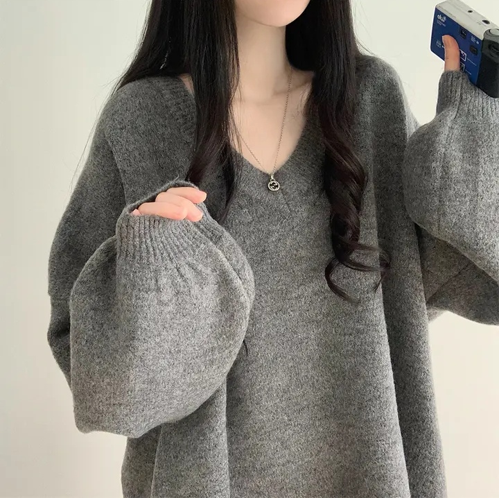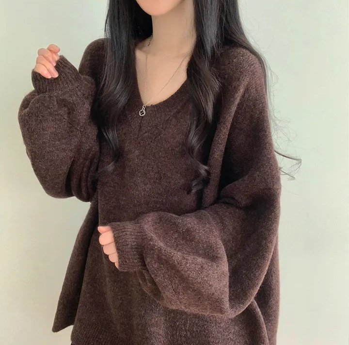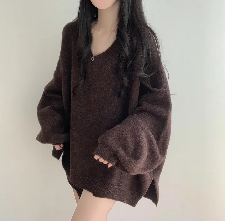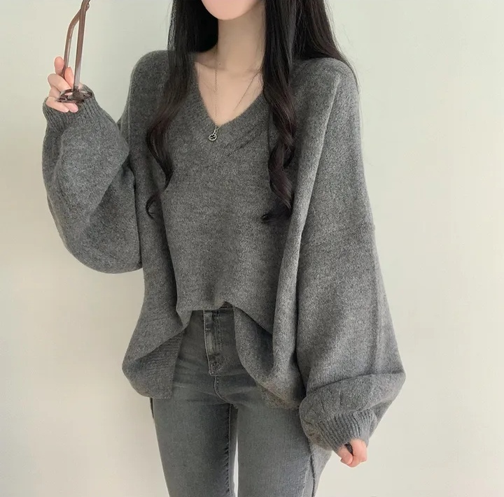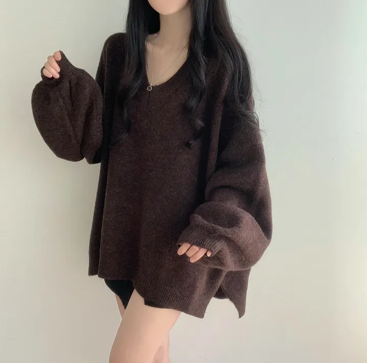 氣質獨特V領正肩針織毛衣女冬季大碼胖mm慵懶風中長款打底衫上衣