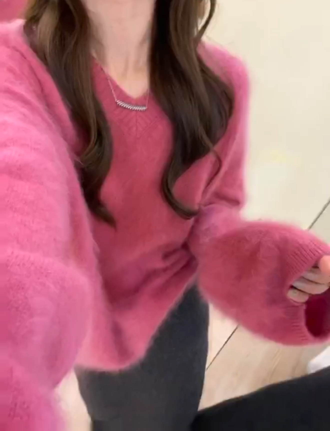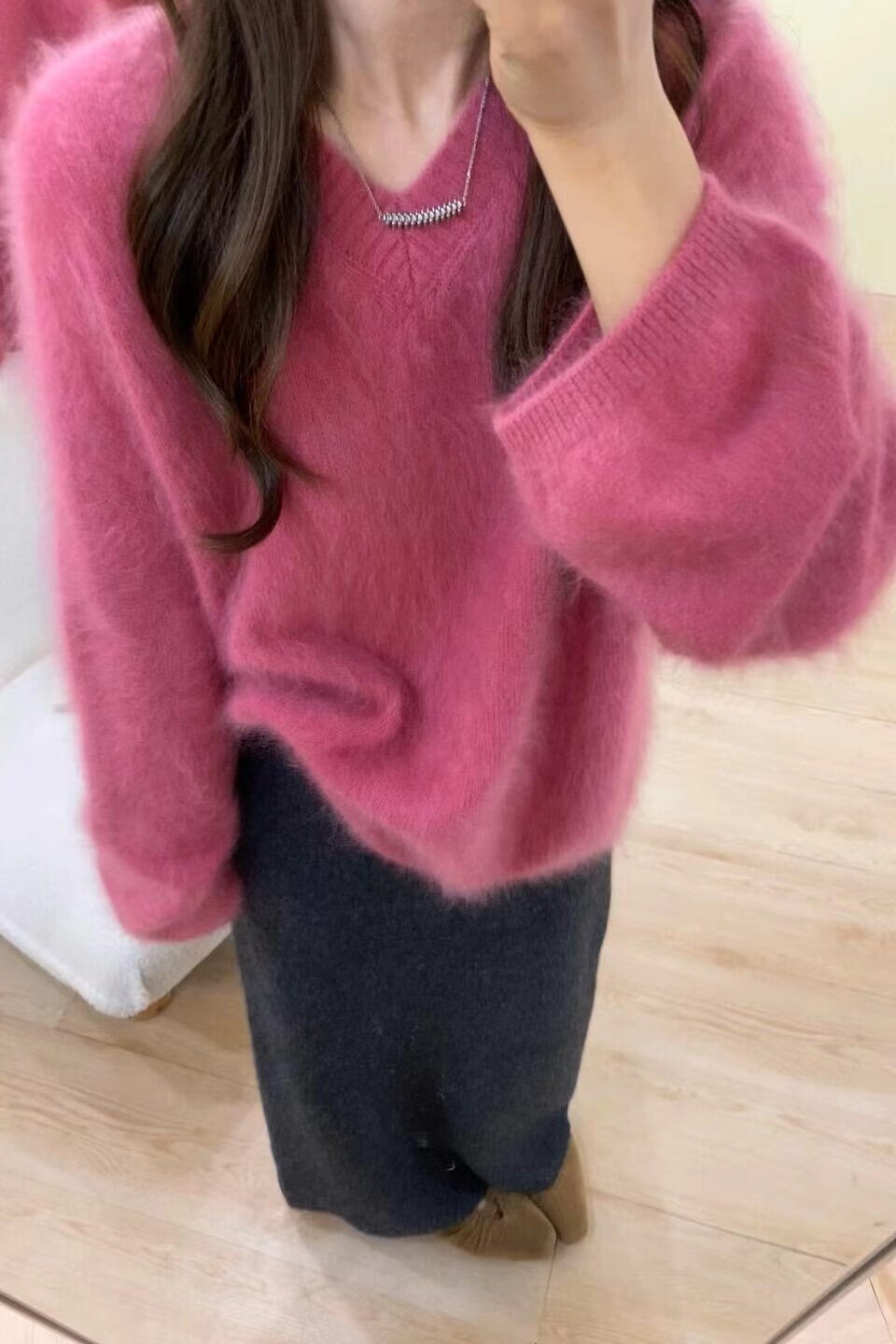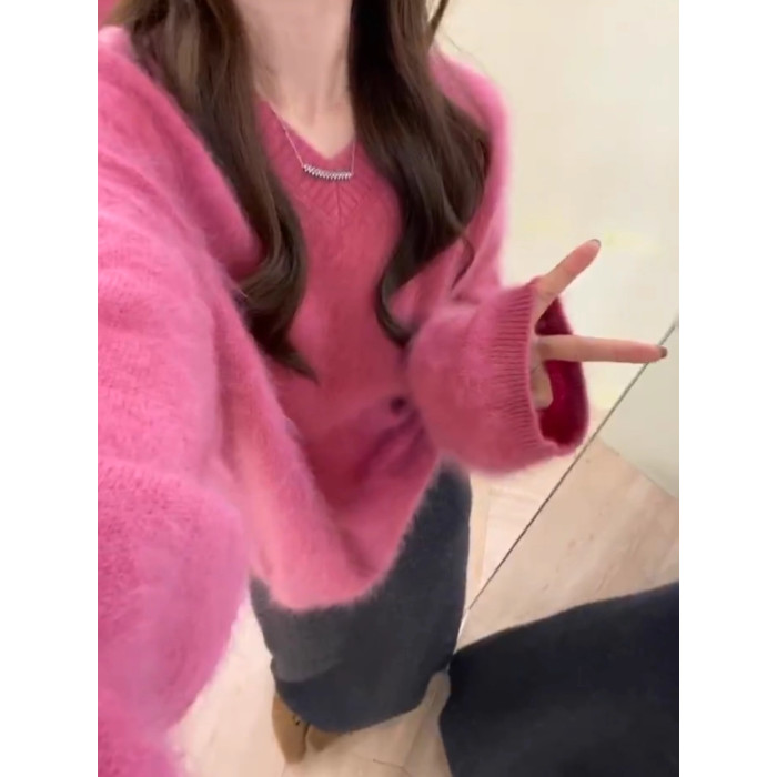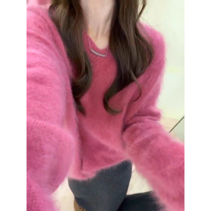 溫柔風玫粉色V領貂毛套頭毛衣女秋冬寬松慵懶軟糯百搭針織衫上衣
