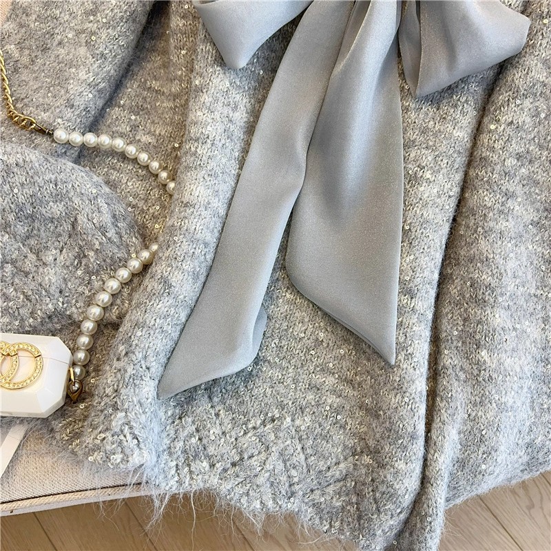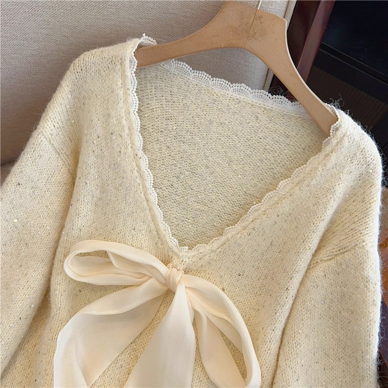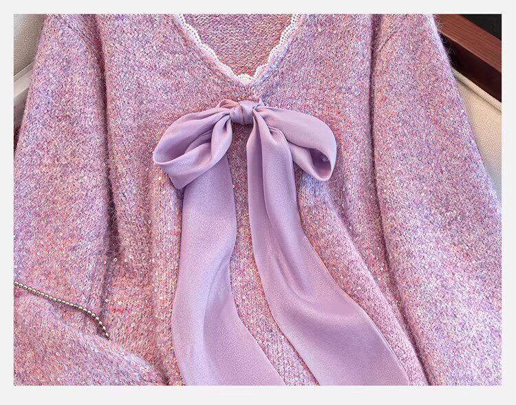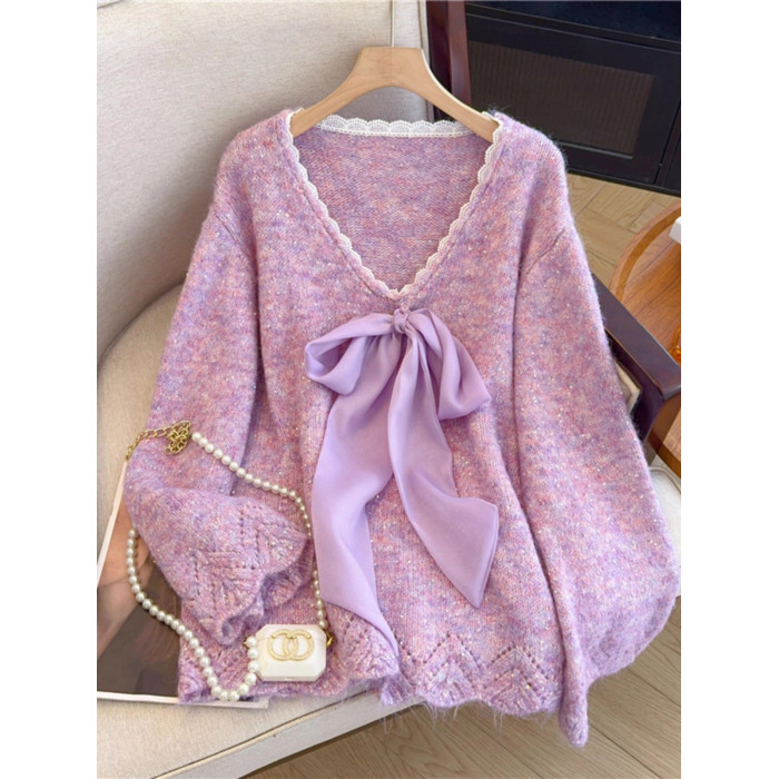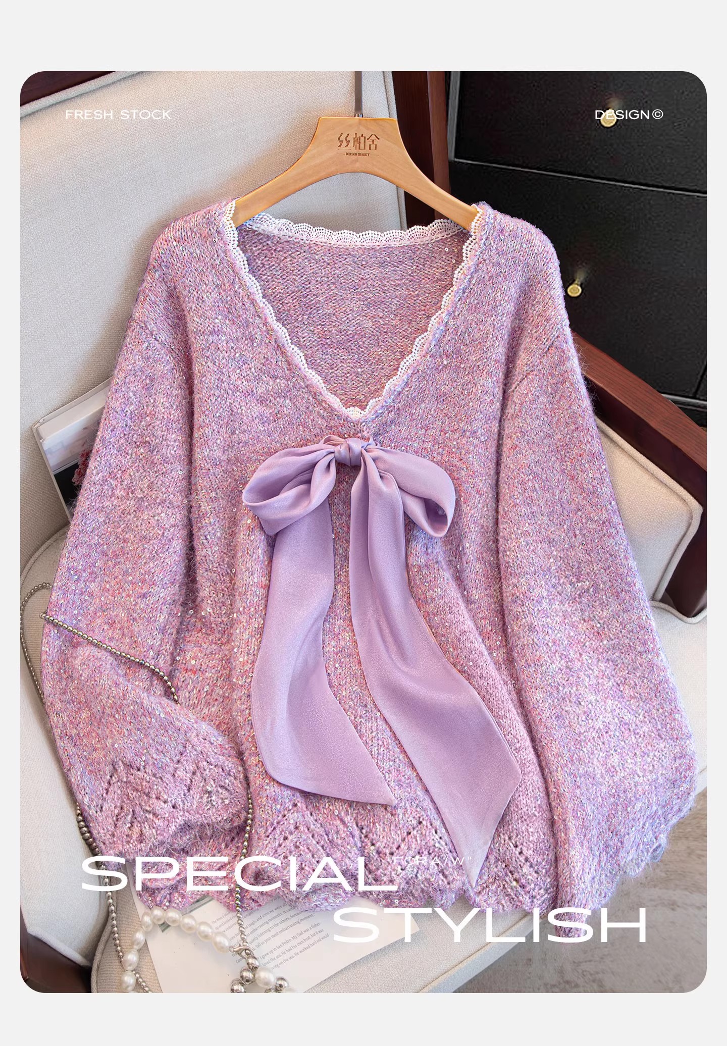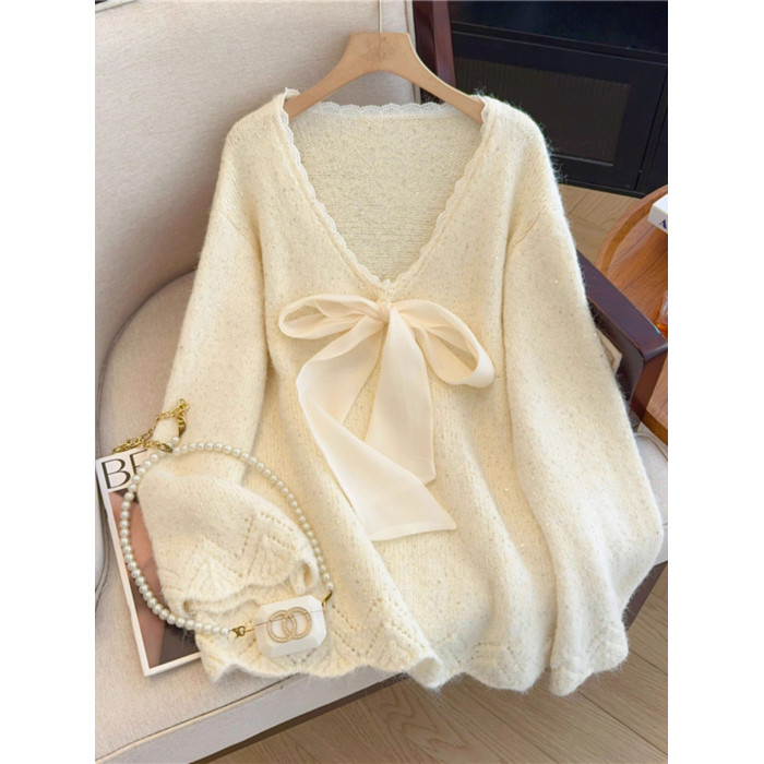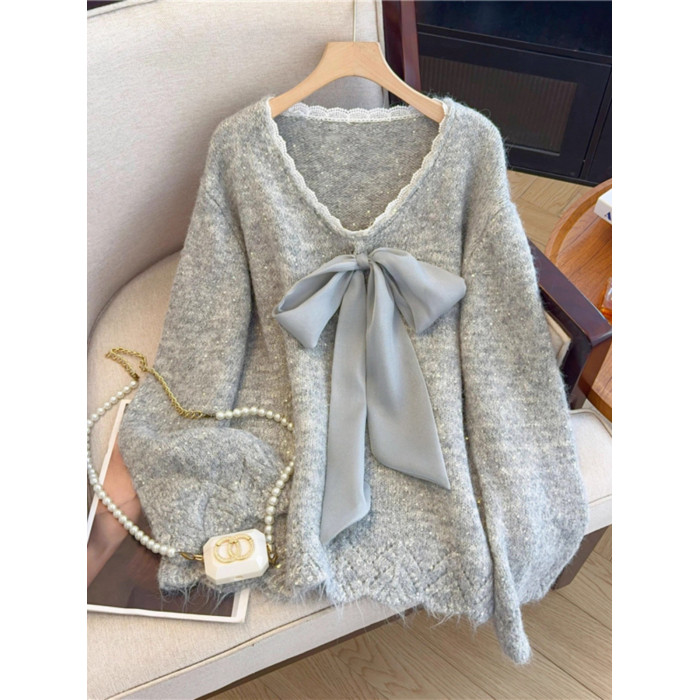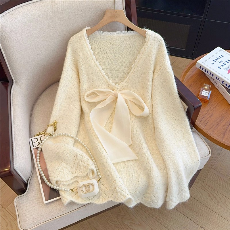 法式高級感大蝴蝶結V領毛衣女2025秋季大碼胖mm中長款針織衫上衣