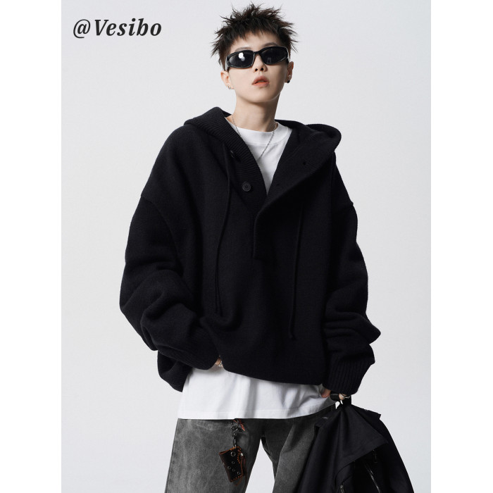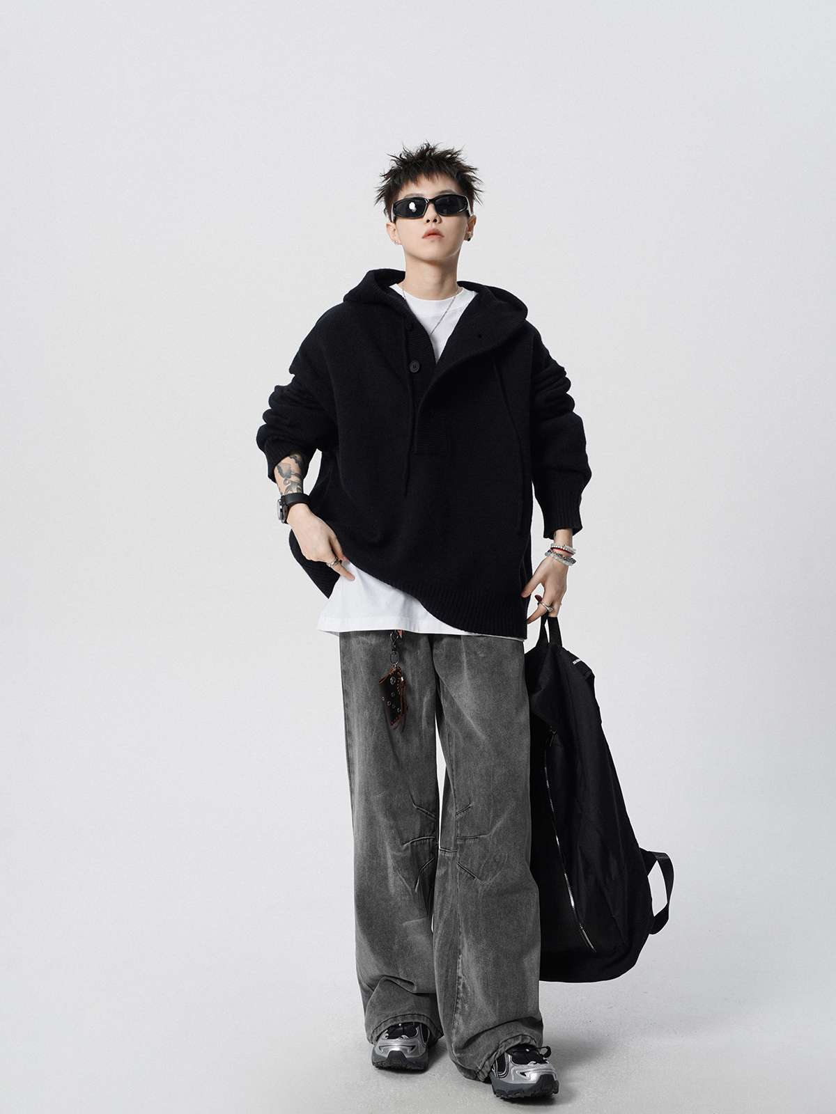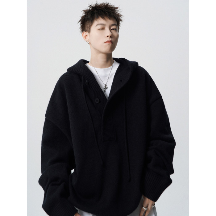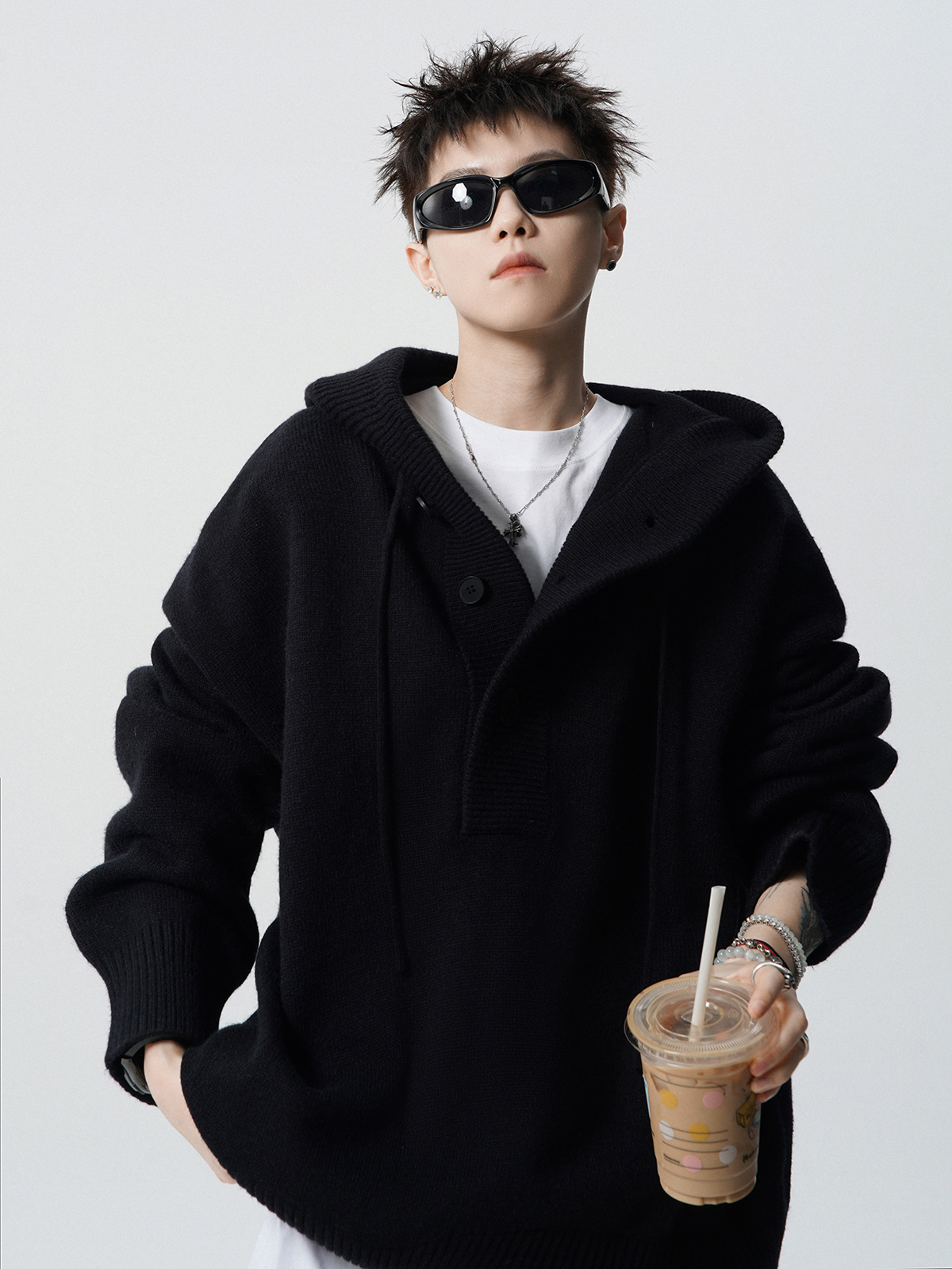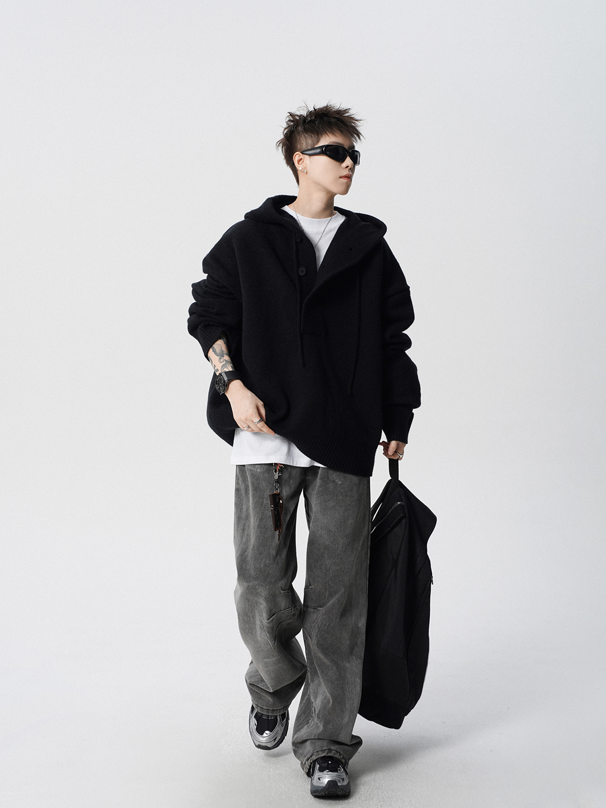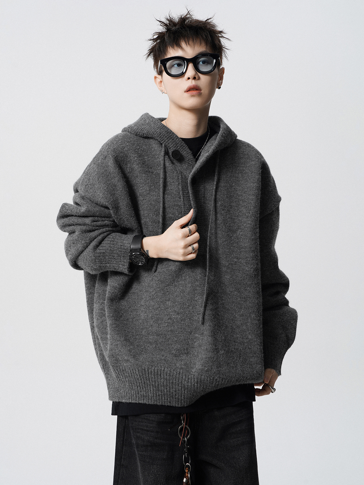 潮牌慵懶風針織衫男冬季美式高級感cleanfit毛衣高街休閒連帽外套