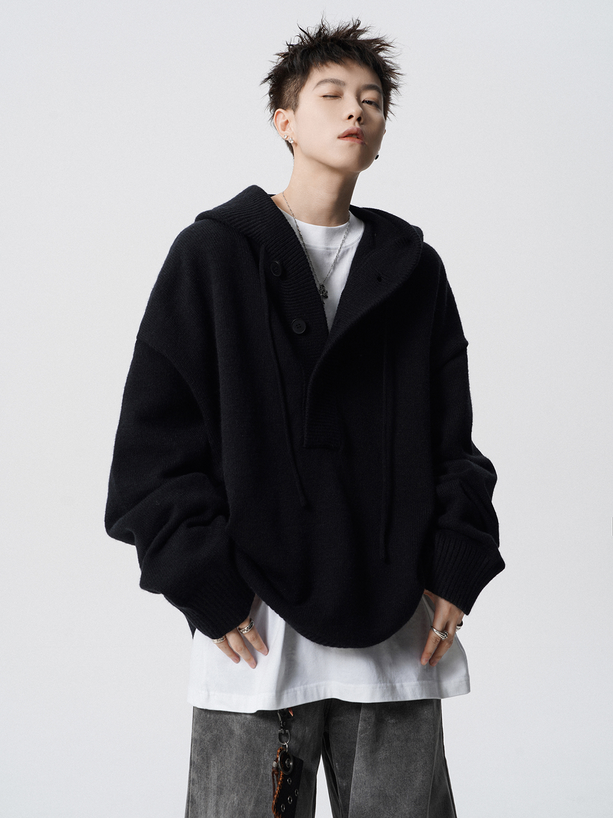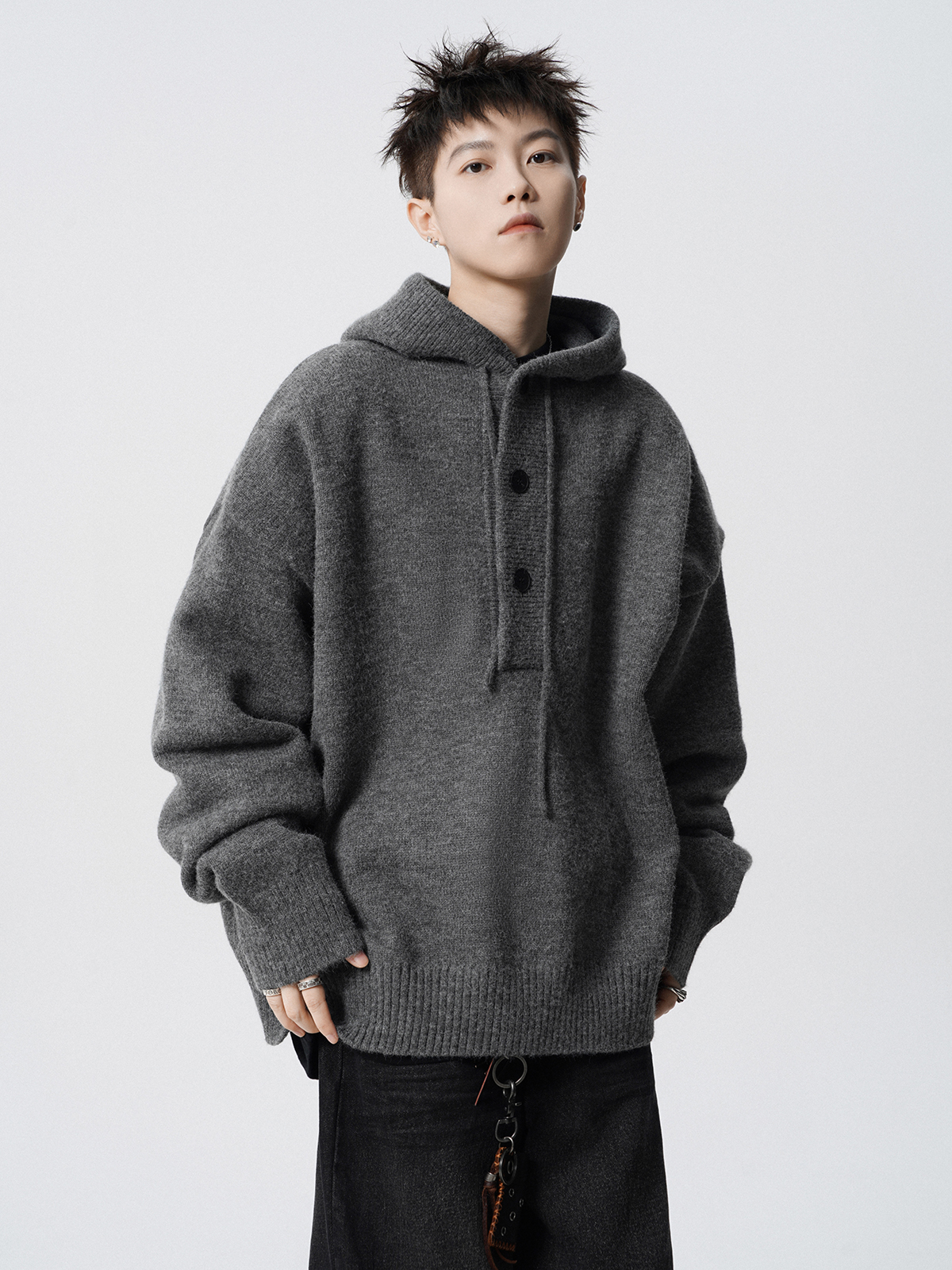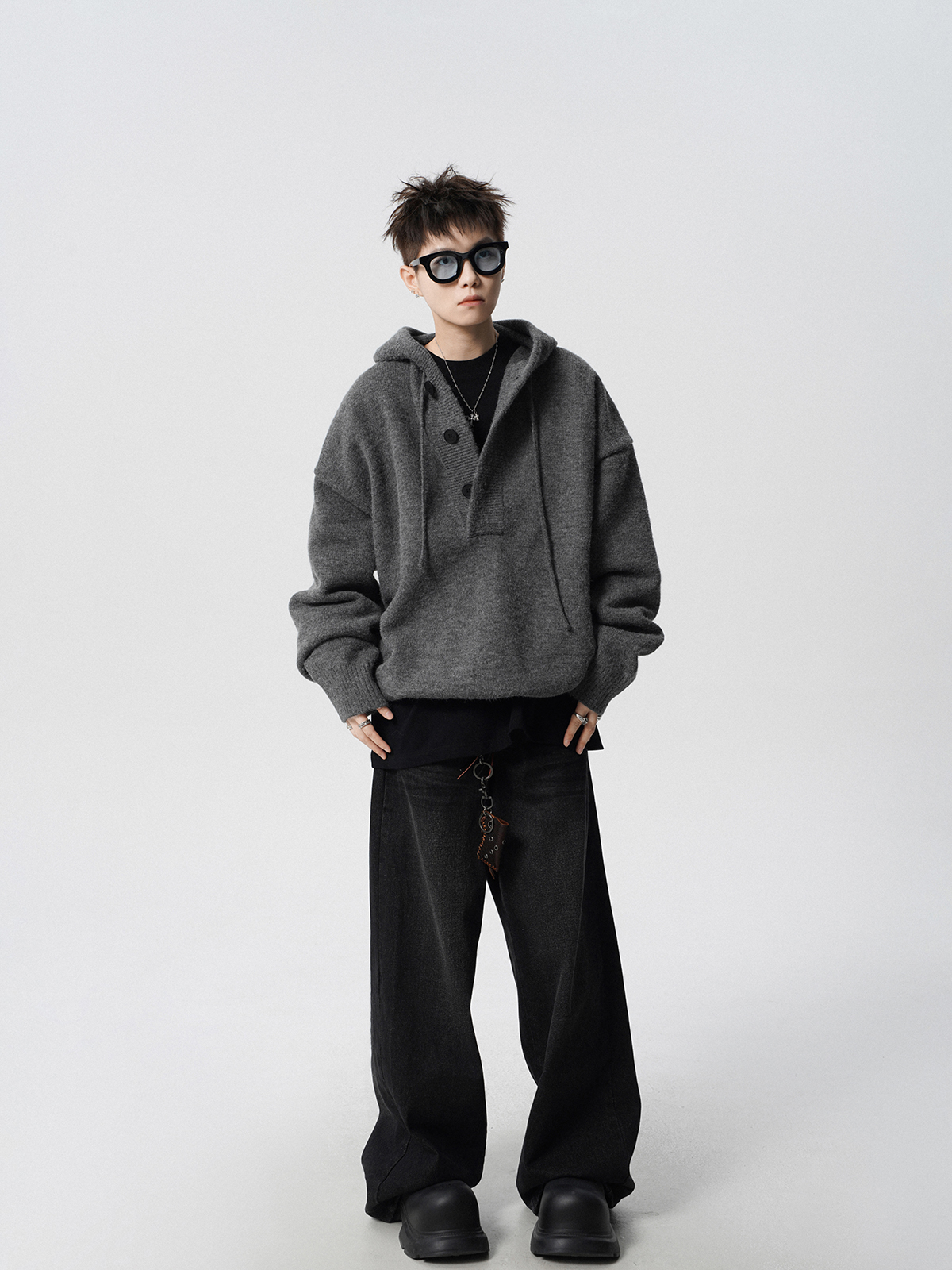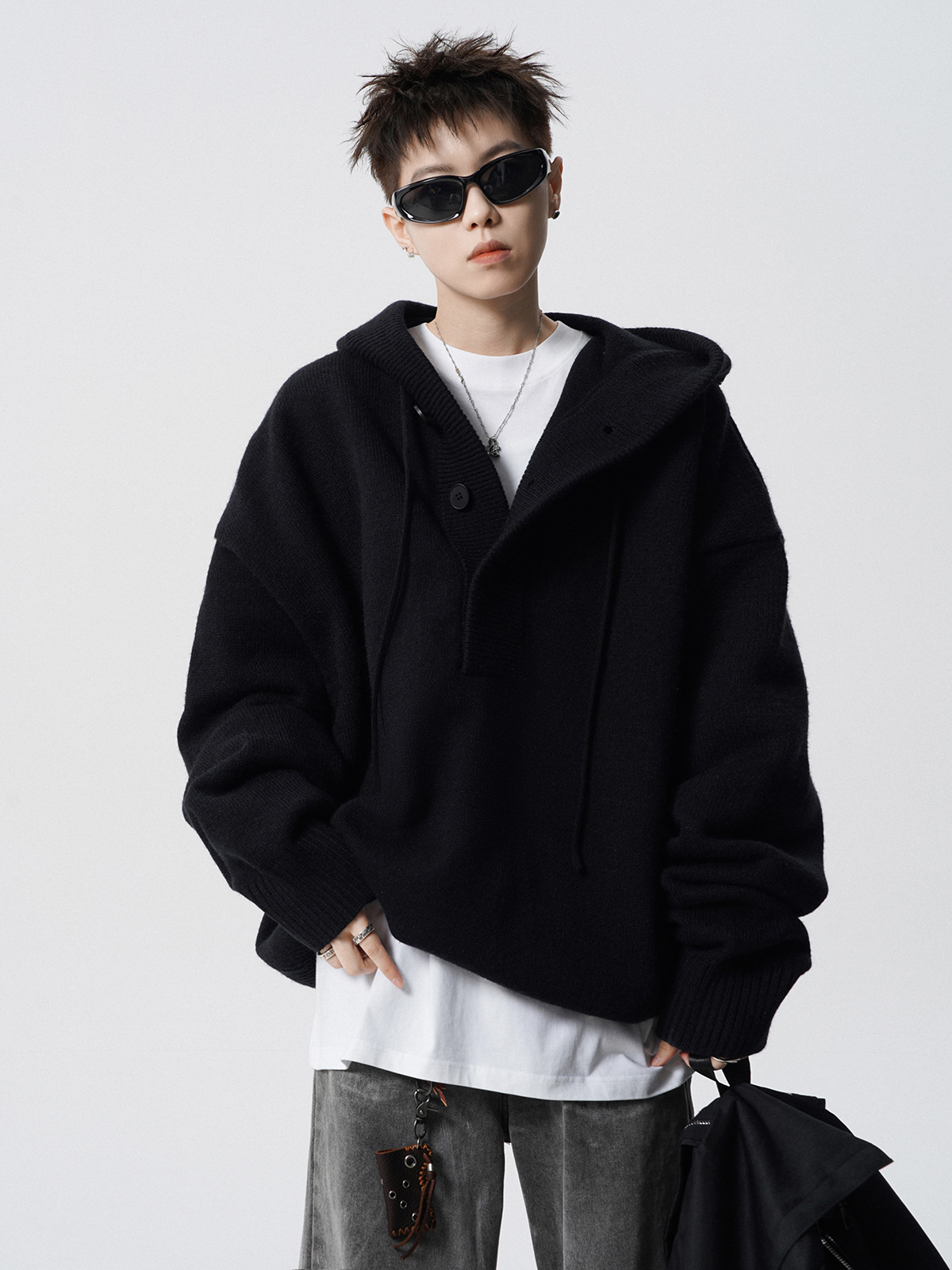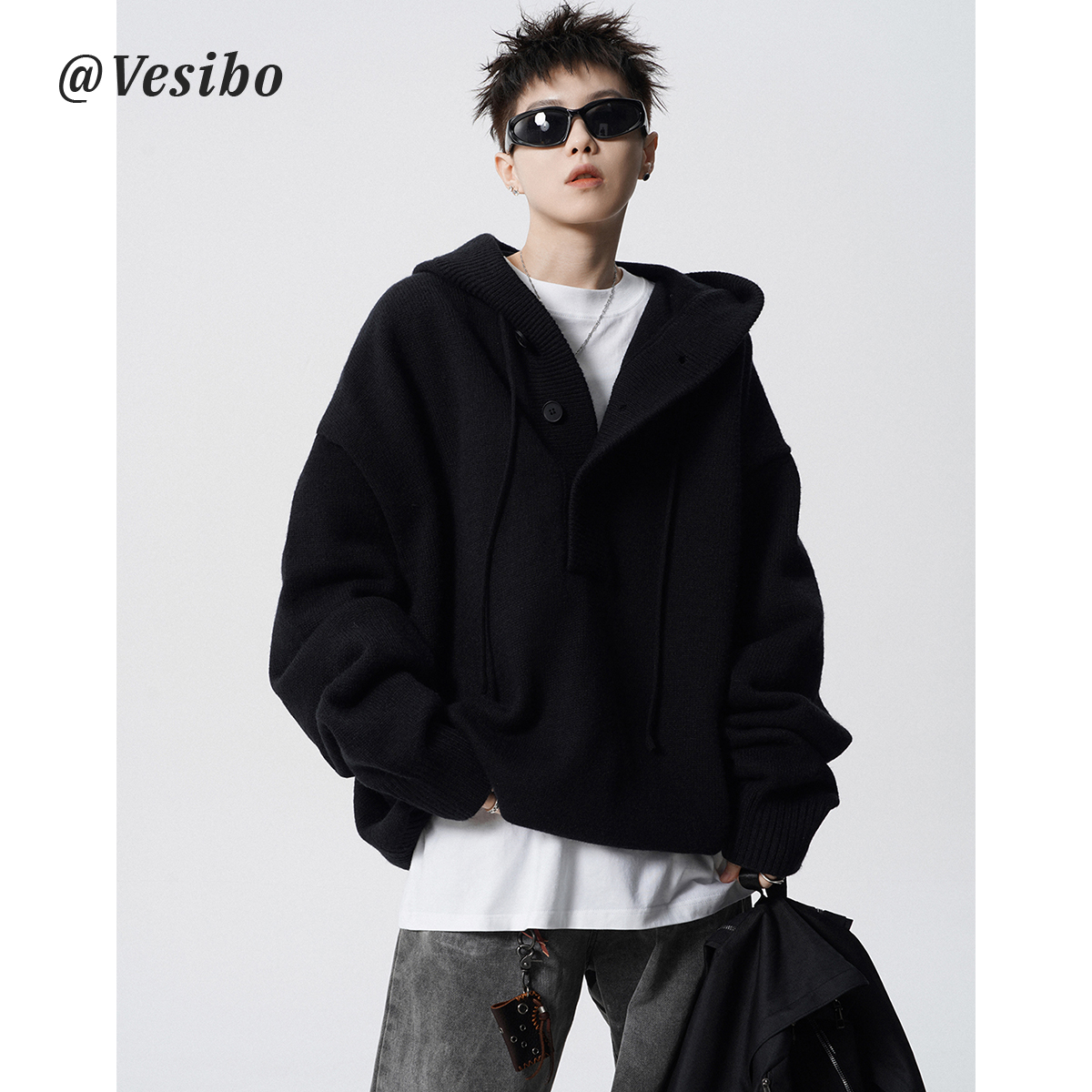 潮牌慵懶風針織衫男冬季美式高級感cleanfit毛衣高街休閒連帽外套